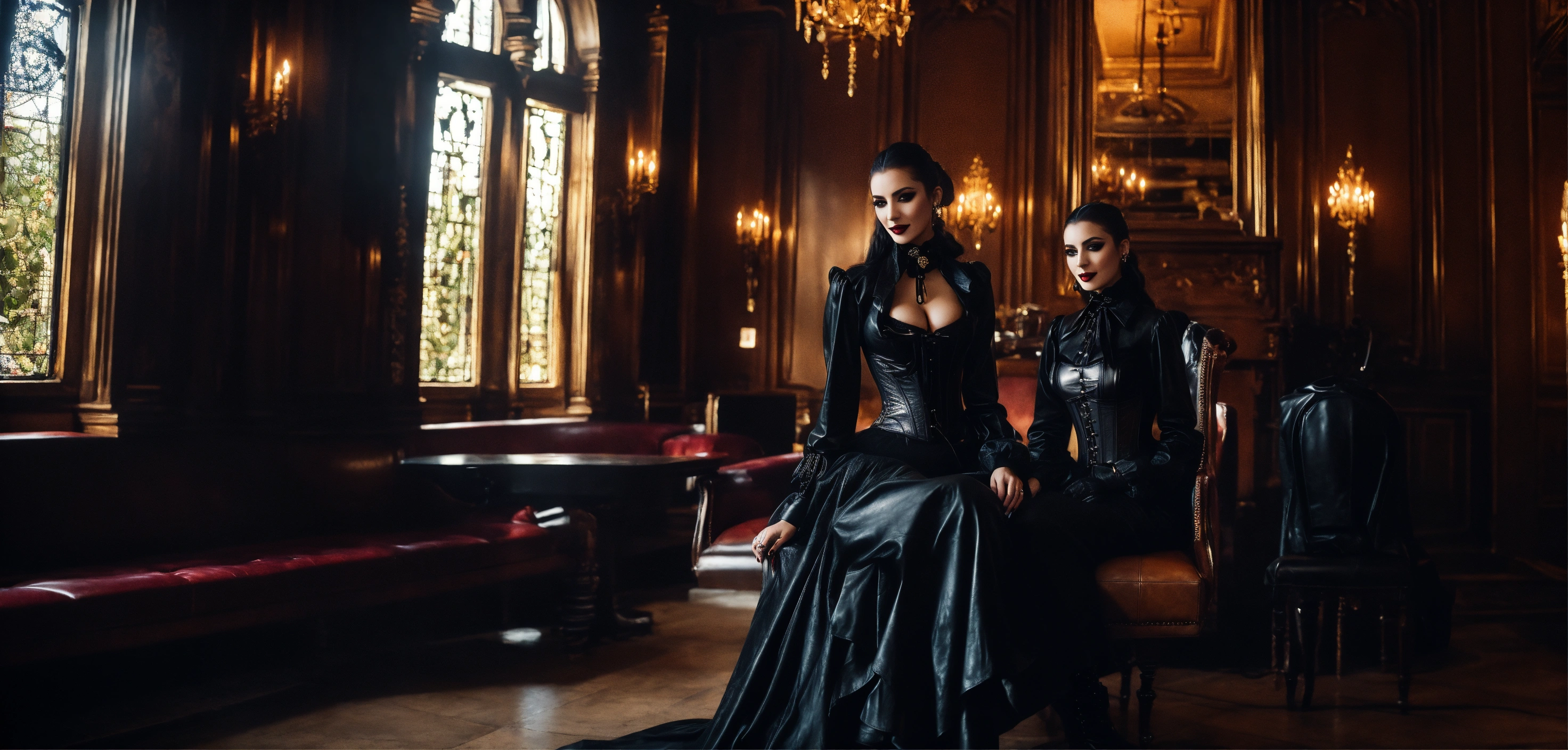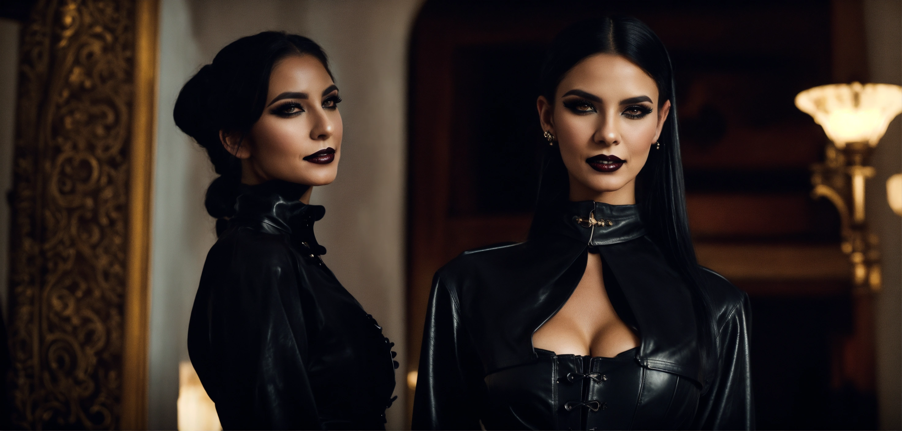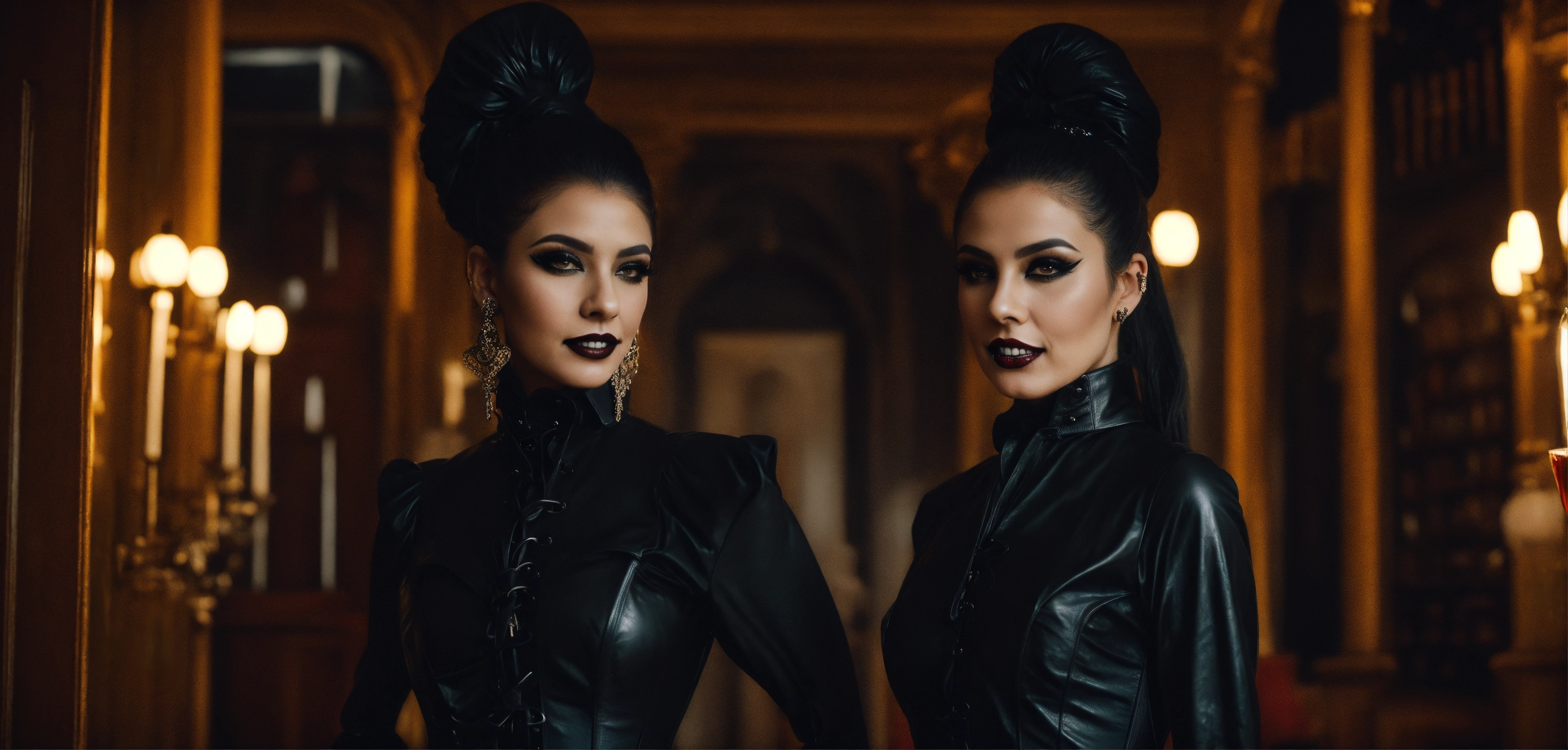 Cinematic look, two stunning arab seductress women fashion model, arrogant evil smile from above showing vampire teeth, black straight hair very high ponytail, black leather corset, long strict victorian governess wide black long leather shirt dress with long big puff sleeves and big buttons, mansion hall by night haze, white office shirt collar, eyeliner makeup, black leather boots, underworld vampire movie style