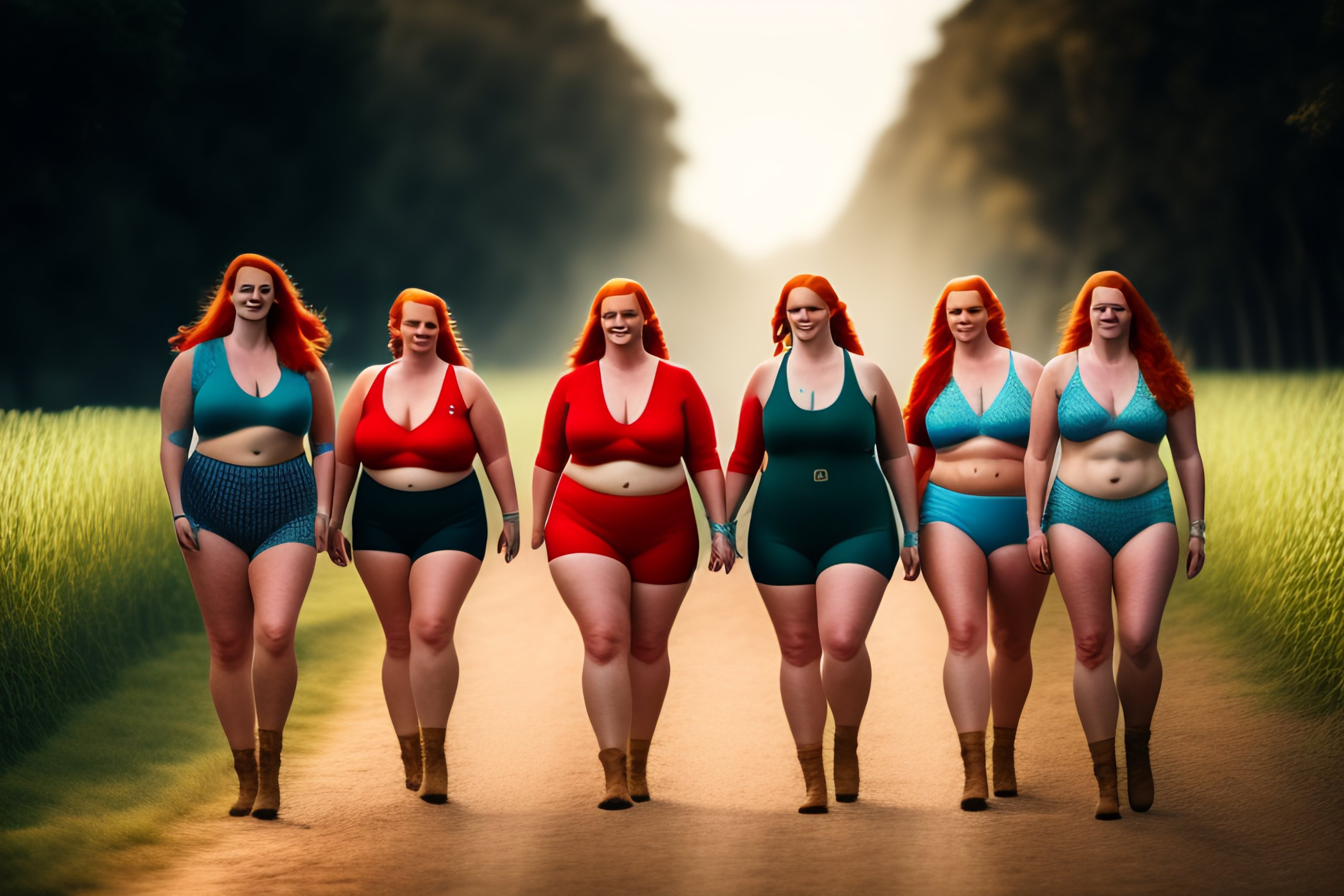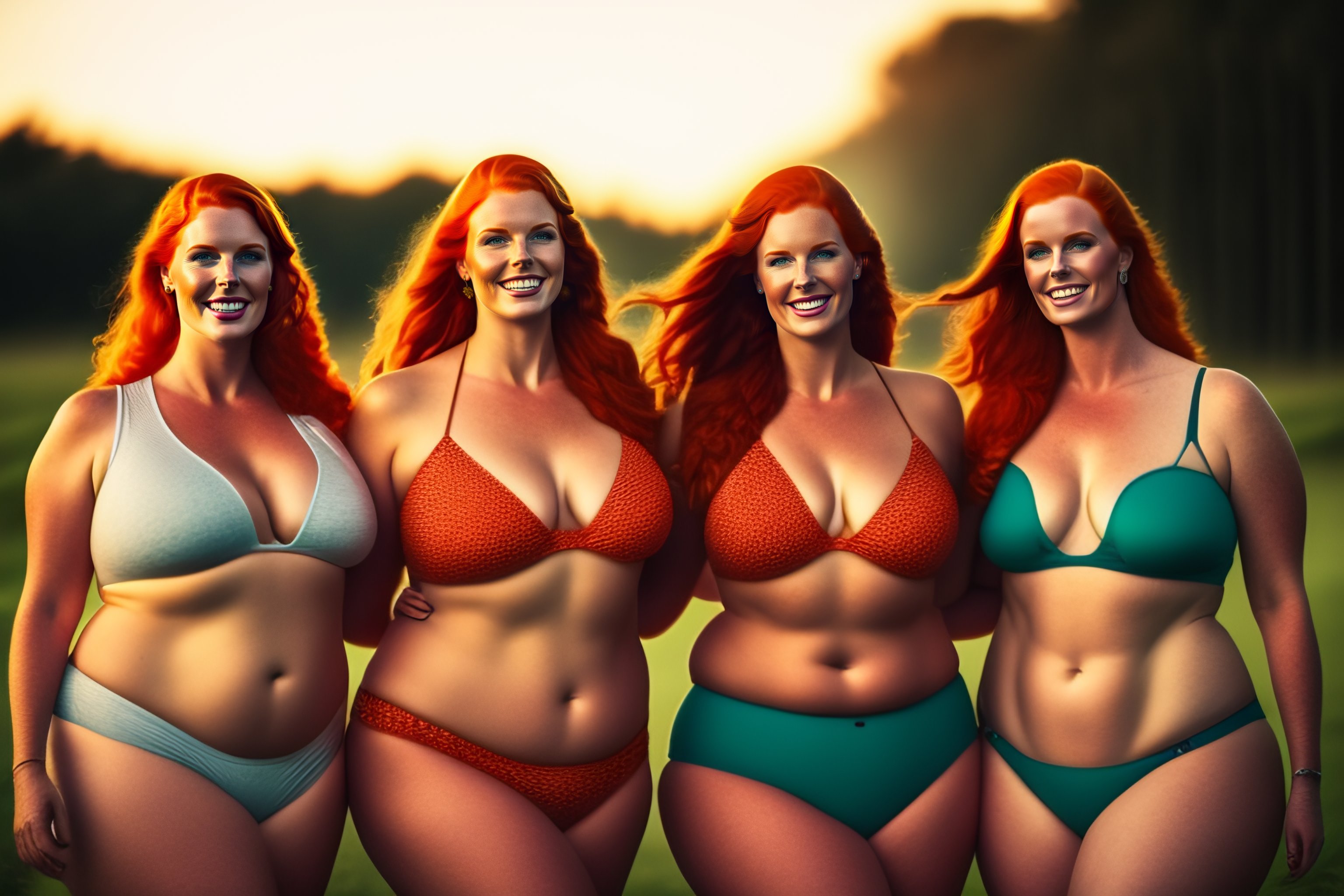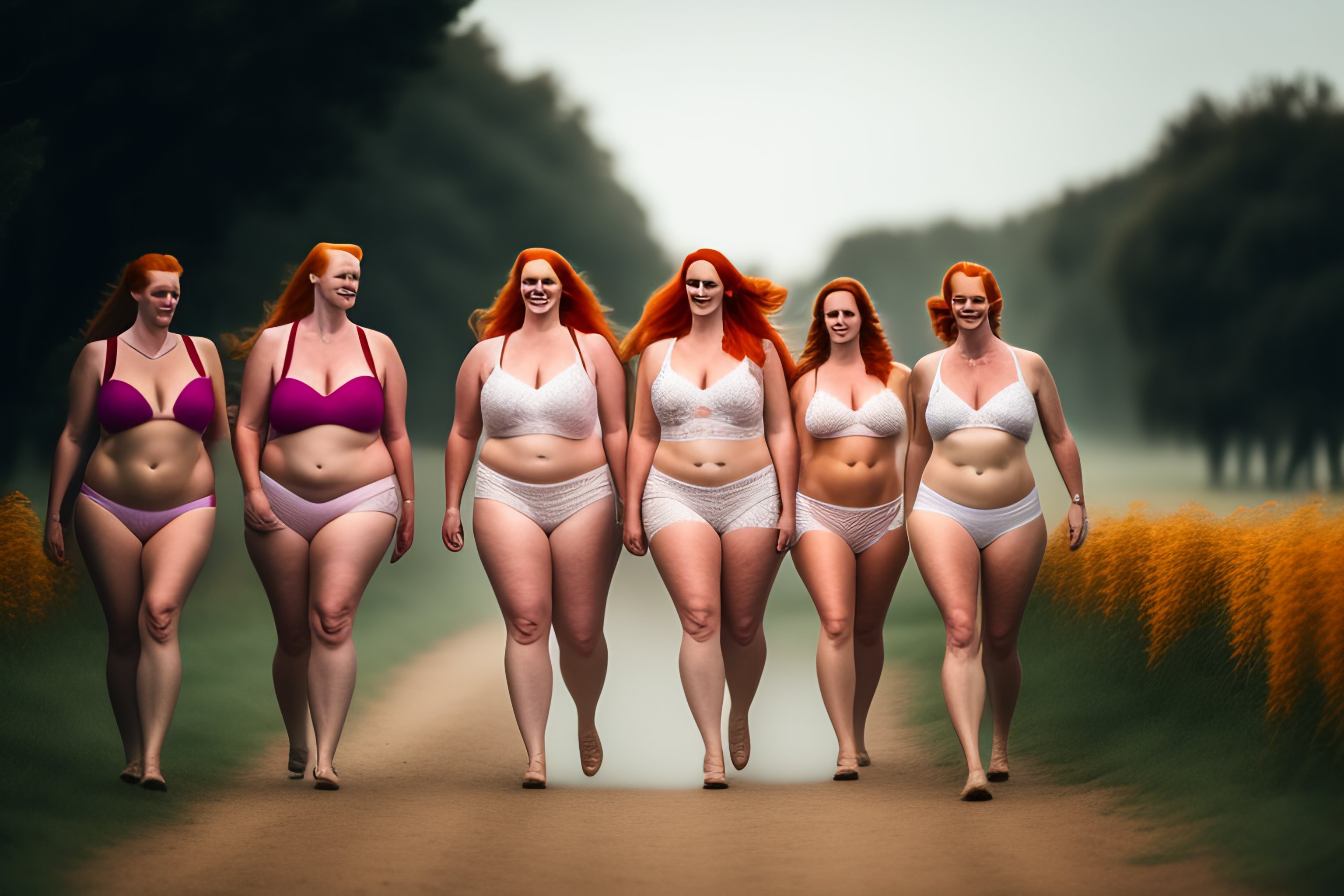 A group of beautiful looking plus size redhead women walking on a farm all dressed wearing different revealing bikinis misty morning pretty faces smiling