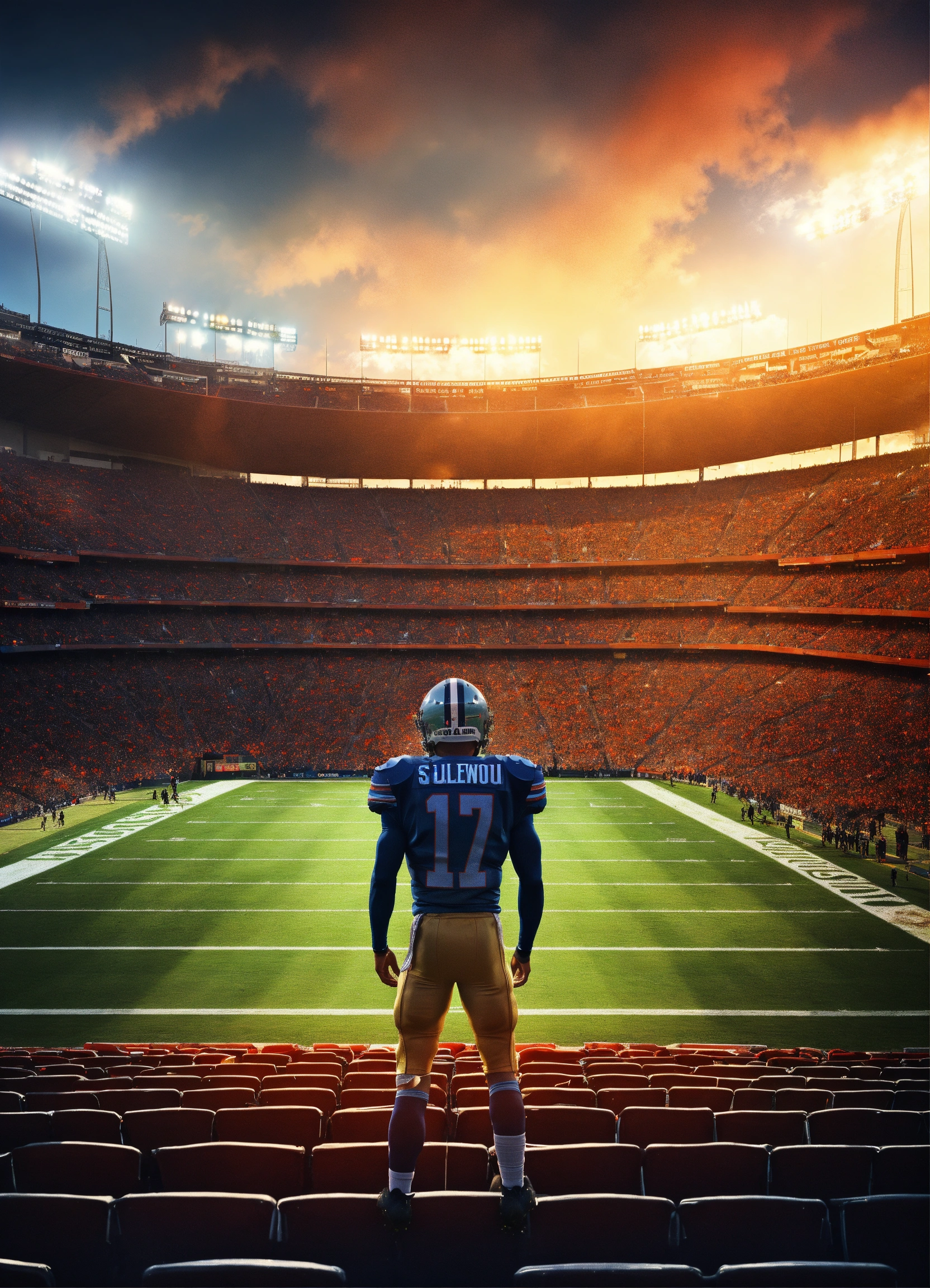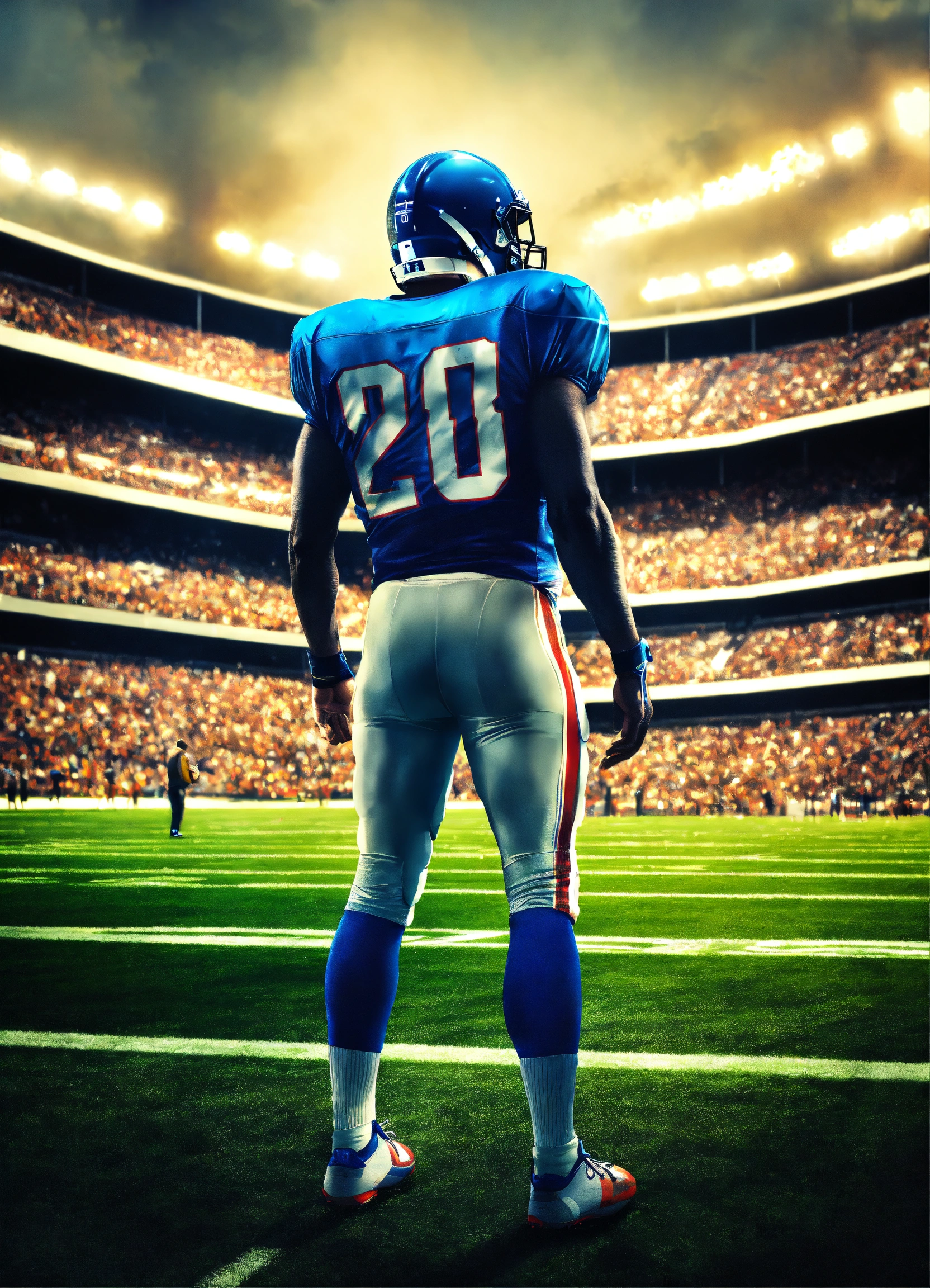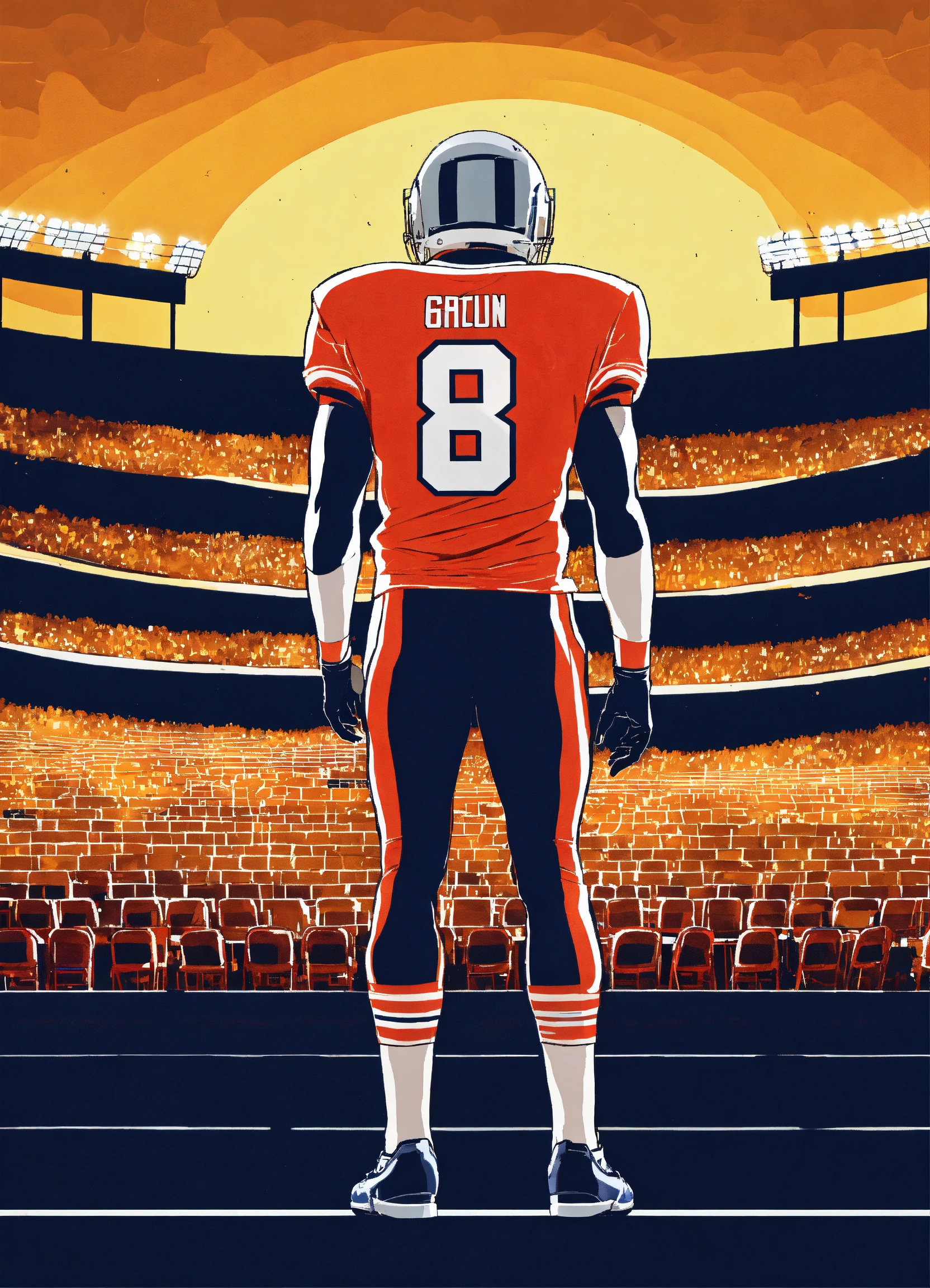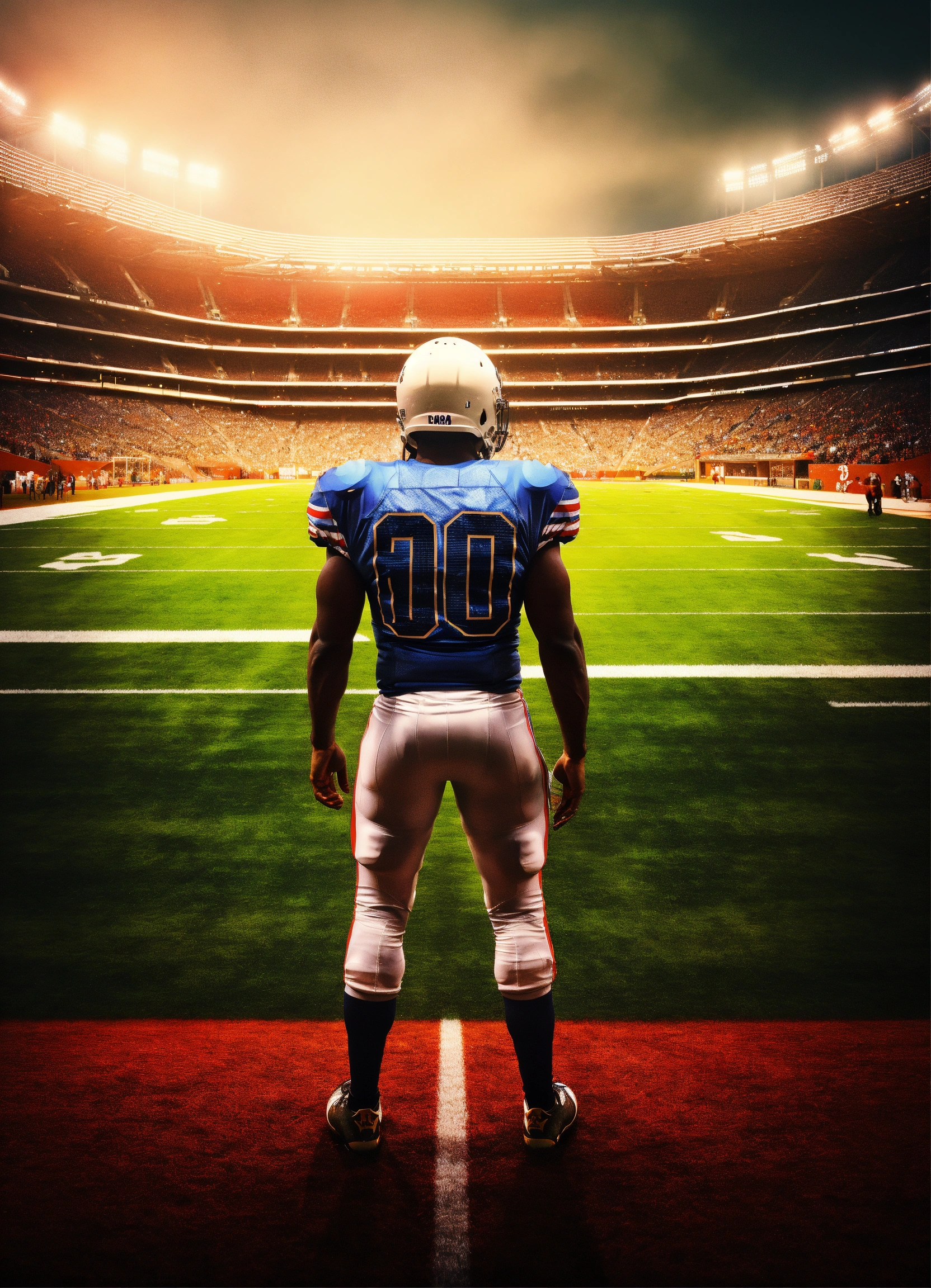 An american football player stands with his back to us in the stadium and looks at the empty stands digital art