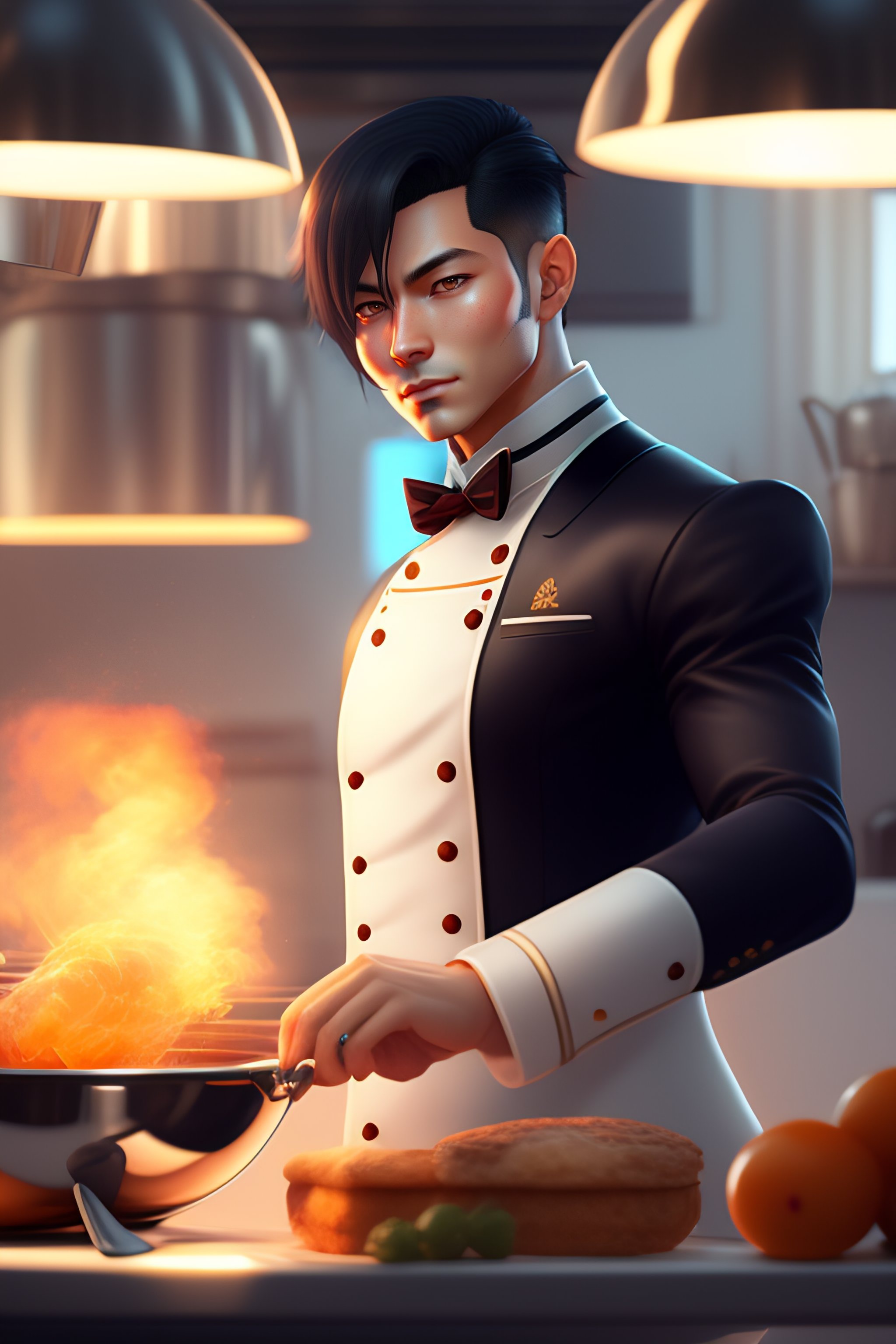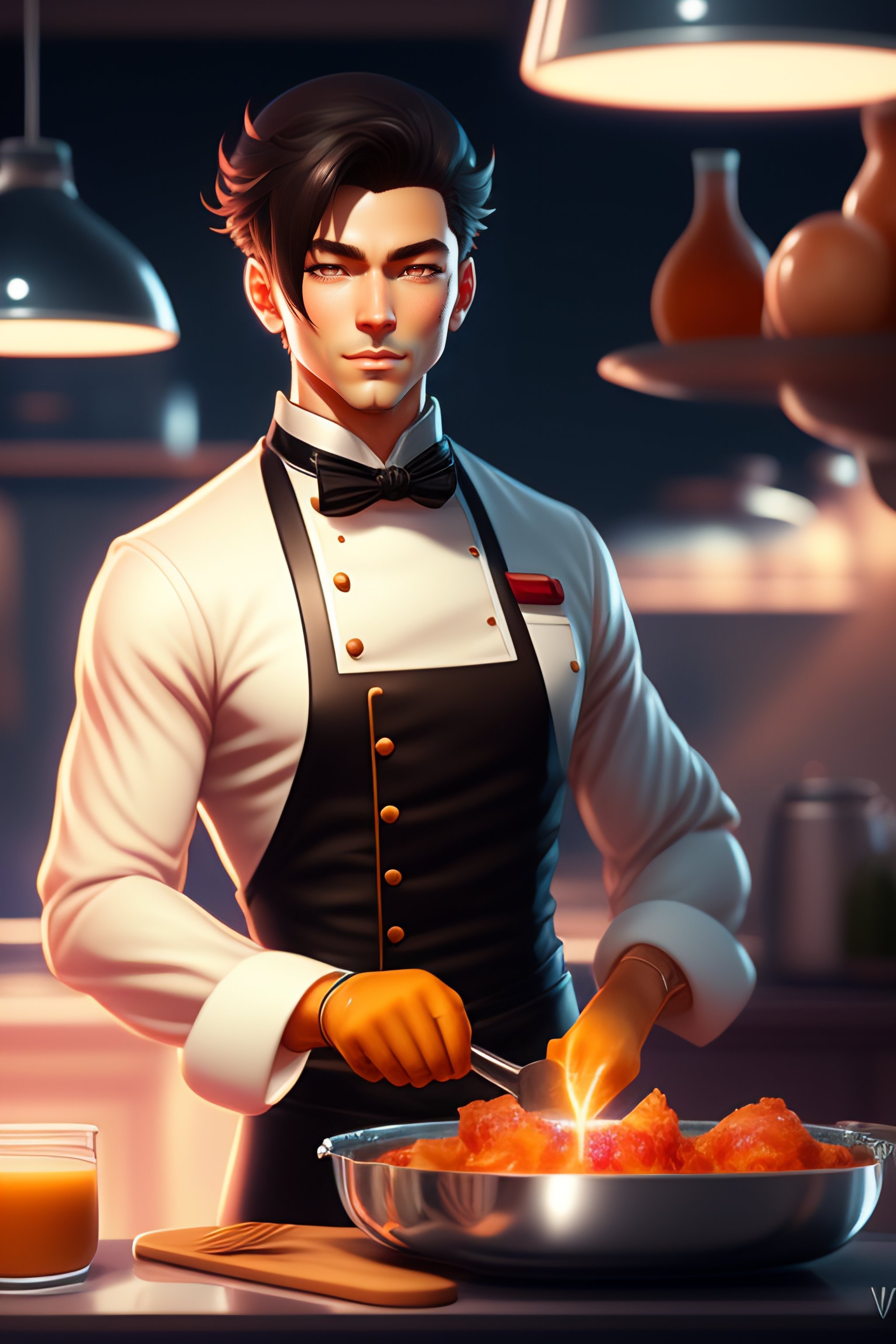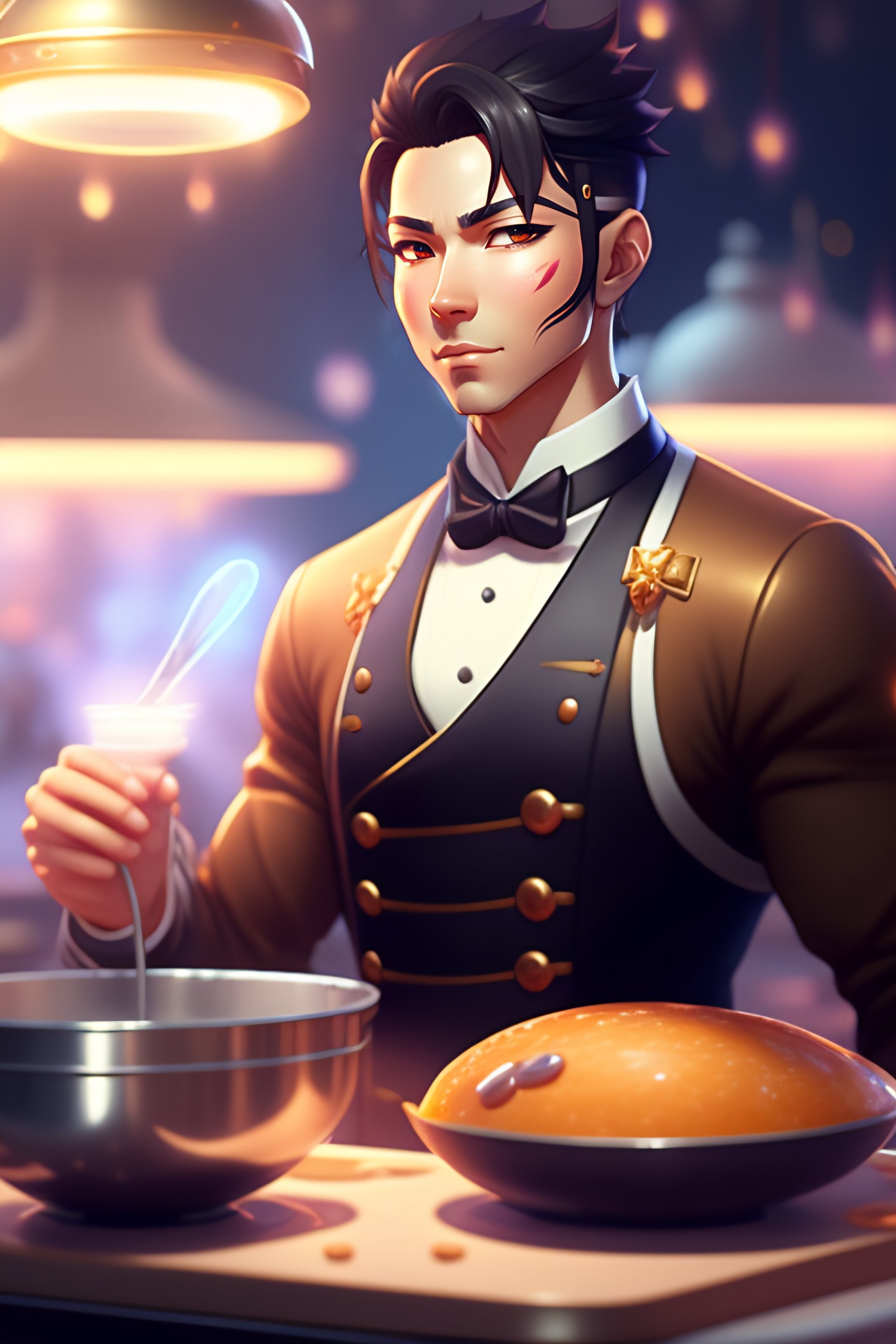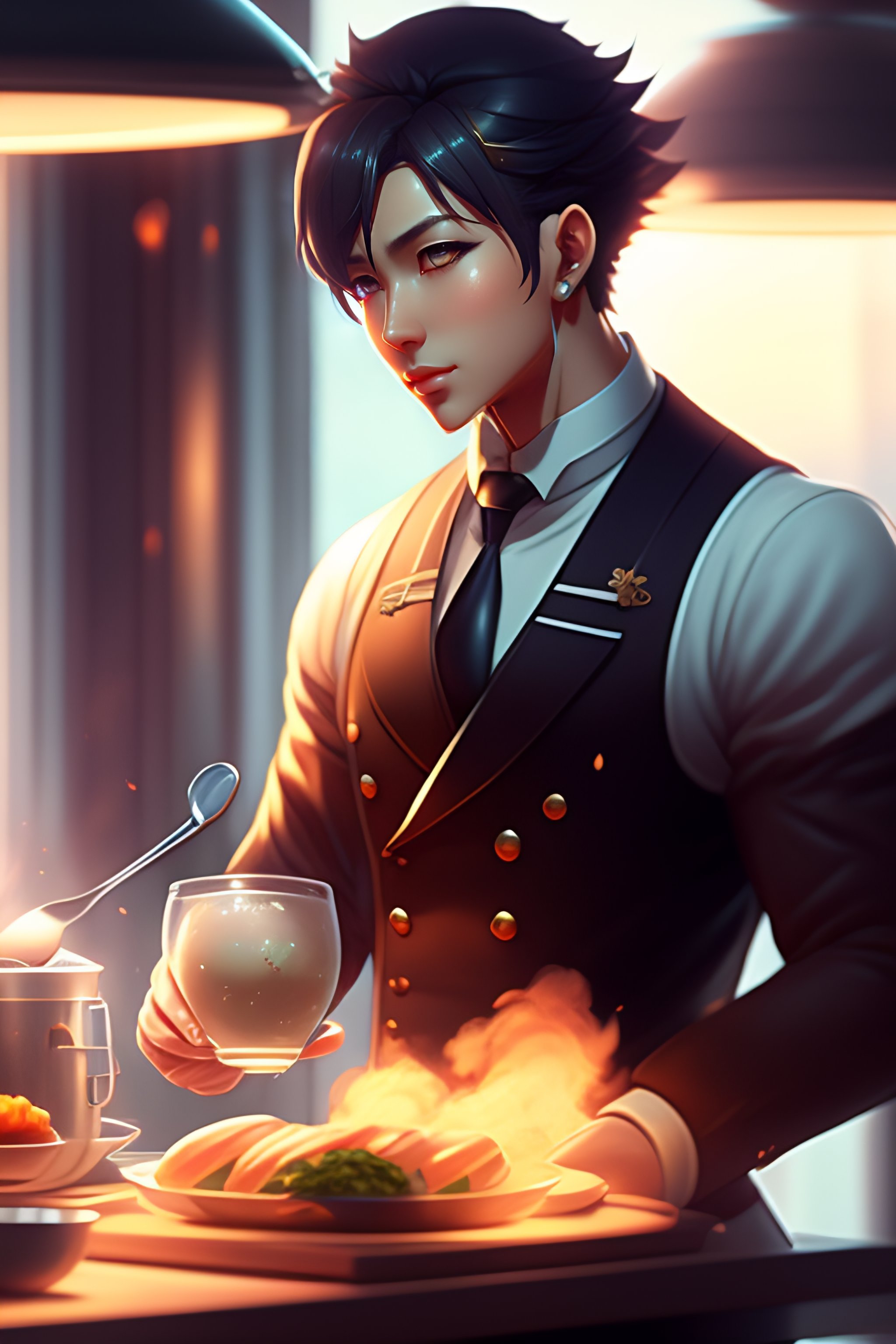 A cute android male butler cooking breakfast, character art portrait, anime key visual, official media, illustrated by wlop, extremely detailed, 8 k, trending on artstation, cinematic lighting, beautiful