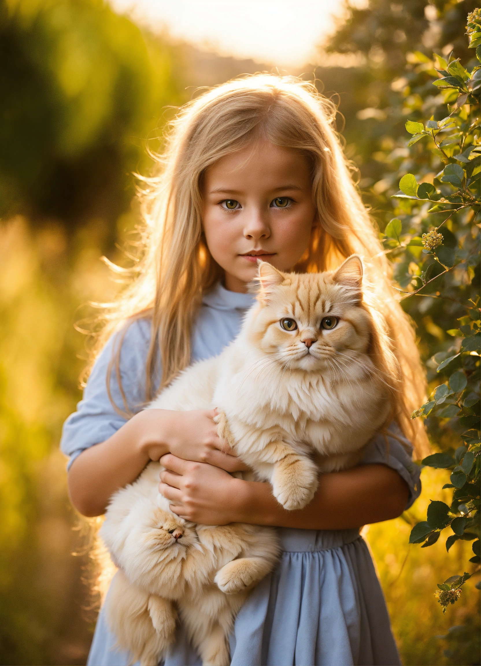 A little british girl with long golden hair. holding the persian cat in his arms, looking into the distance. standing under the small bush. sunlight.