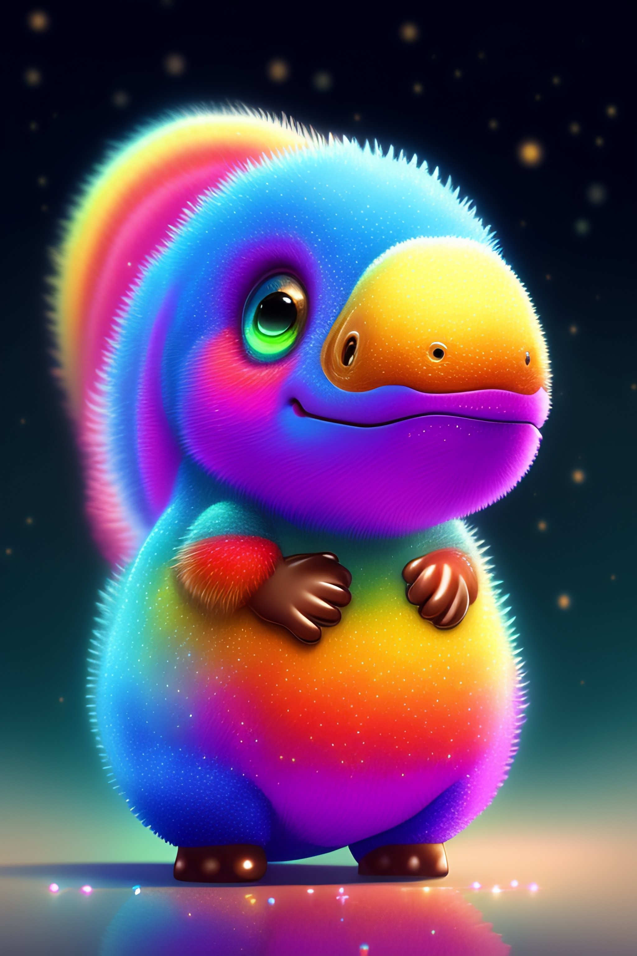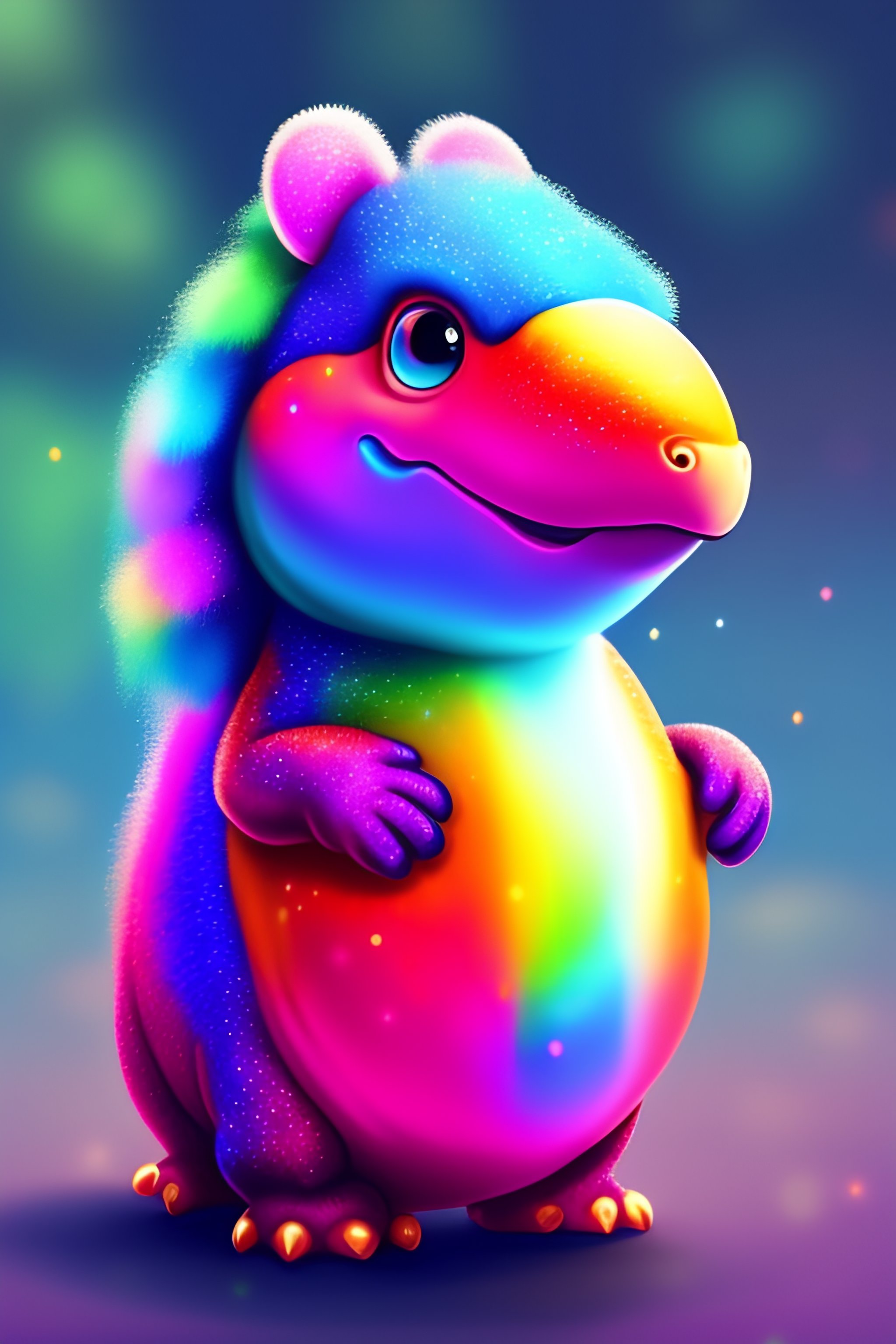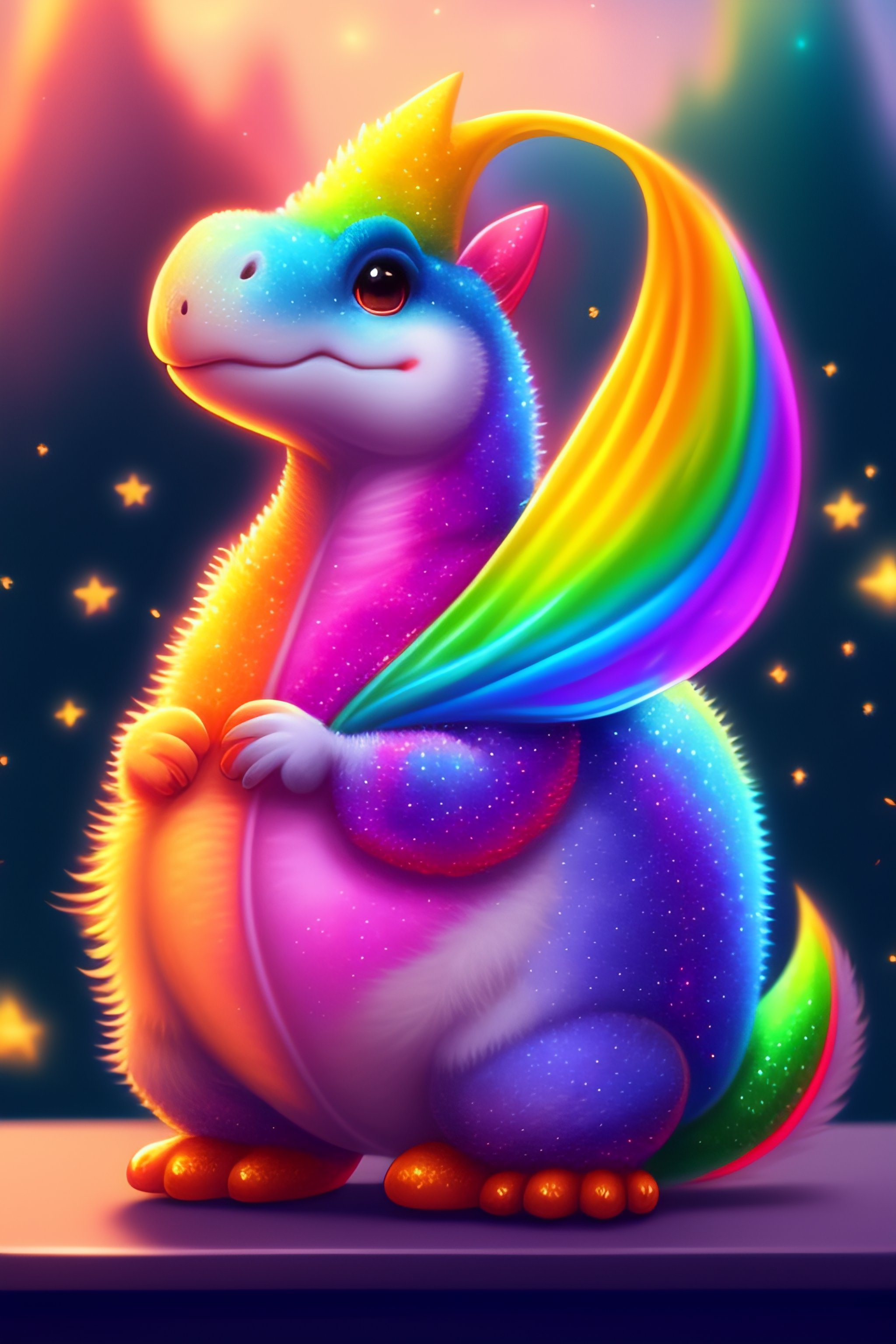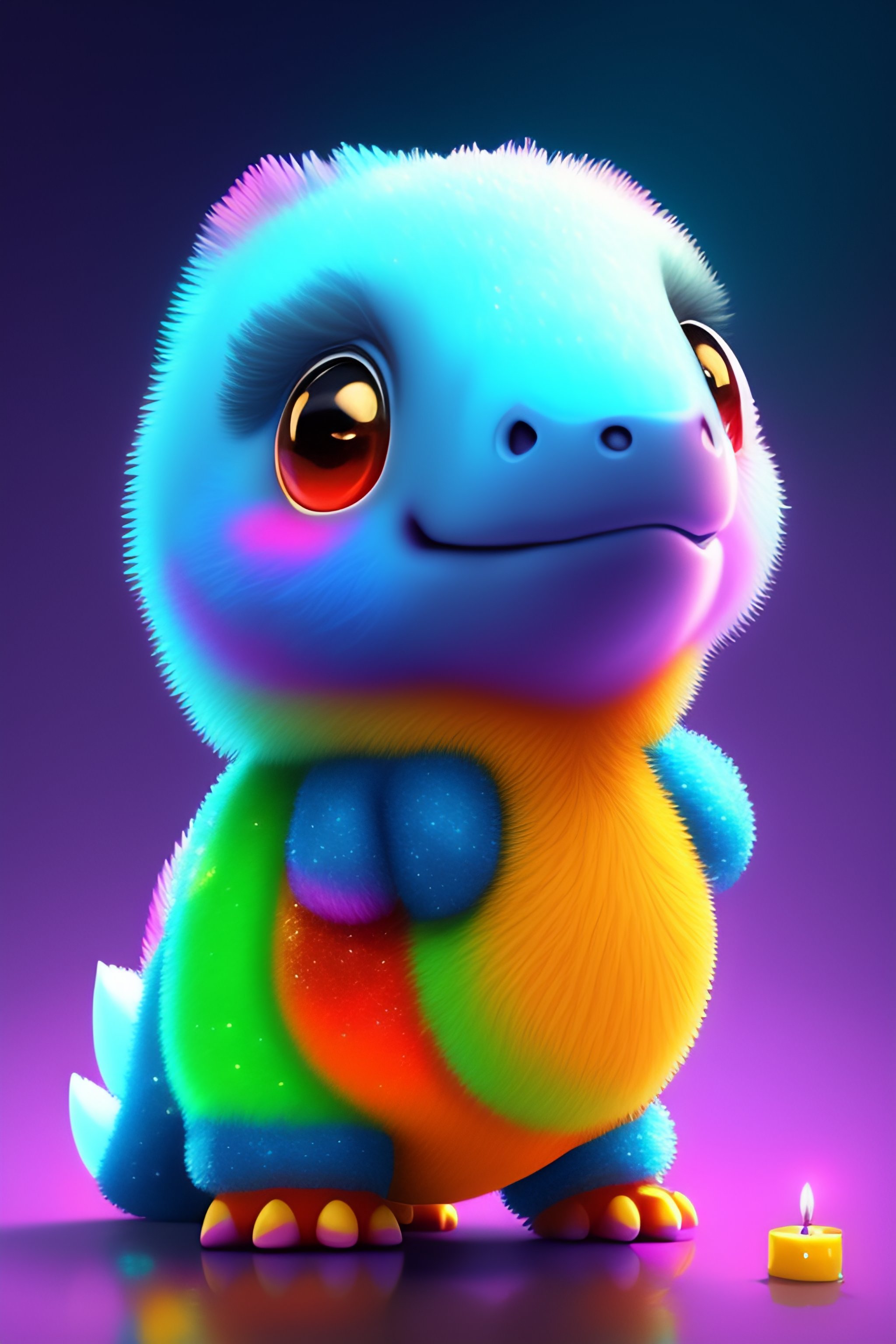 Cute and cool cartoon fluffy dinosaur, glitter, rainbow, shiny, happy birthday, fantasy, dreamlike, super cute, trending on artstation