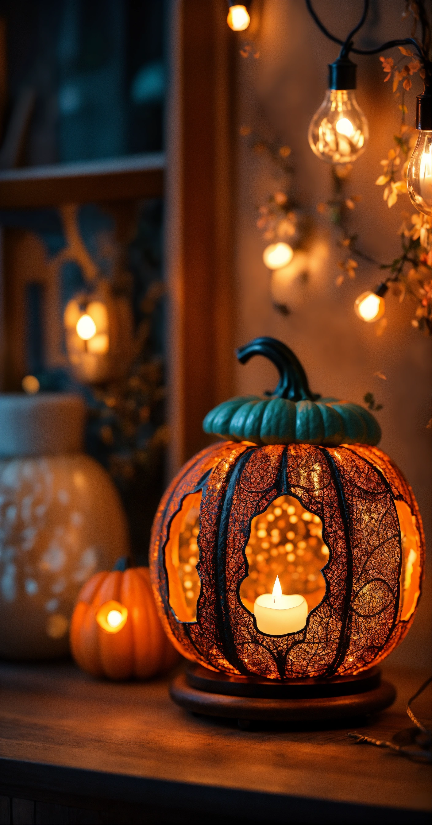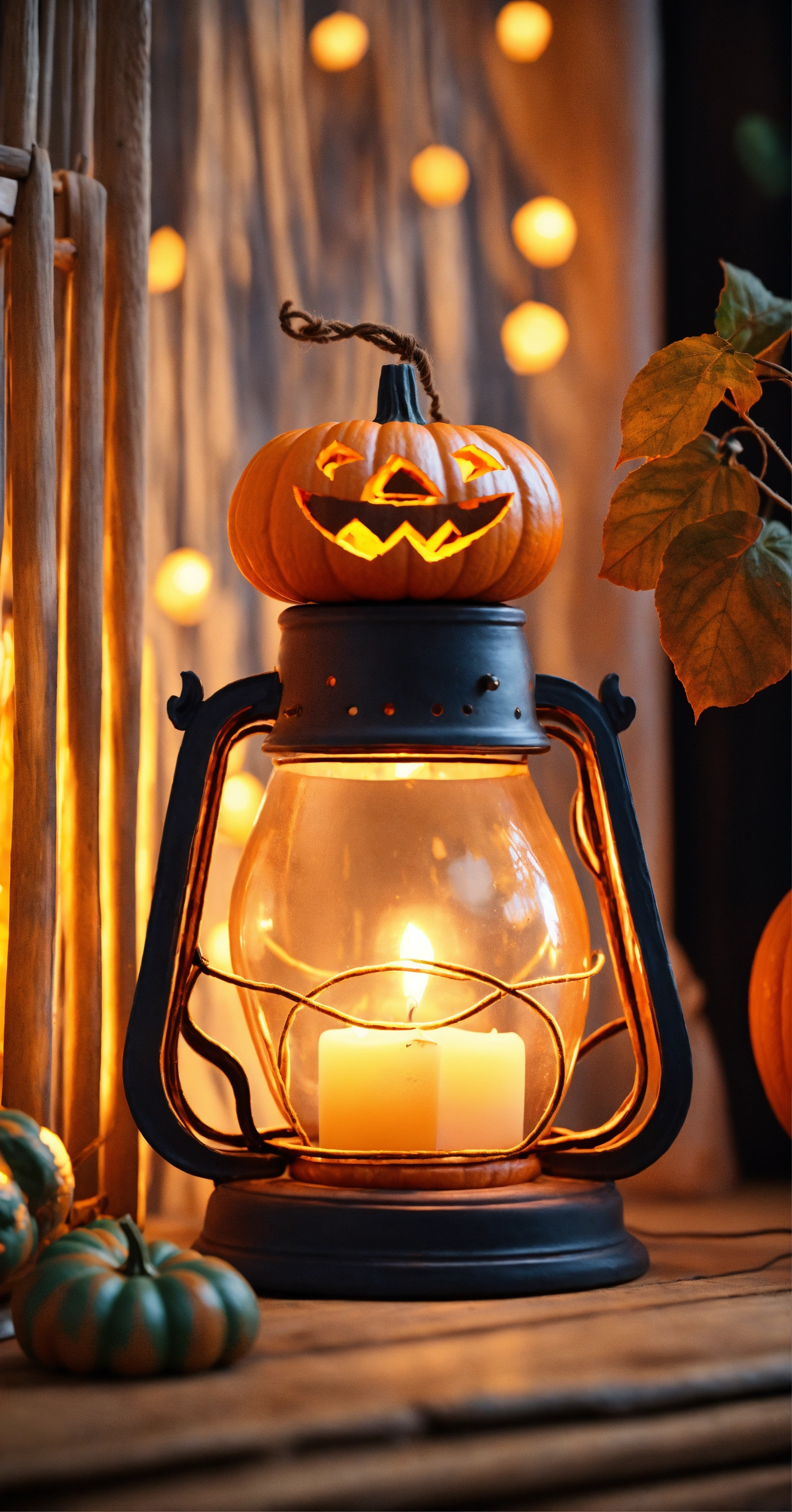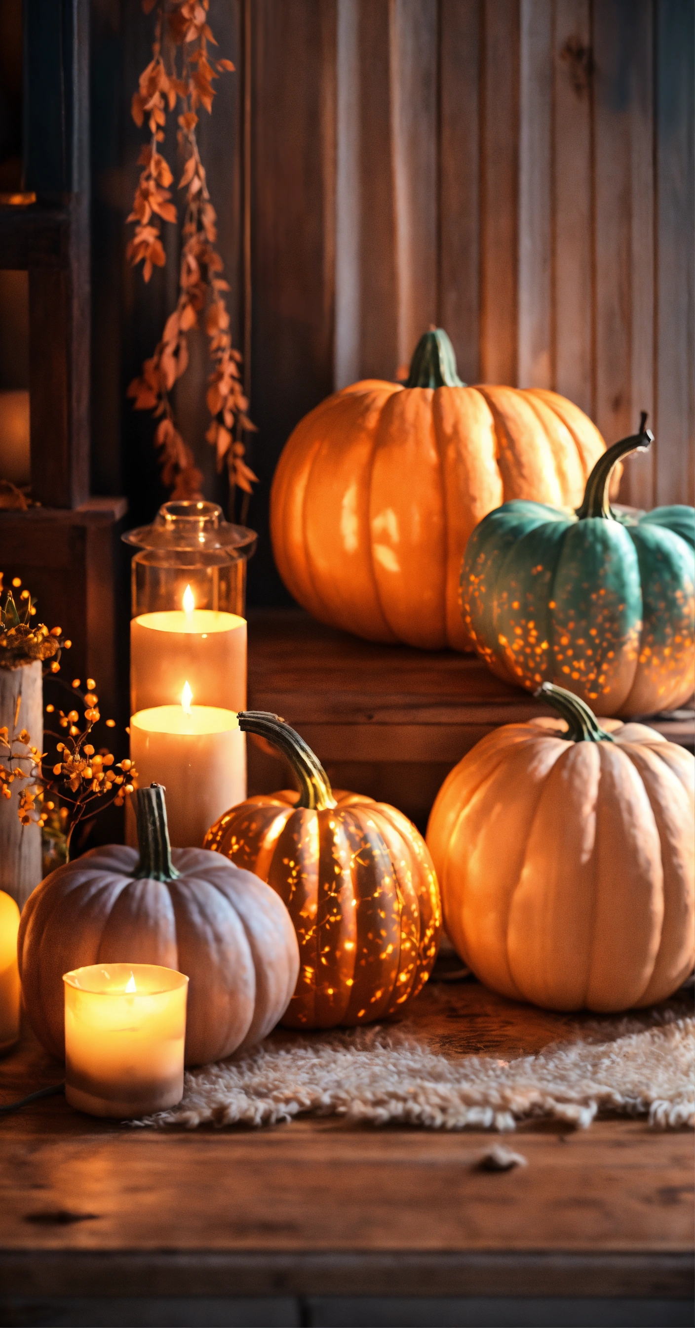 Magical cute pumpkin, boho lights, lamp beautiful, candles, ultra realistic foto, 8k, muted bright colours