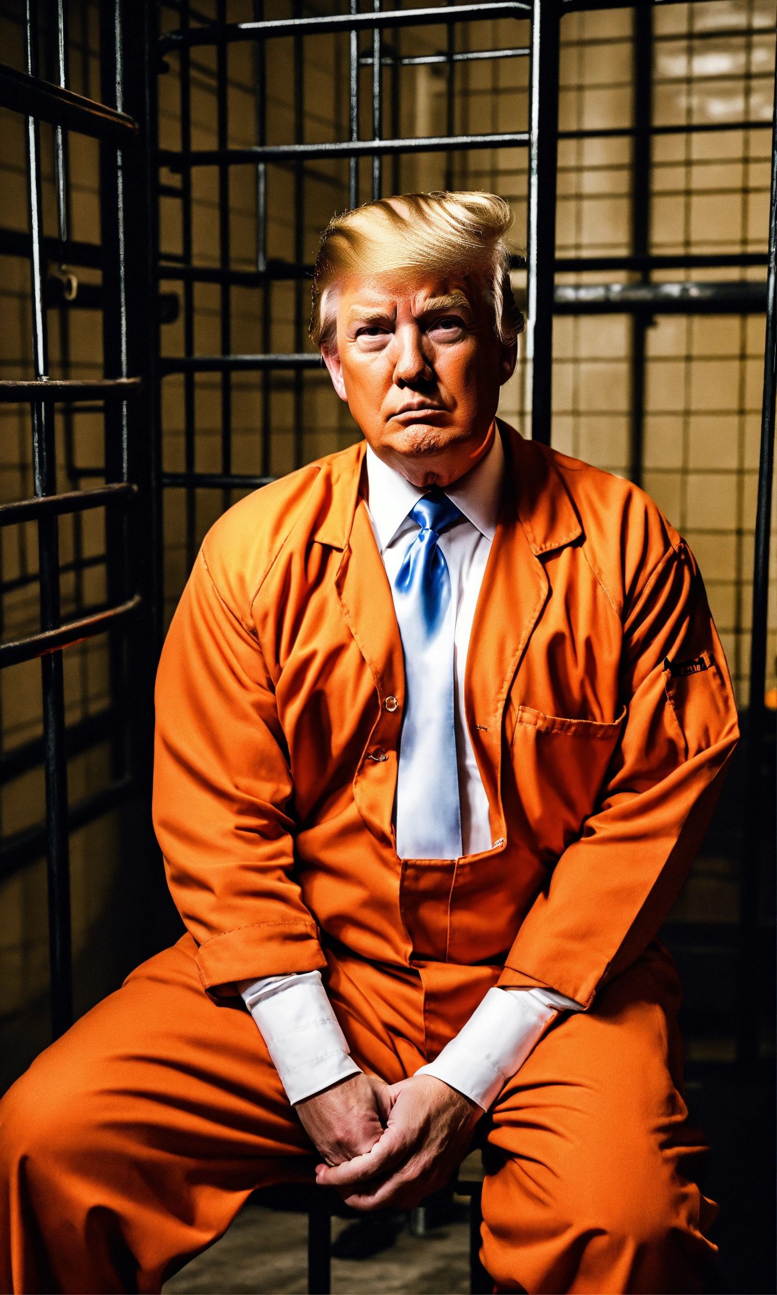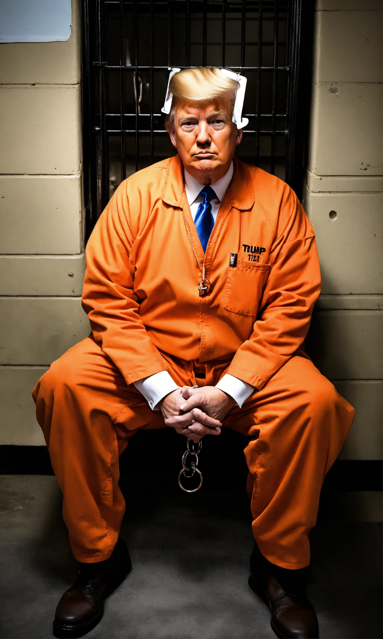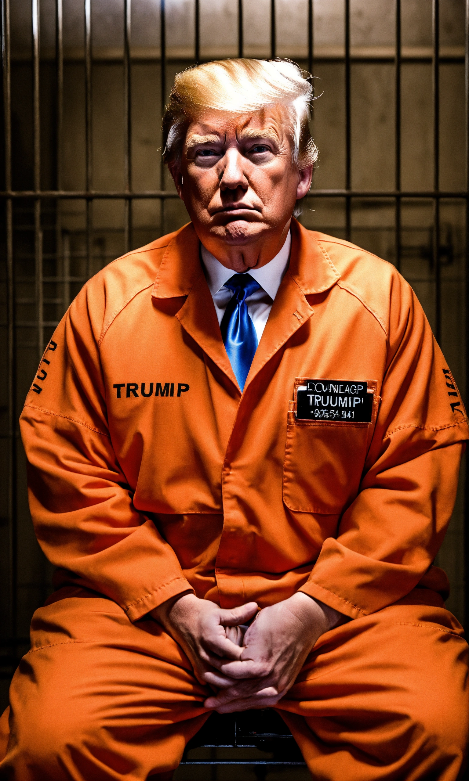 A professional mugshot photo of donald trump in a prison jumpsuit