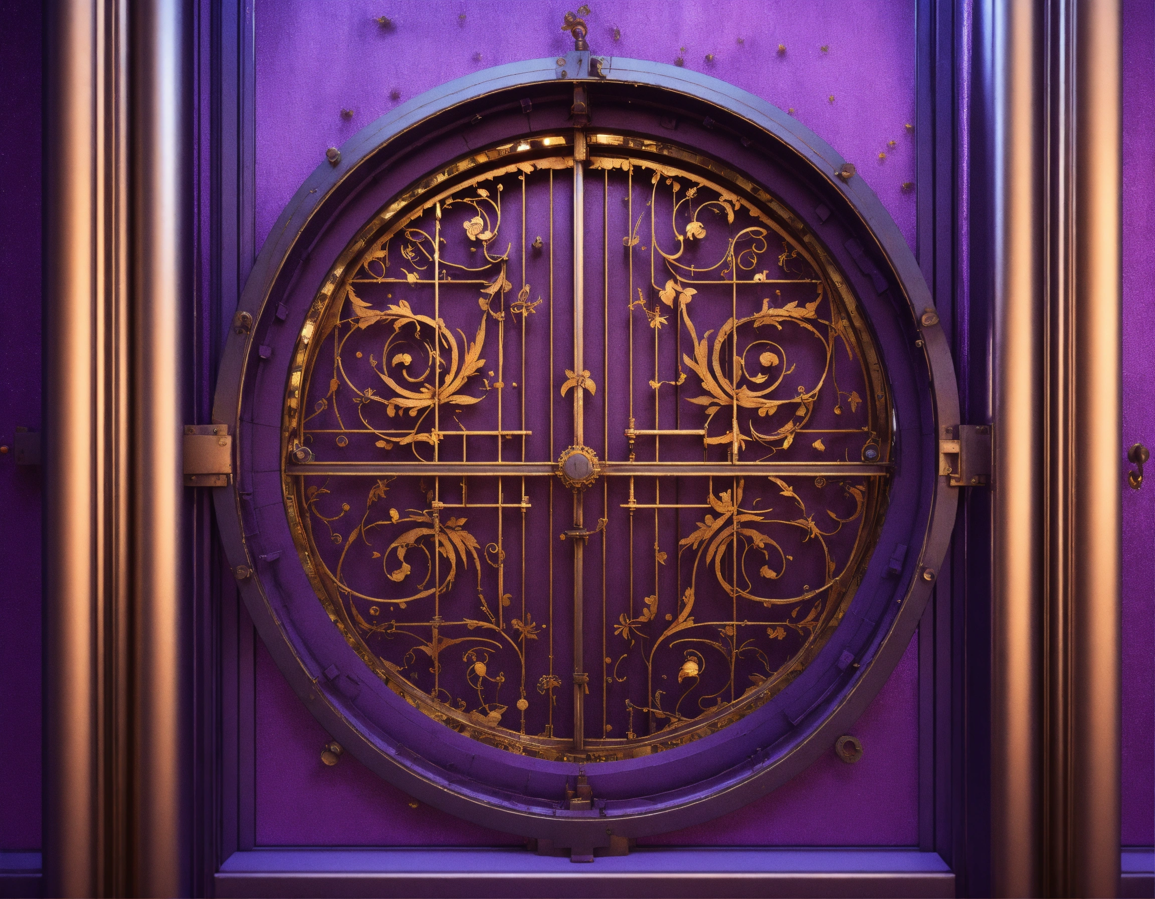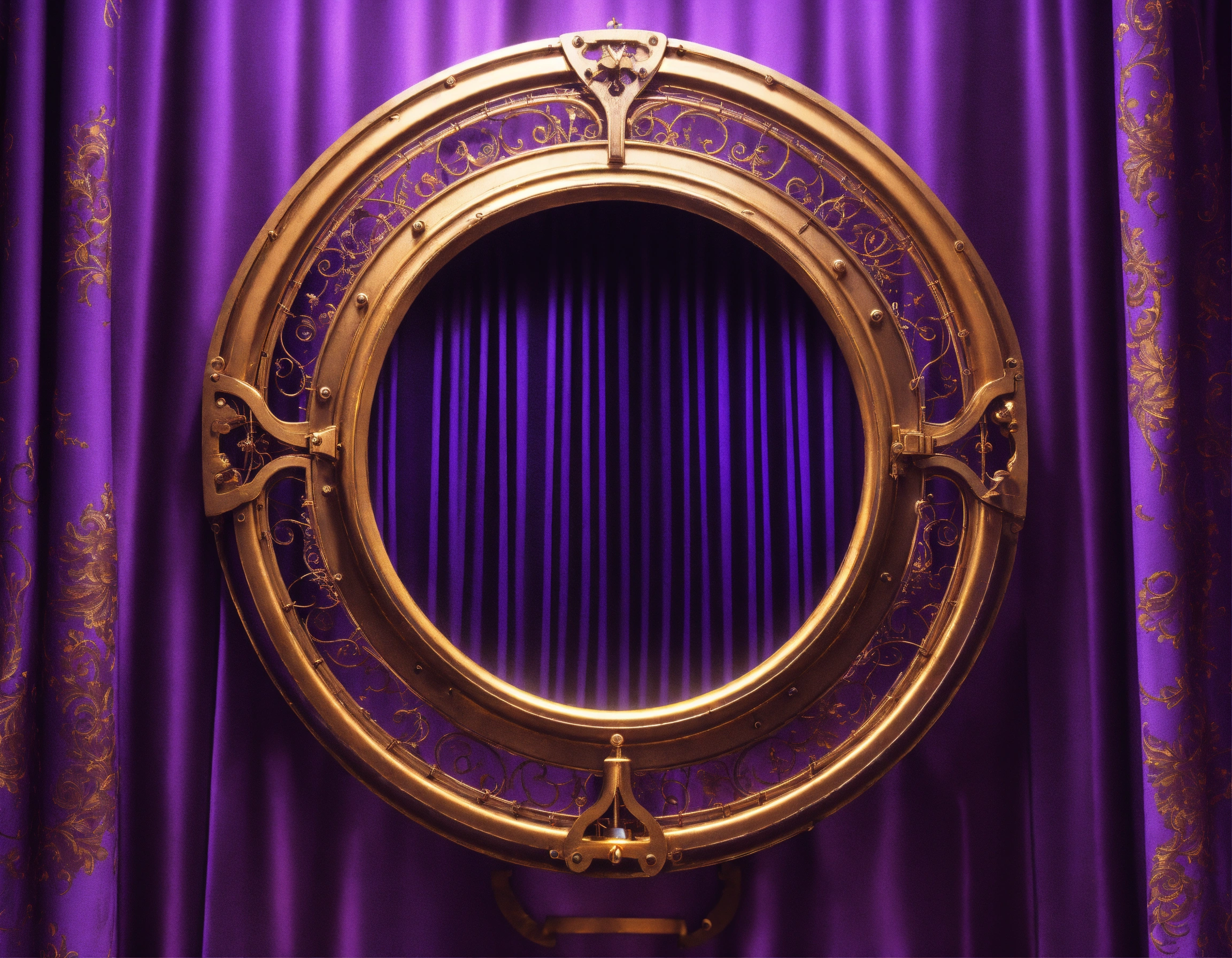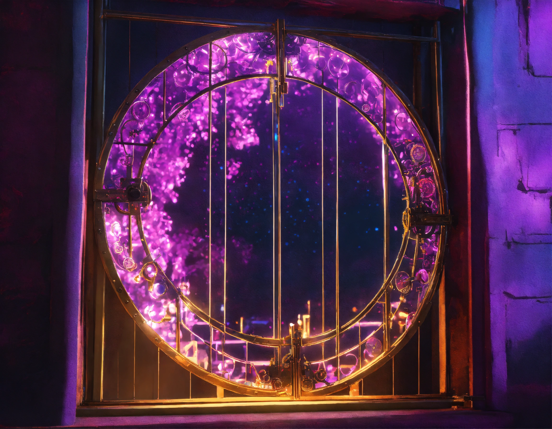 Night window circle, city front, realistc metal, wire, realist ornamental, gate heaven, grid, steampunk, closeup, realistc tiny fine, abstract psychedelic, 8 k, artstation, purple curtain
