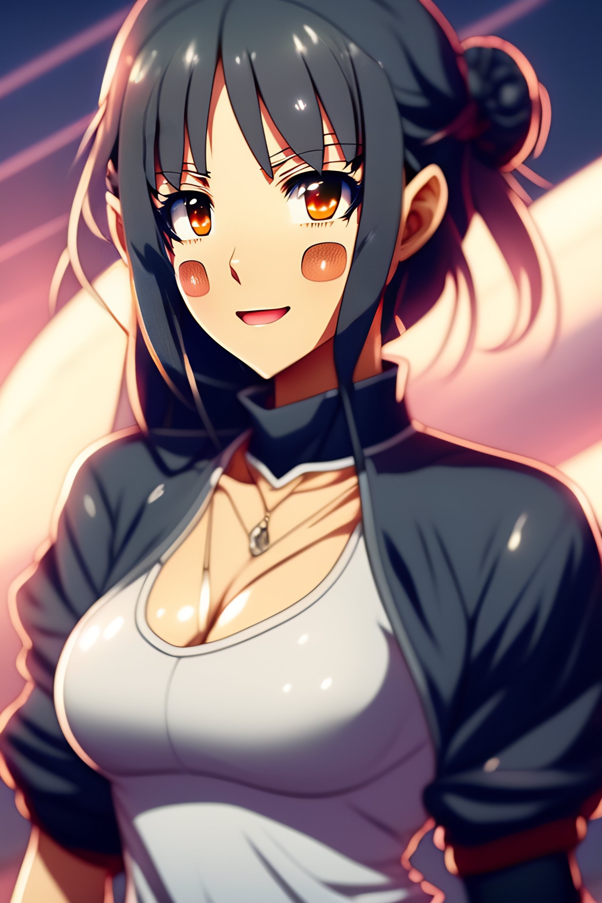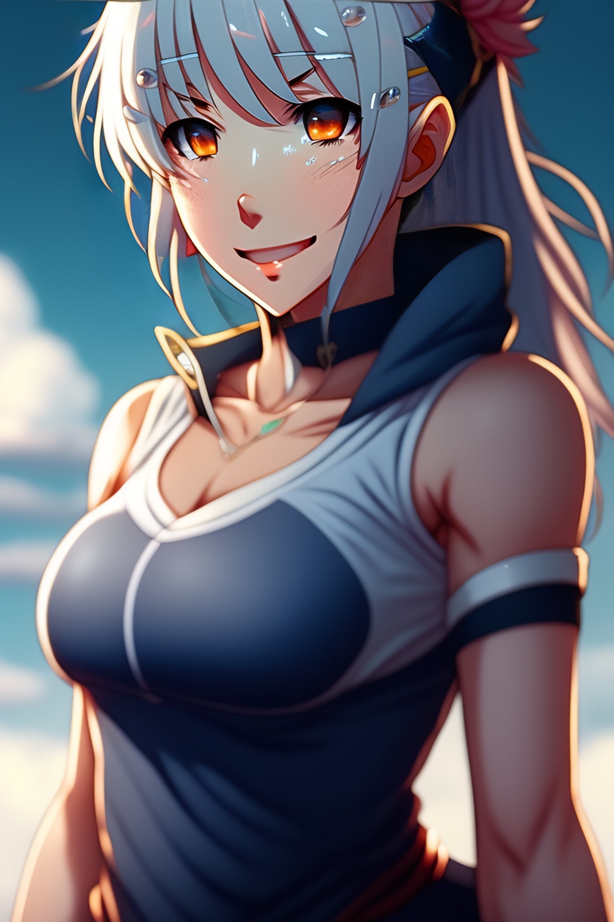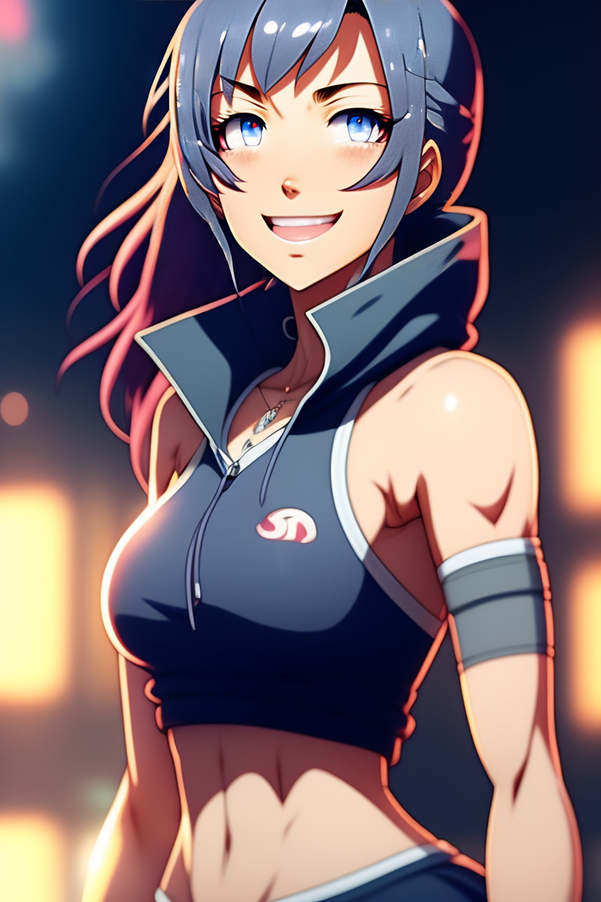 Smooth skin, sweaty armpits, armpits, sharp teeth, anime girl, blue eyes, skin tight top, devilish smile, high definition, high quality, steamy armpit, grey hoodie, stuffy air, sweat stain, symmetrical face, sly smile, visible sweat cloud, silk white skirt