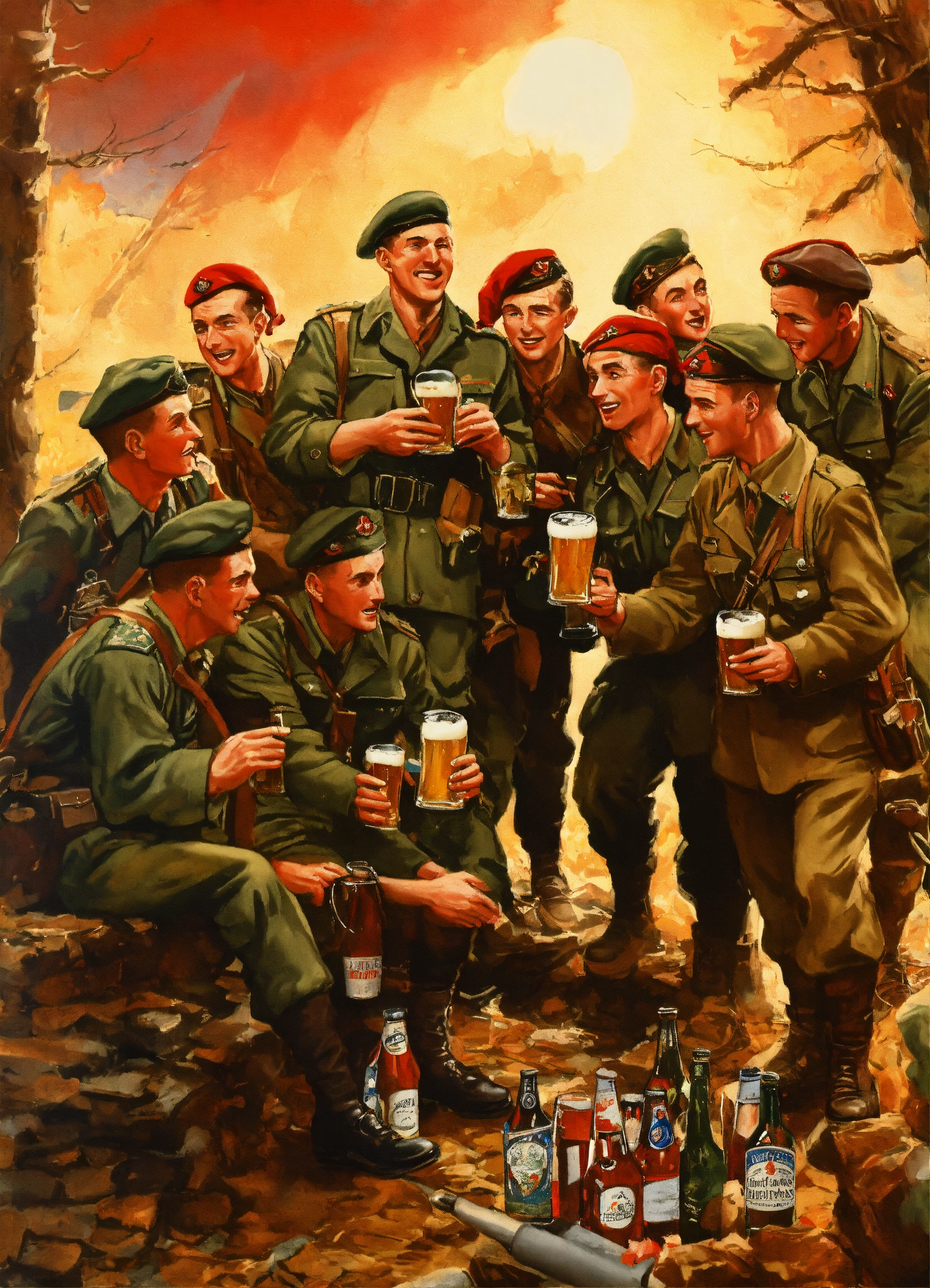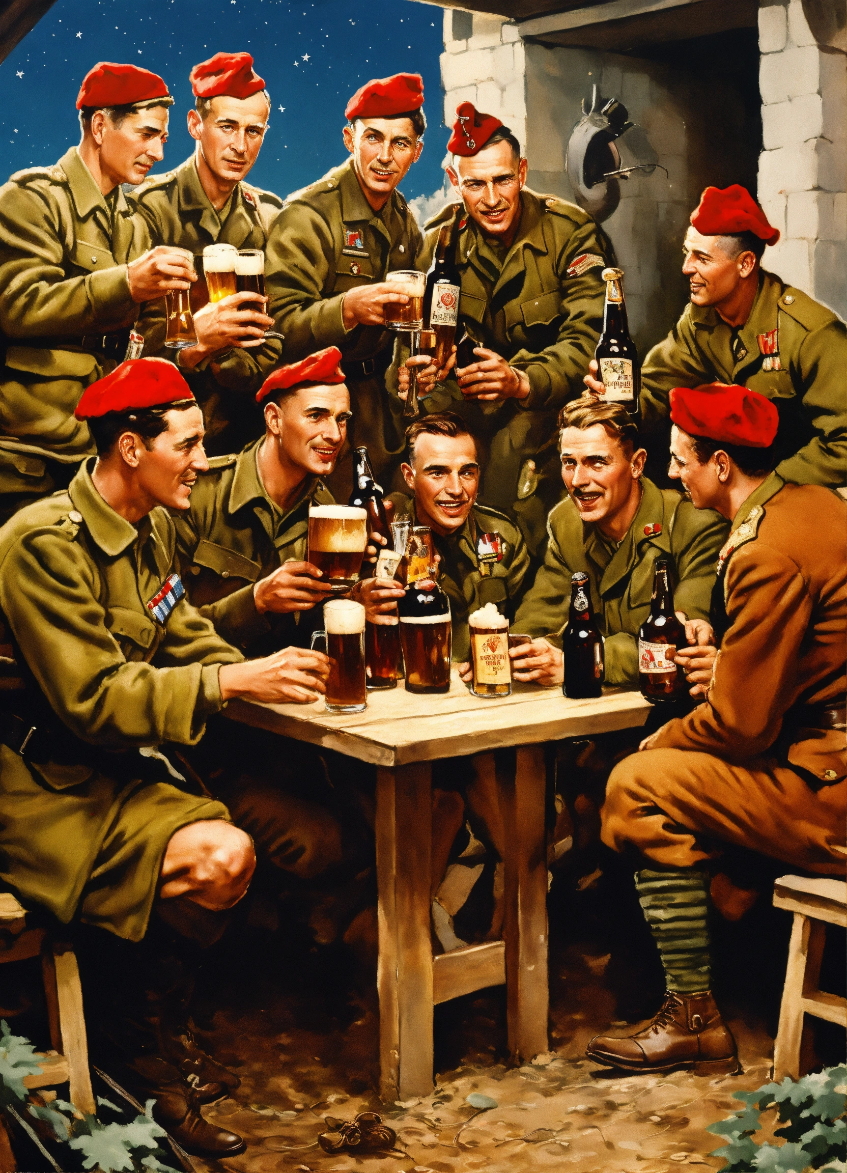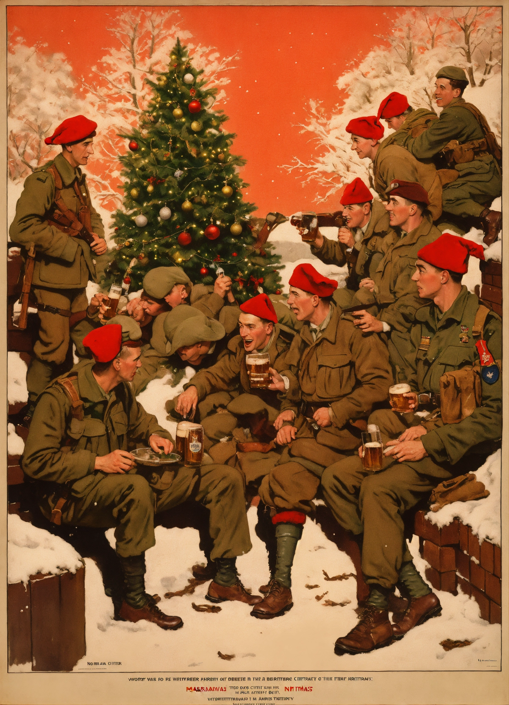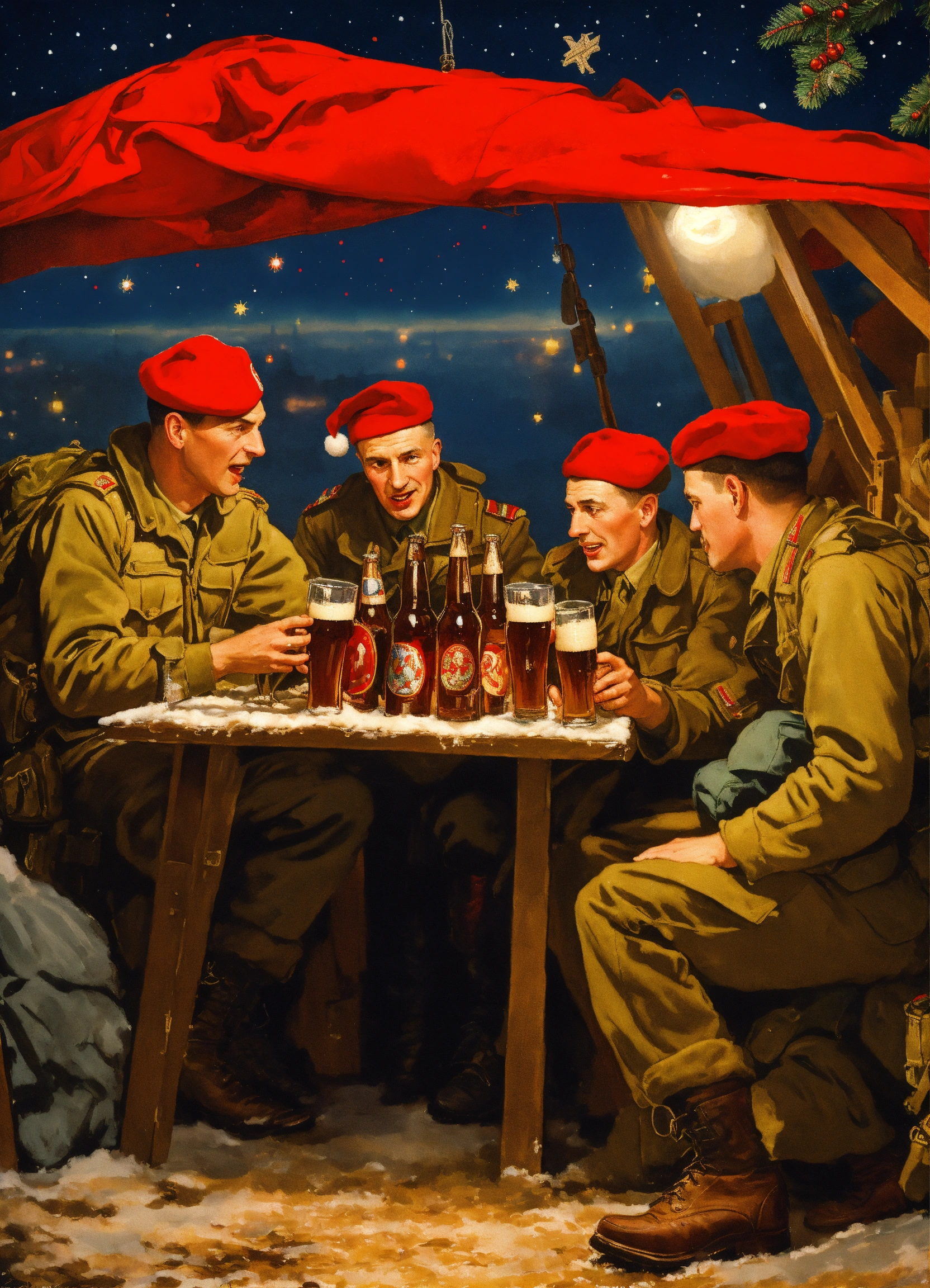 Wwii british paratroopers, celebrating chritmas day, toasting with beer, red berets, in a bridge too far film, nativity and christmas tree, in the style of norman rockwell, wwii propaganda poster, highly detailed, award - winning, patriotic, uk, wwii british army, dark, gritty, ink. a extraterrestrial soldier with them. dark ambient
