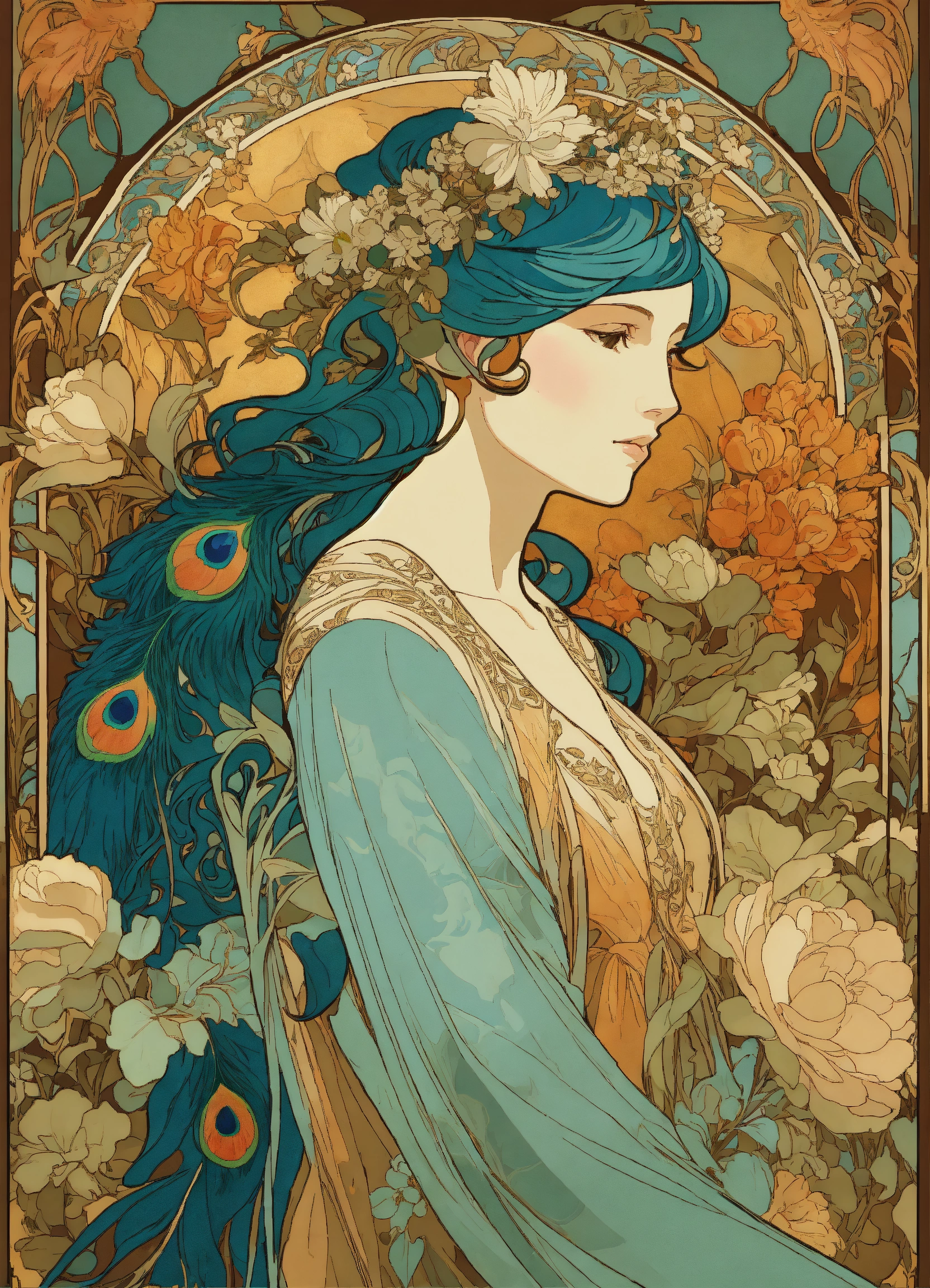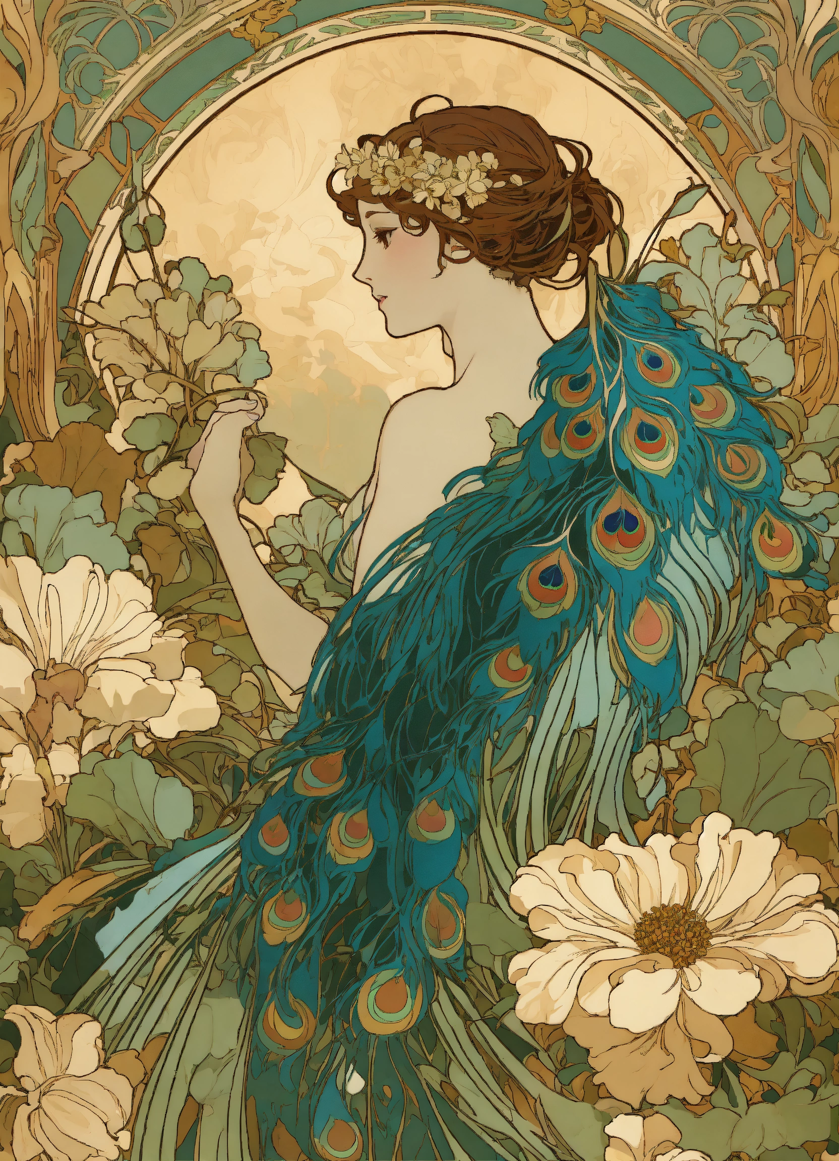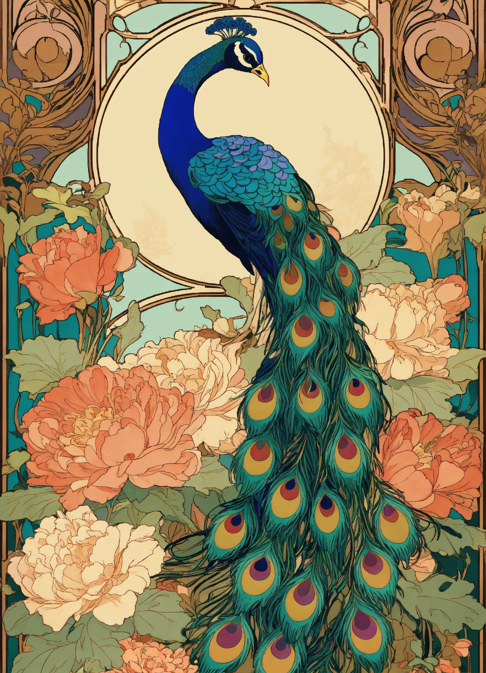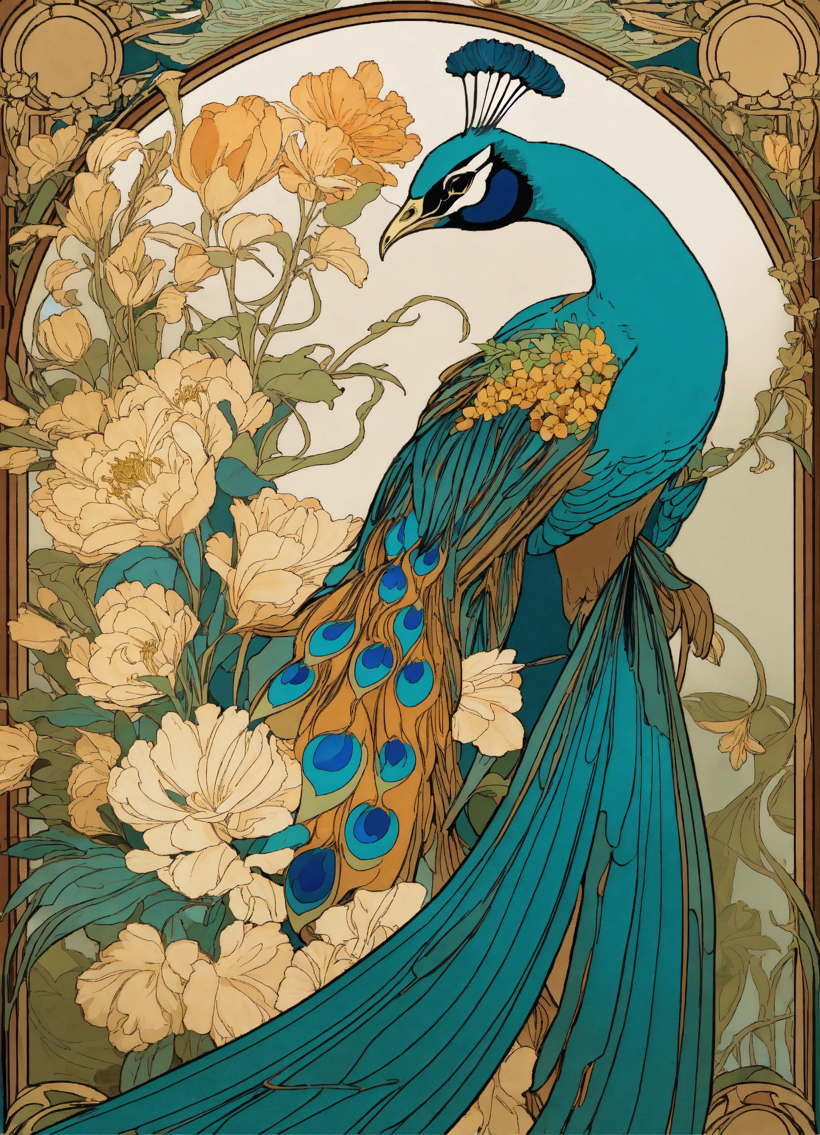 Flower bouquet art nouveau by alphonse mucha, meticulous precision, clear, clean lines, flat, vector, seamless pattern featuring peacock