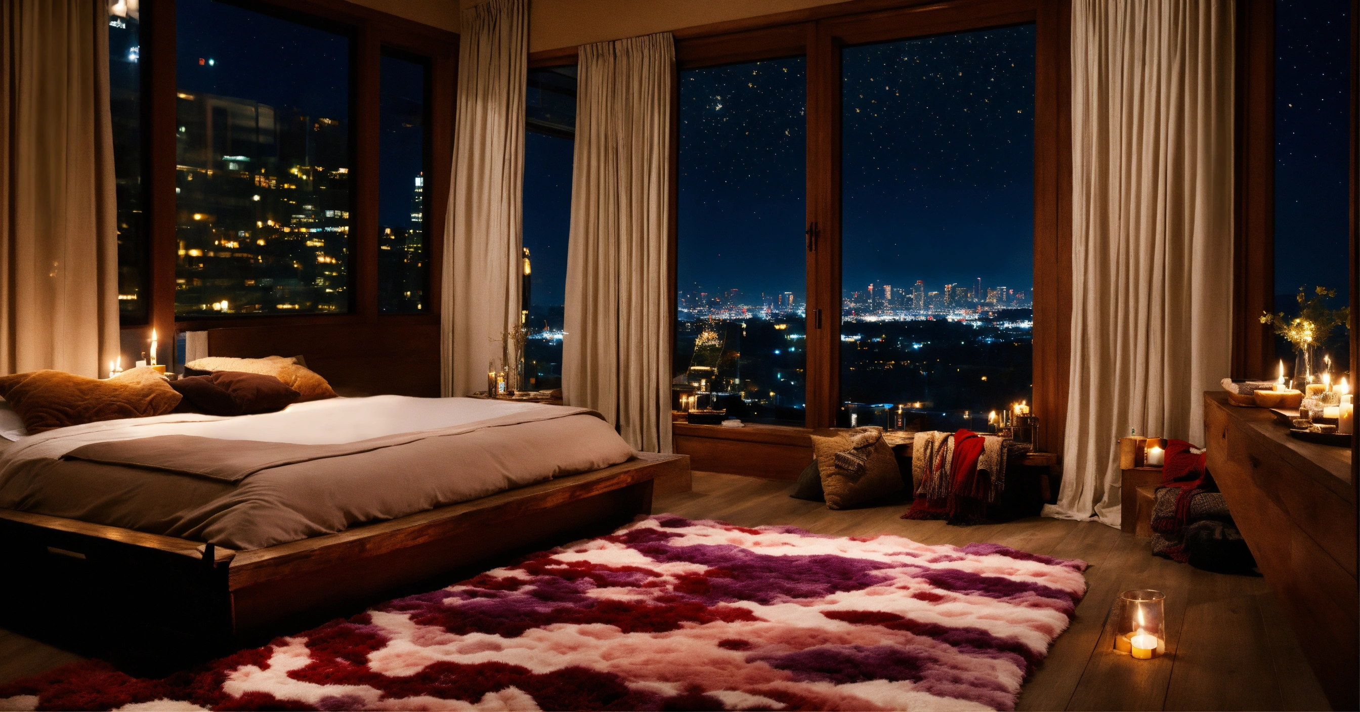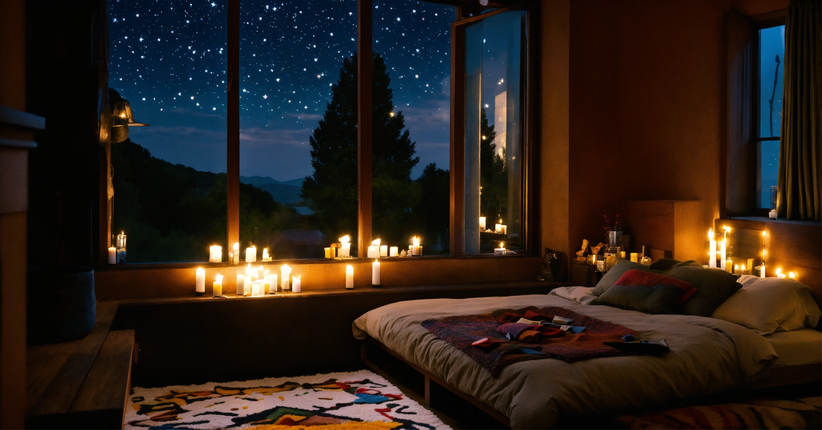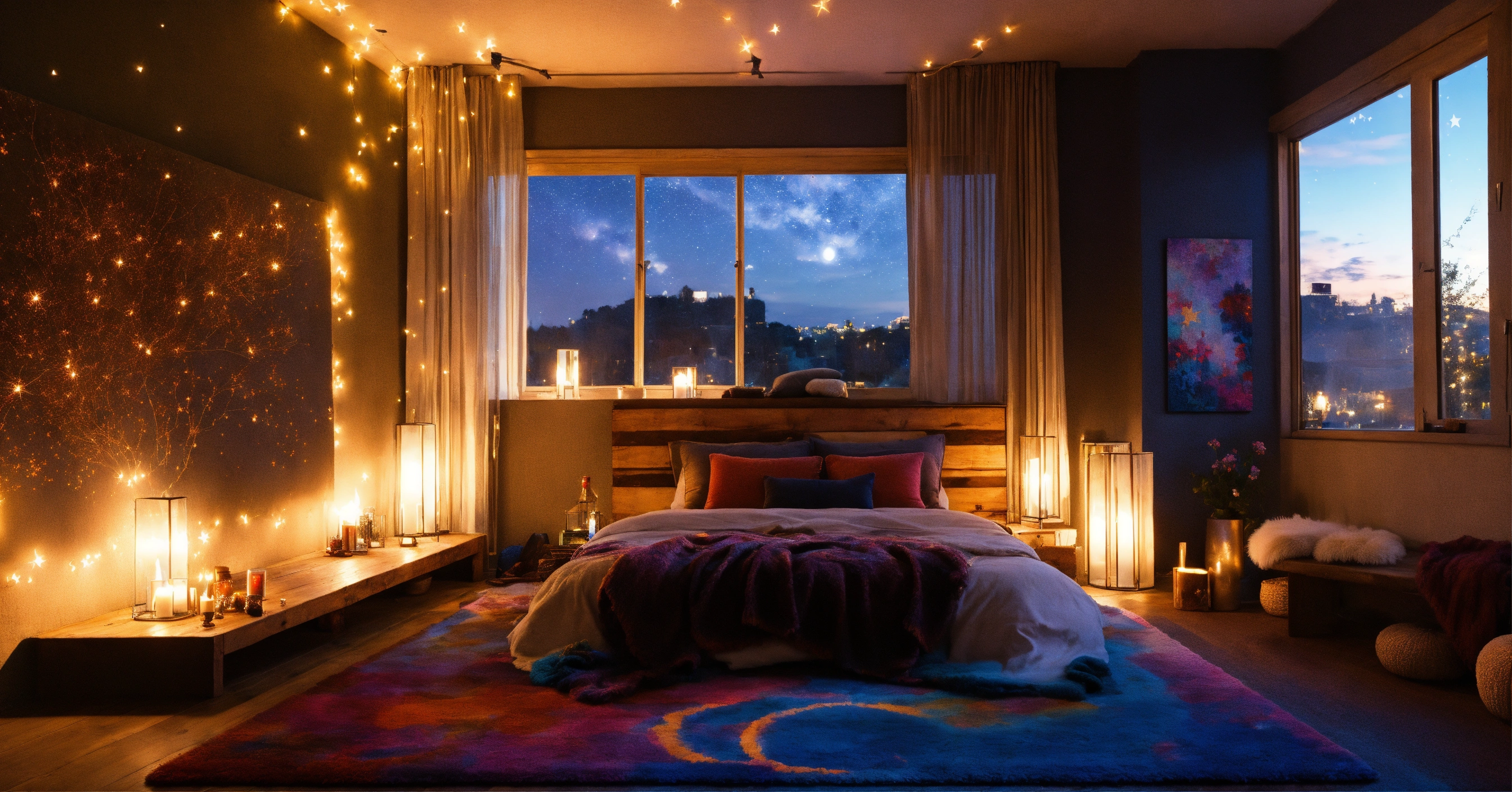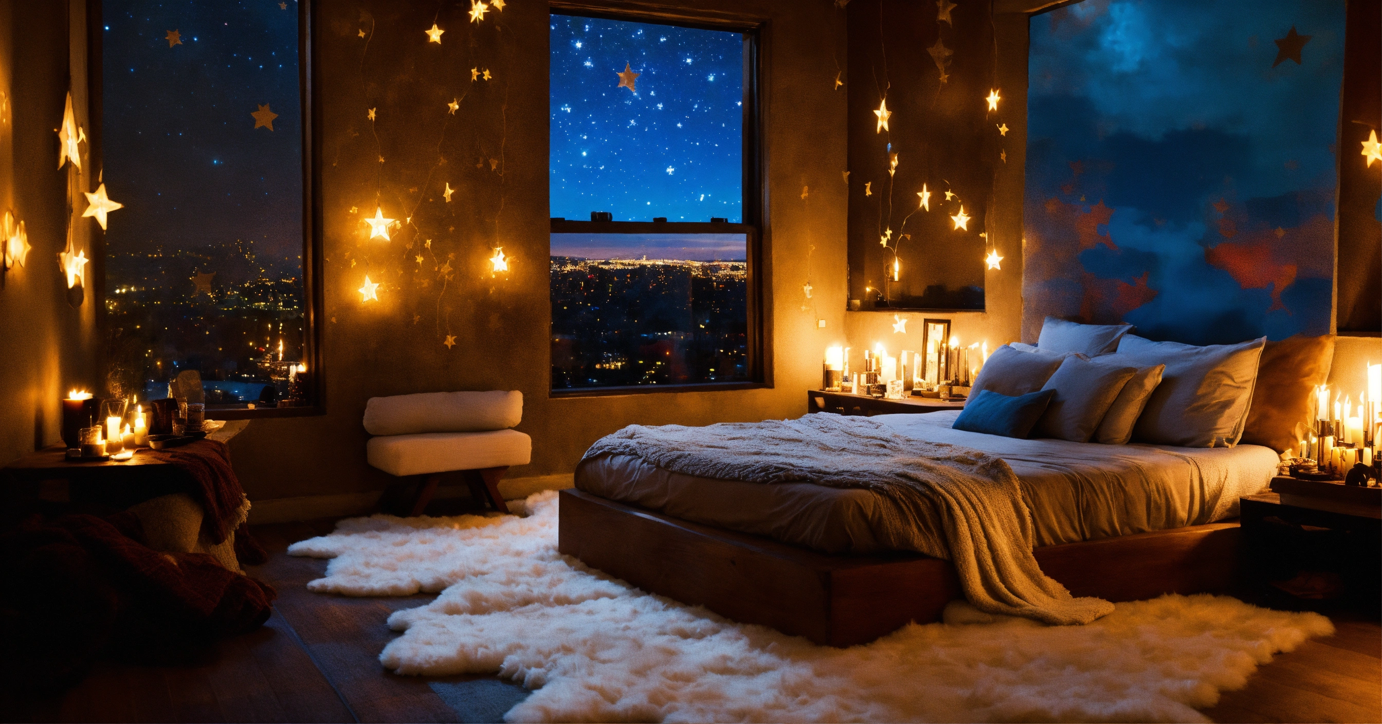 Bedroom night celiing window with stars fluffy rug dark wood big bed window bench candles grafitti