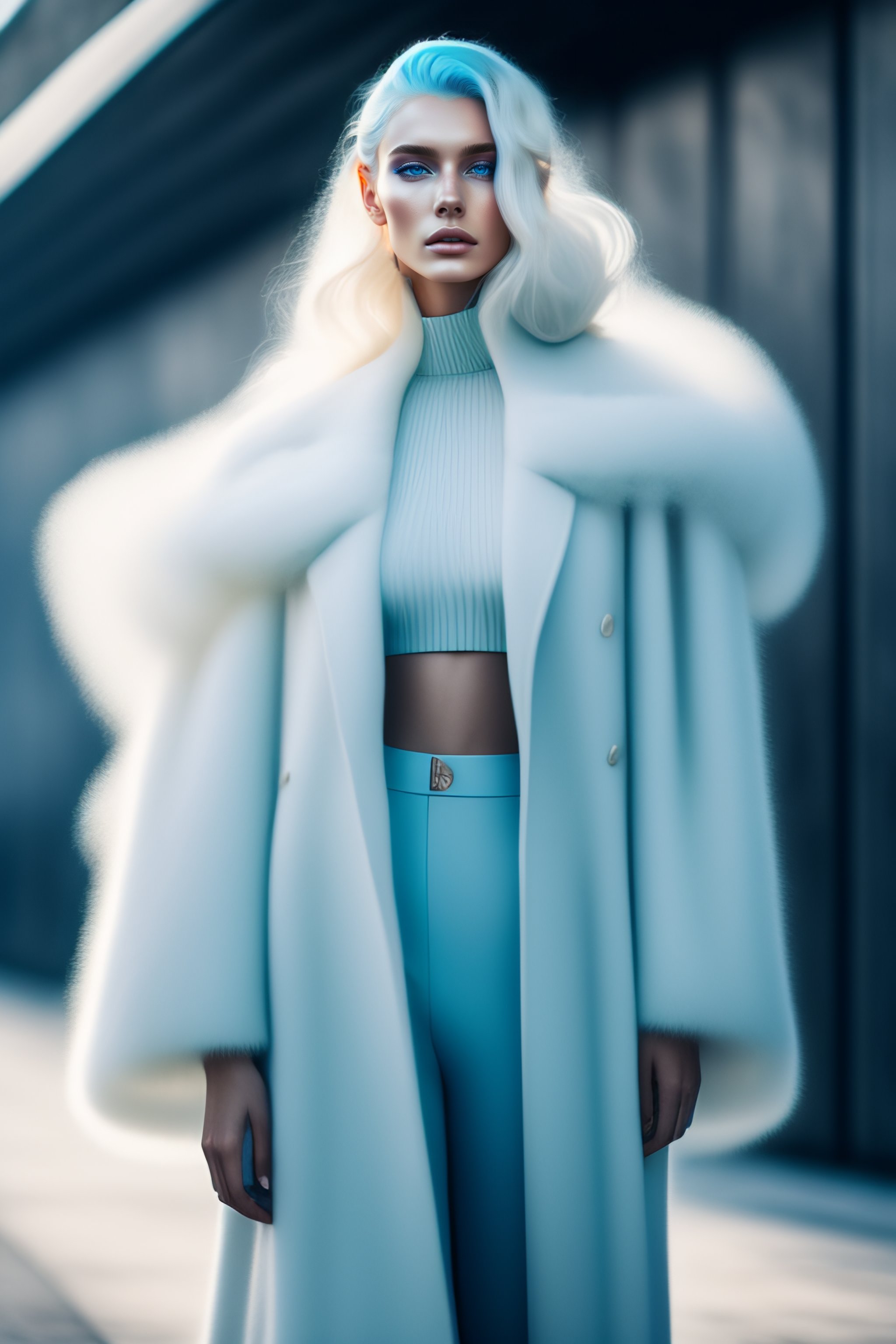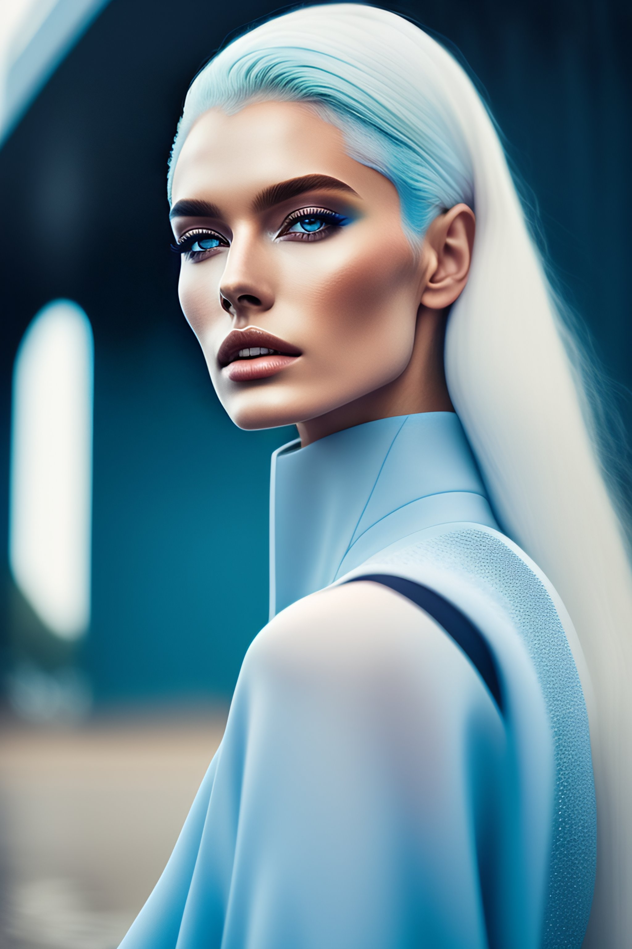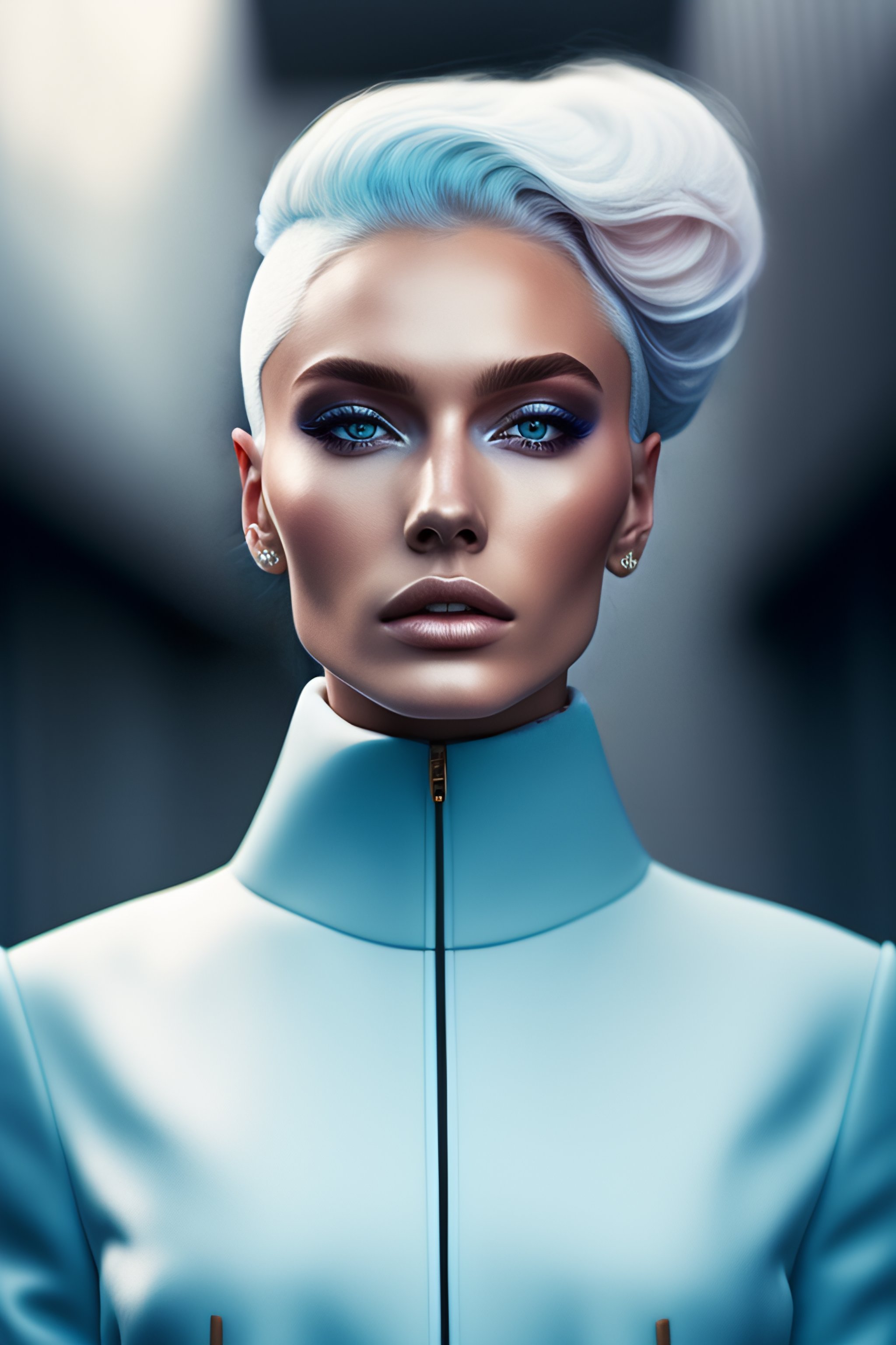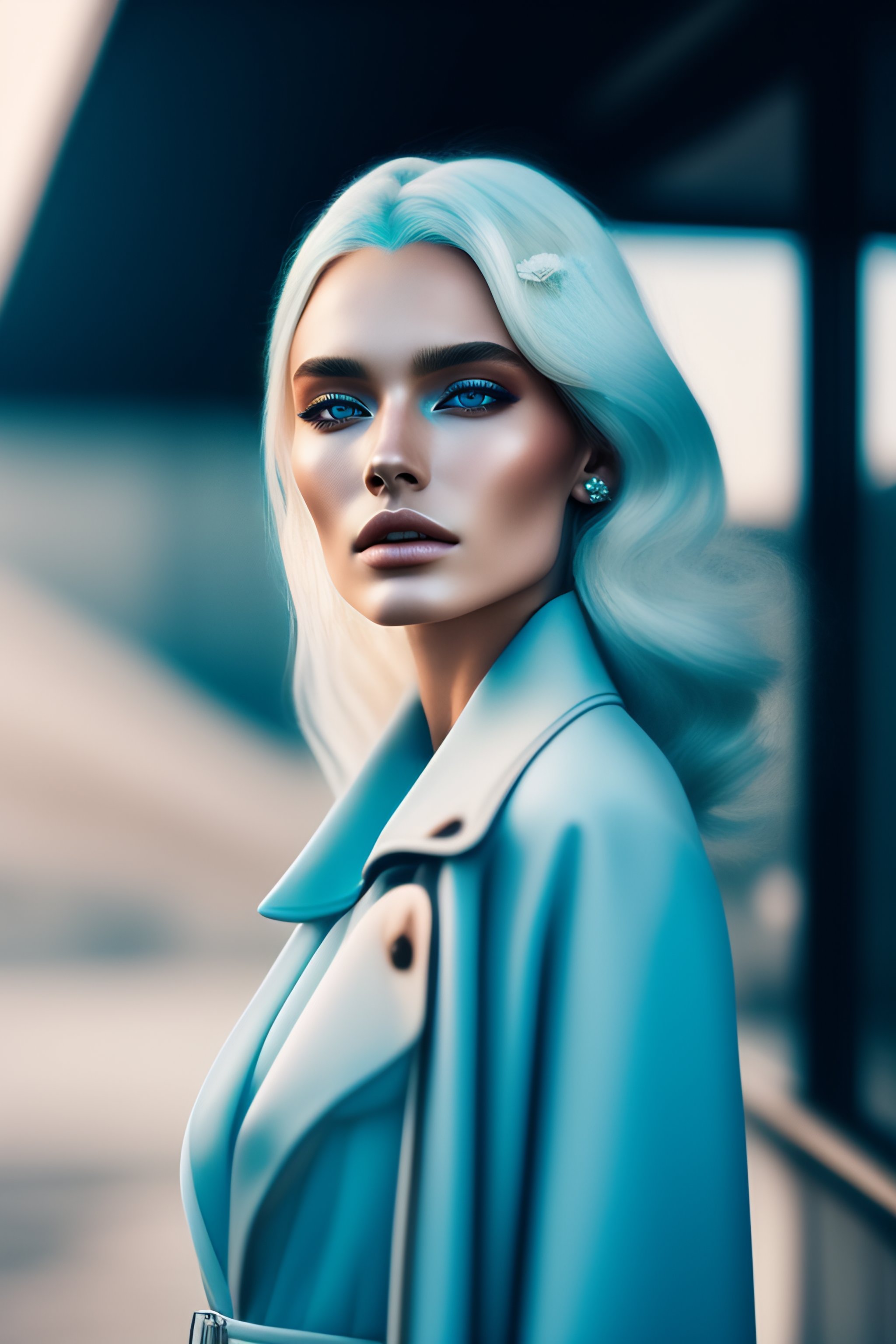 Portrait of haute couture beautiful russian fashion model with pale blue hair, as a formula 1 professional, full body, rossdraws, artgerm.ethereal dreamy foggy, photoshoot by alessio albi, editorial fashion magazine photoshoot, fashion poses, in front of brutalist building architecture. kinfolk magazine. film grain.