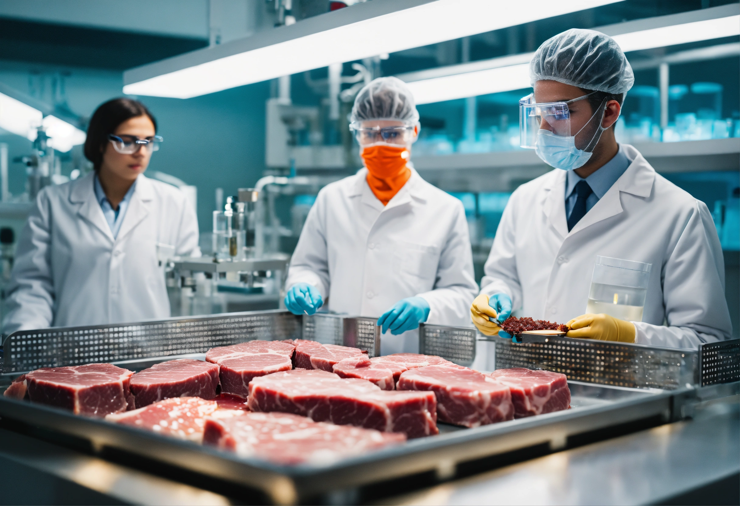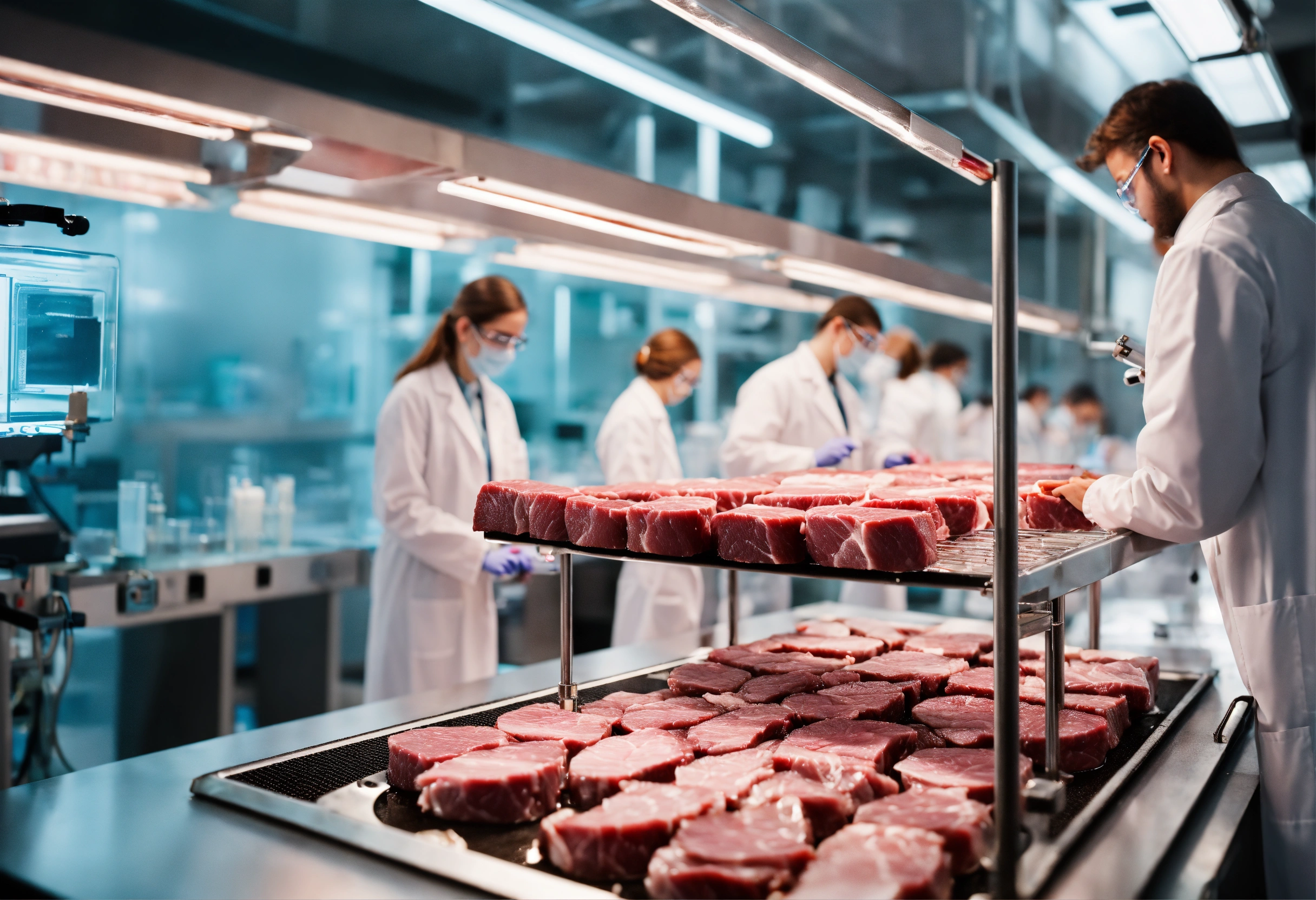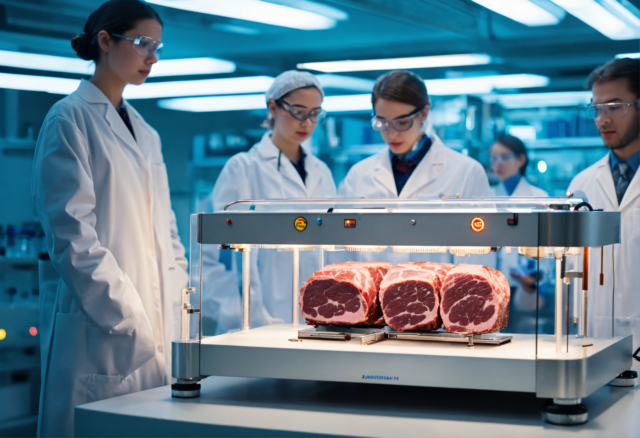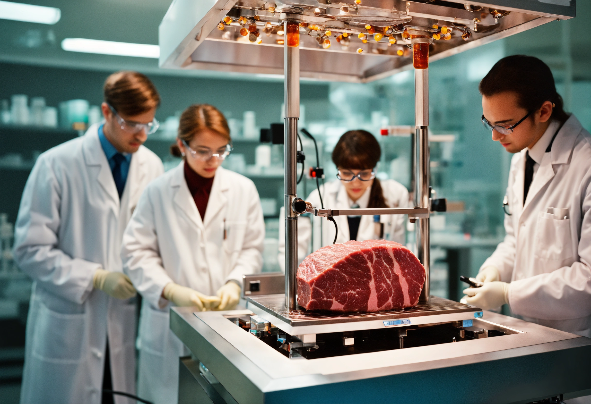 Small piece of cultivated meat in a futuristic apparatus in a laboratory environment with group of diverse scientists wearing lab coats, zoomed in