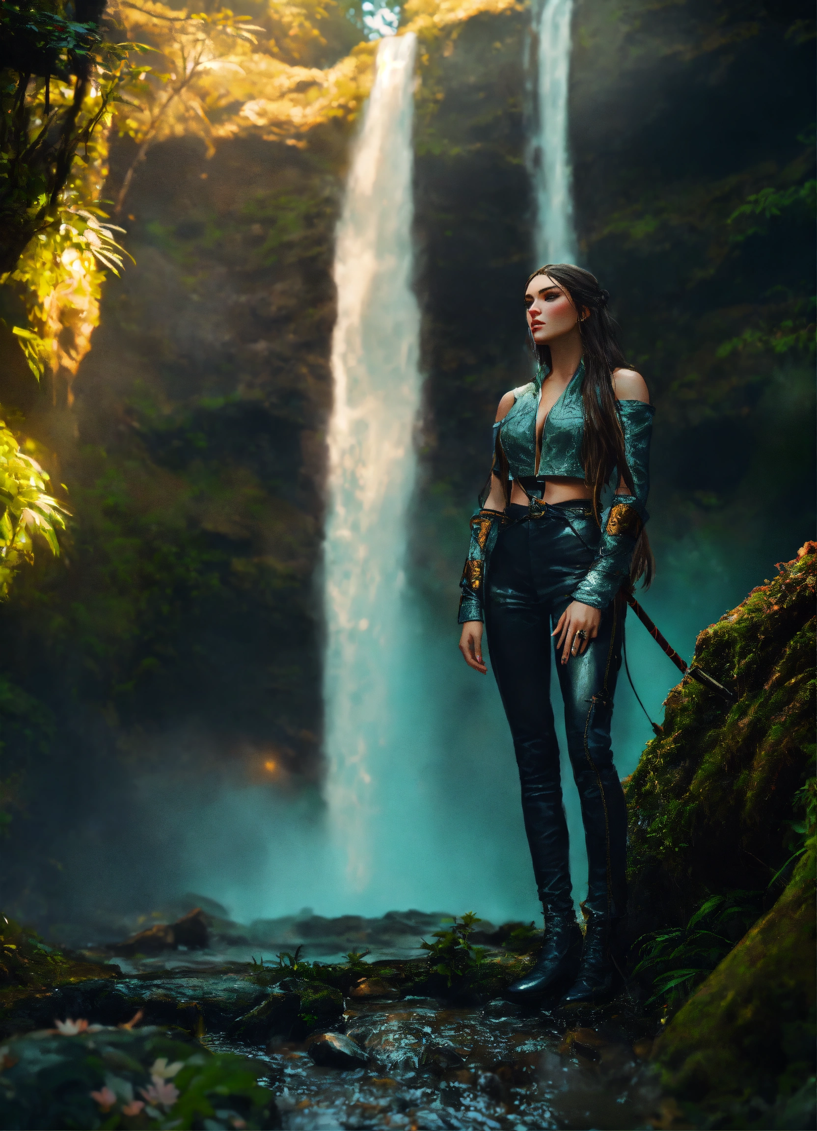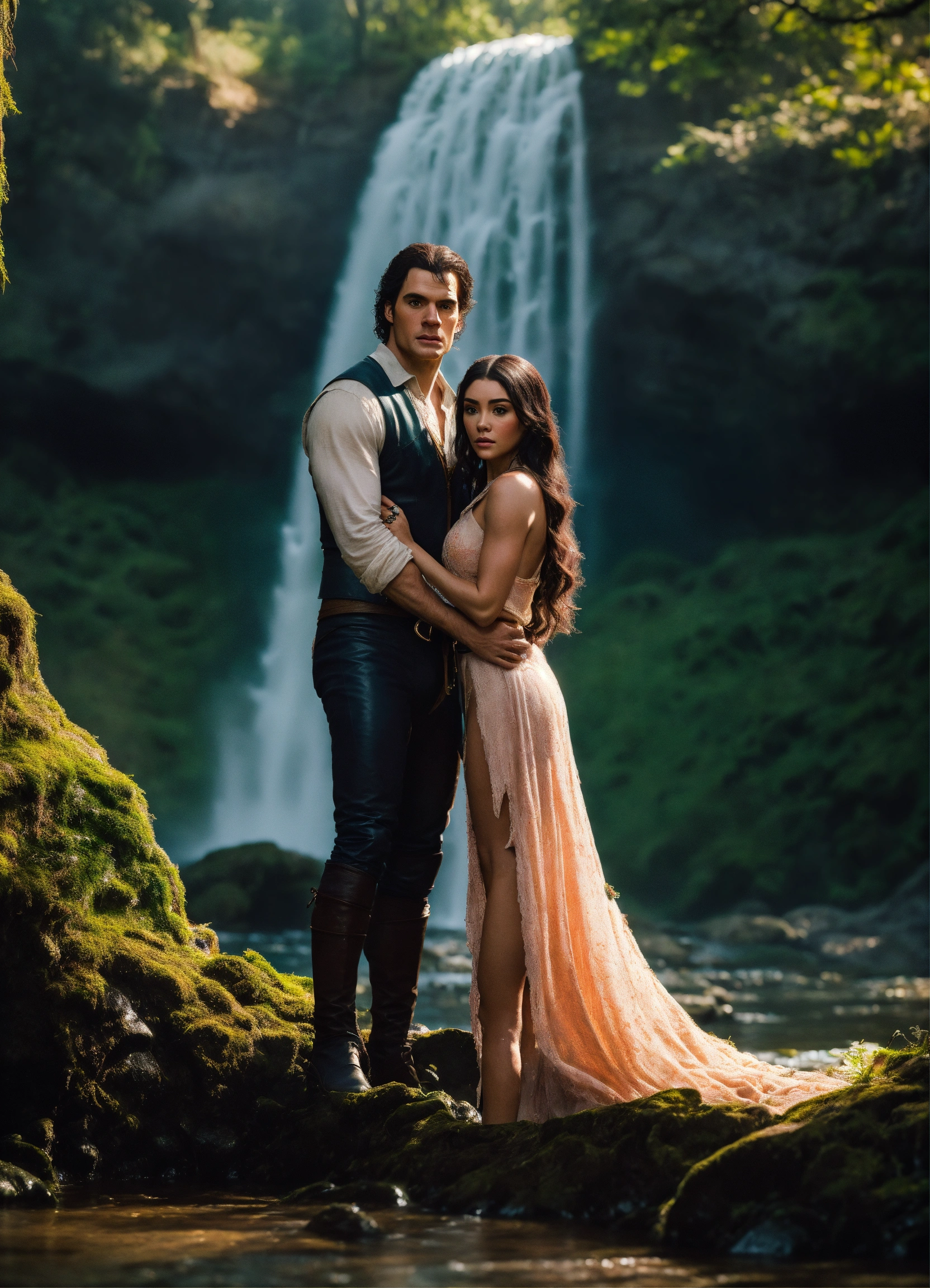 Madison beer, the witcher, at a waterfall with henry cavill. magical forest with glowing plants, realistic. full body. 4k real photoshoot.