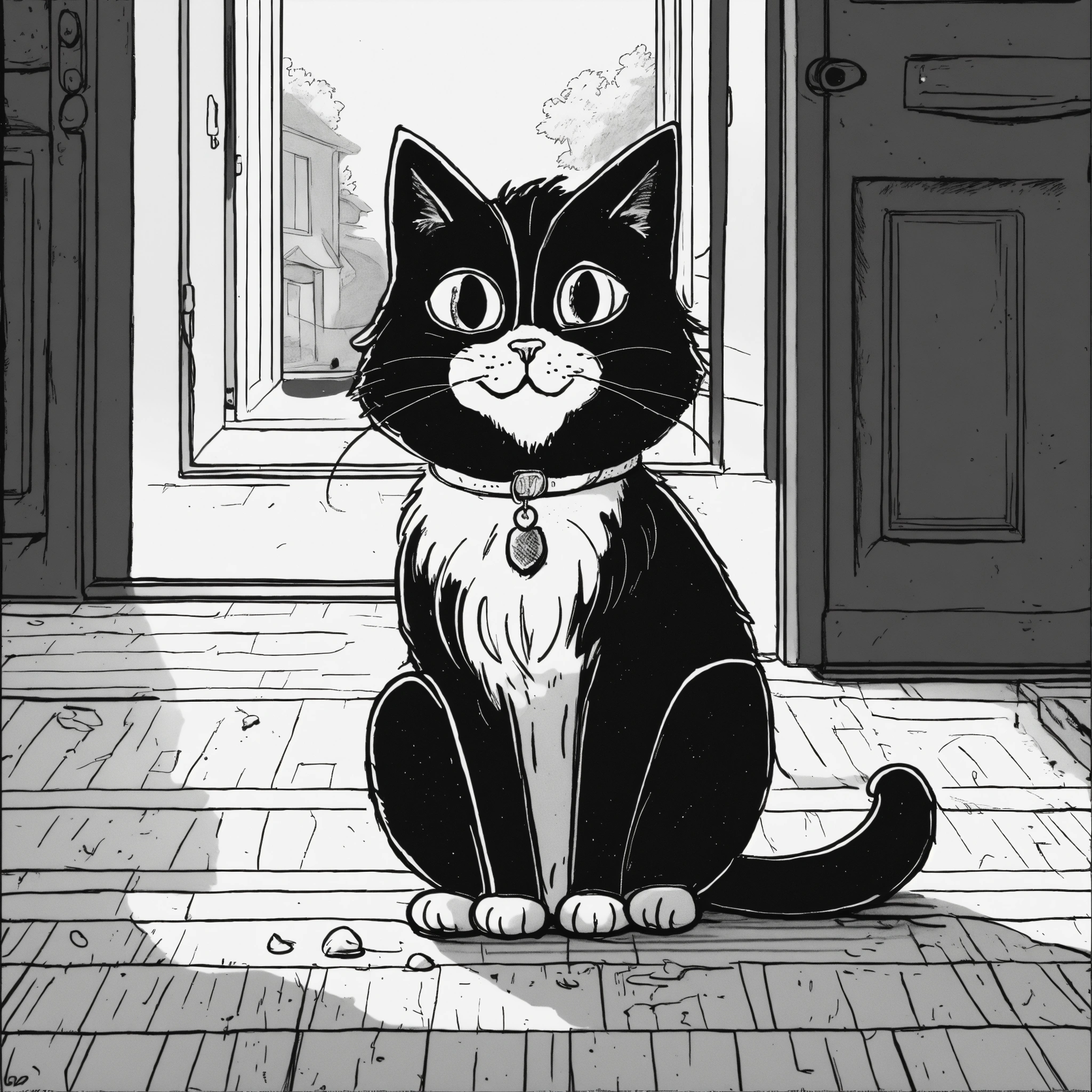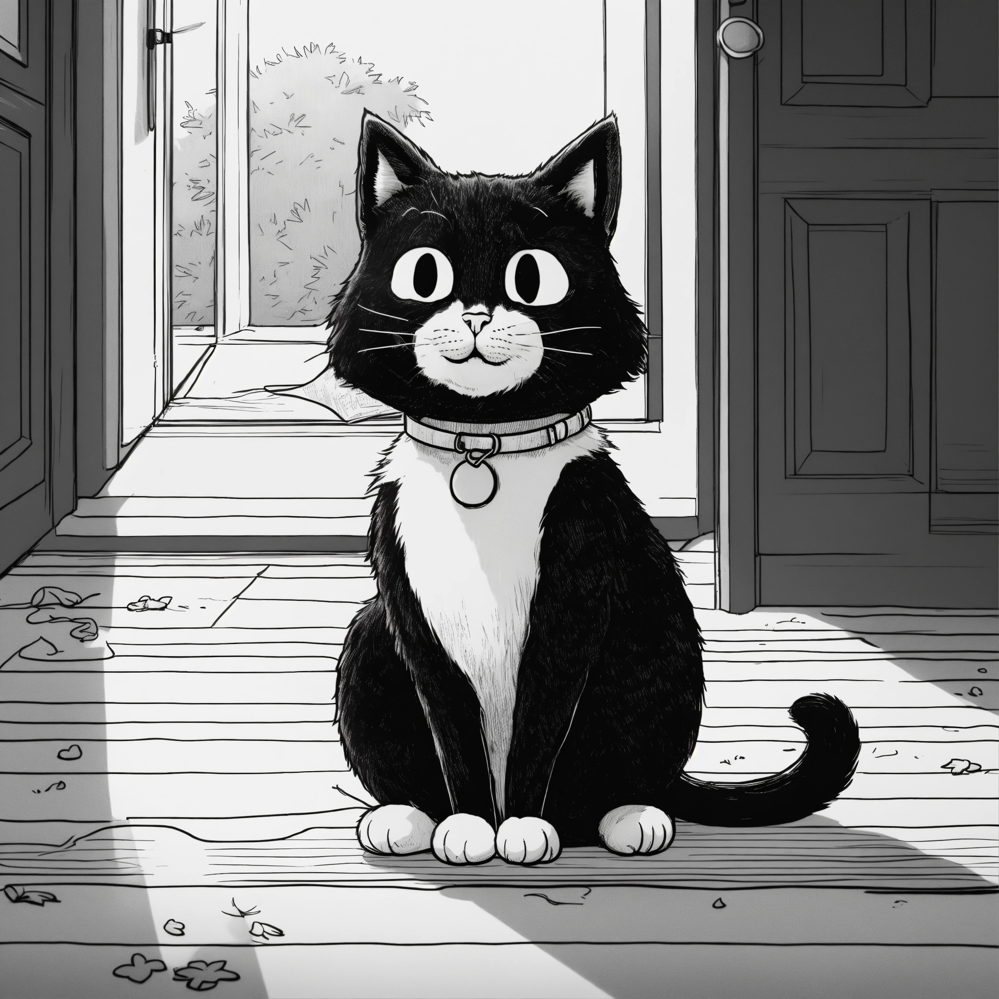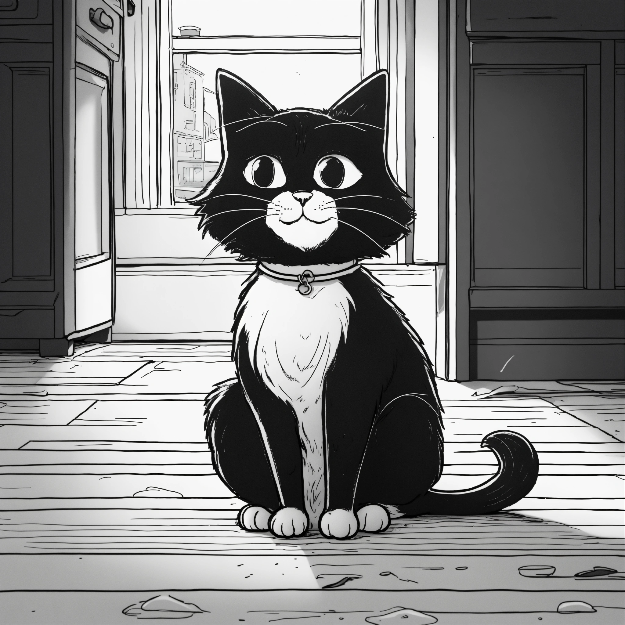 An ink drawn black and white cartoon cat sitting upright on the floor, text under cat reads 'good morning', 8k