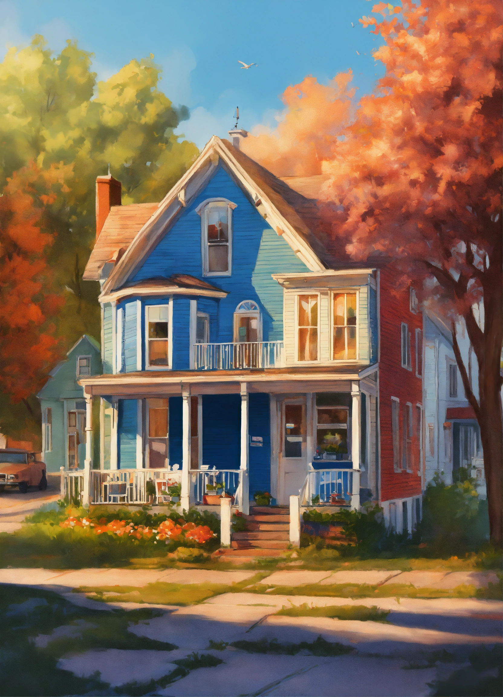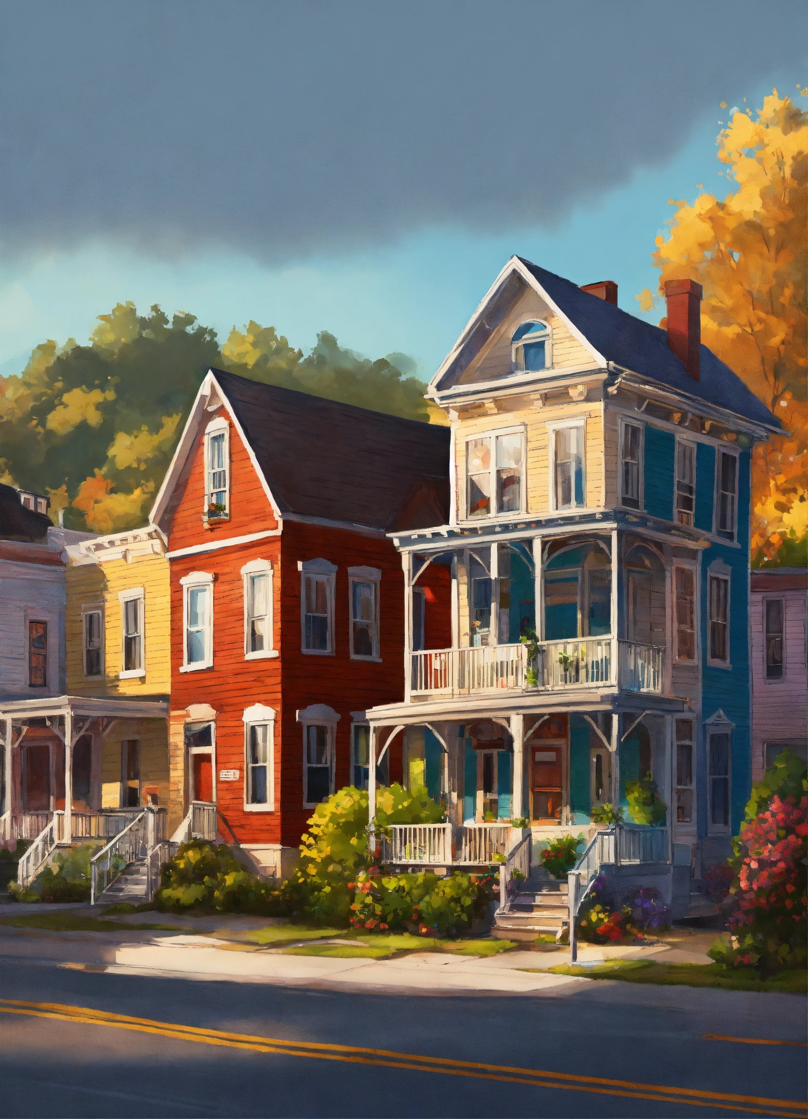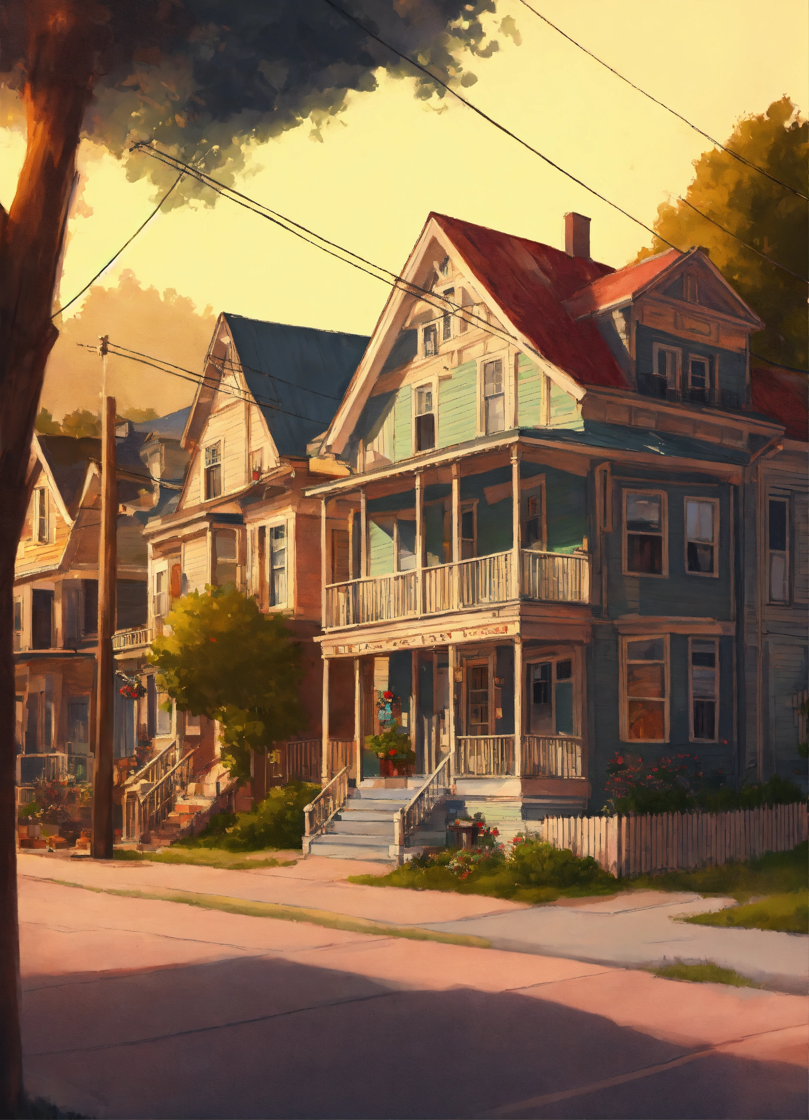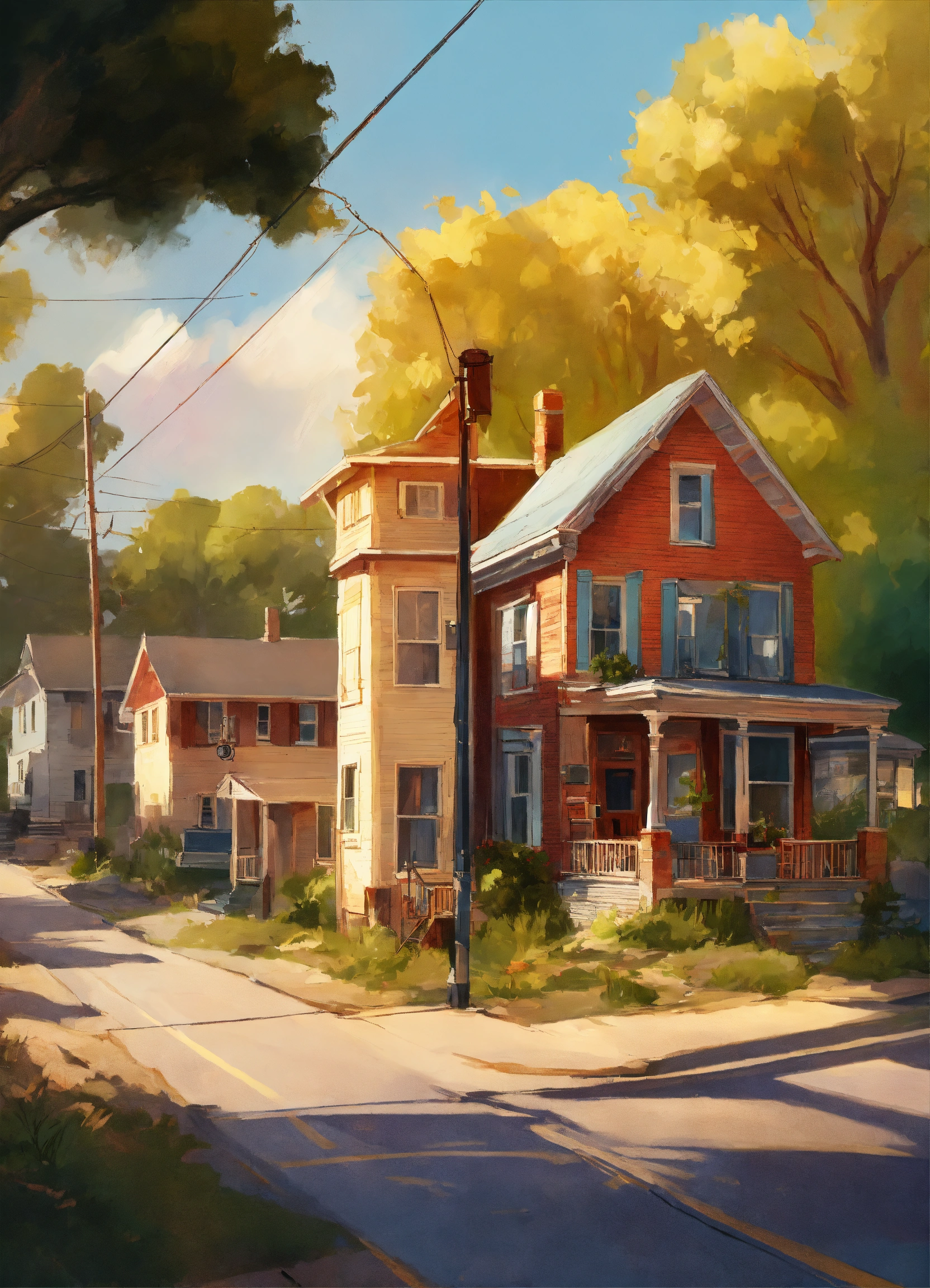 American, digital painting, gorgeous, sharp focus, illustration, intricate, friendly, cozy, day, small town, houses