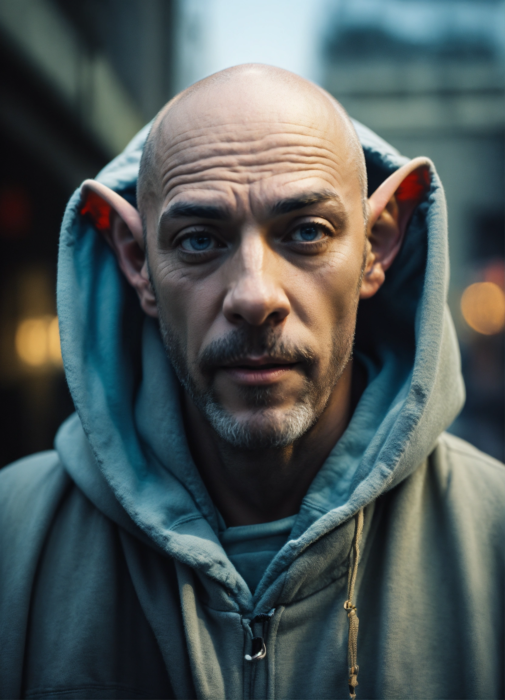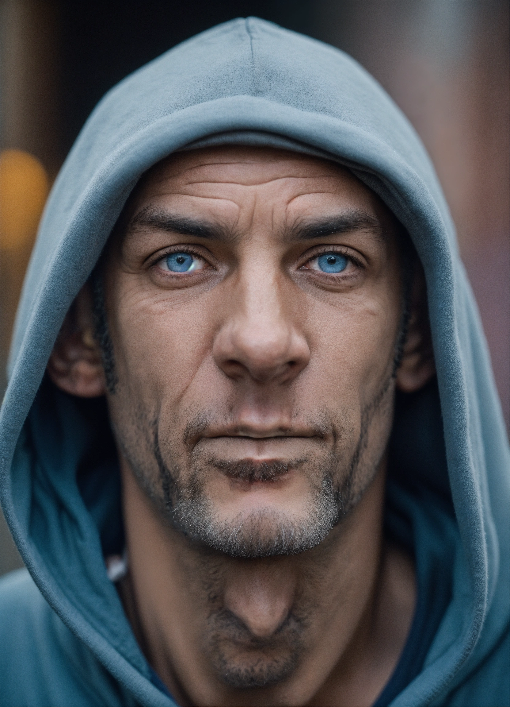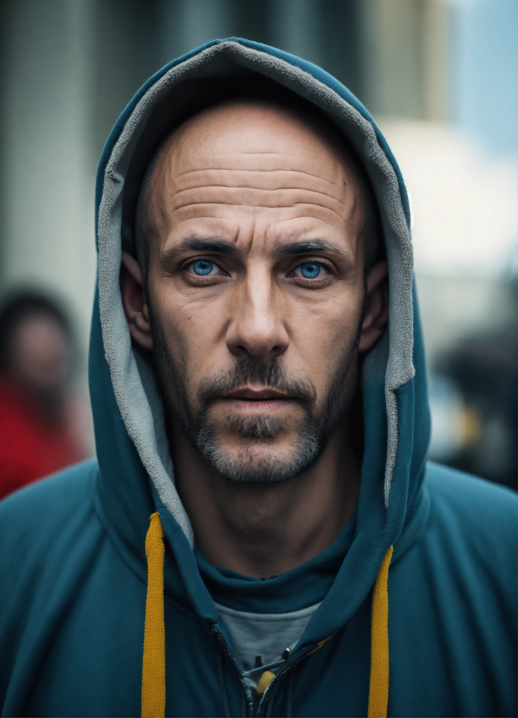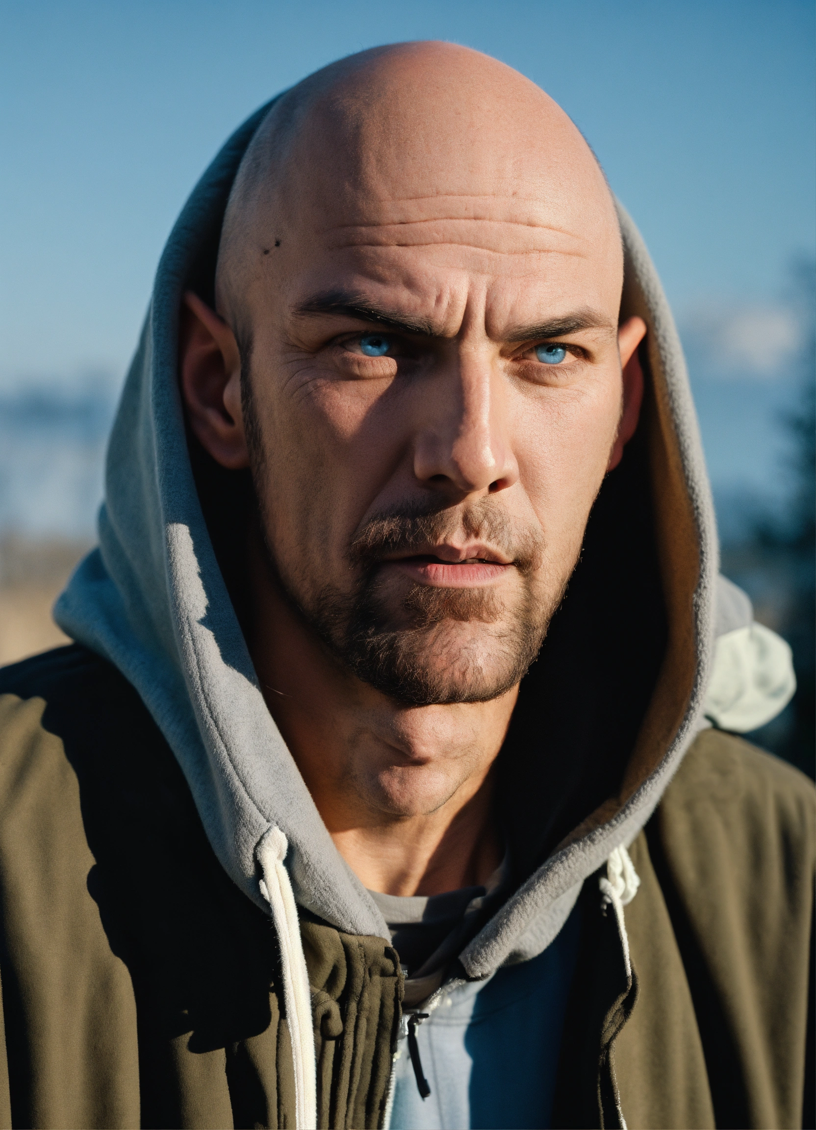 A huge bald homeless man, extended protruding brow forehead, light blue-grey eyes, crooked mouth, large ears, wearing a hoodie up over his head