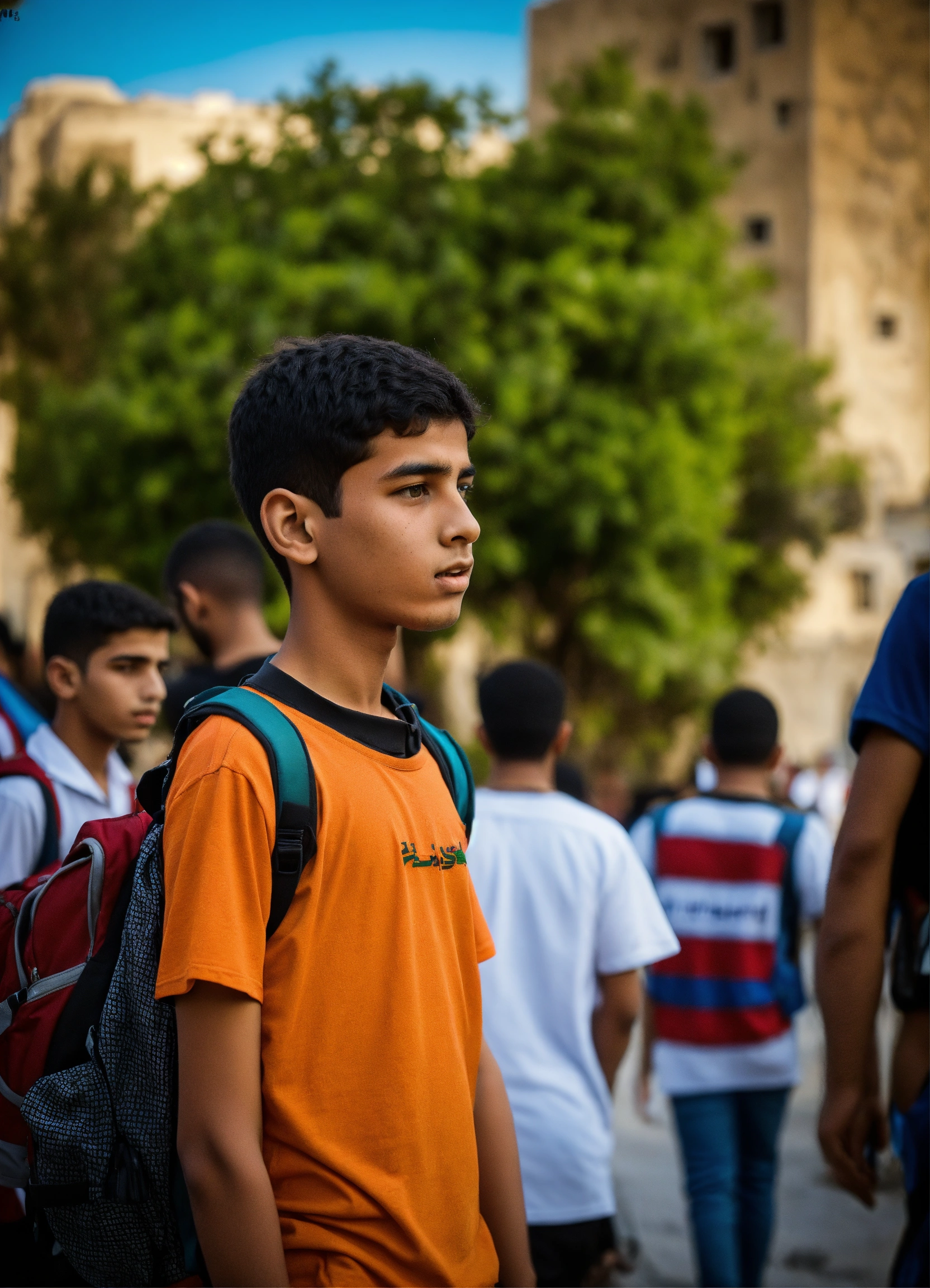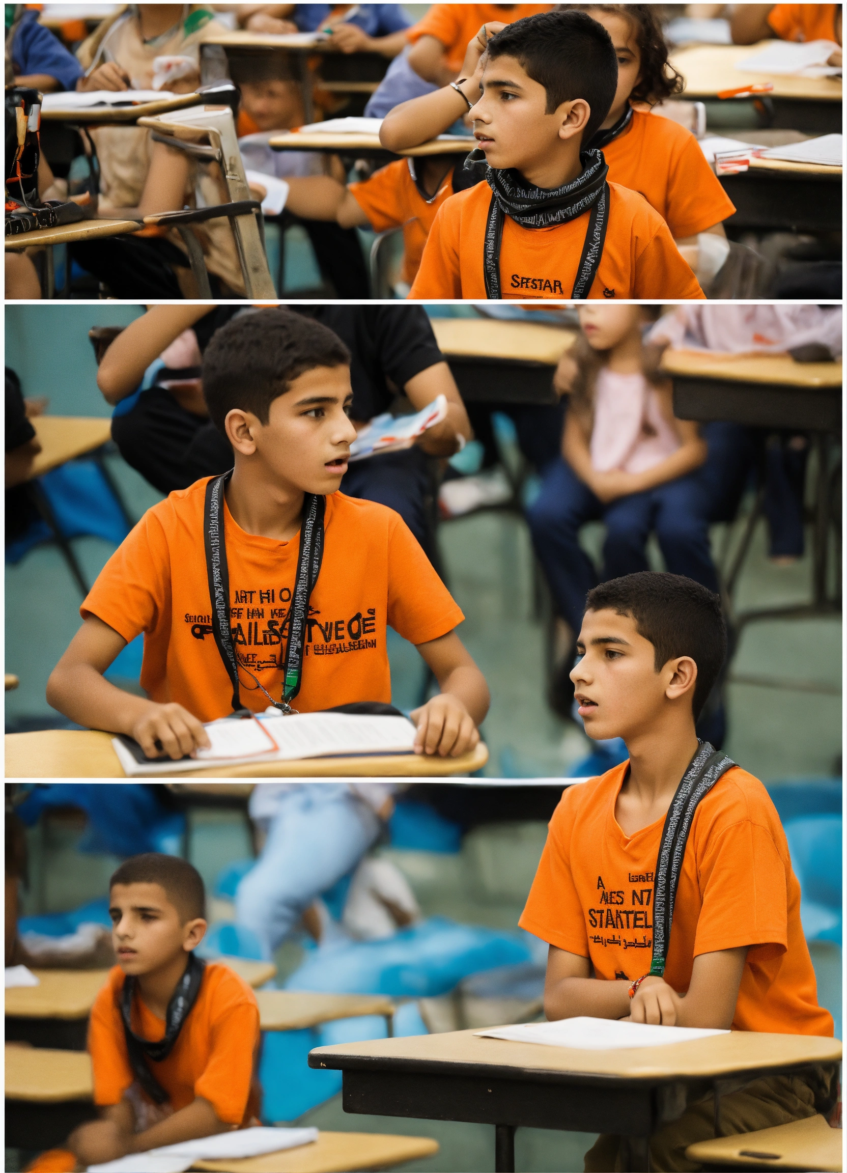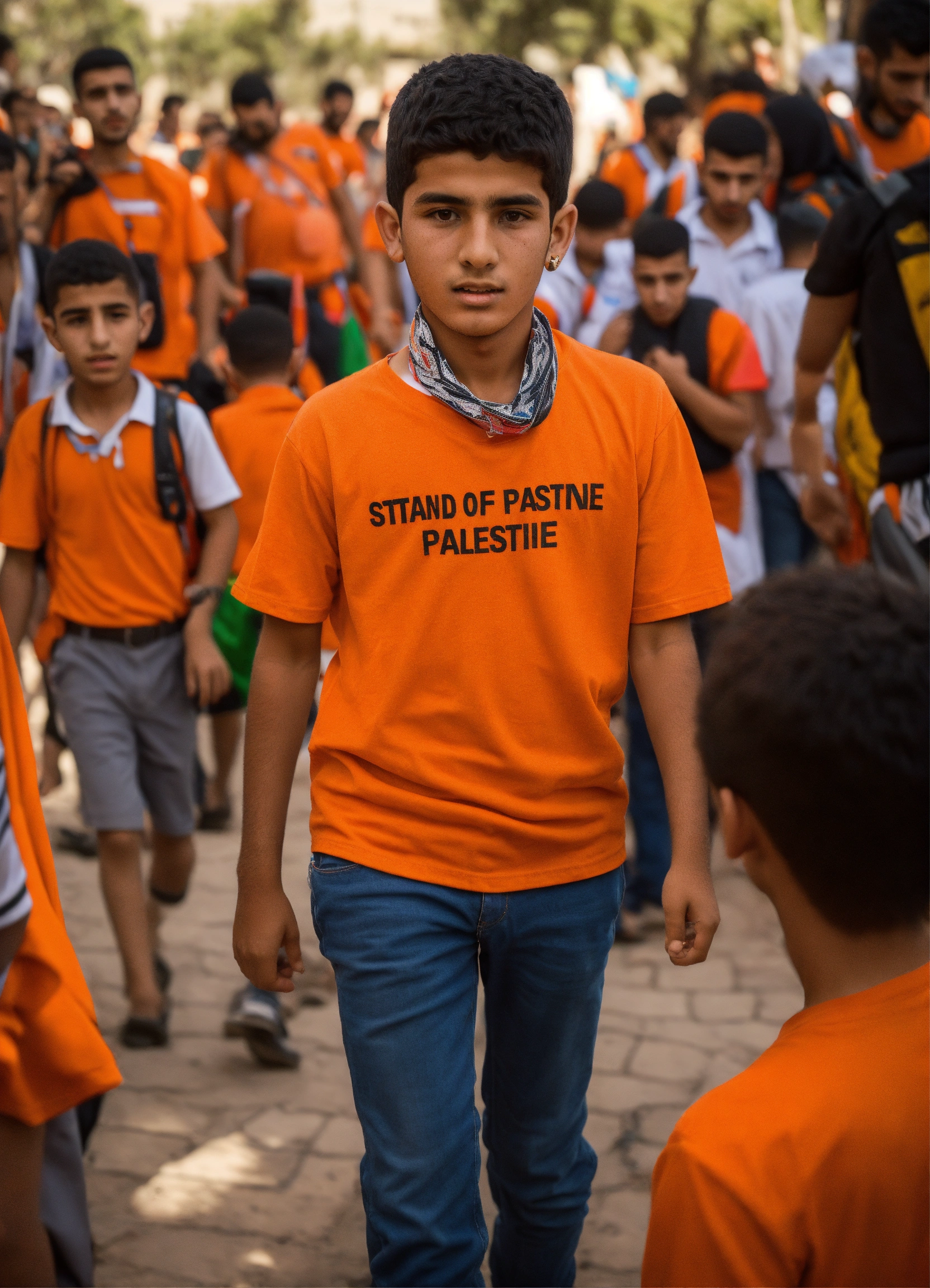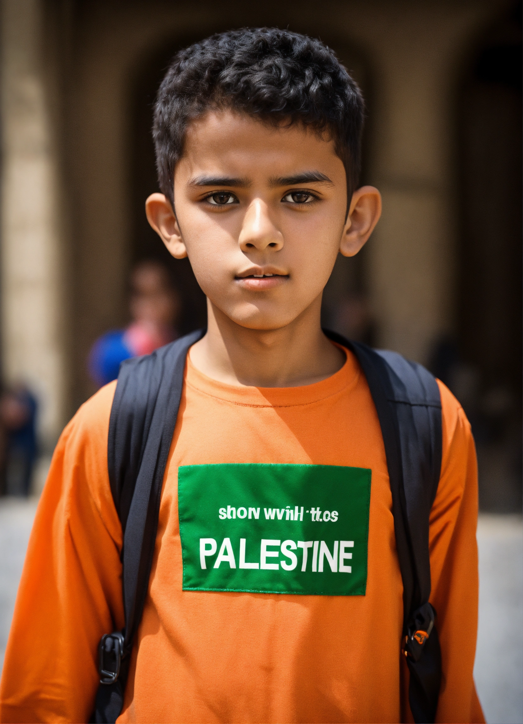 A school student the one who is wearing orange shirt and around his neck palestine scorf and he is saying that i stand with palestine