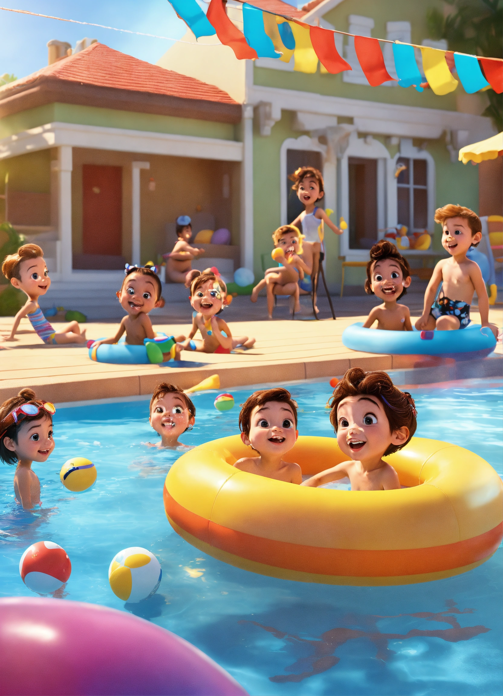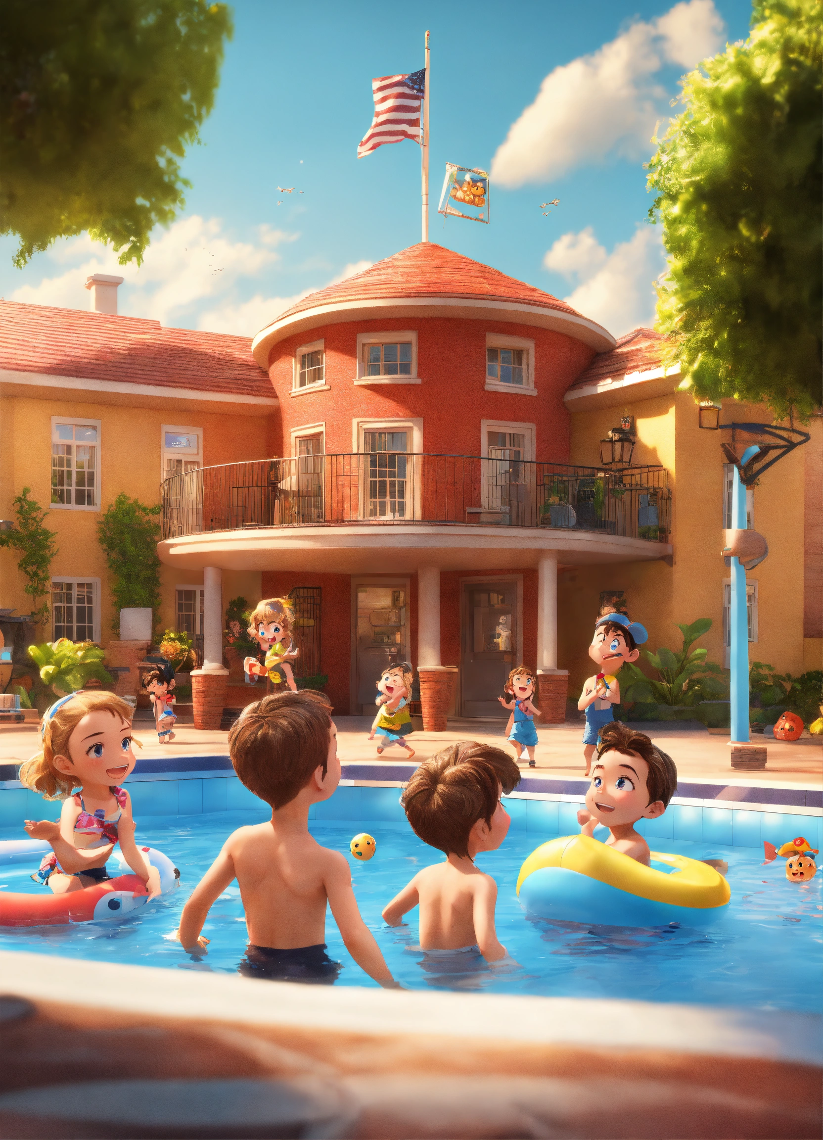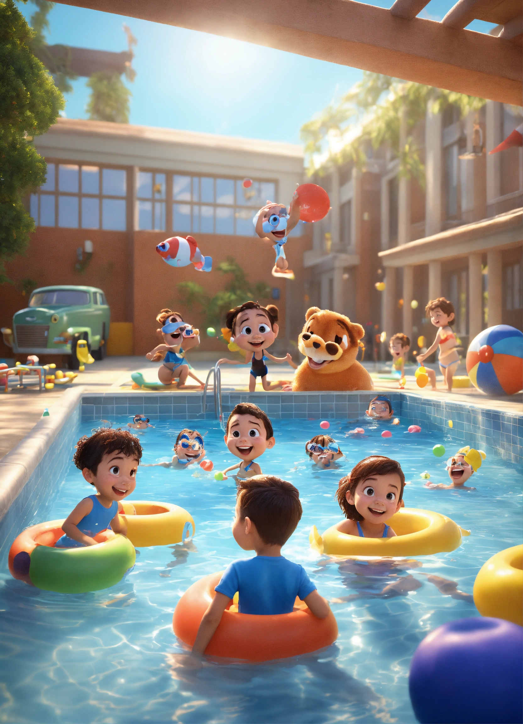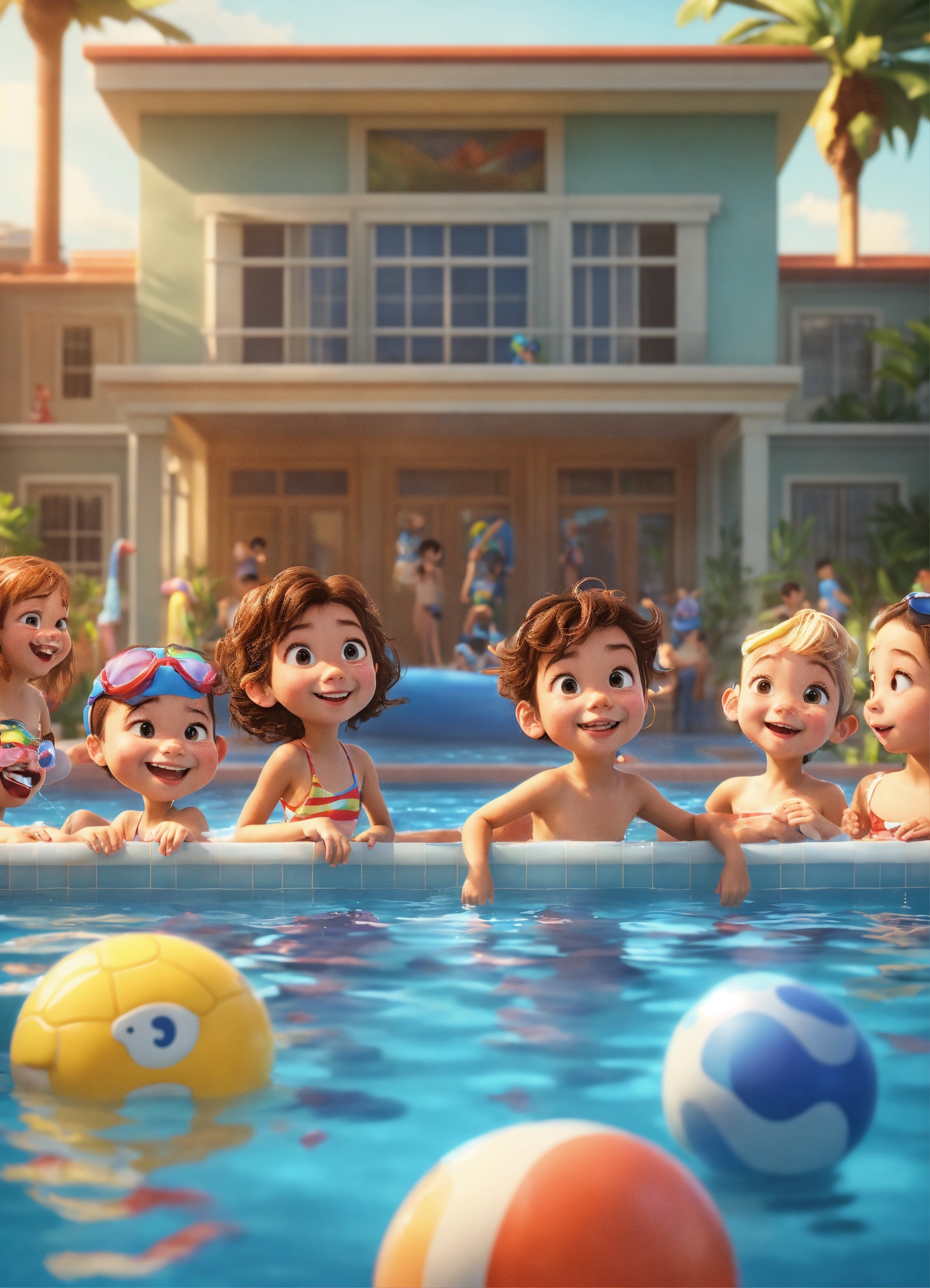 A 3d pixar disney style movie poster, with some children playing in a swimming pool, school vacation scene, happy children in the pool area