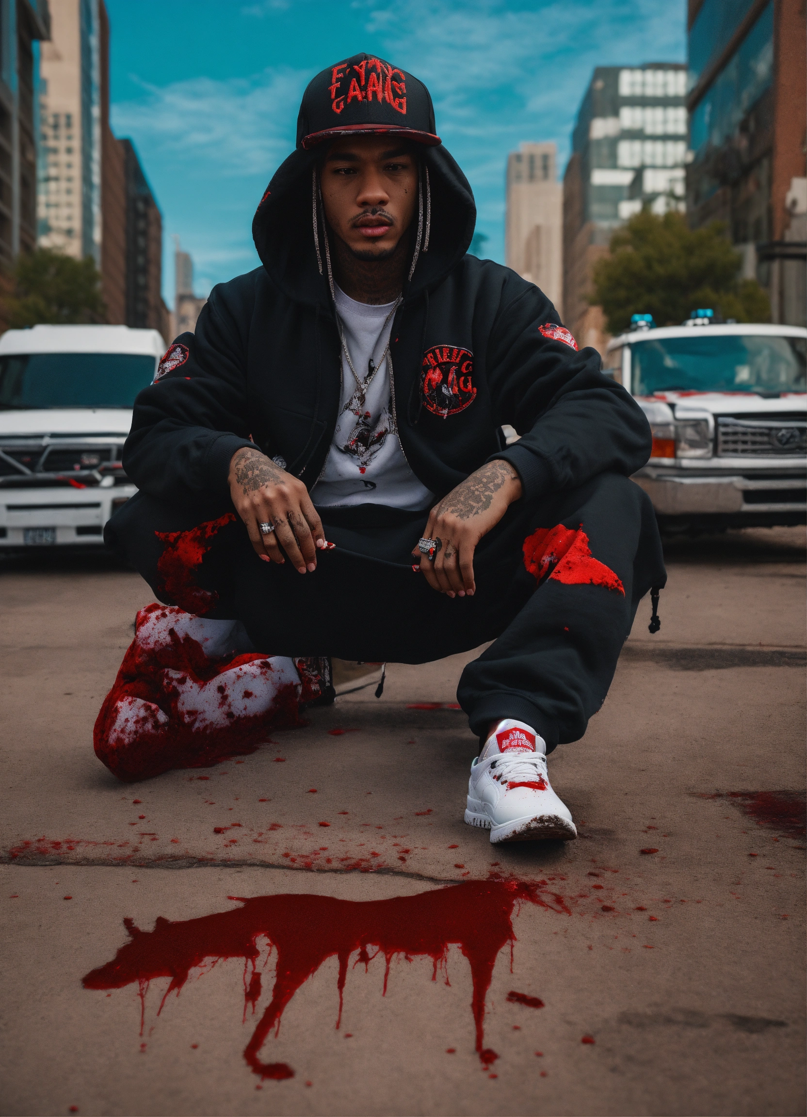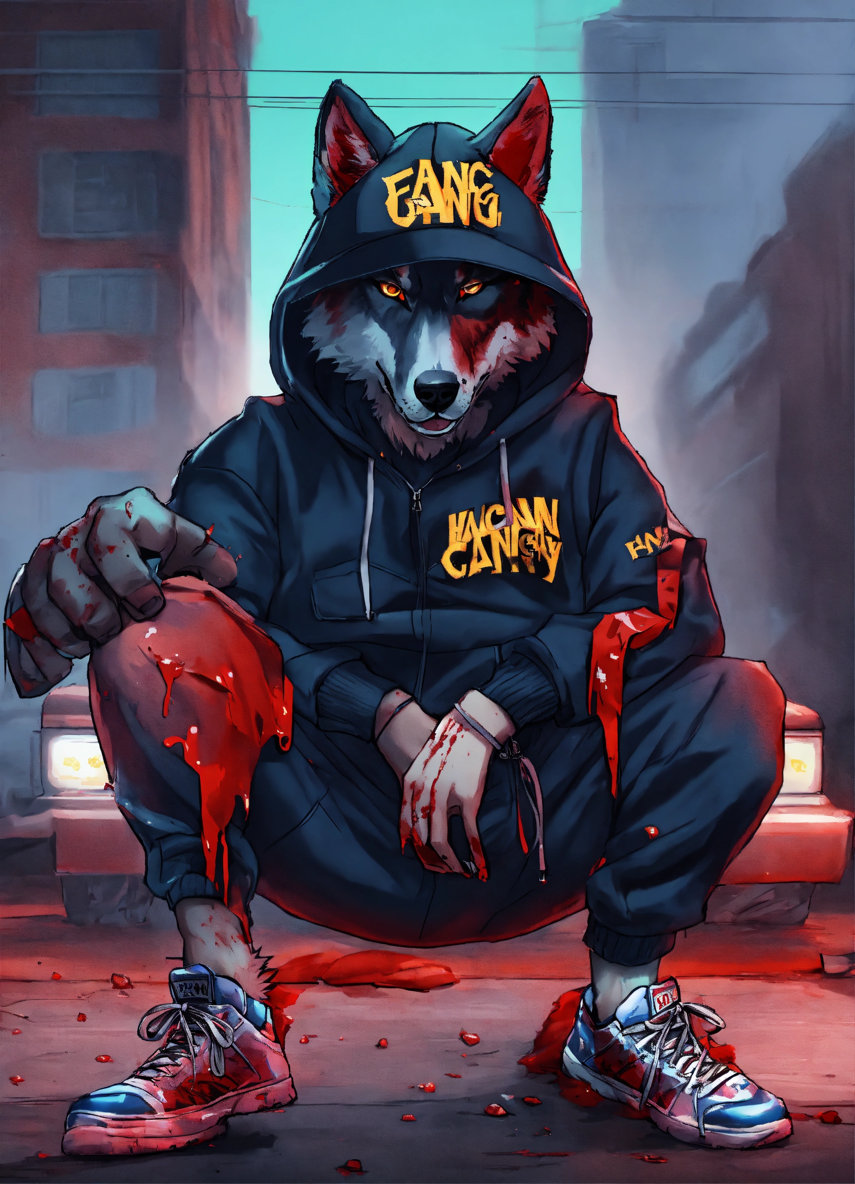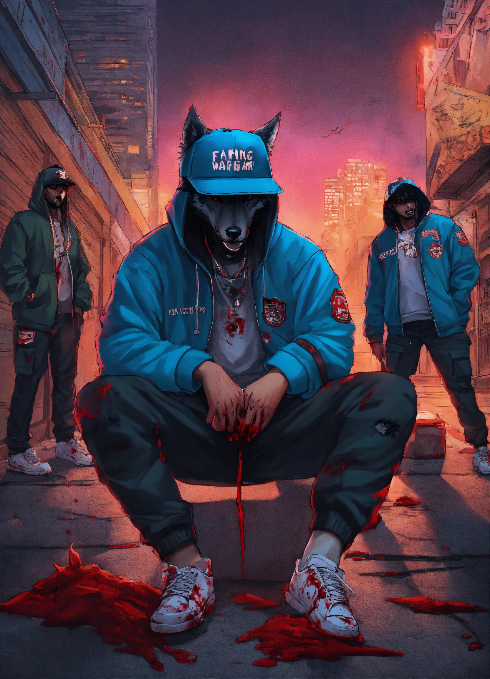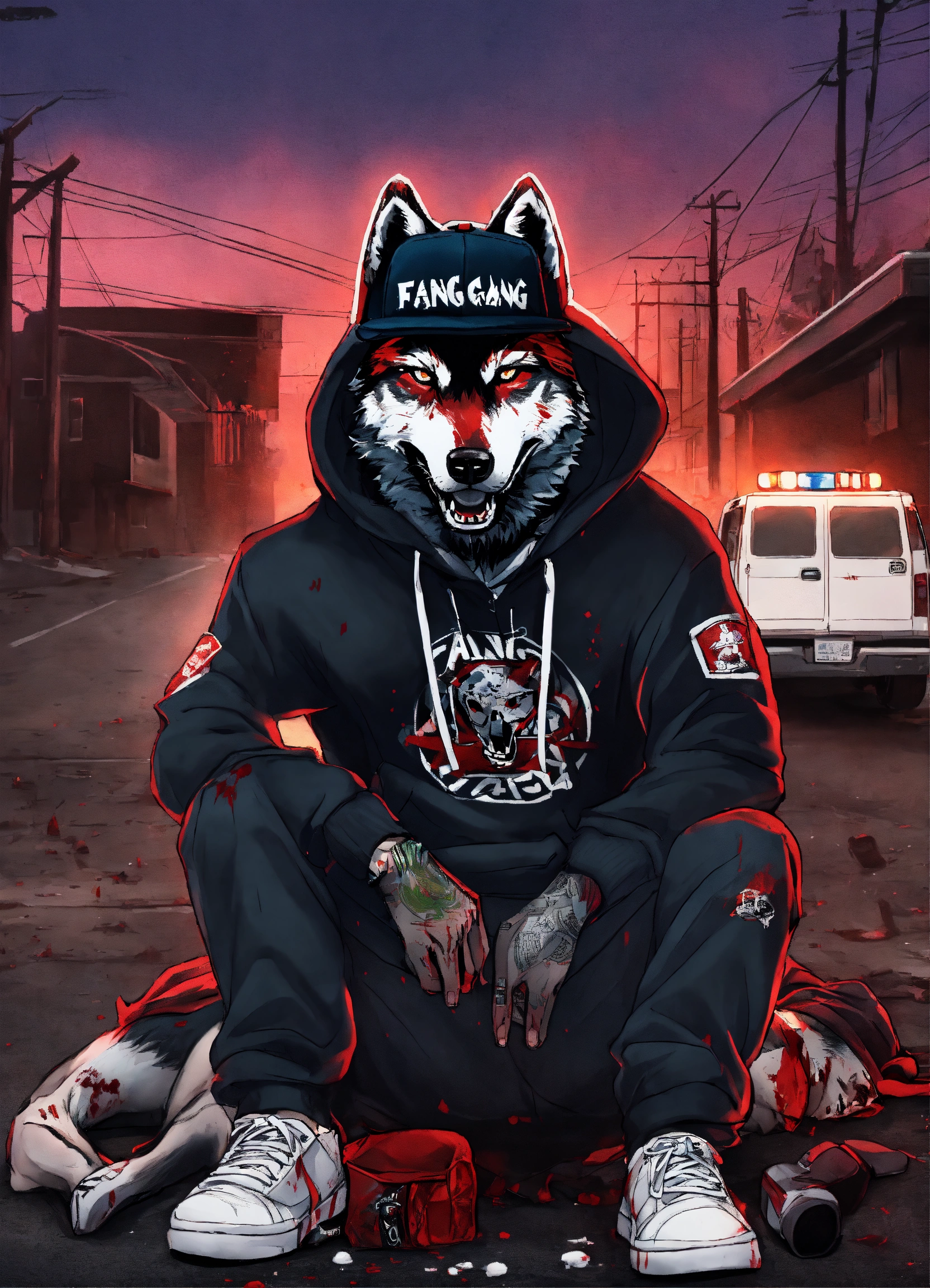 Gangster wolves dead bleeding laying dead on the ground wearing snapback and hoodie that says fang gang on the hoodie inner city ambulance