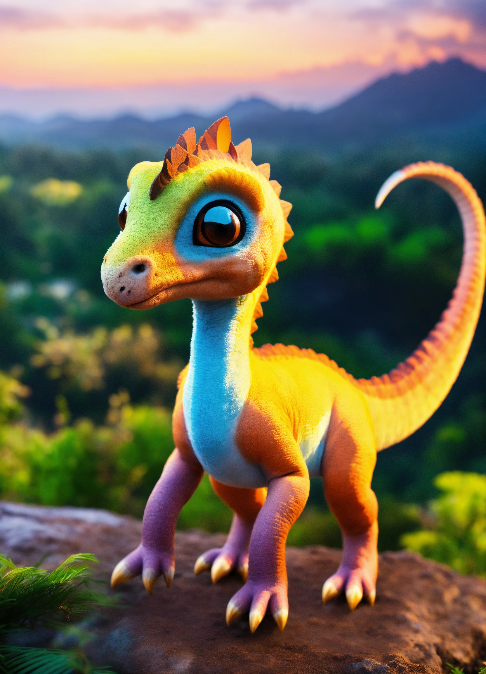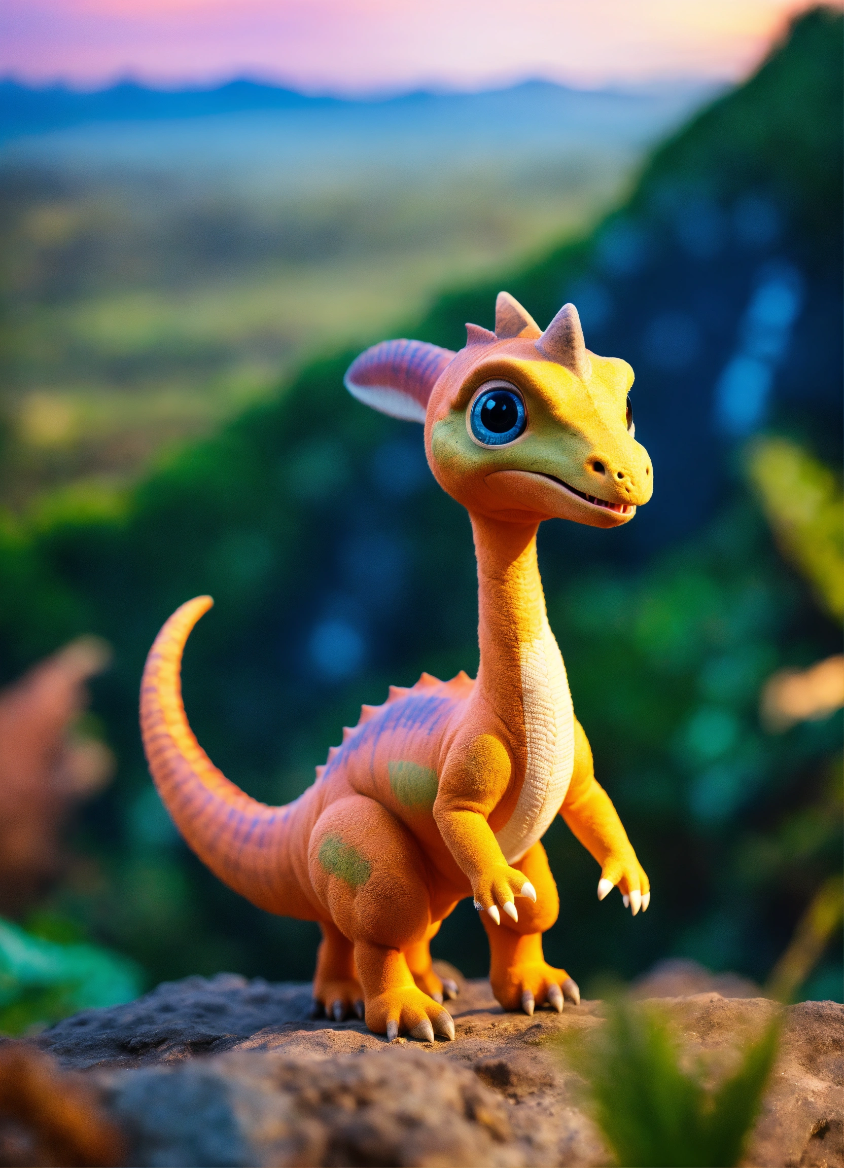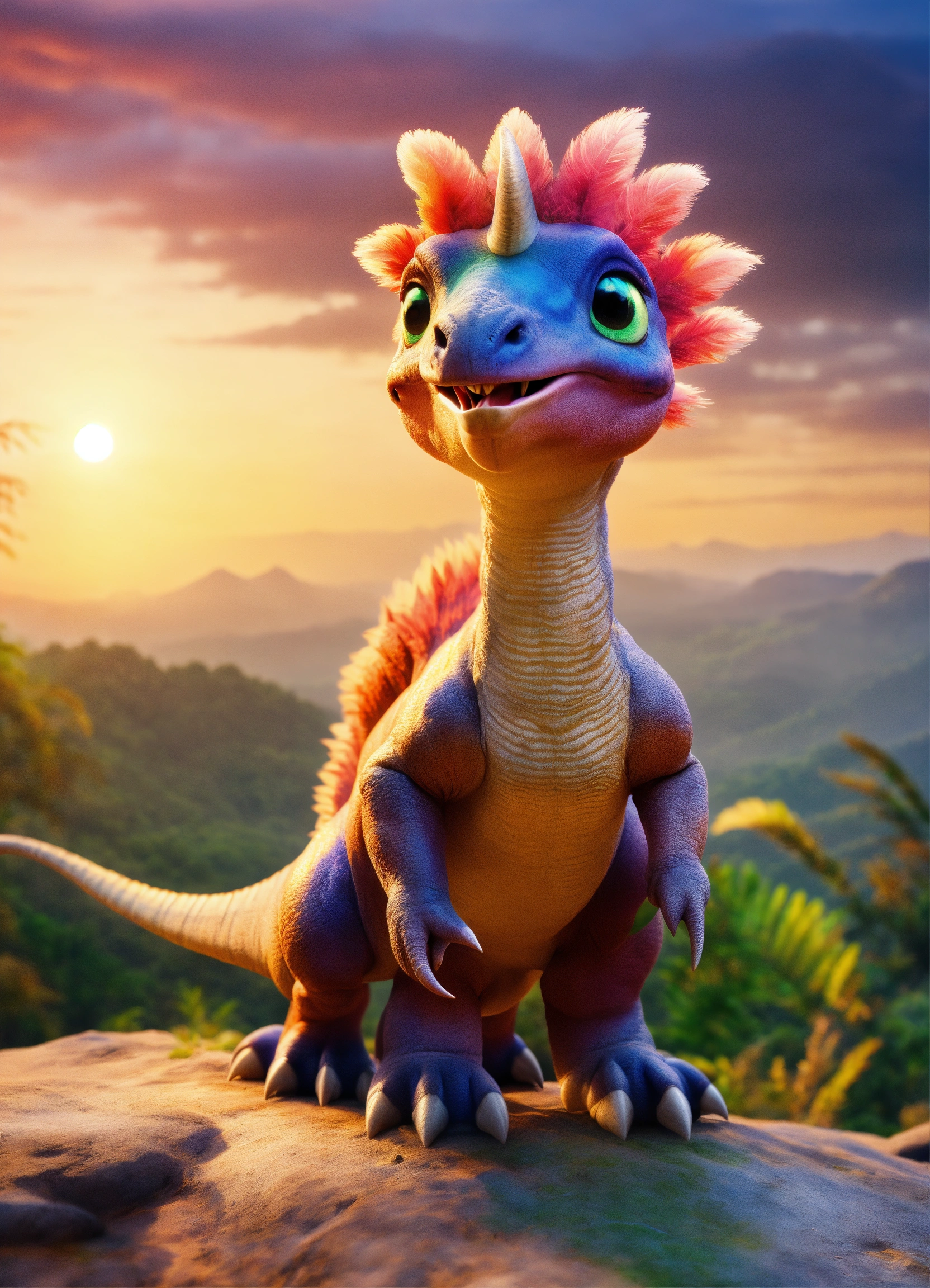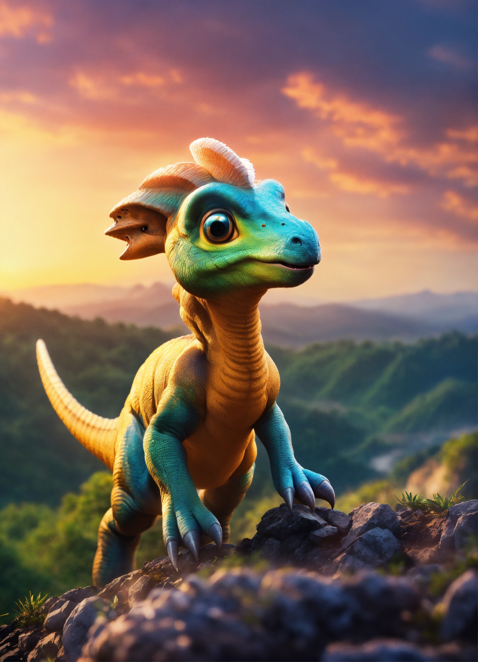 An adorable and fluffy baby parasaurolophus dinosaur with big color eyes, roaring on the top of a mountain with jungle in the background, with soft feathers, sunset beautiful, with blur background, high quality, 8k
