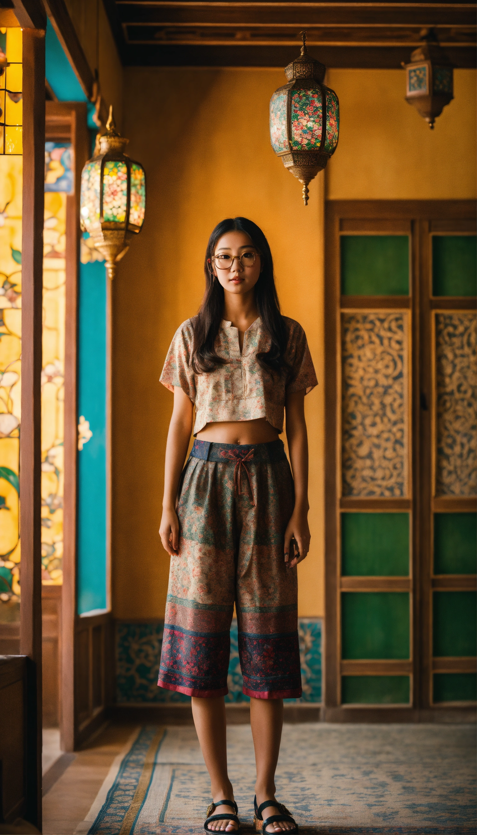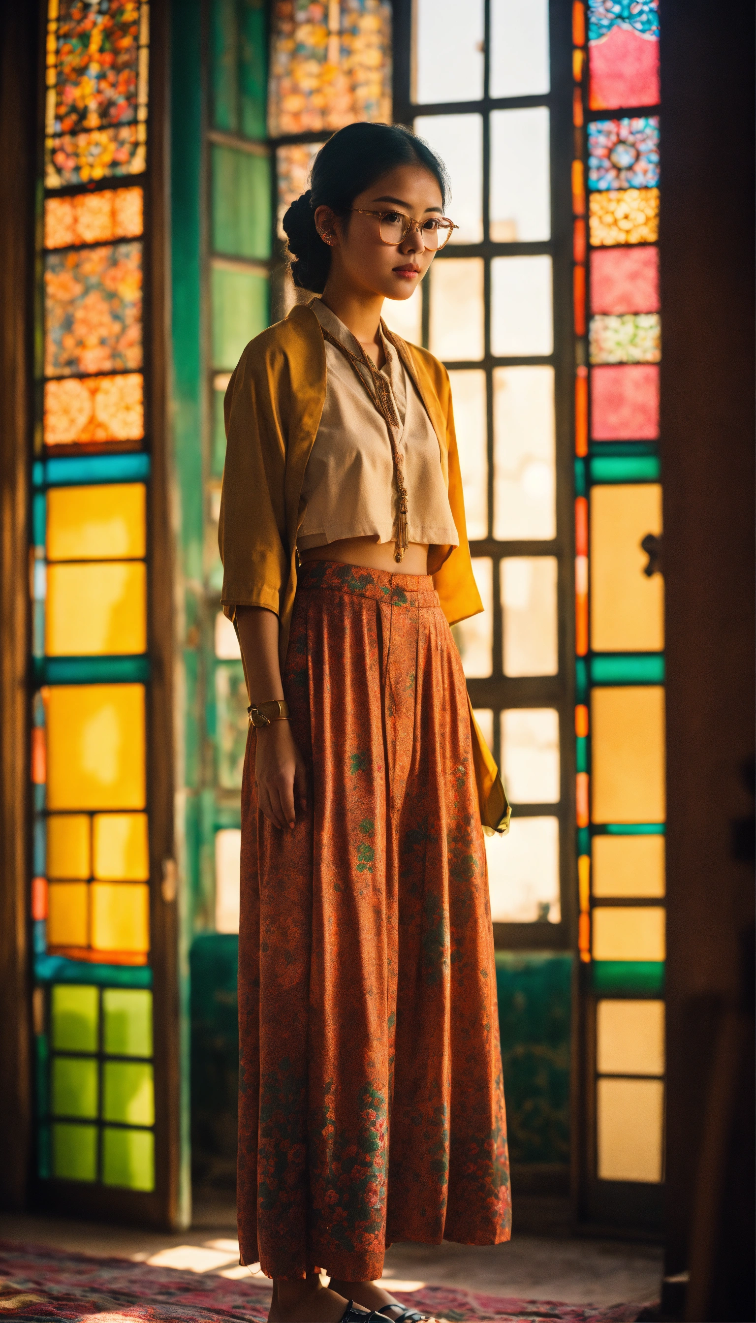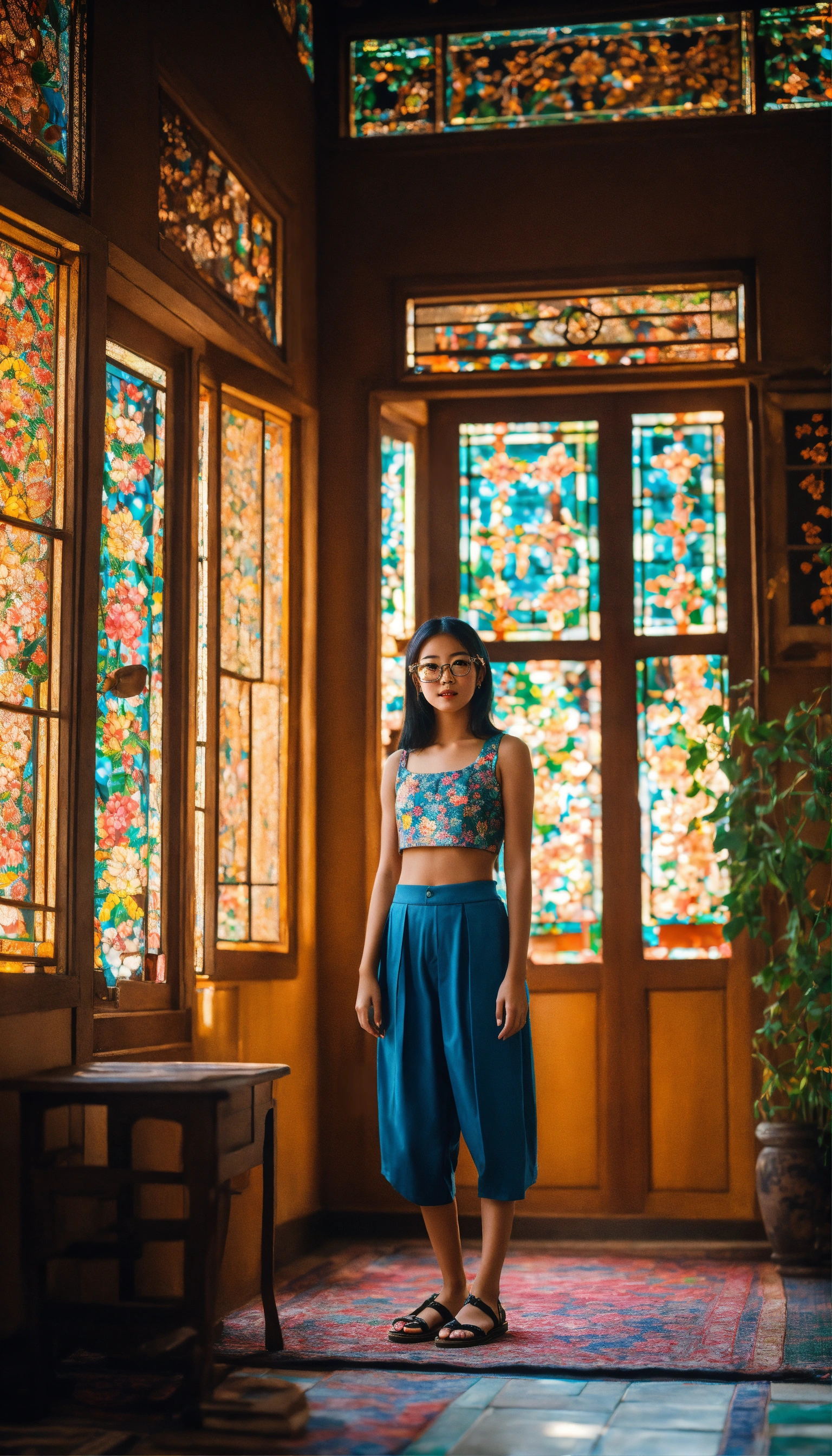 Portrait of a beautiful japanese schoolgirl wearing a crop top and a short with sandals, standing in a vintage house in yazd with colorful glasses on windows, highly detailed, 32k resolution, cinematic lighting, dramatic lighting, vertical shot, iranian architecture, persian culture background