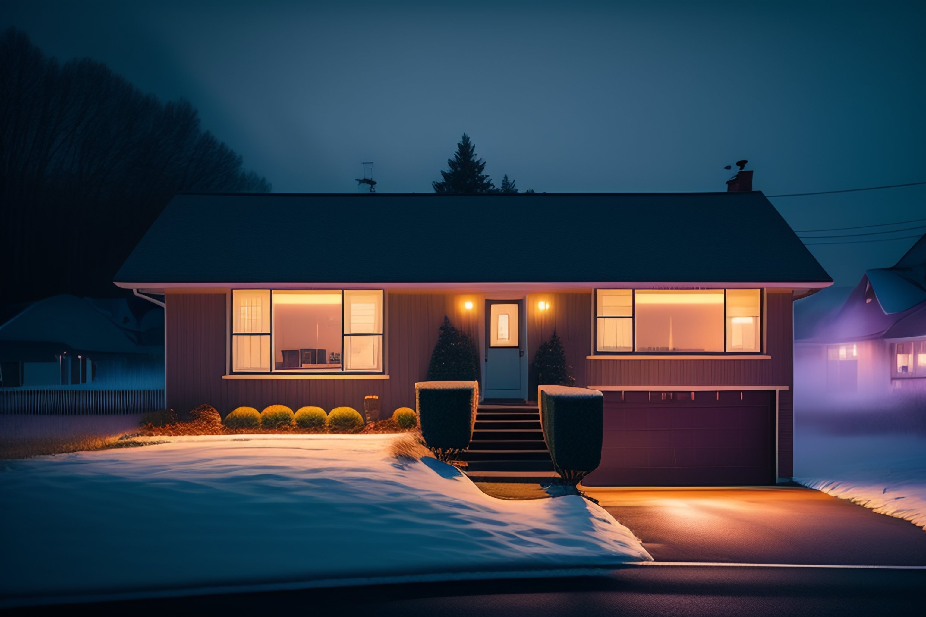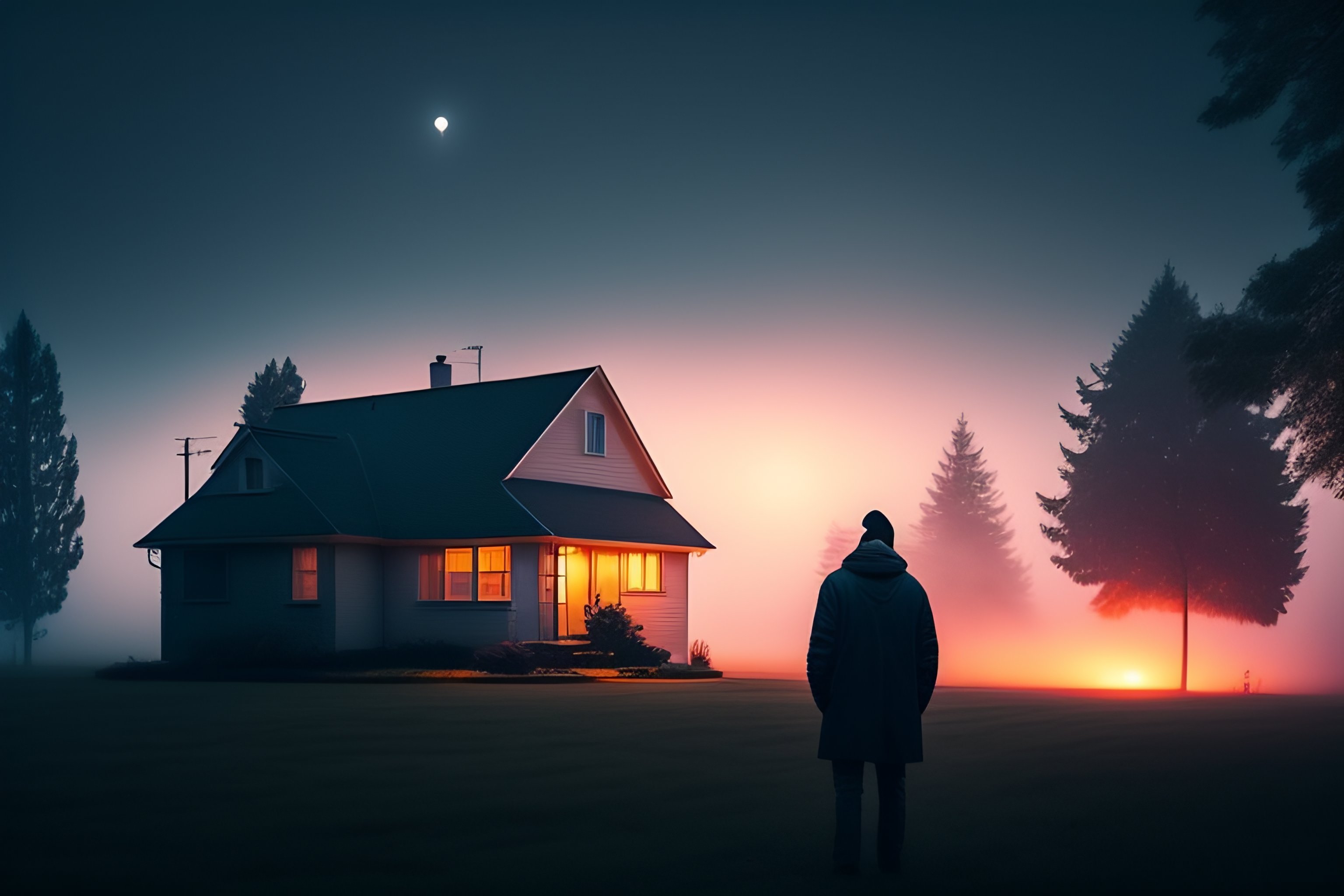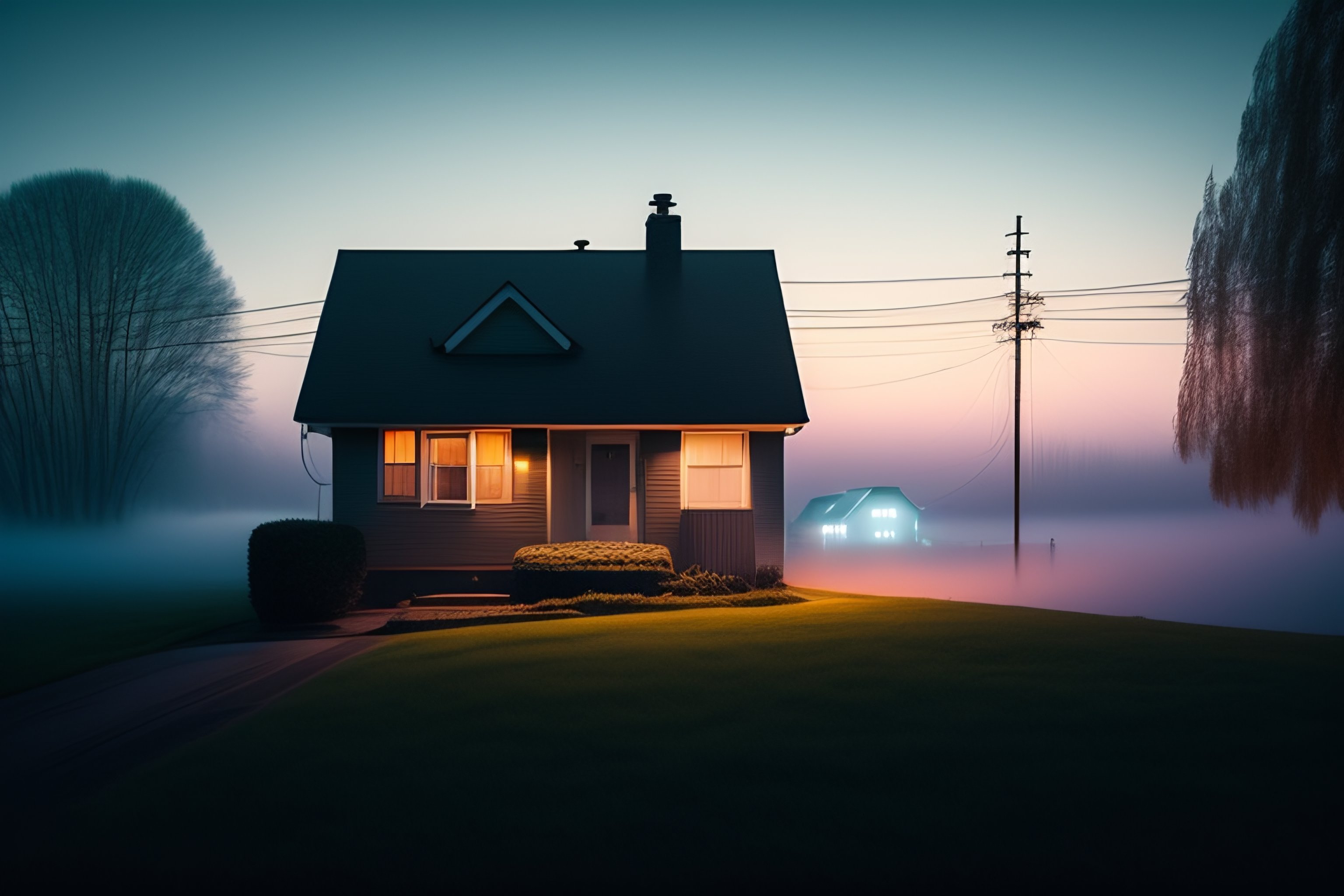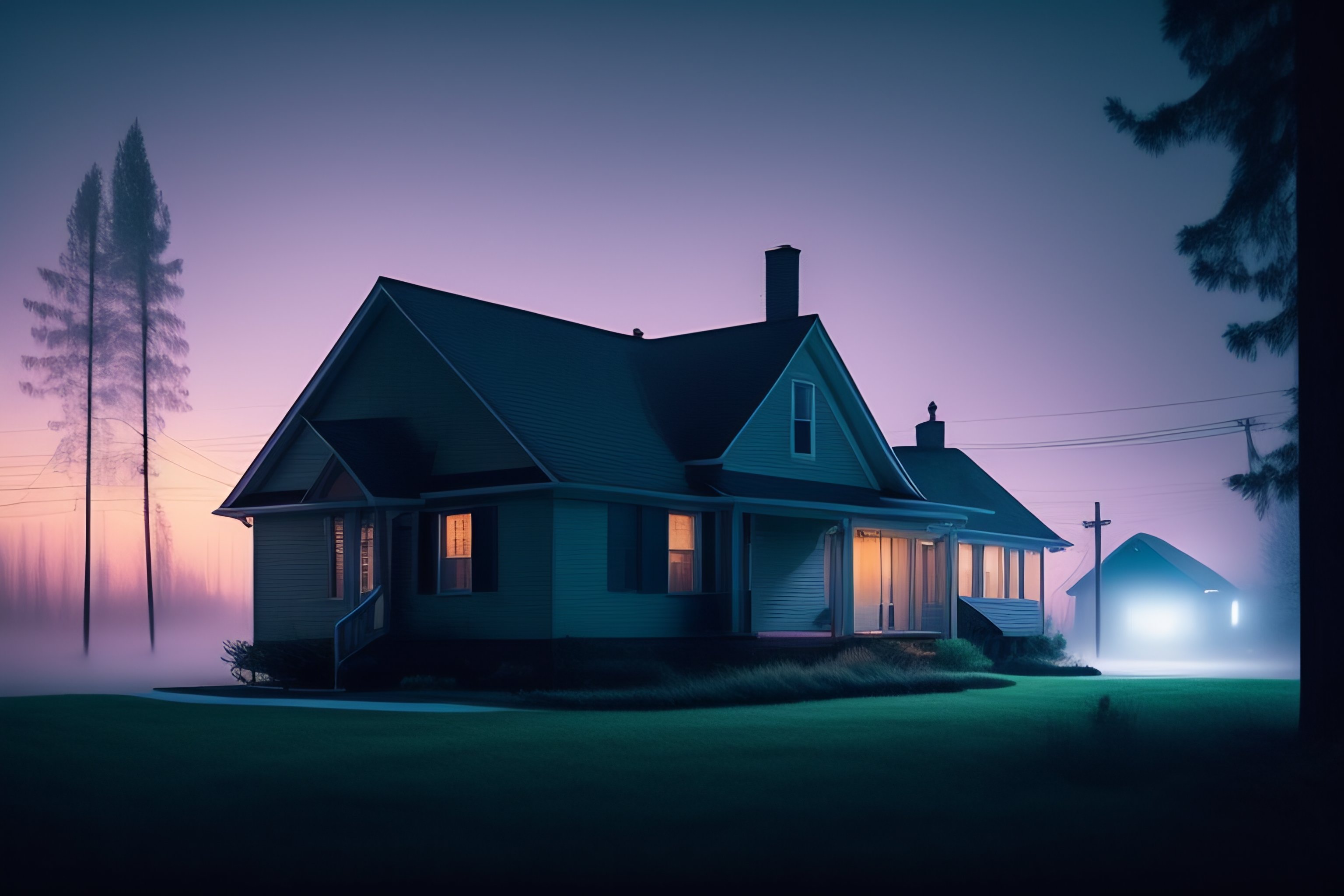 Analog style, a lonely suburban house in the night, fog, mist, loneliness, cinematic photography, silhouette:10, science fiction, by stalenhag, by gregory crewdson