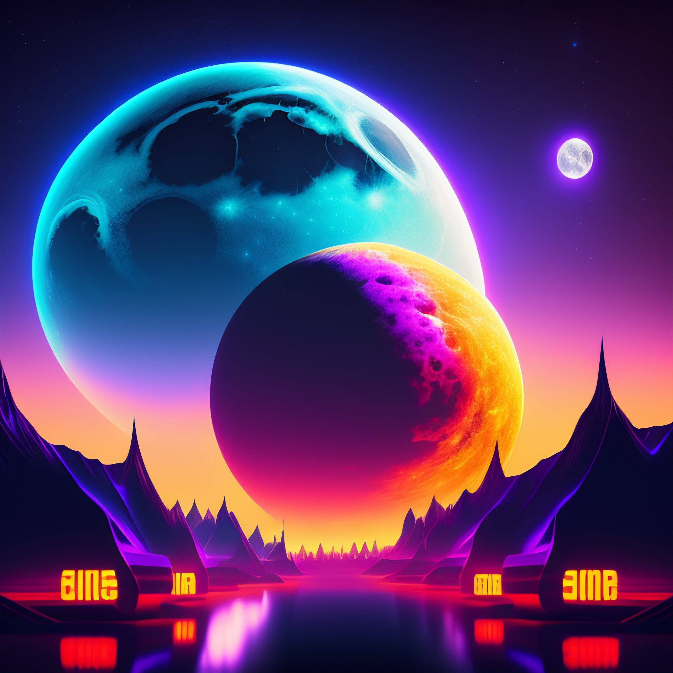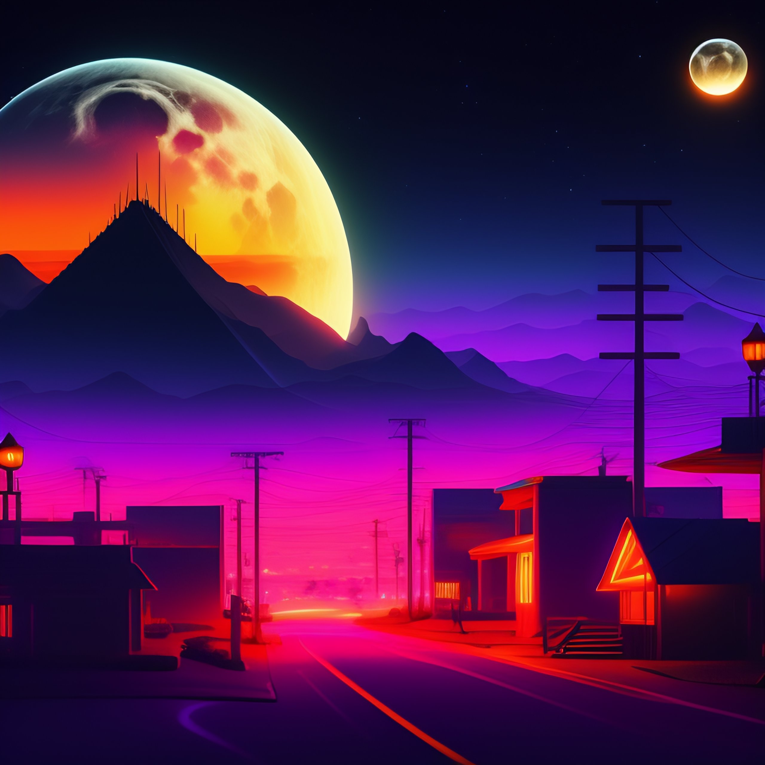 The evil side of web3 technologies, synthwave metaverse town with moon background, sharp focus, horror, ghostly