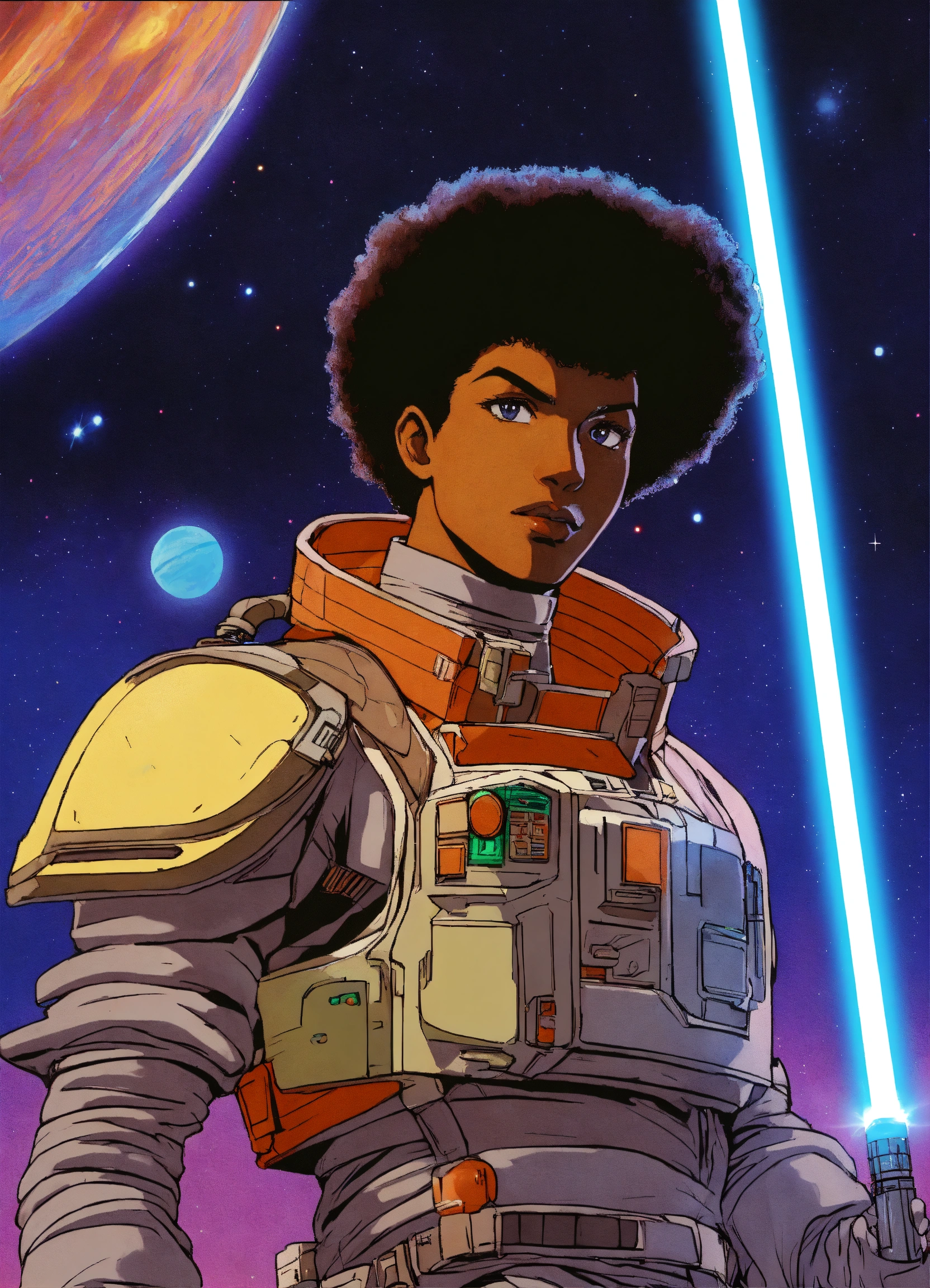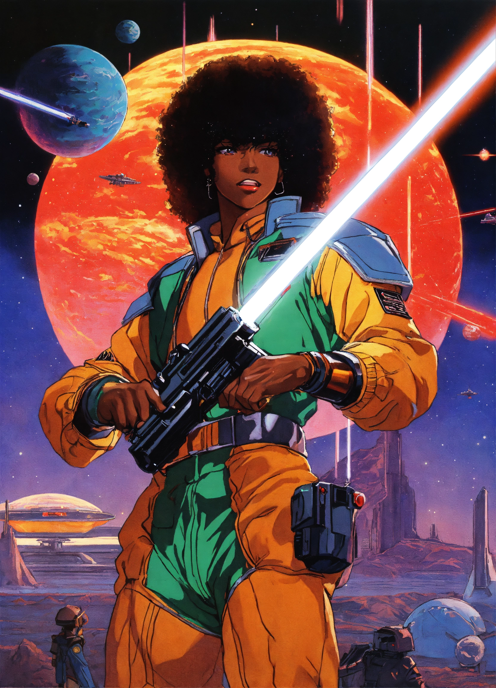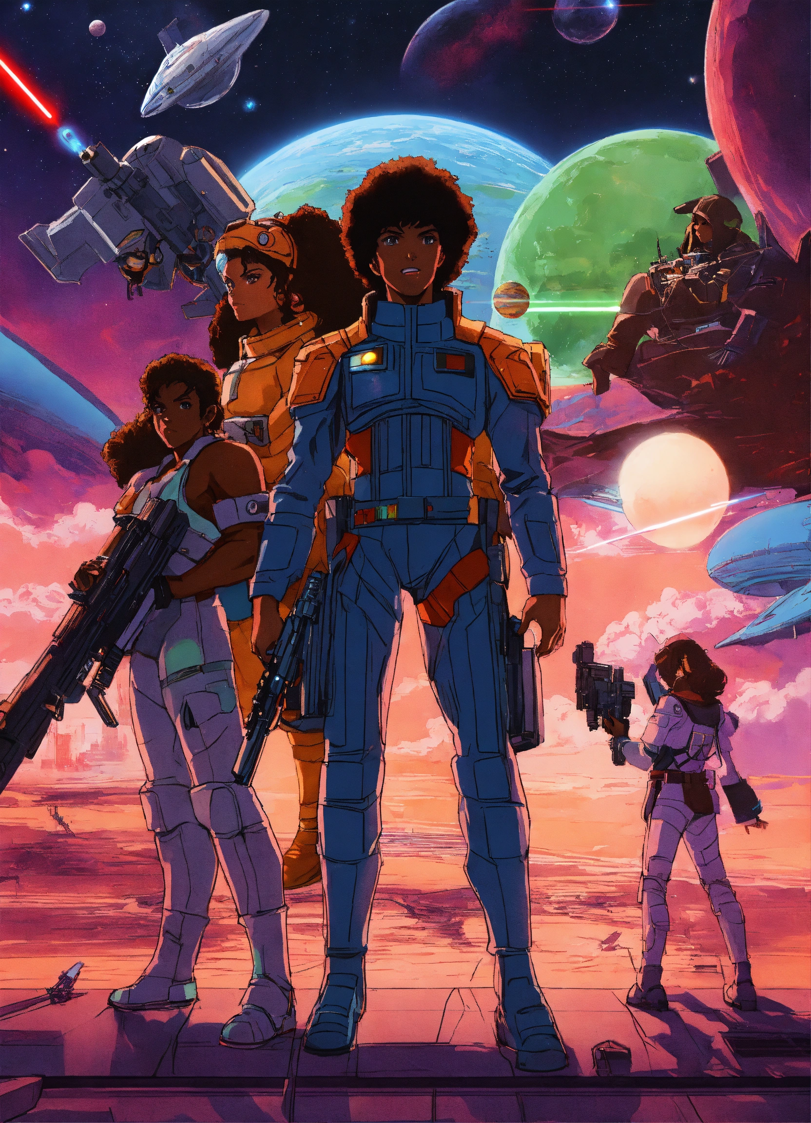 80s anime black characters sci fi space ships laser guns lightsabers pilots good evil planets aliens