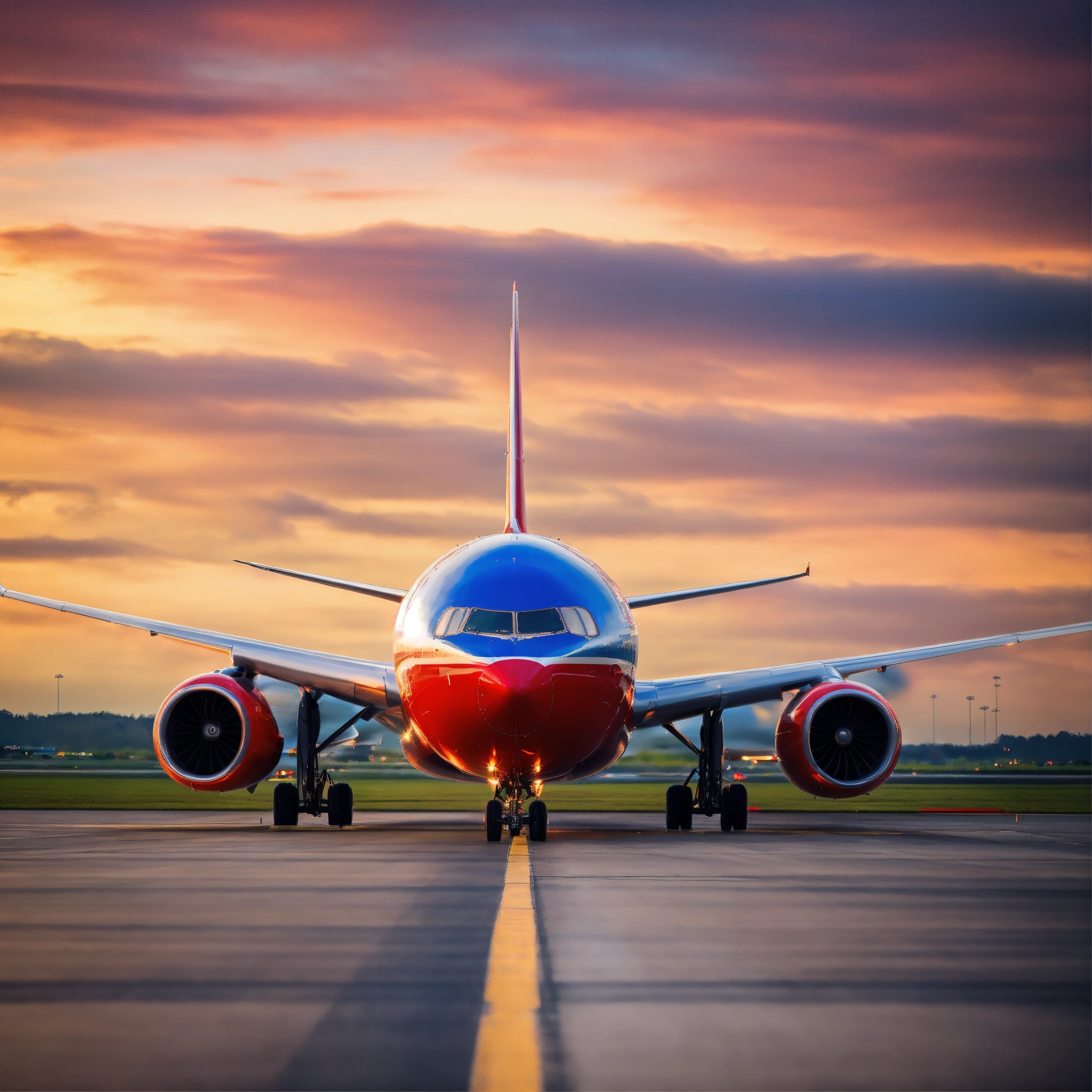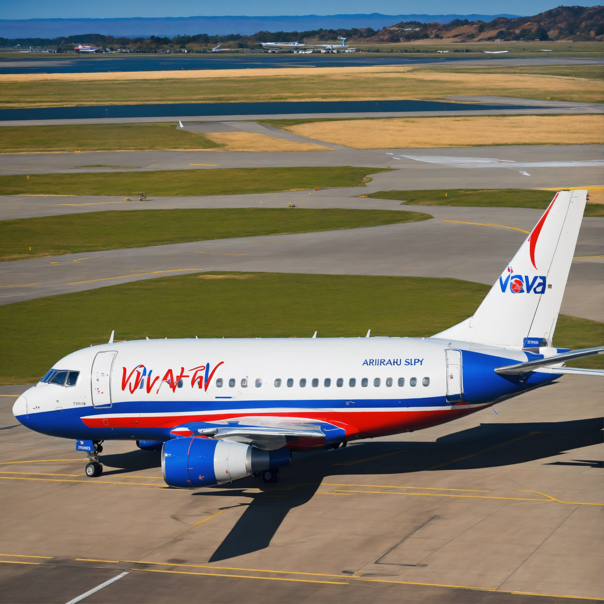 A photo of a commercial airplane. the airplane is on the runway, ready to take off. the airplane is painted in viva aerobus's signature colors of red and blue.