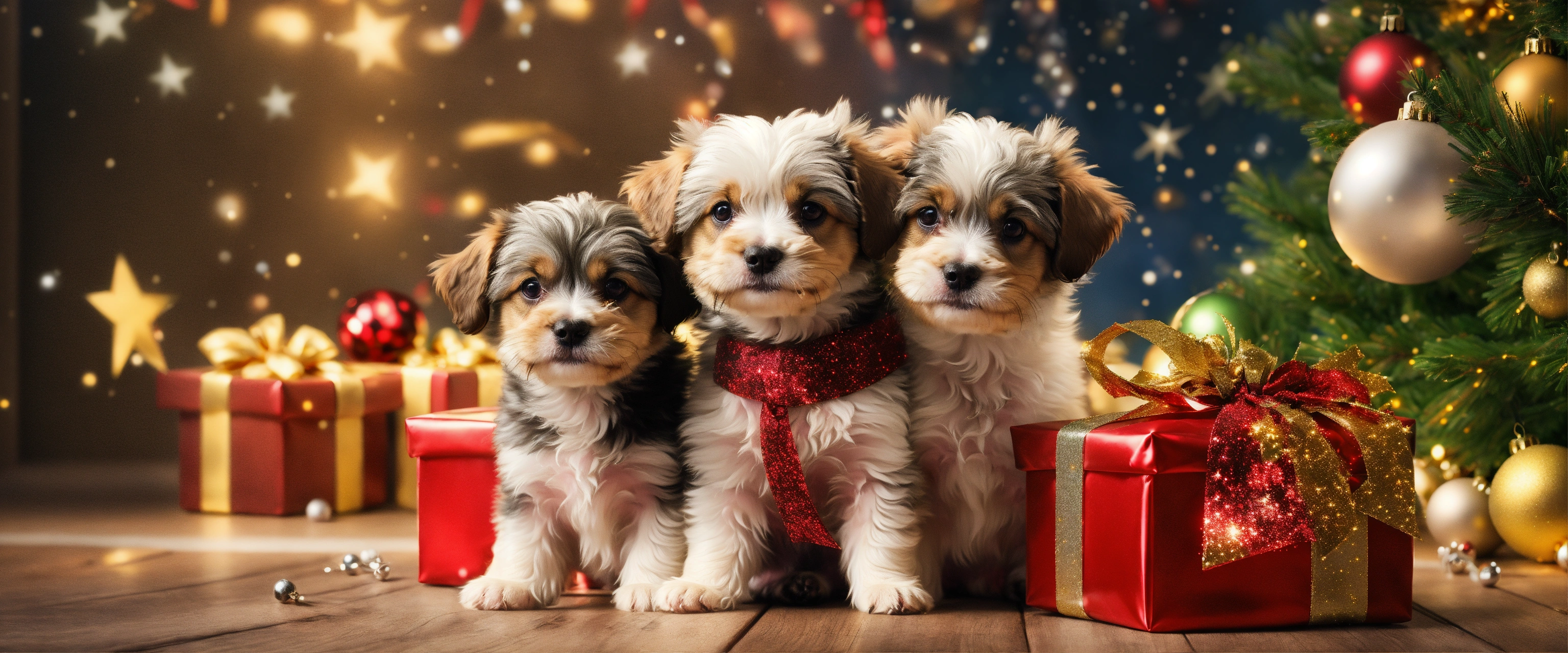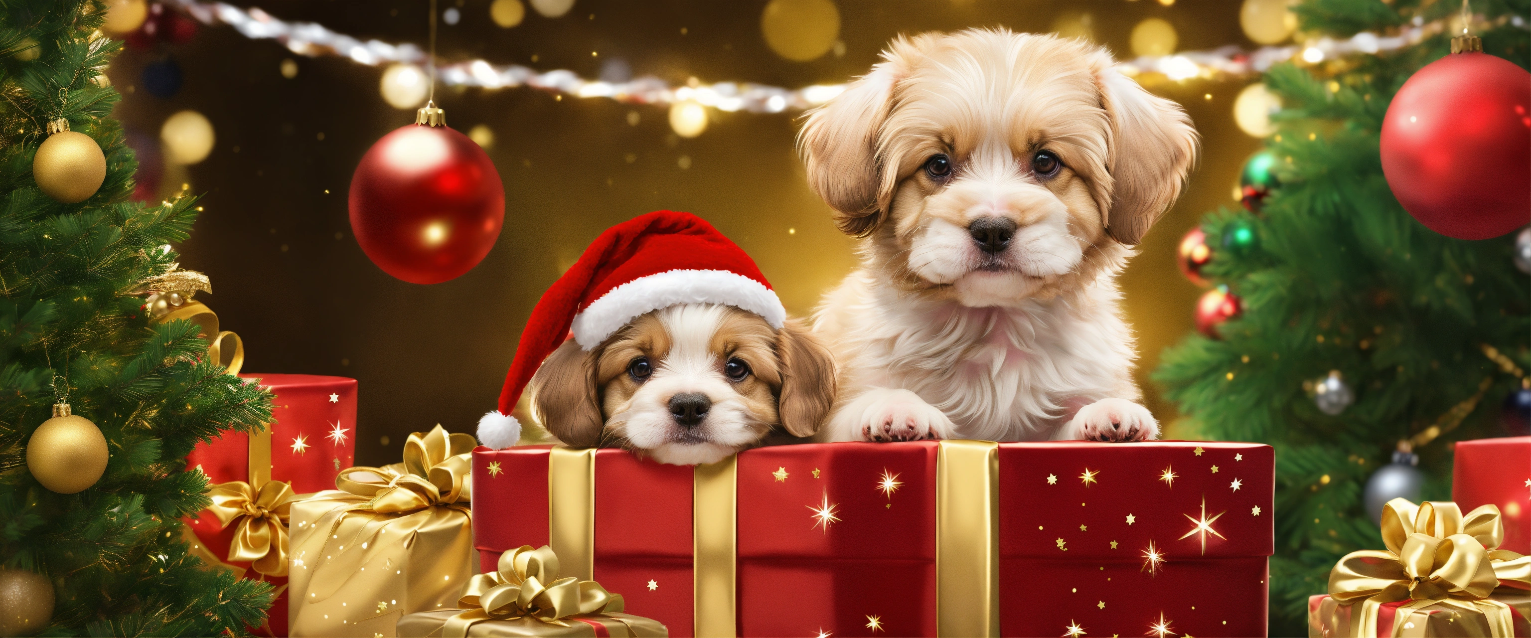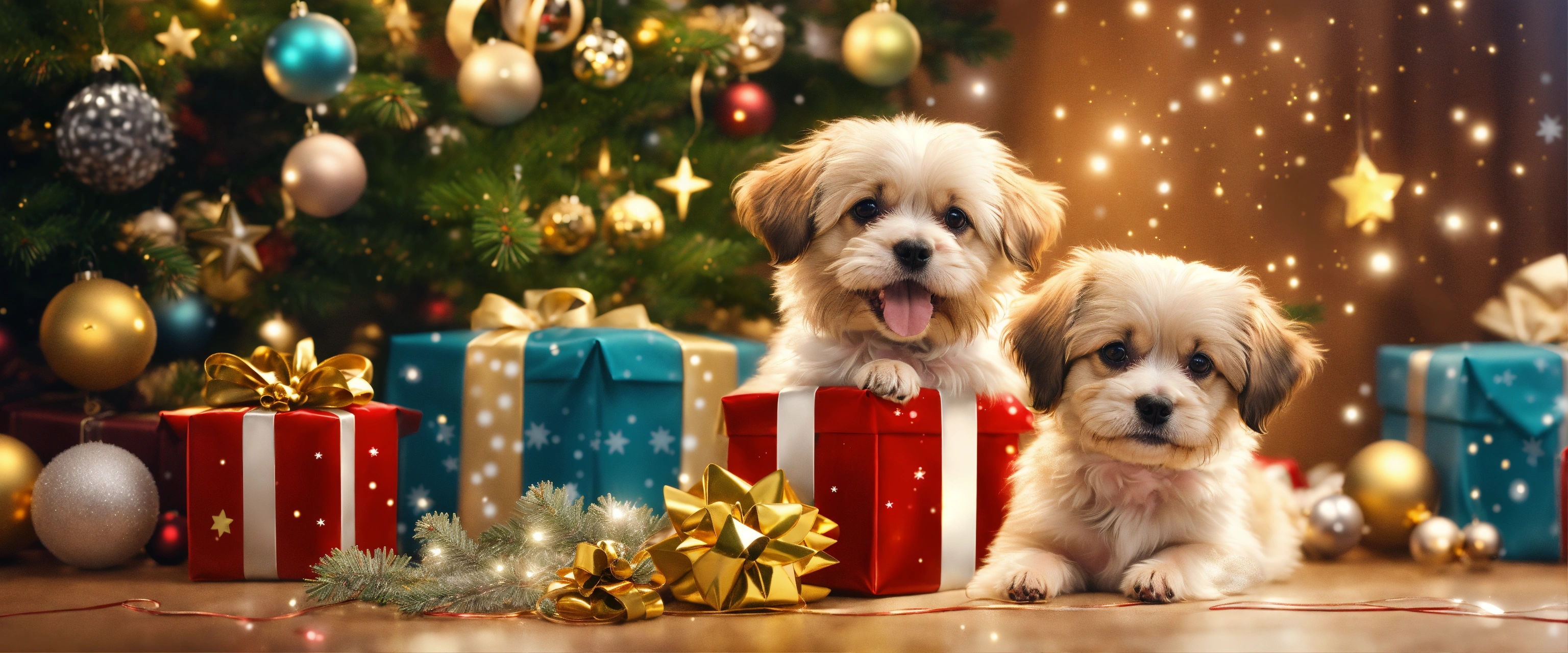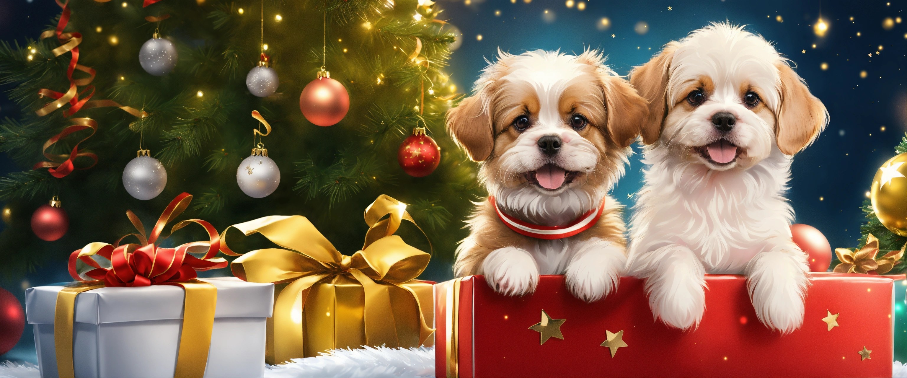 Two beautiful cute and soft little dogs coming out of a christmas gift package with christmas decorations and gold and silver tinsel and stars and a christmas tree, very detailed illustration, 8k