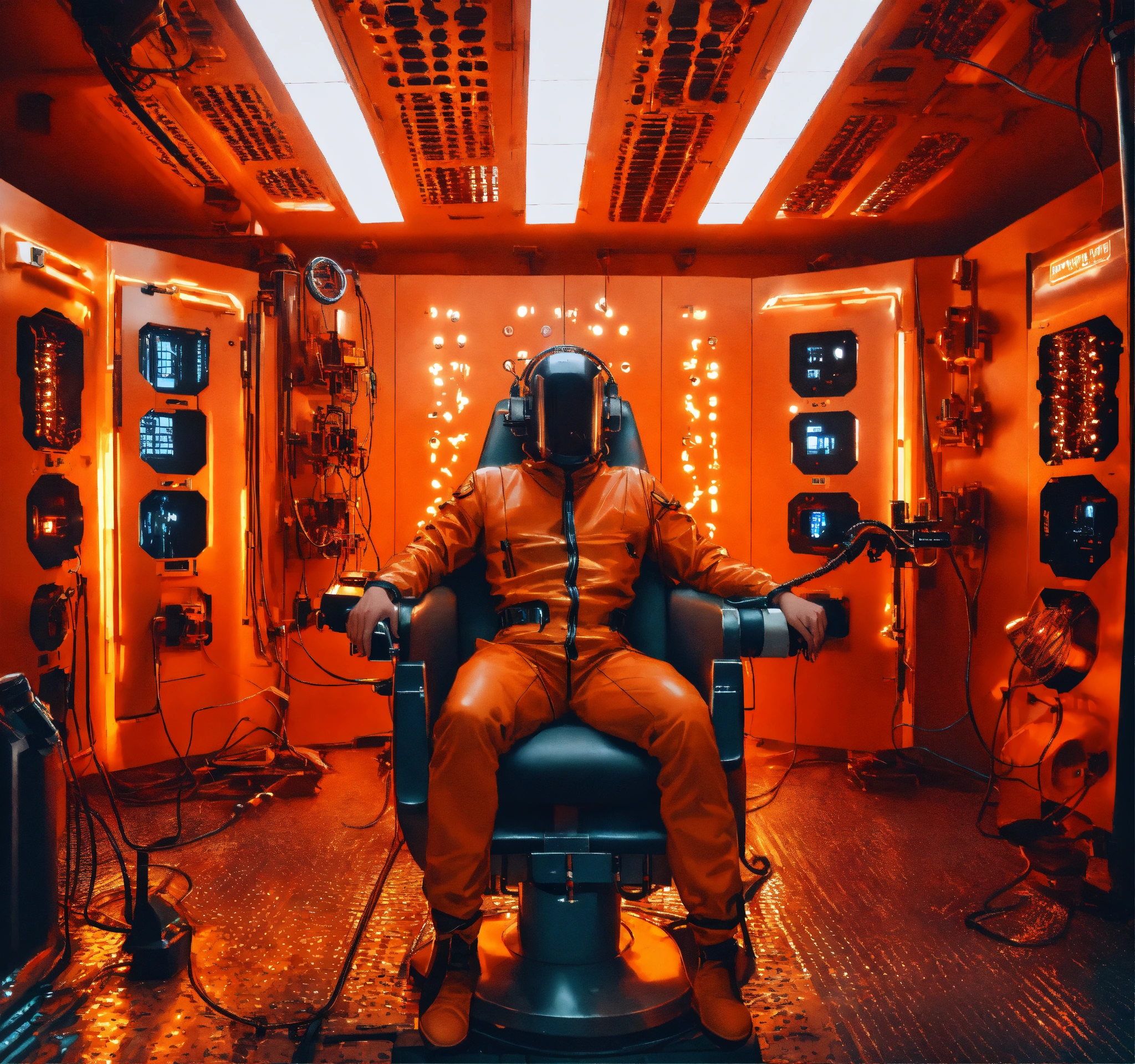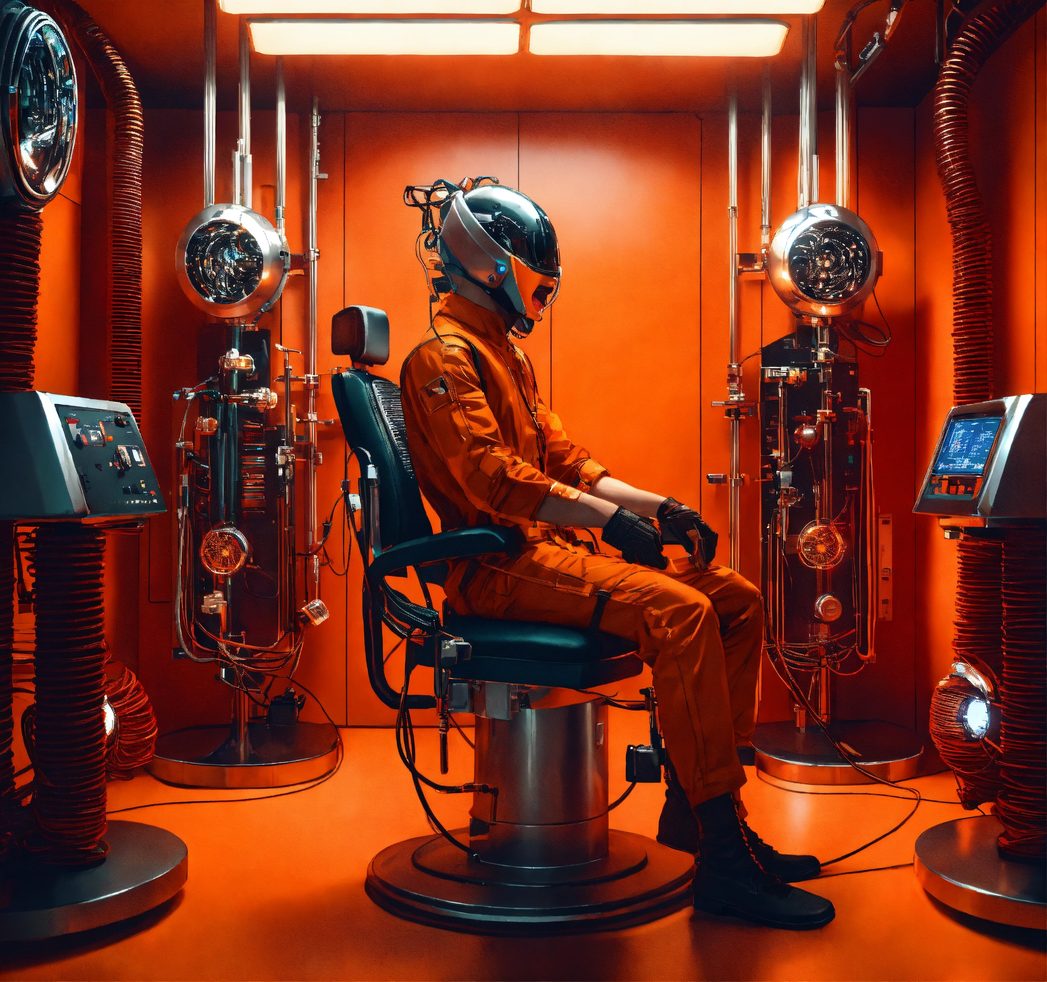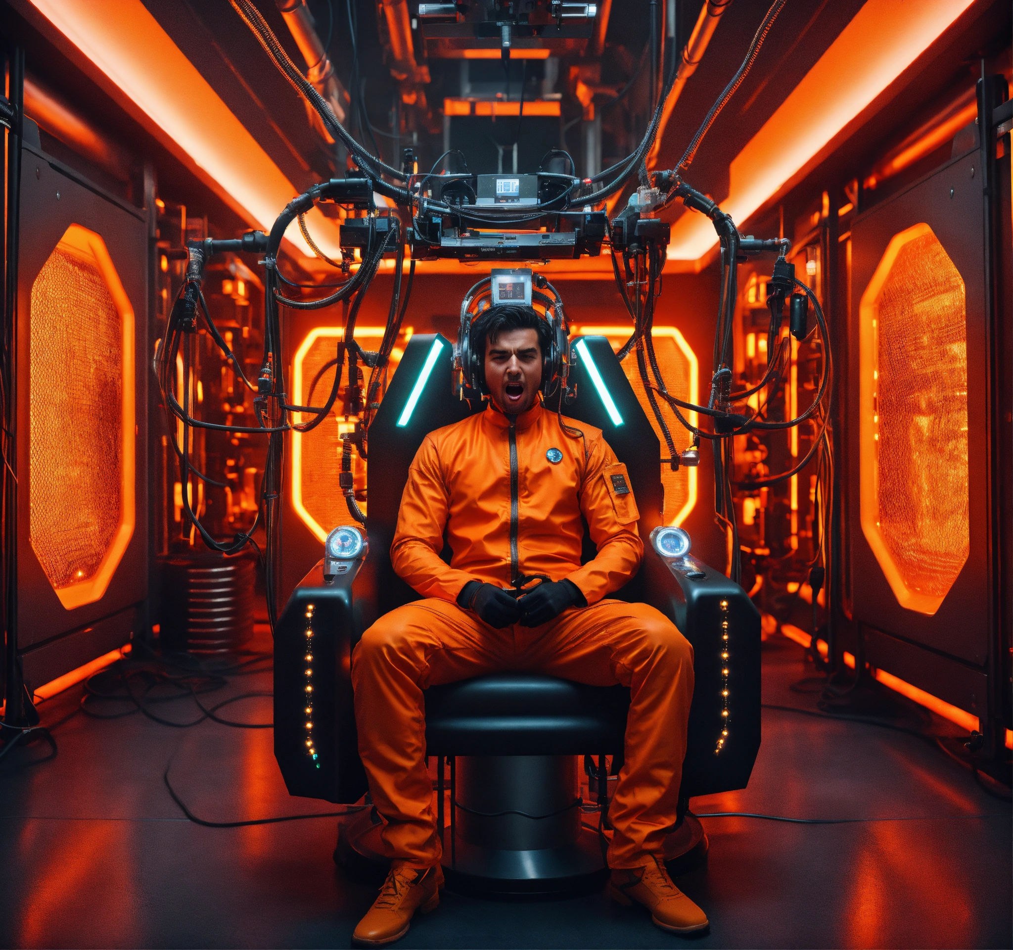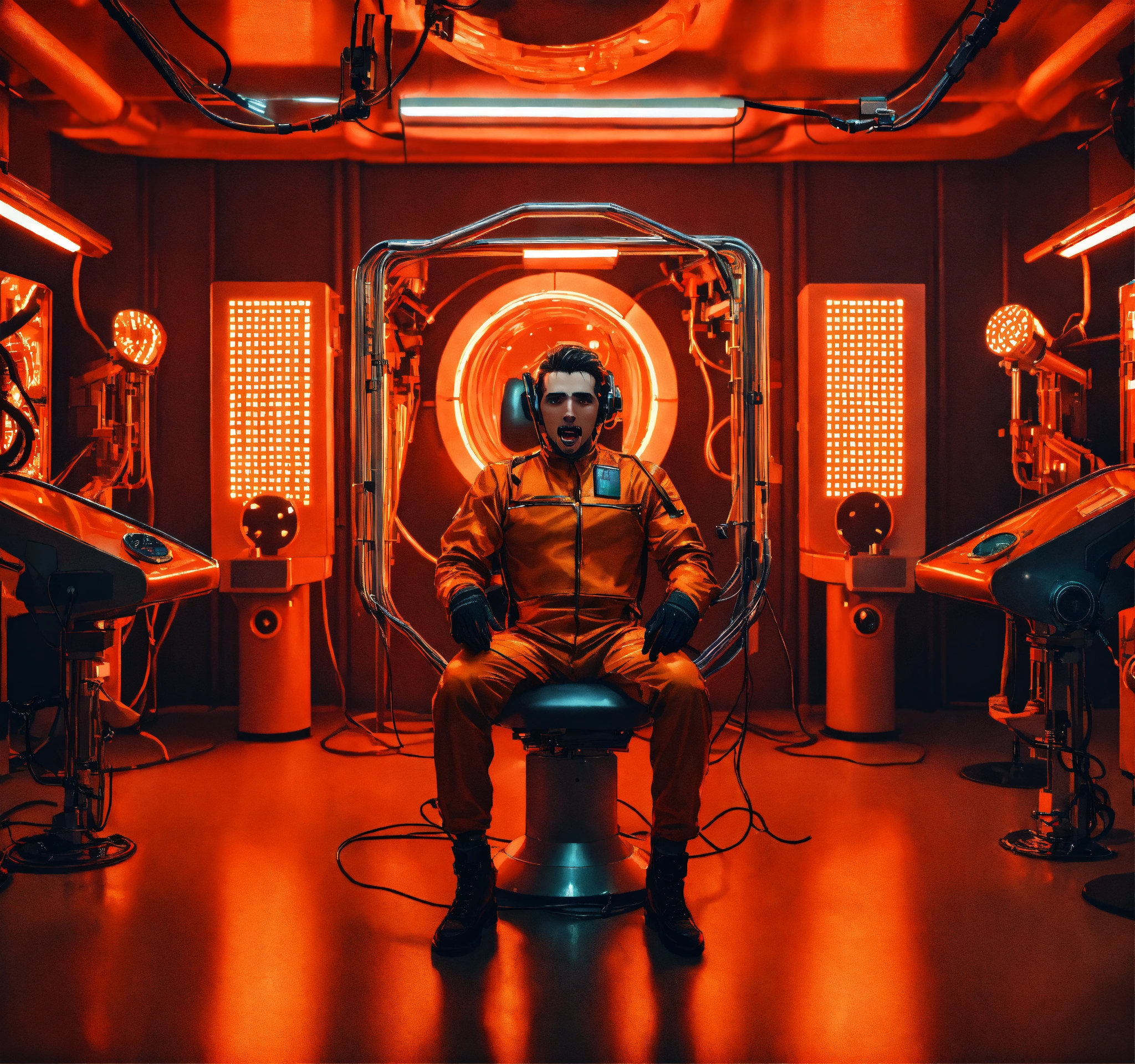 Clean cut dark hair guy in futuristic orange jumpsuit is screaming strapped in sitting in a cold steel hair salon chair with dryer on his head with lots of metal tubes hooked up extracting his soul facing forward in a high tech lab room with alot of lights and buttons on the walls, 8k, sci-fi, futuristic, red, giger