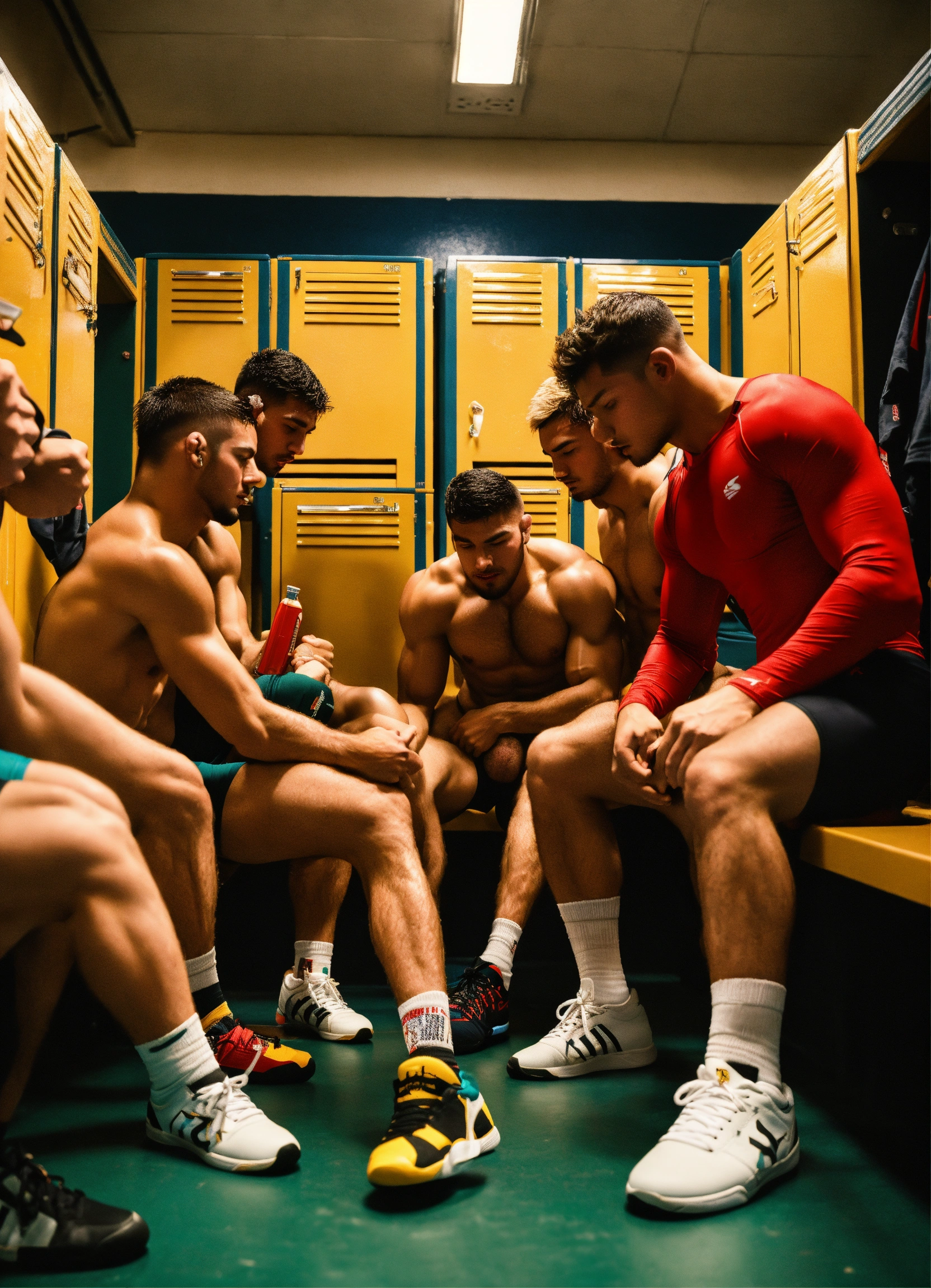 Group of skinny handsome boxer wrestlers young cuddling guys tanned hairy sweaty sporty hunks studs in sporty sock and in a locker room lockers with big bulges sniffing sneakers into feet