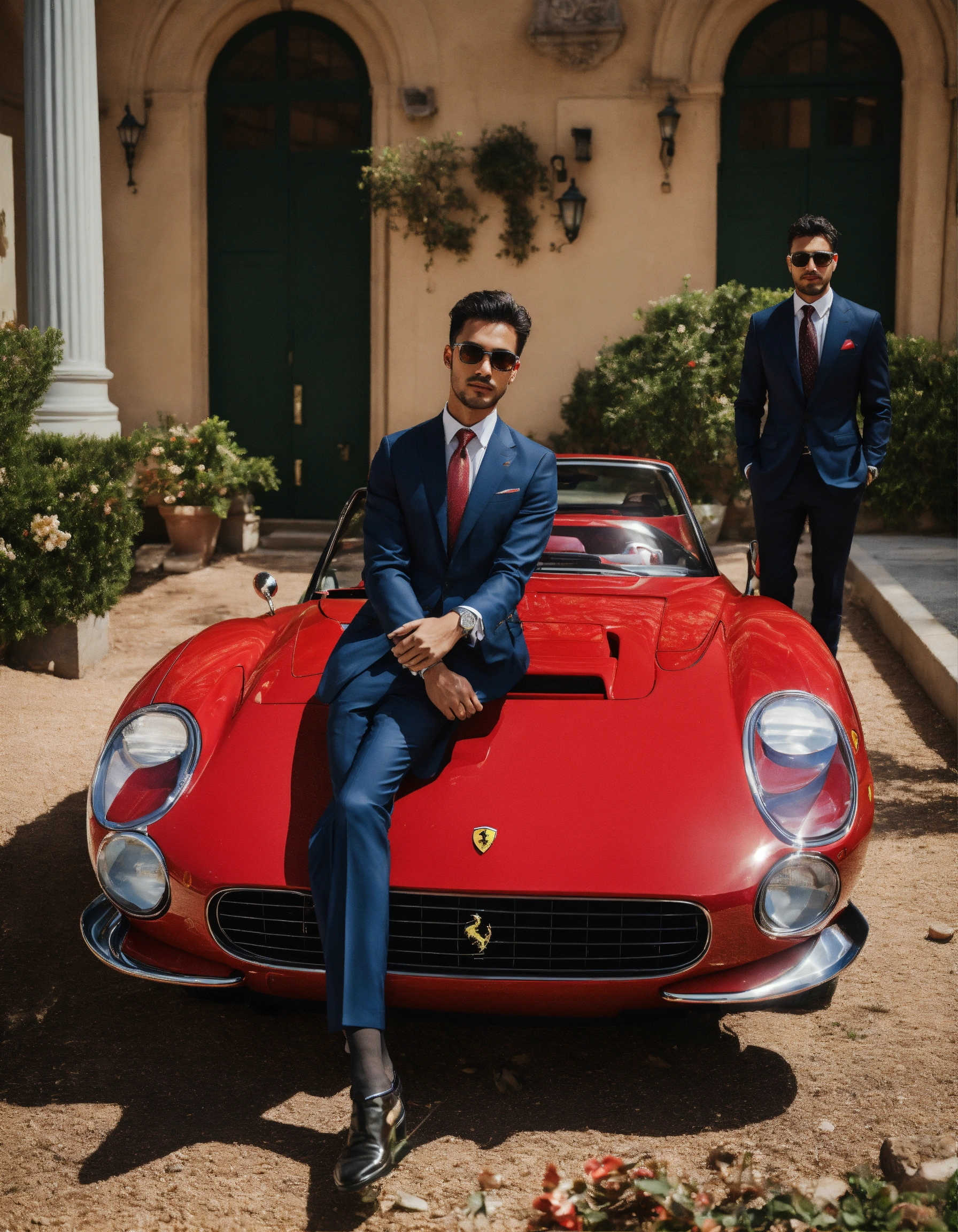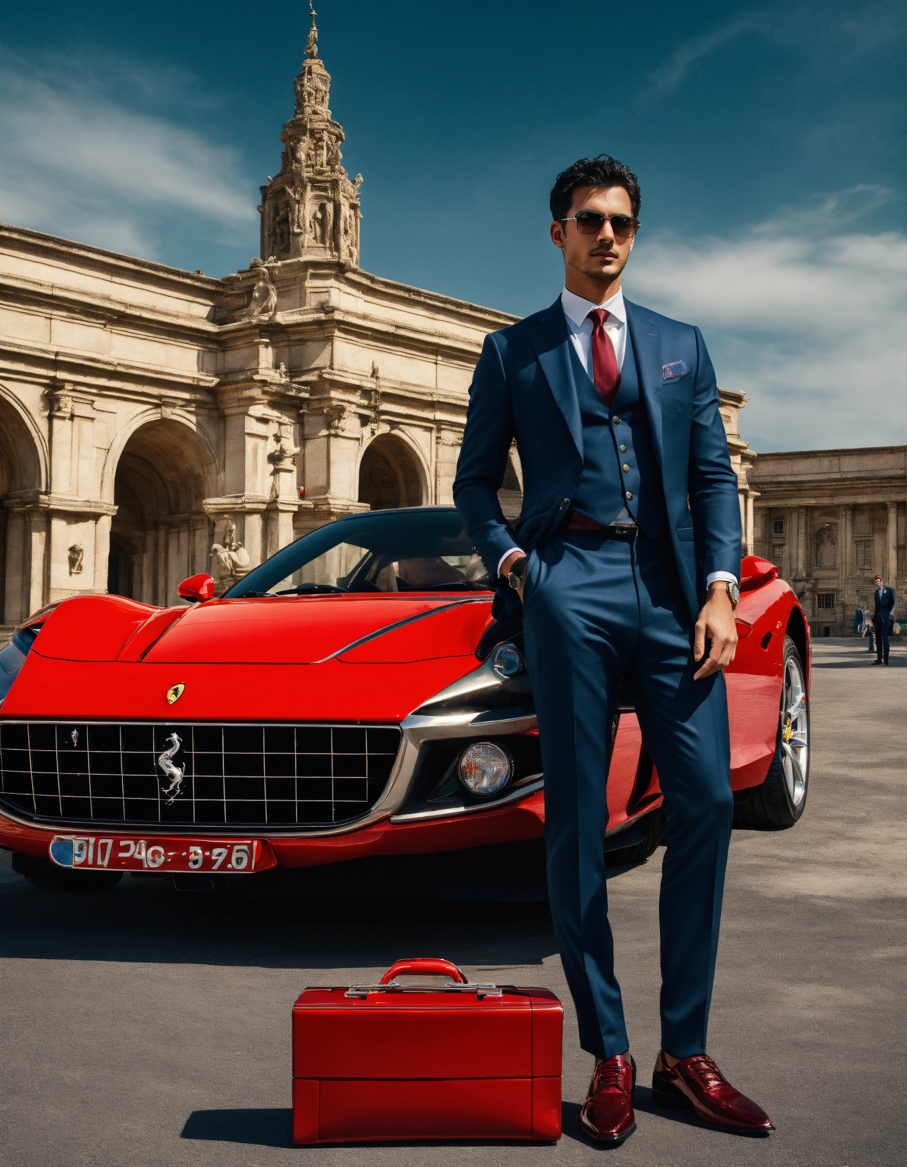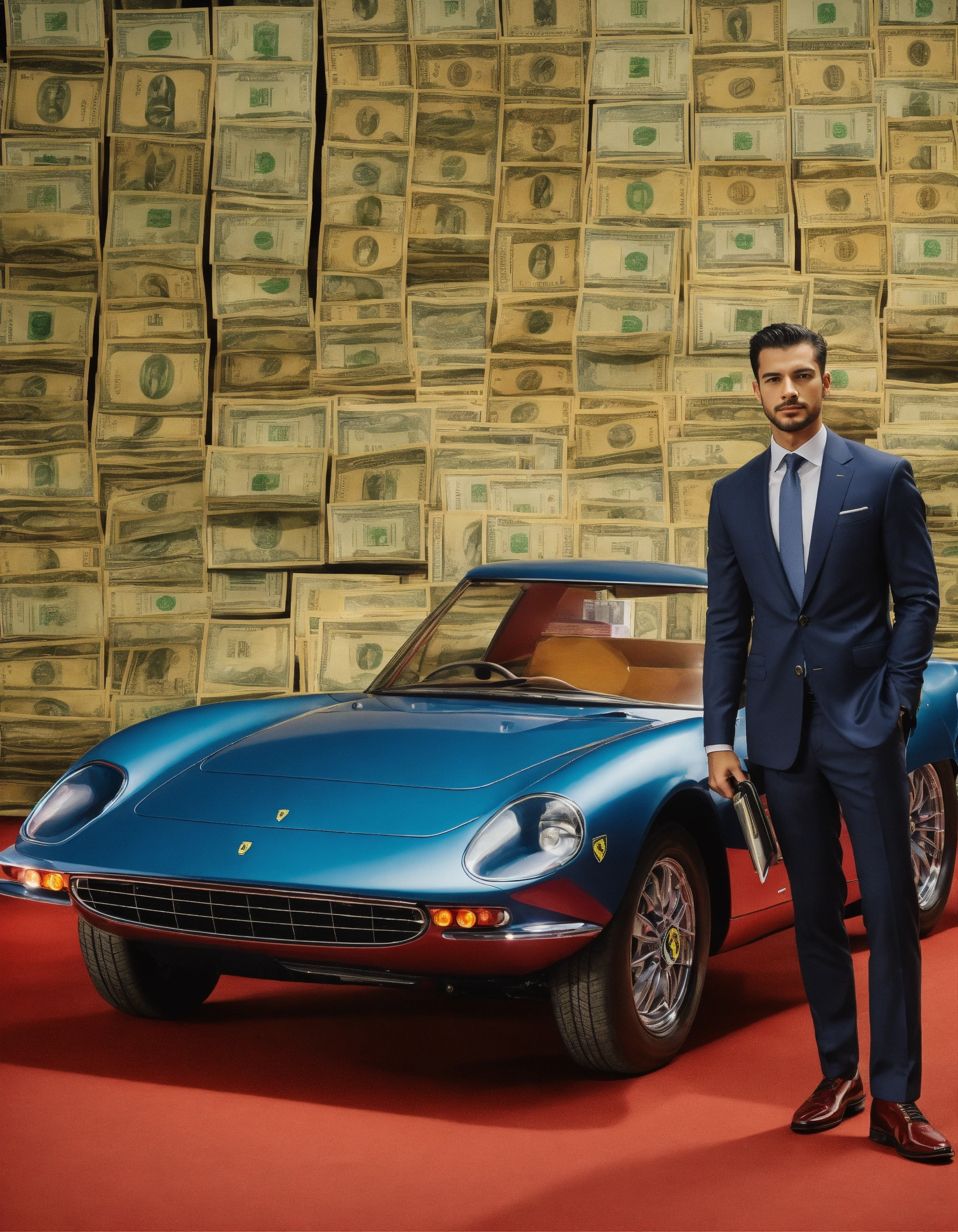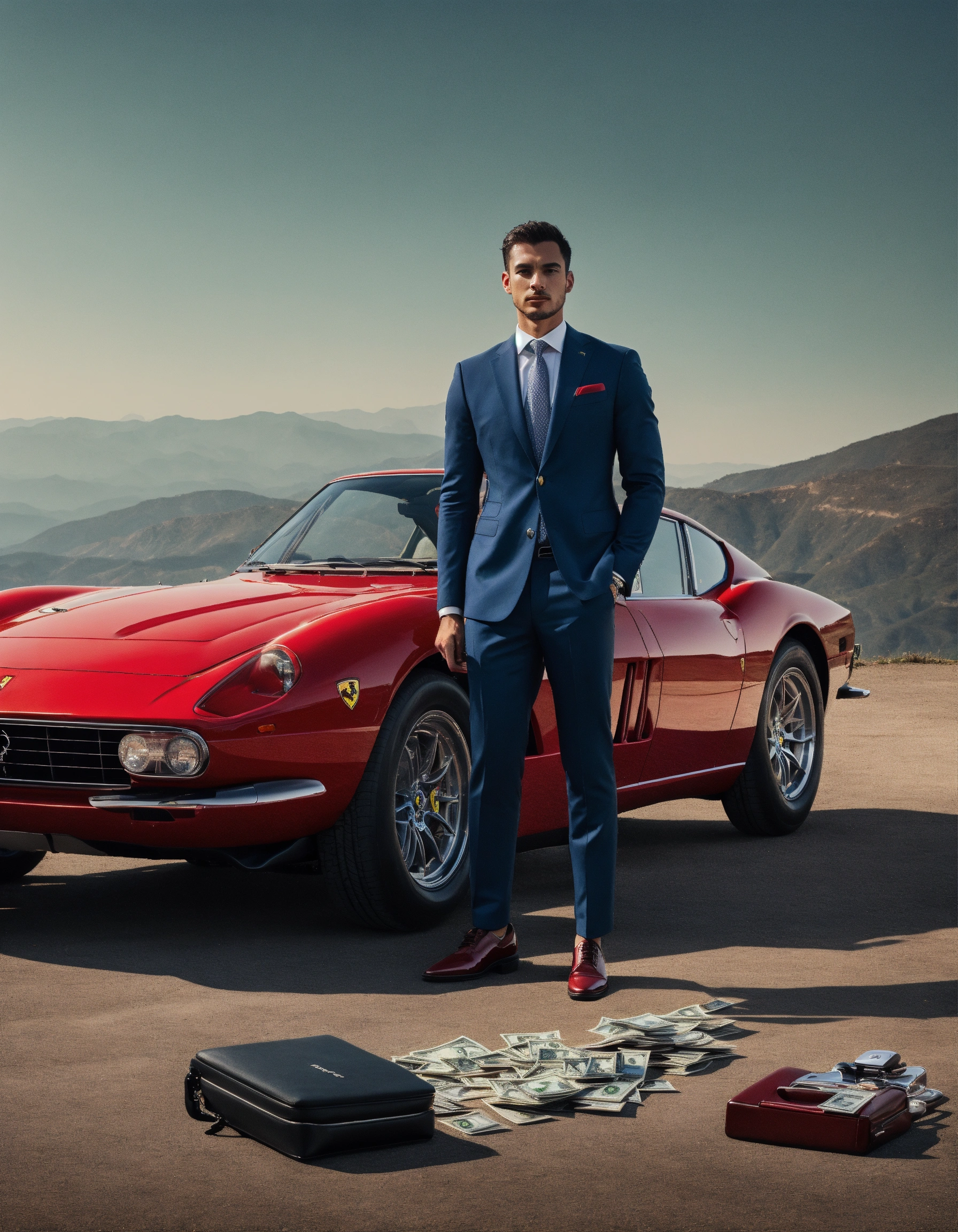 A well-dressed person standing next to a ferrari car and on the car a briefcase of money showing