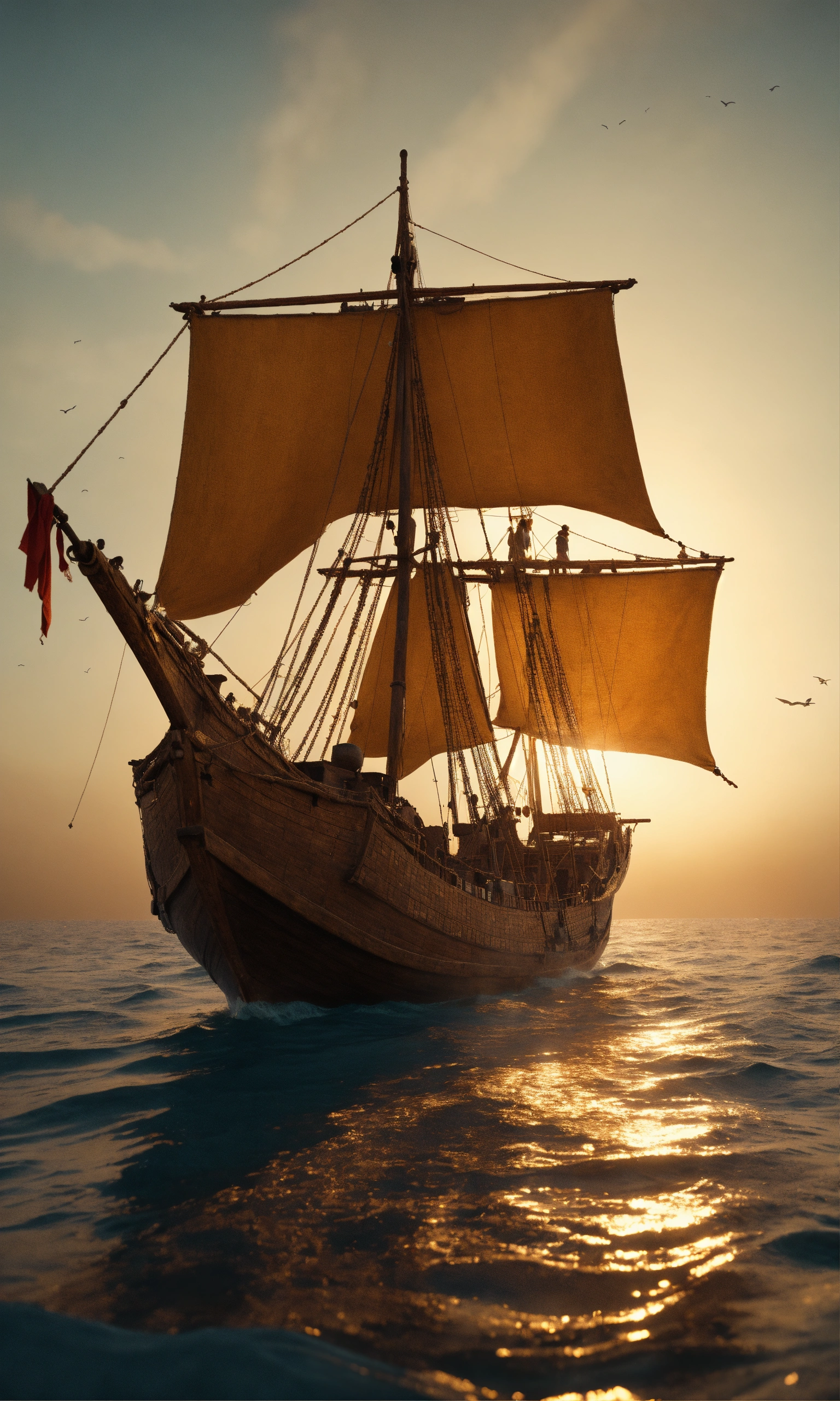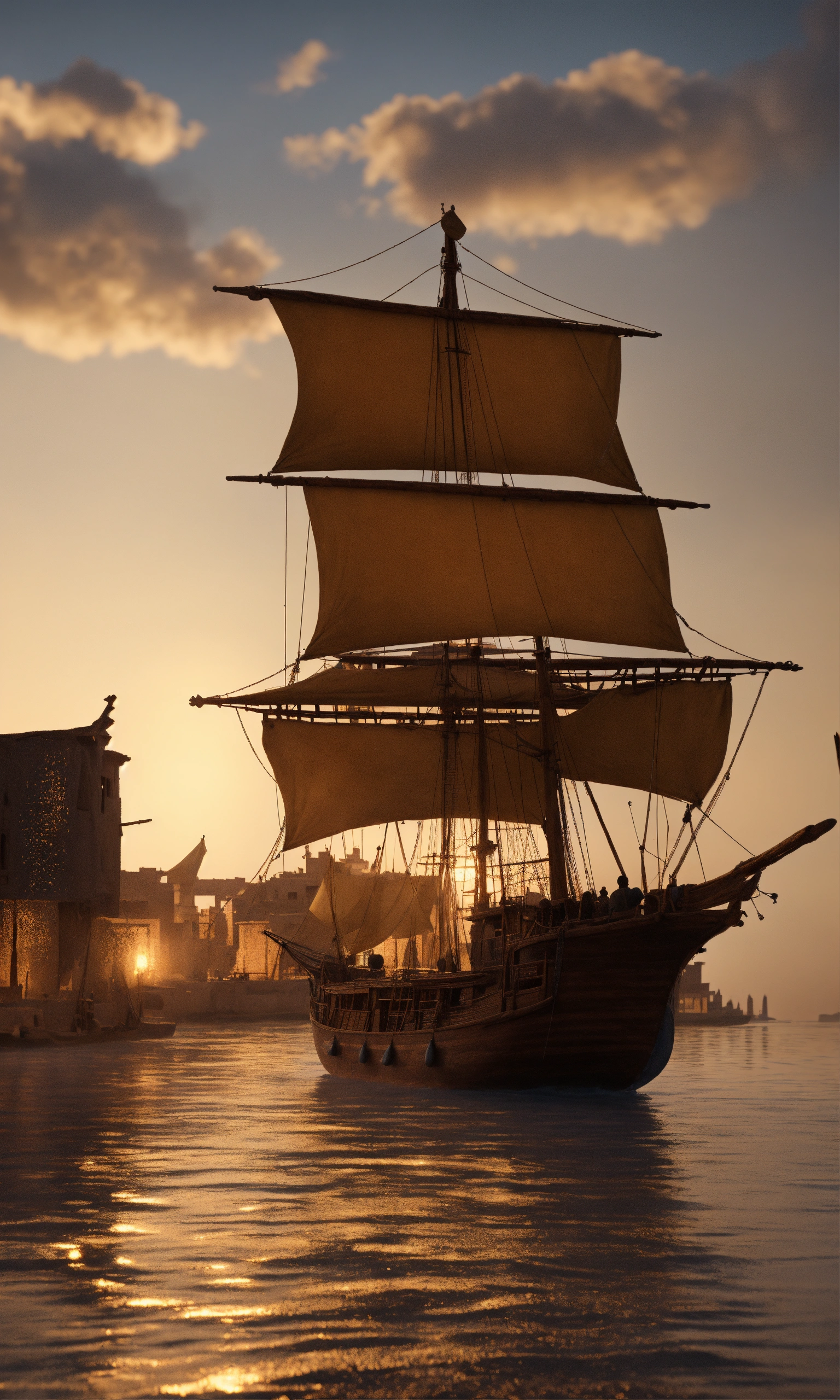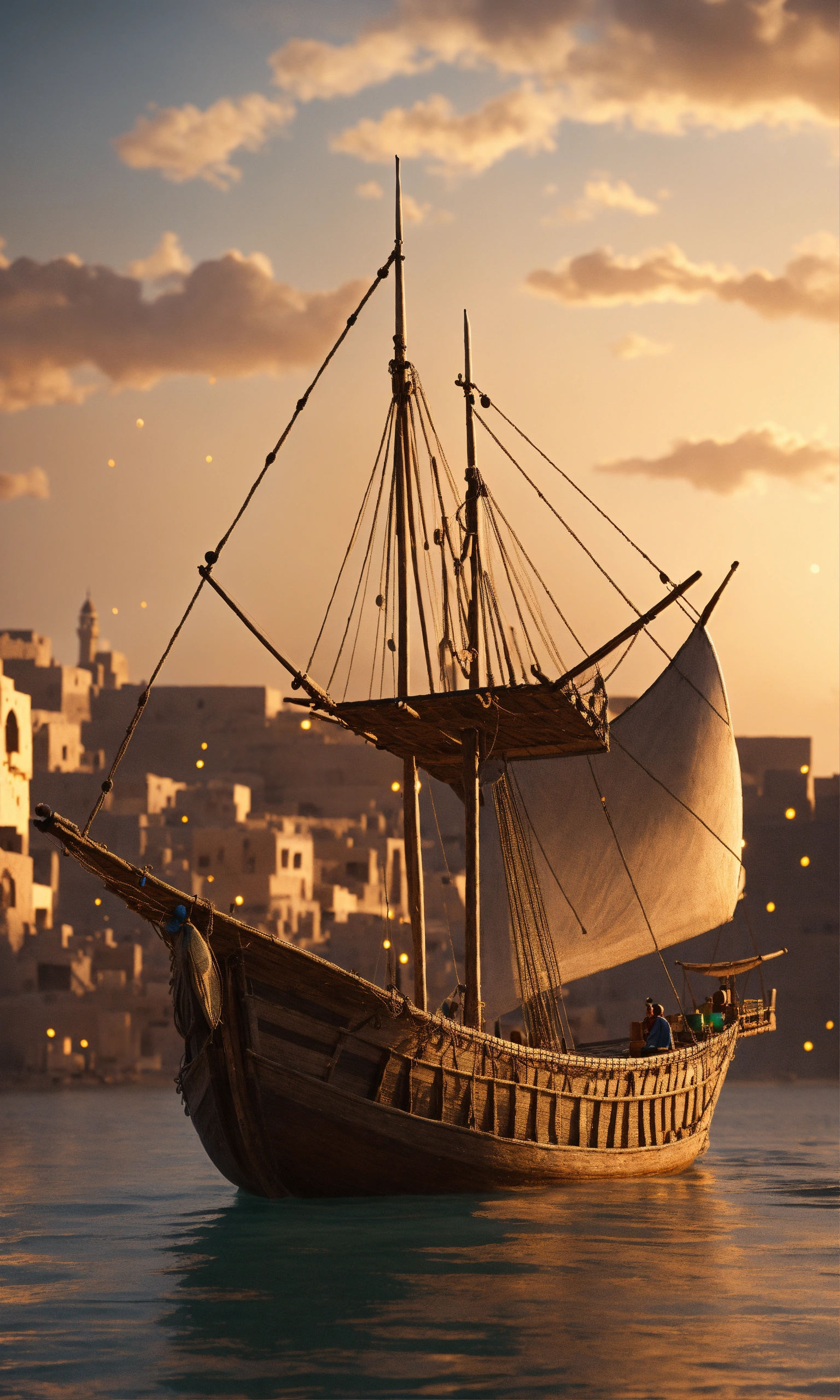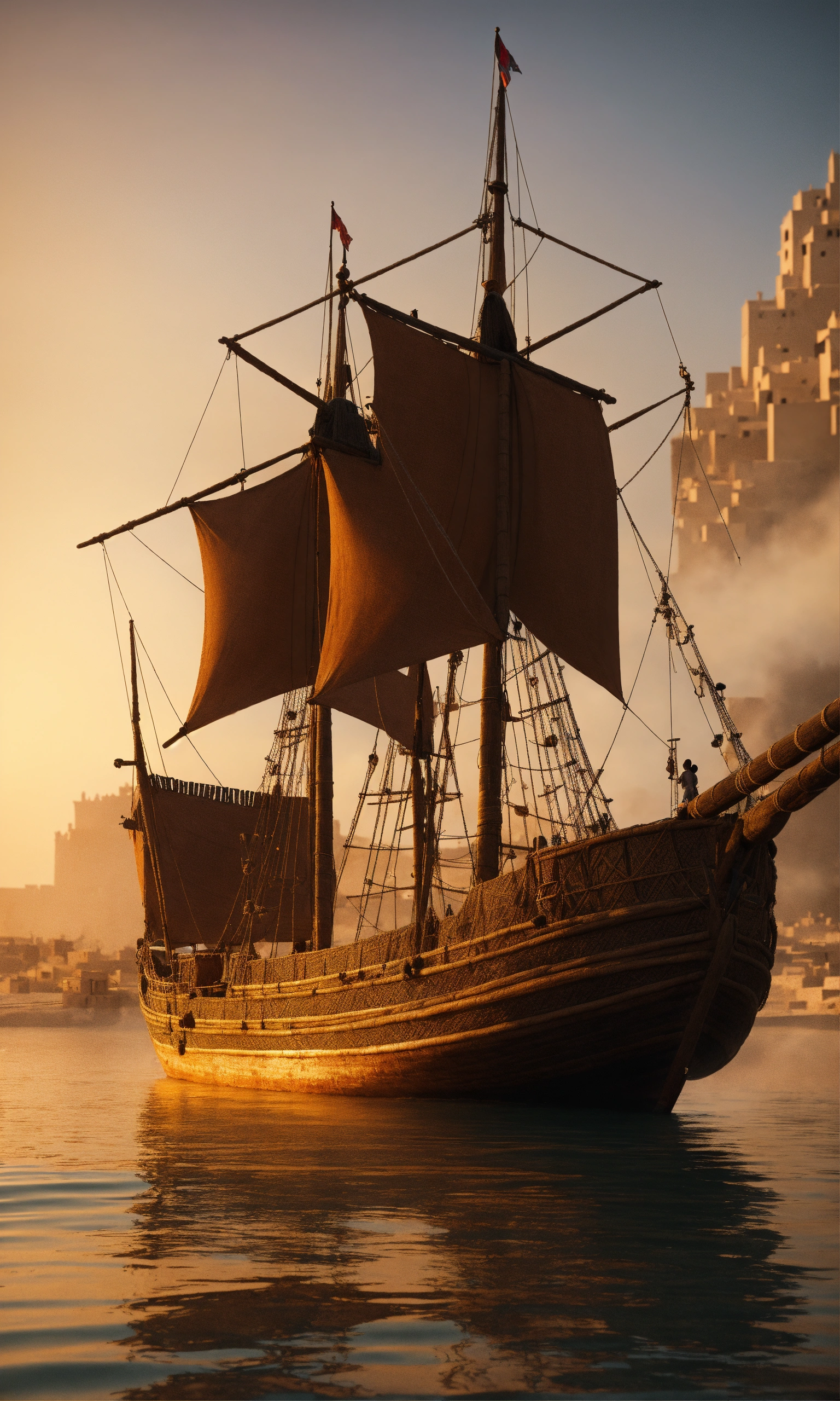 Dhow ship sailing on the sea, with medieval african town based on timbuktu in the background, ultra-detailed, highest detail quality, ultra-realistic, photography lighting, reflection mapping, photorealistic, cinematic, cinematic noise, movie quality rendering, octane rendering, sharp focus, depth of field, real shadow, vfx post-production, rtx ray tracing lighting