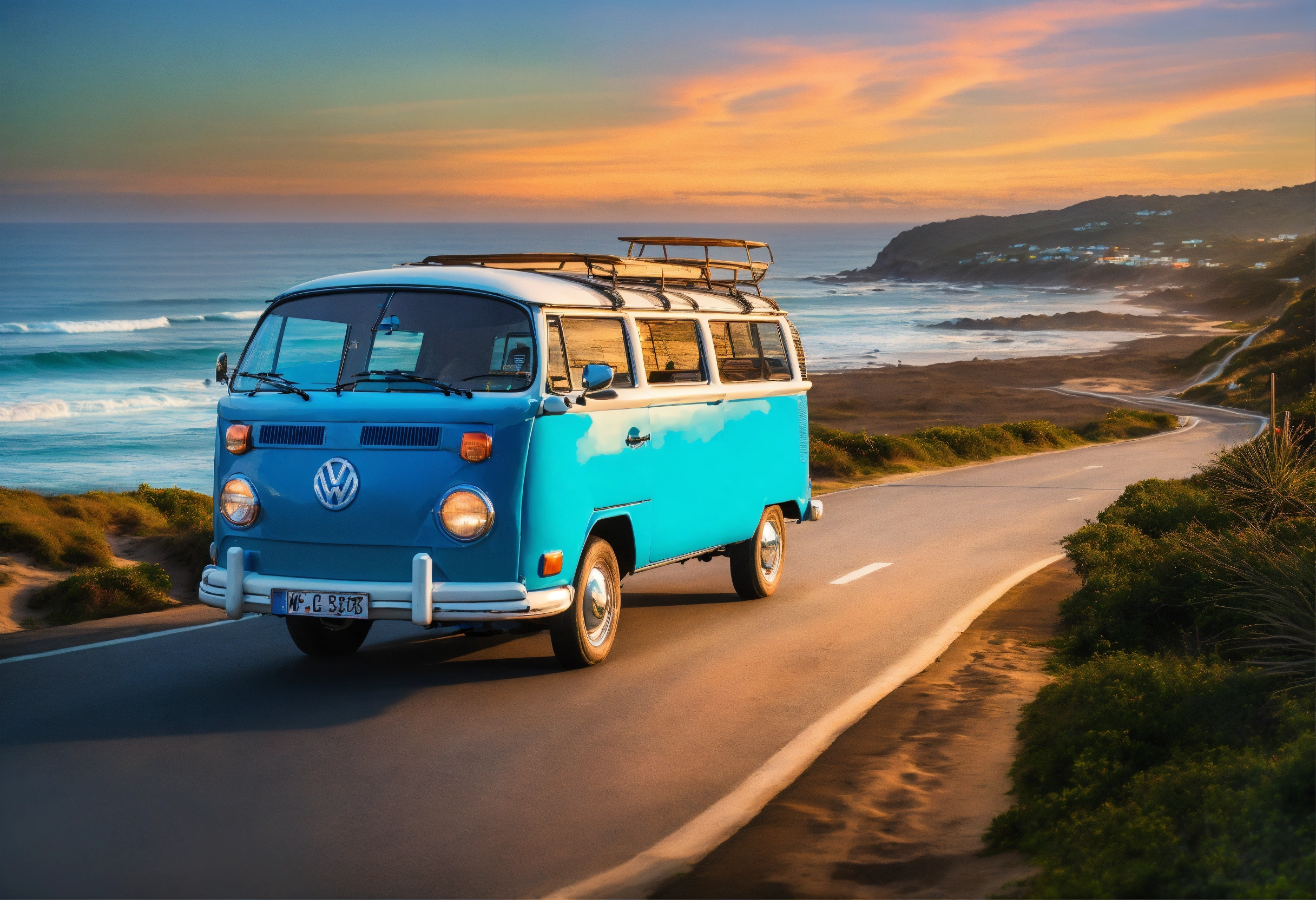 Photo 16k, ultra realist, blue vw combi colors pastel, carrying on the top a surfboard, driving towards the ocean horizon, showing the back of the car, curve road from left to right, with text "life is a journey montabeach", typography, sunset reflecting in the sea