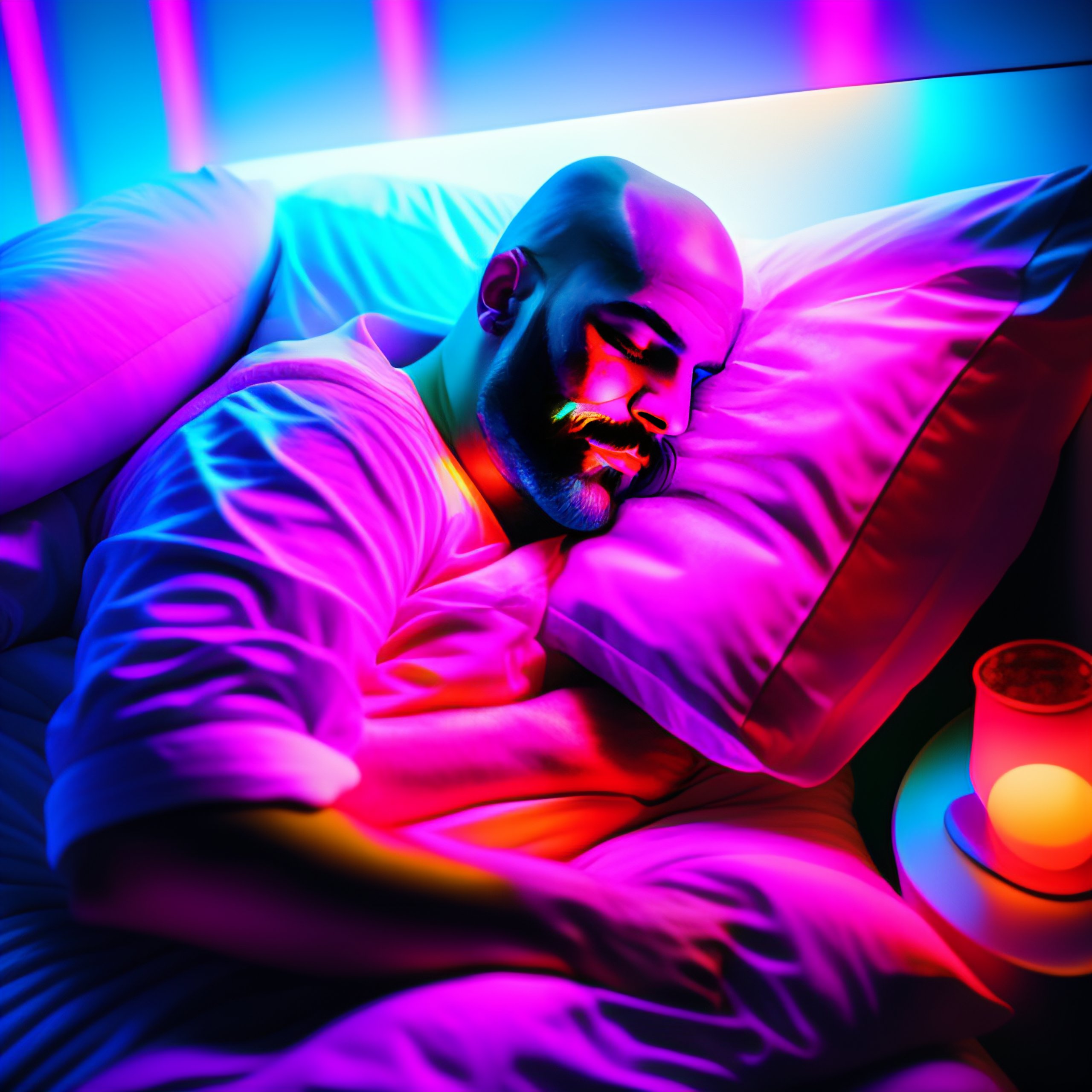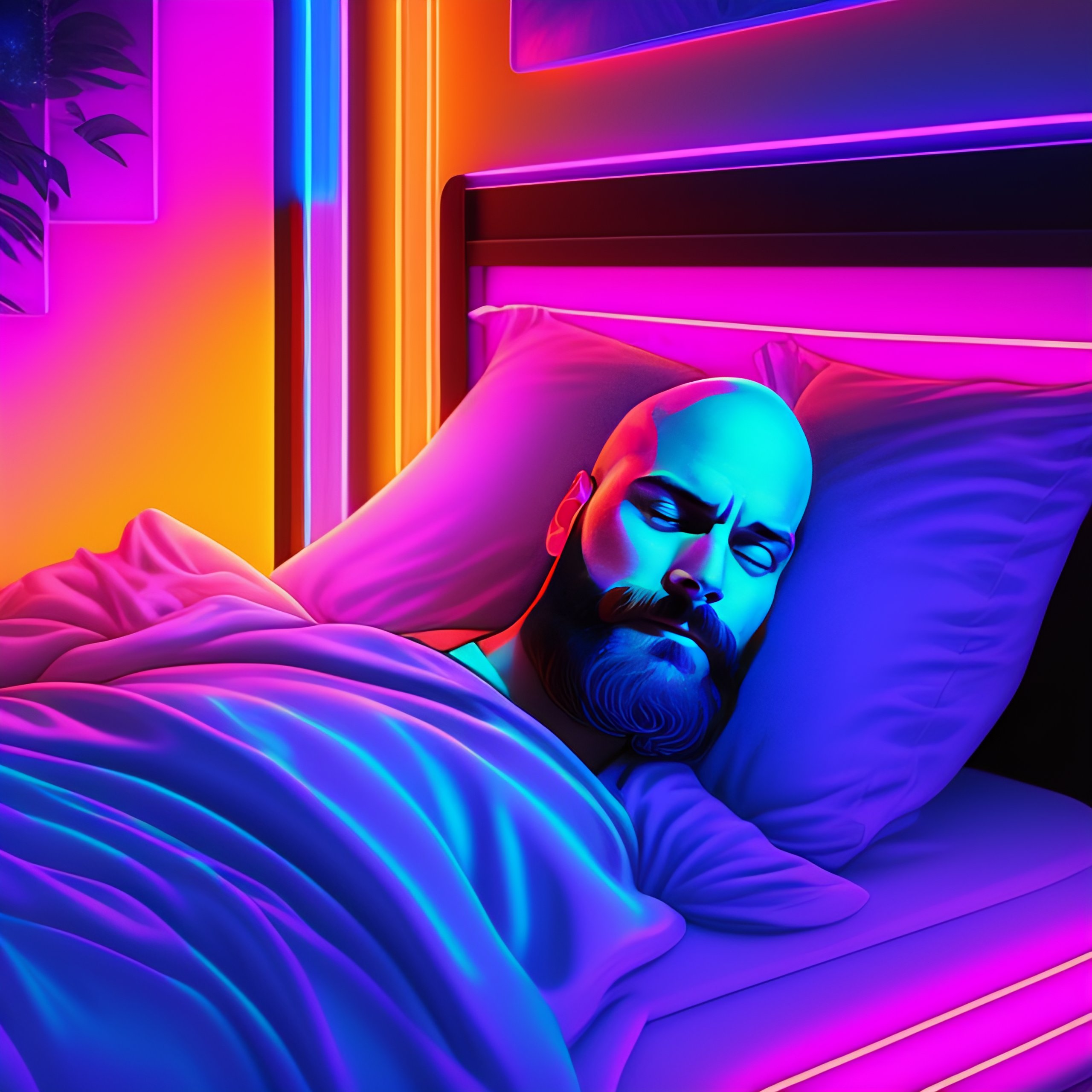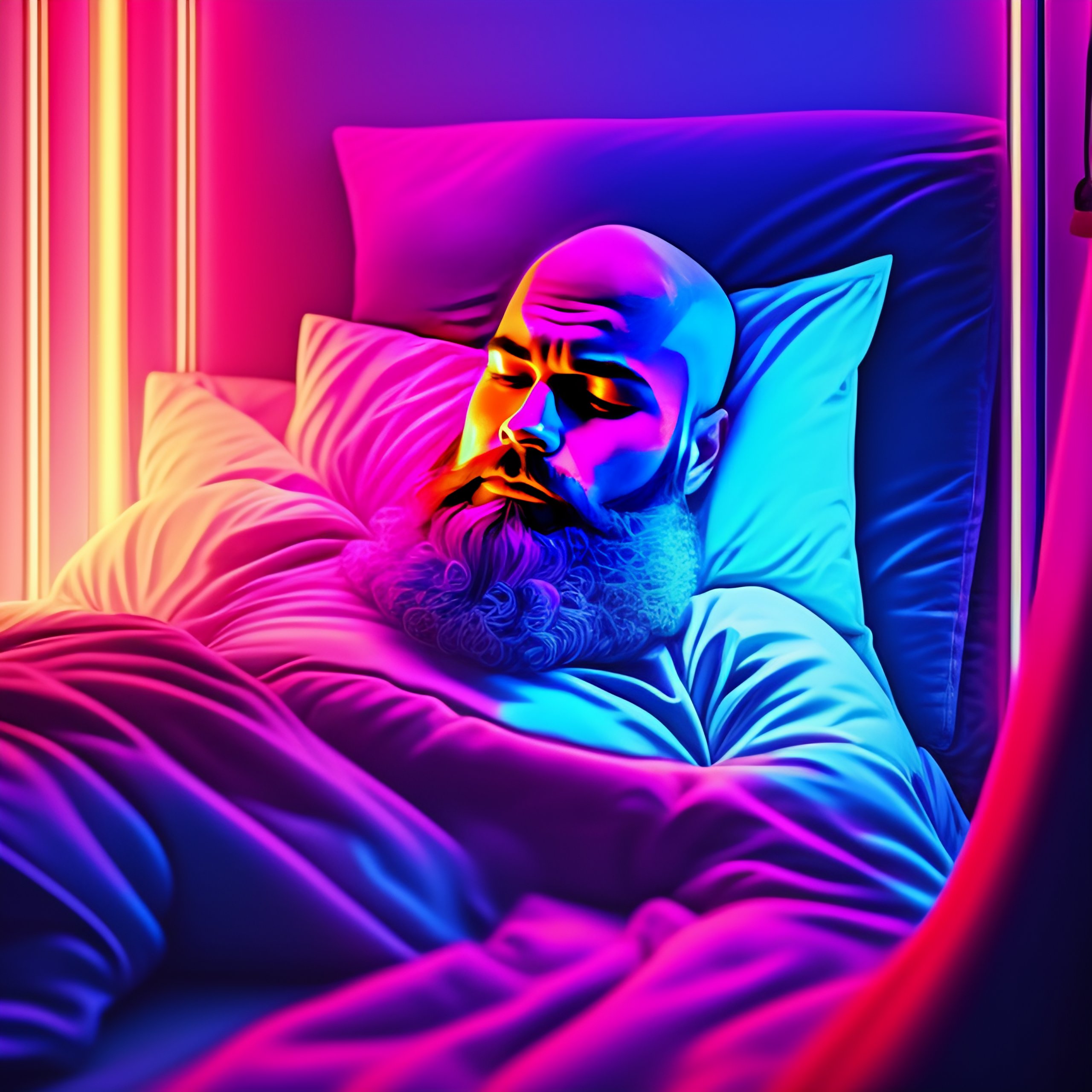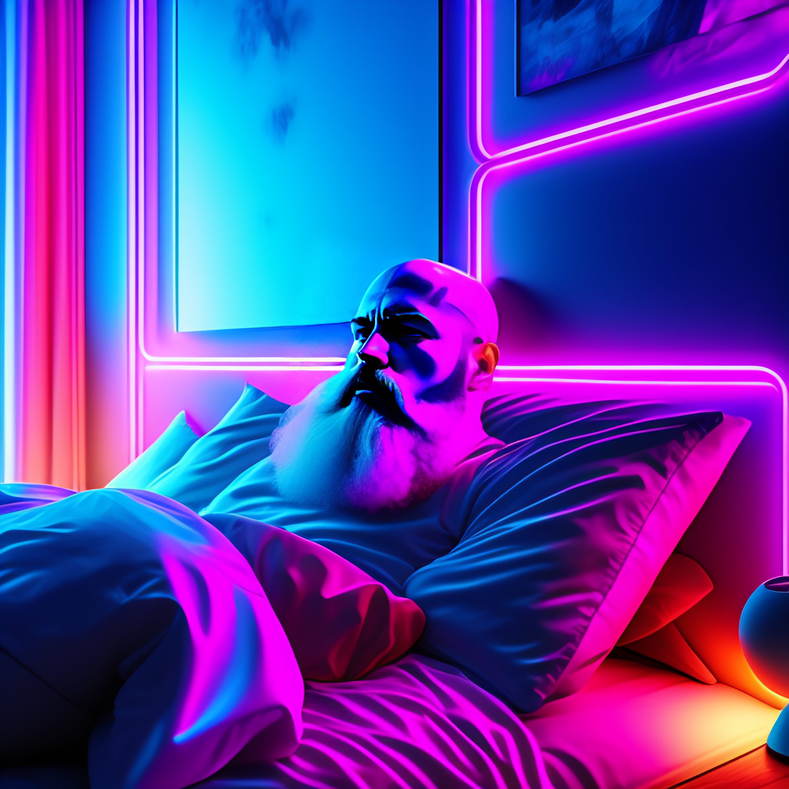A bald and bearded man is sleeping on a bed. synthwave, pink and blue neon lights lightly illuminate a big room, comic strip atmosphere
