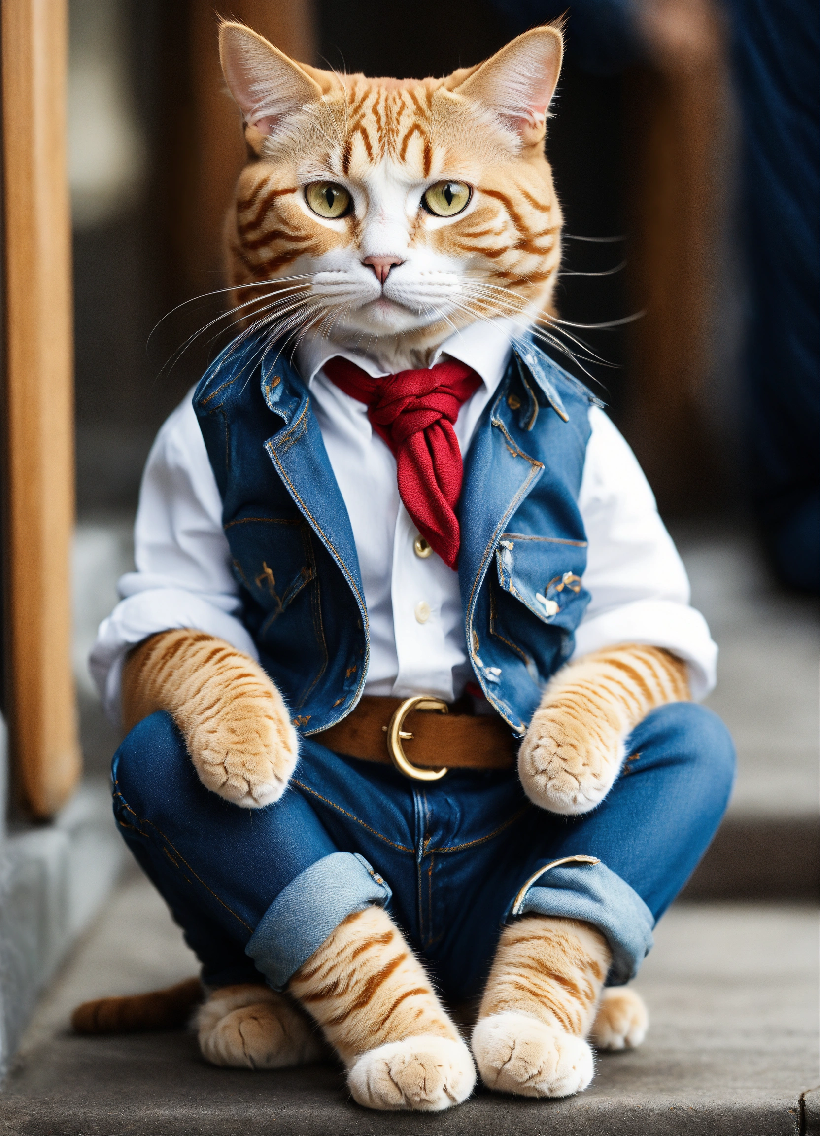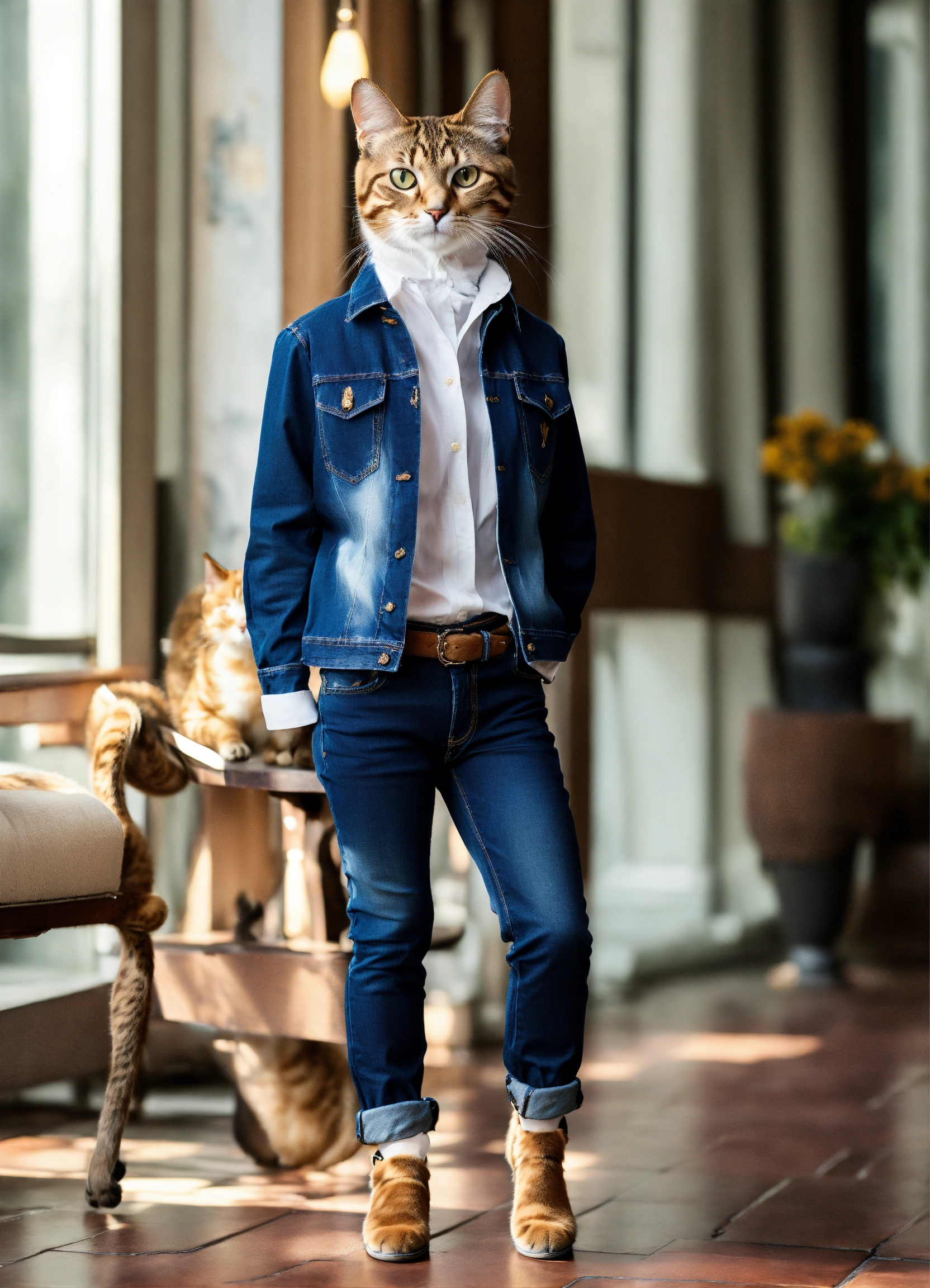 A cat like human with two legs, a fashion-forward feline, wearing trendy denim jeans, paired with a classic white shirt, exuding a modern casual look. meet the stylish cat in denim jeans and a classic white shirt. it embodies the essence of modern casual chic.