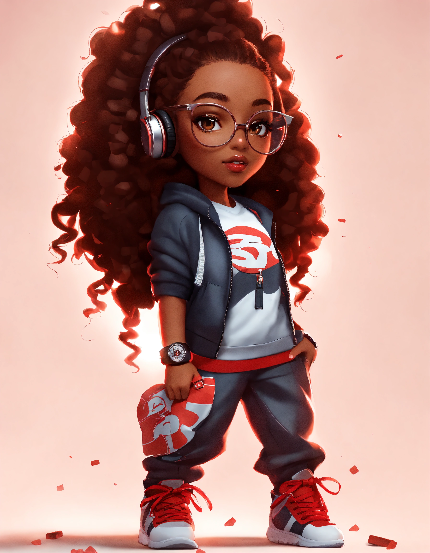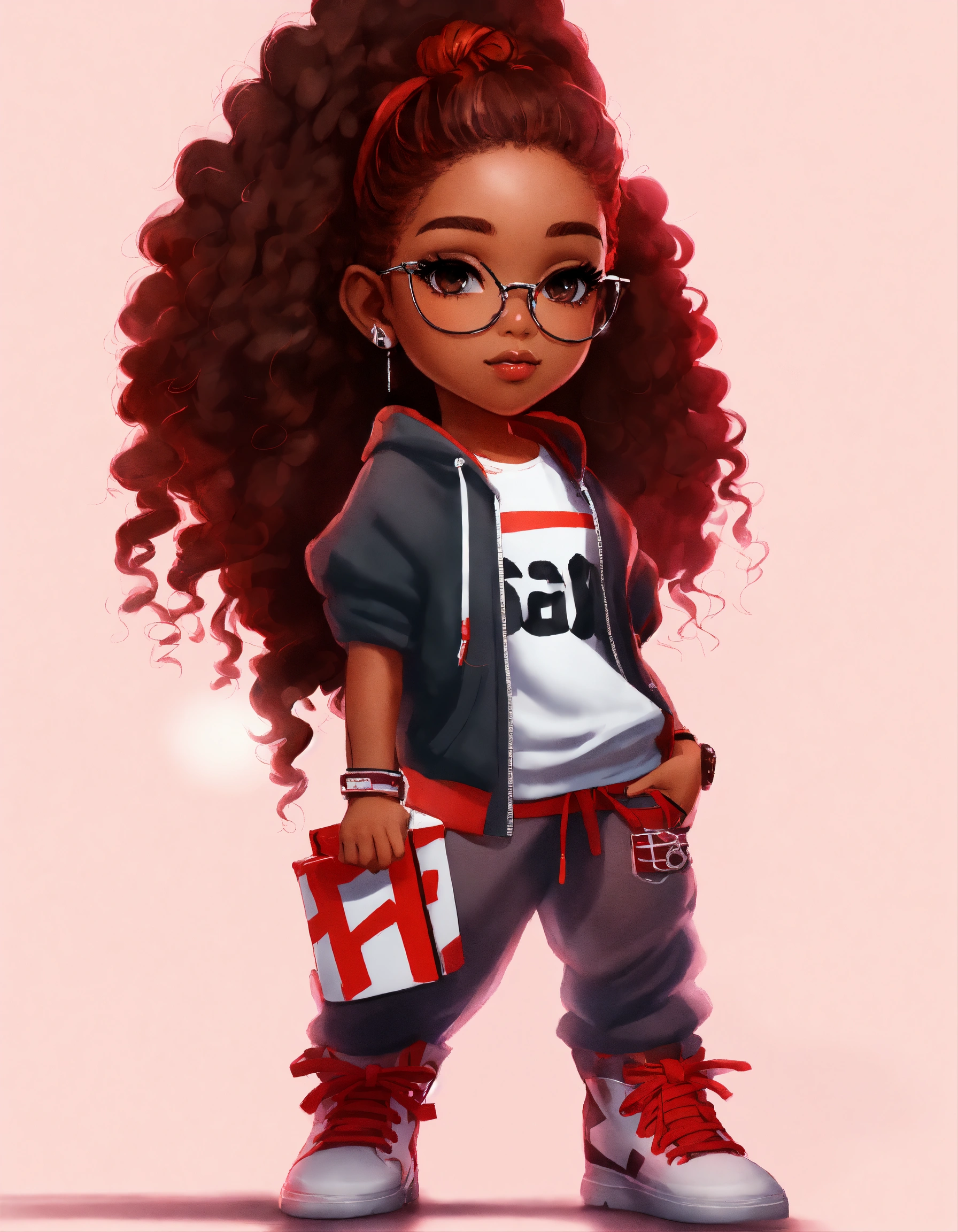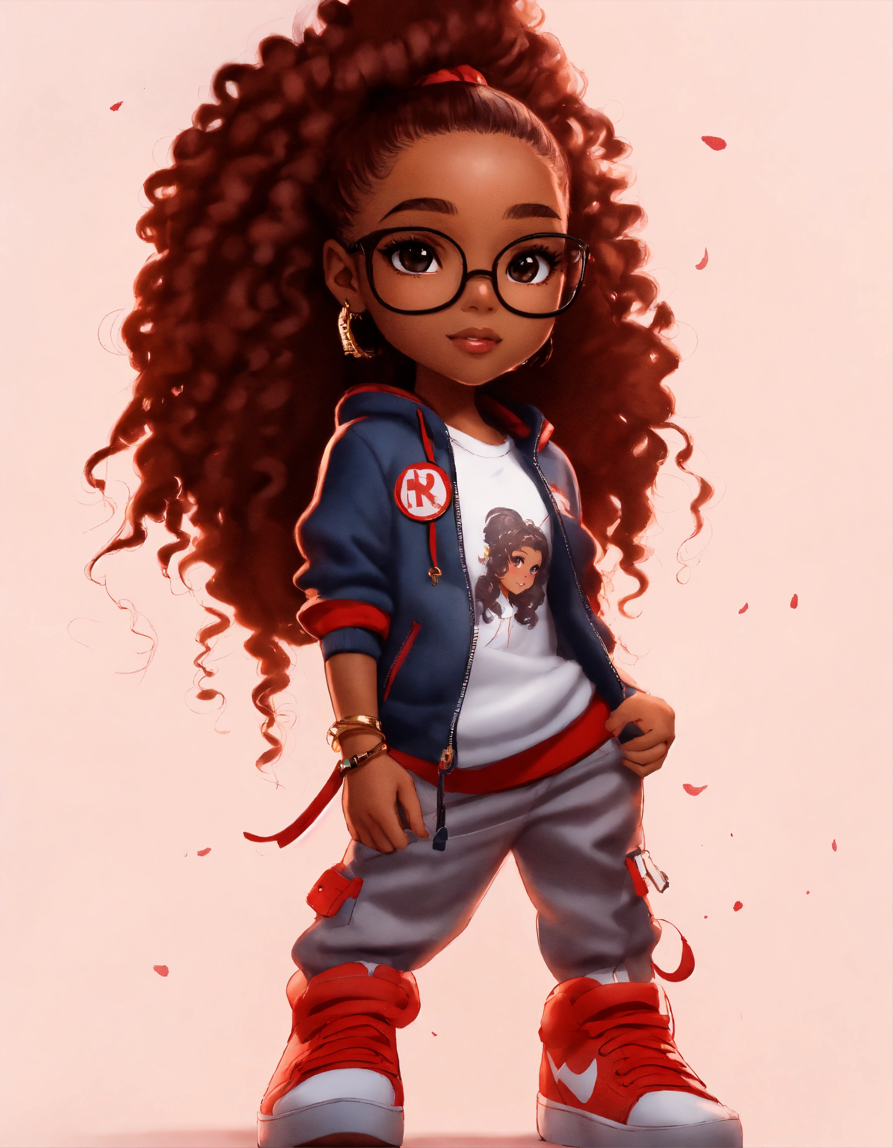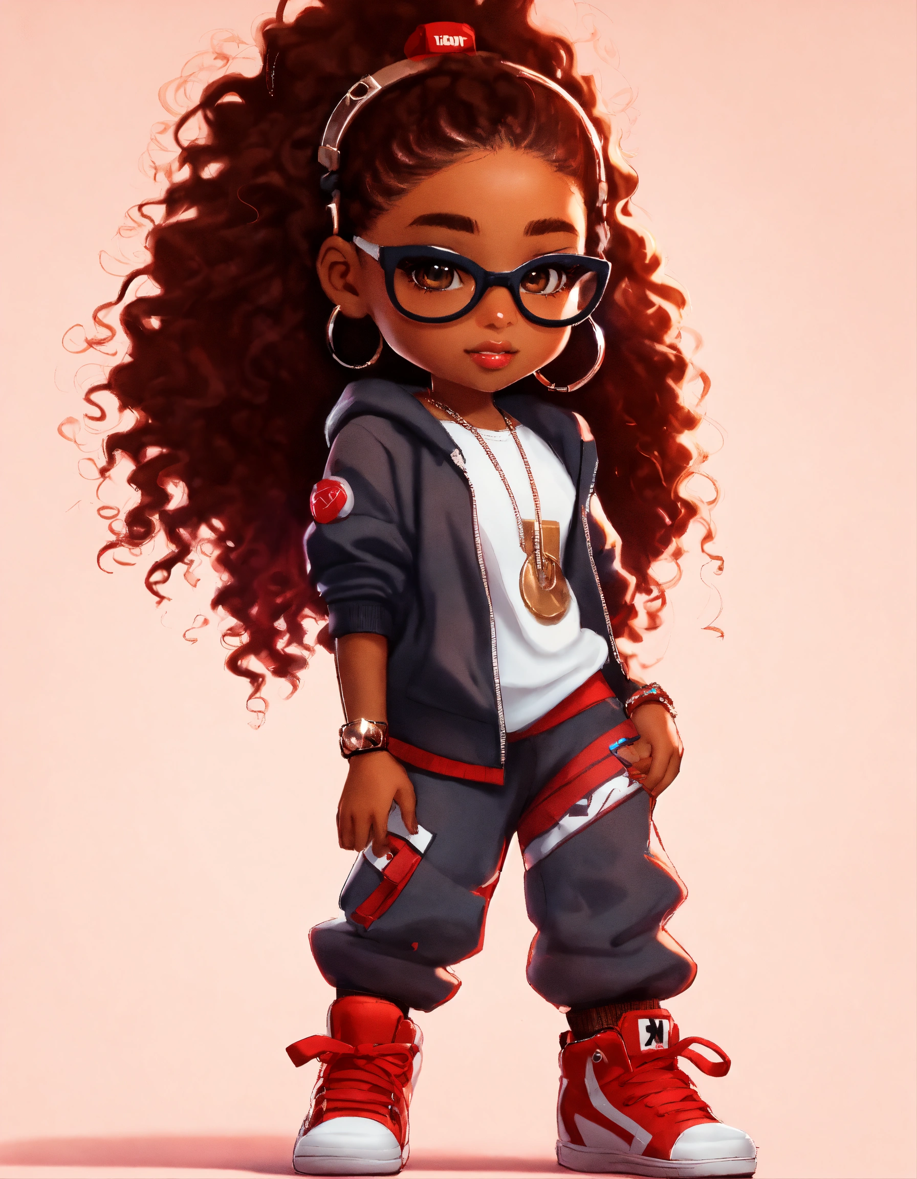 Adorably cute multiracial girl with melanin, wearing hip hop clothes full body pose, shiny curly hair, hazel eyes, brick background, 4k, high contrast elegant, centered, concept art, sharp focus, girl, realistic white and red pixar
