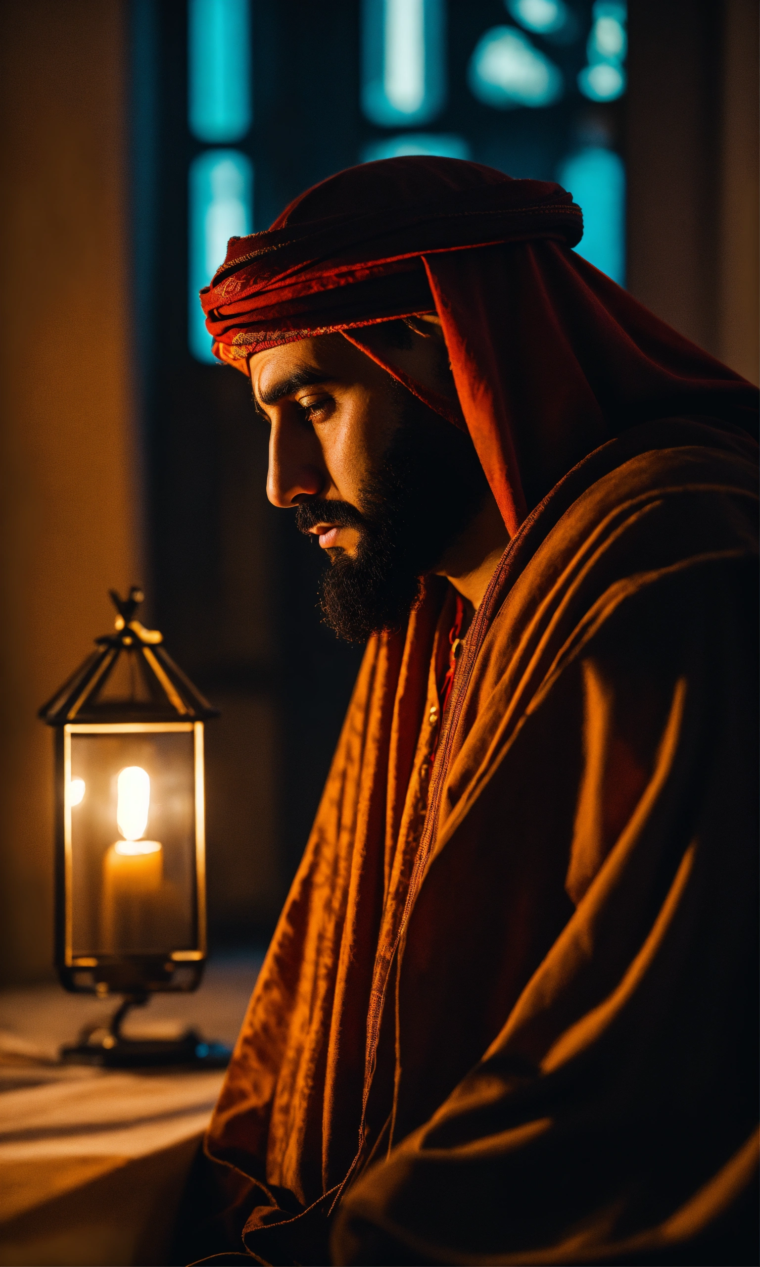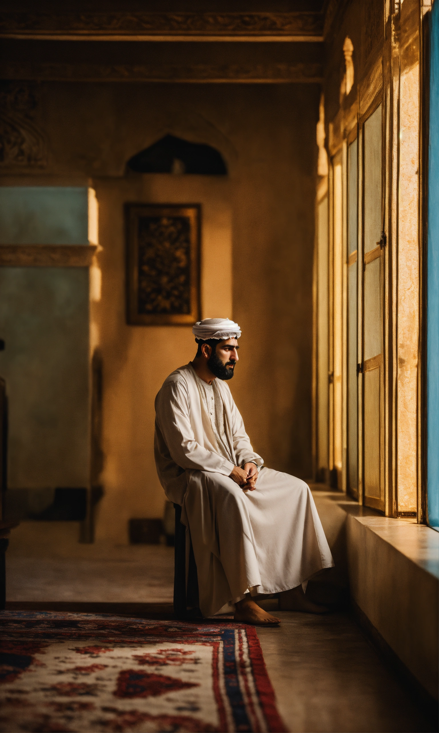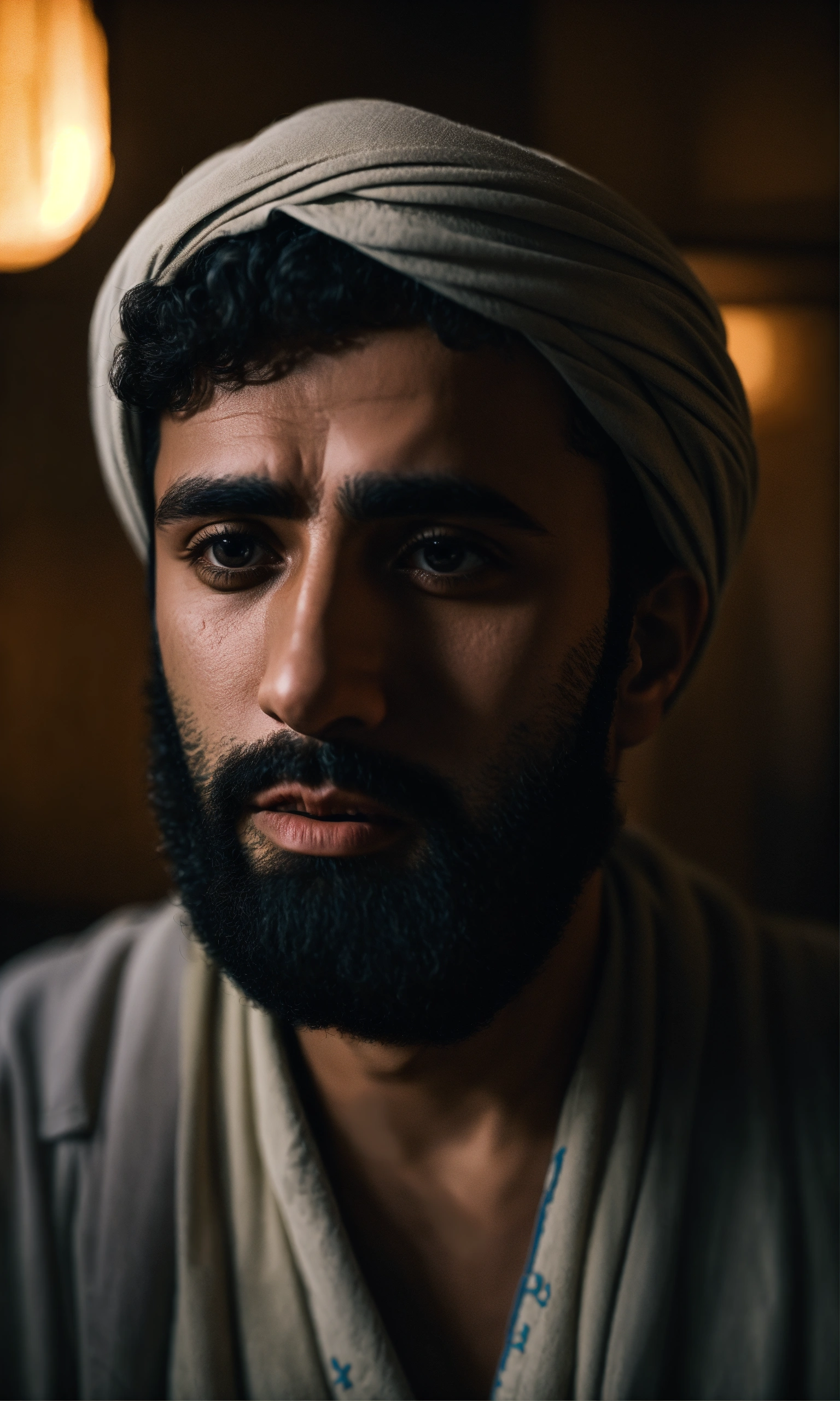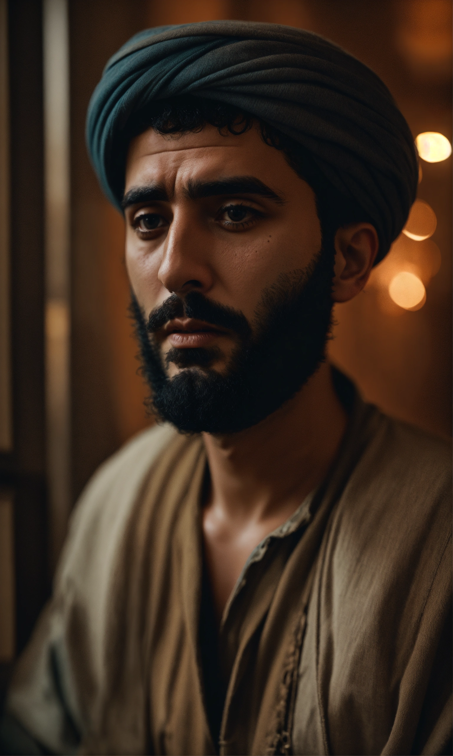 Middle eastern sad man, surreal photo, fujifilm xt3, indoor, good lighting, raw photo, 8k uhd, film grain, unreal engine 5, ray trace