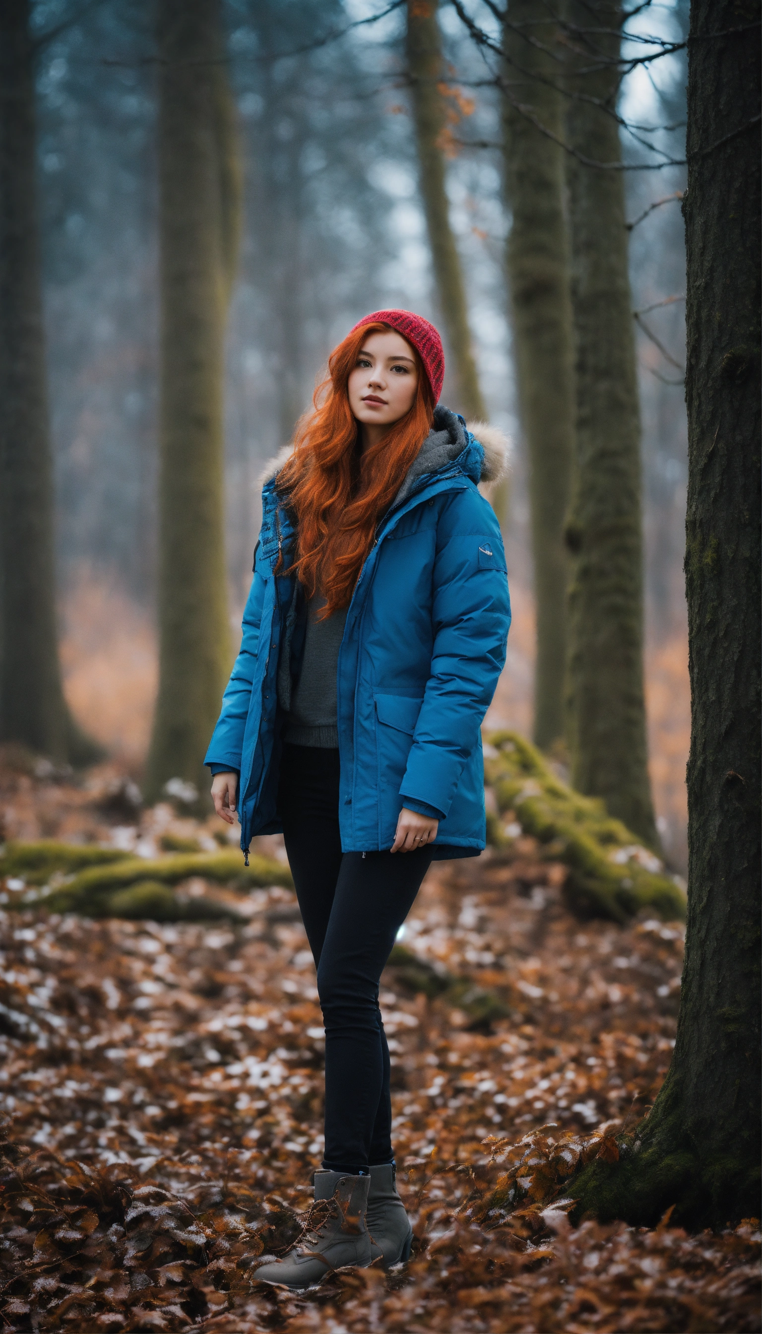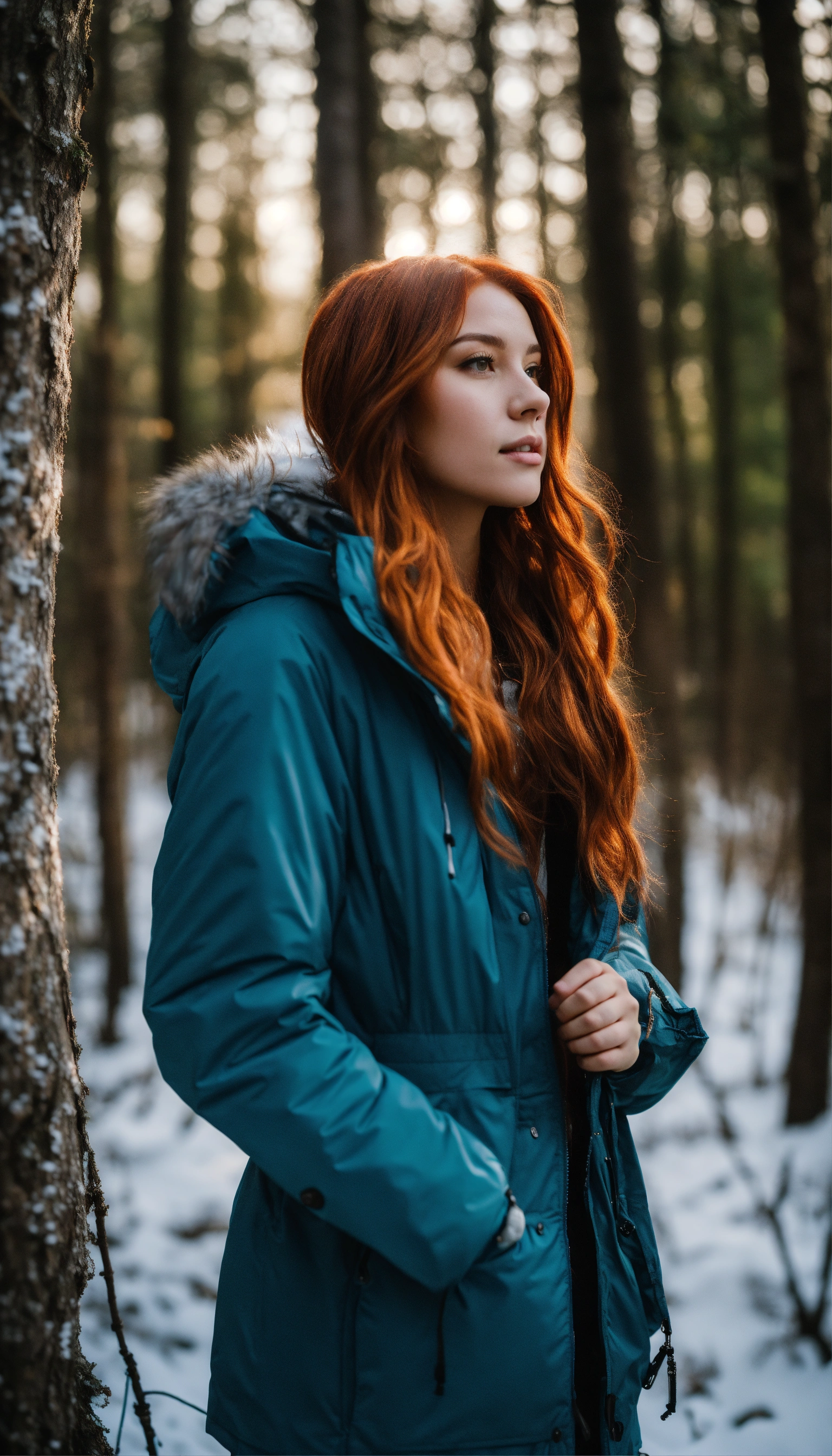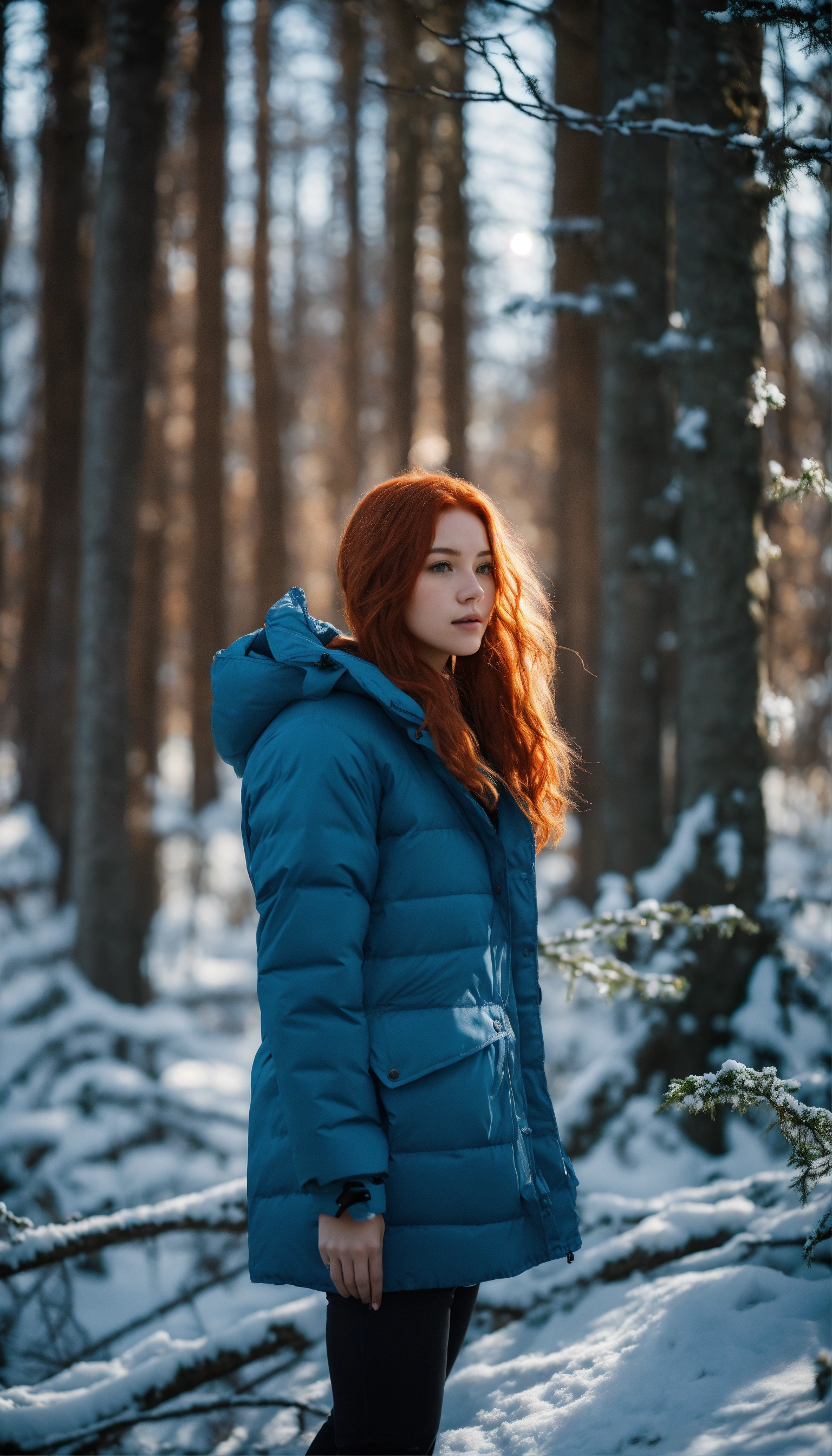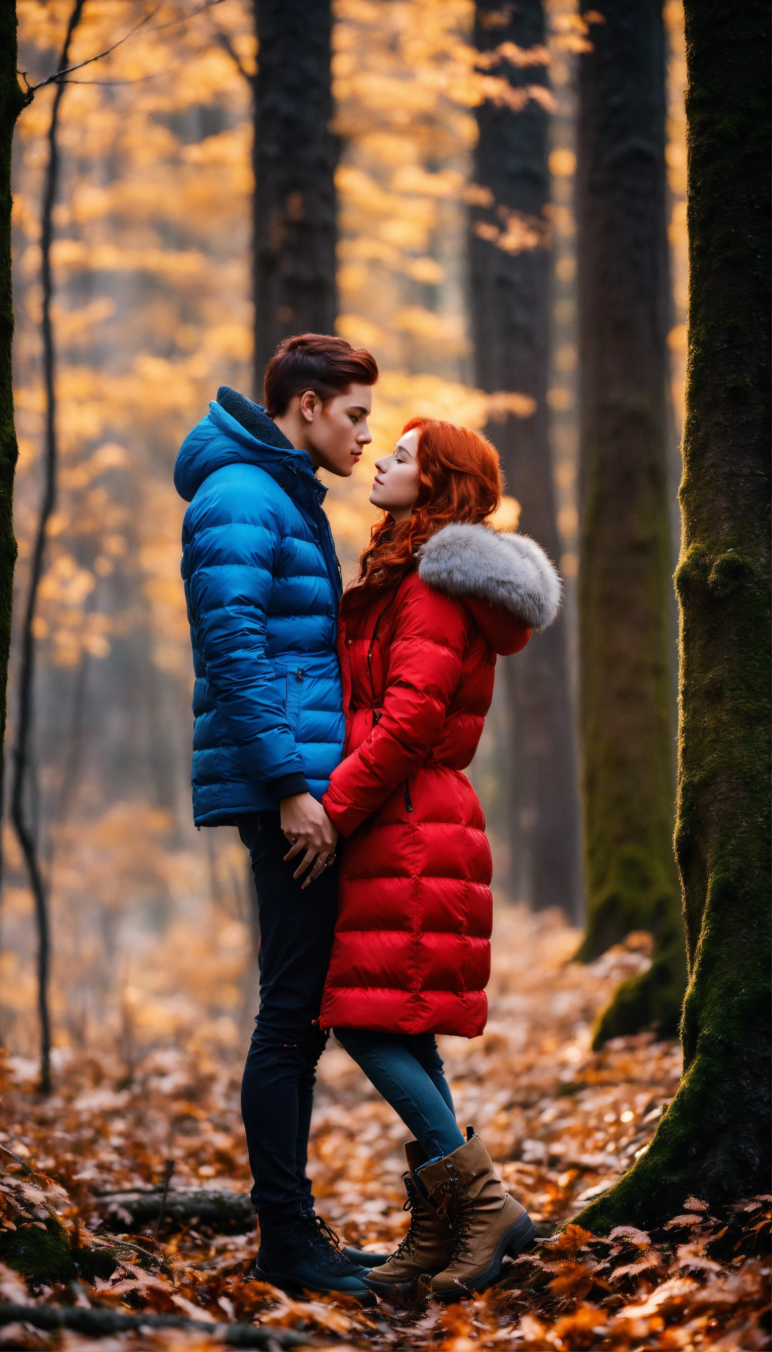 A couple in love in the forest. a guy and a girl. they stand facing each other and kiss. he is very handsome with masculine features. he's wearing a blue down jacket, she's wearing a white parka. she is a beautiful girl with red hair and gray eyes. her shoulder-length hair is wavy. capricious lighting, best quality, full-length portrait, real image, complex details, depth of field. she is standing in the forest, blizzard, bright day, beautiful lighting, raw photography, 8k, film grain, unreal