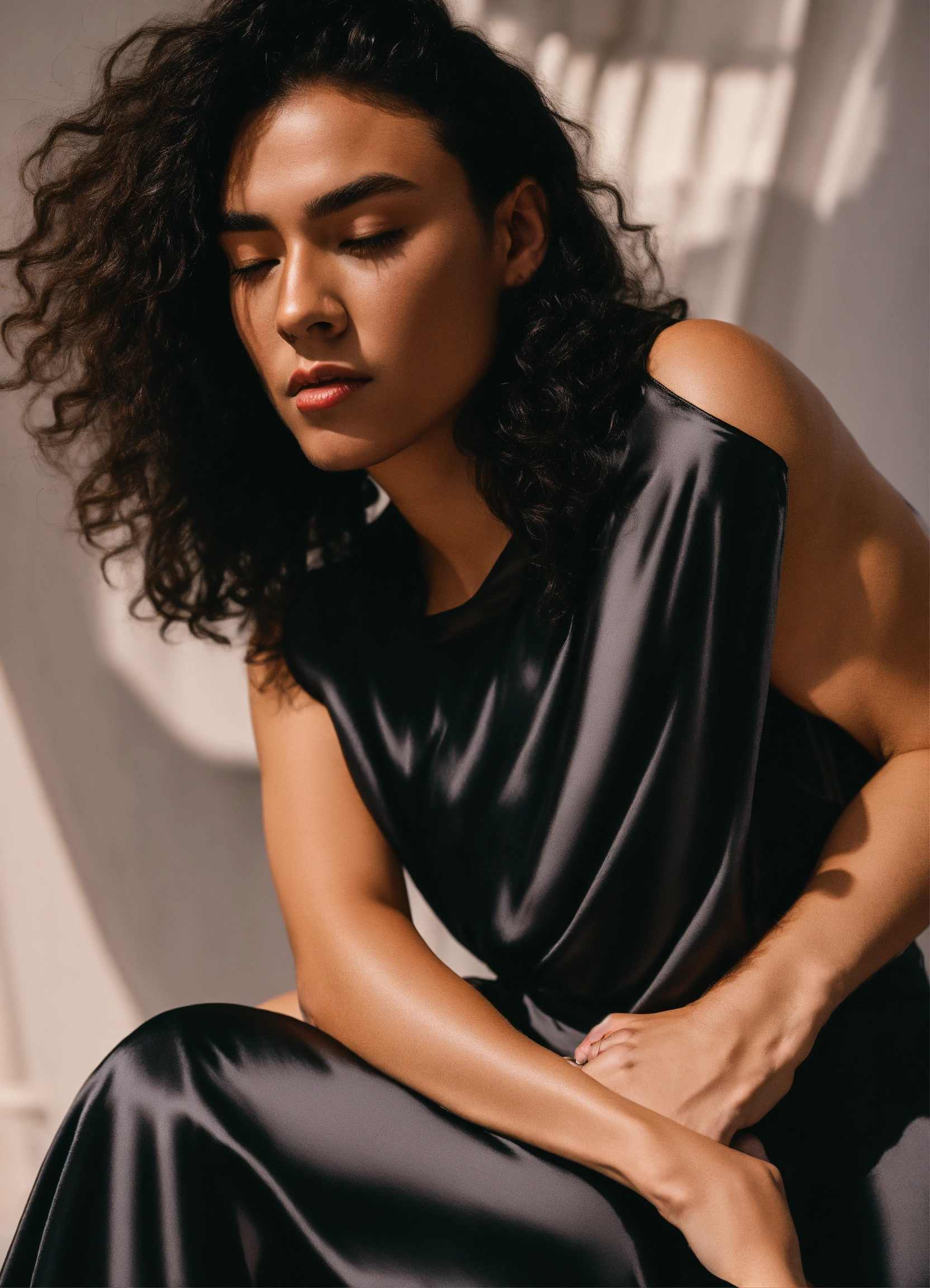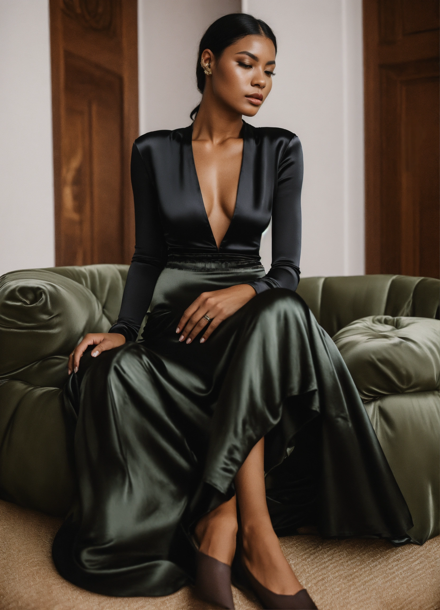 Man sat on throne with godlike body wearing black satin shiny figure-hugging clingy pencil maxi skirt, pulled tight. close up. bul ge