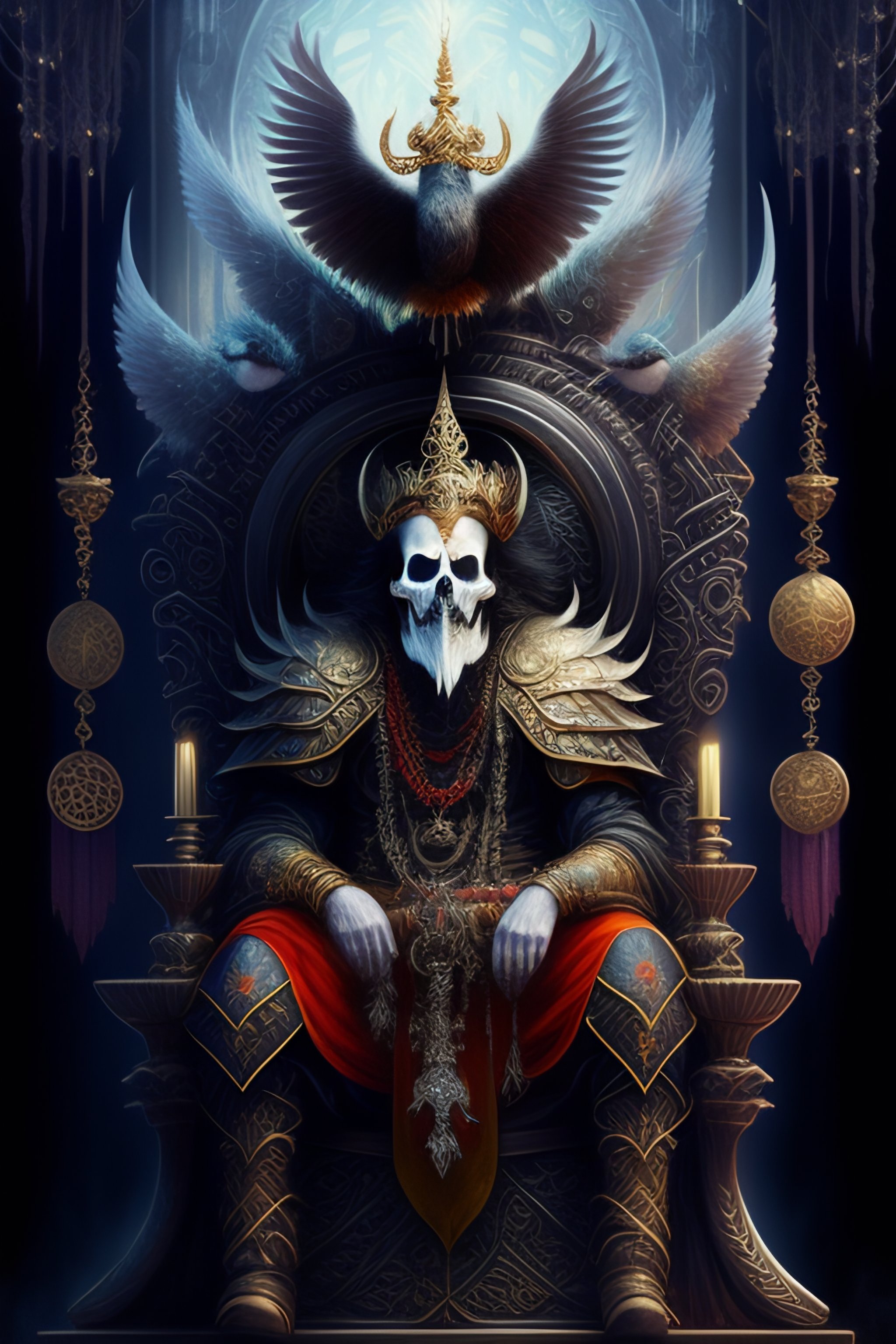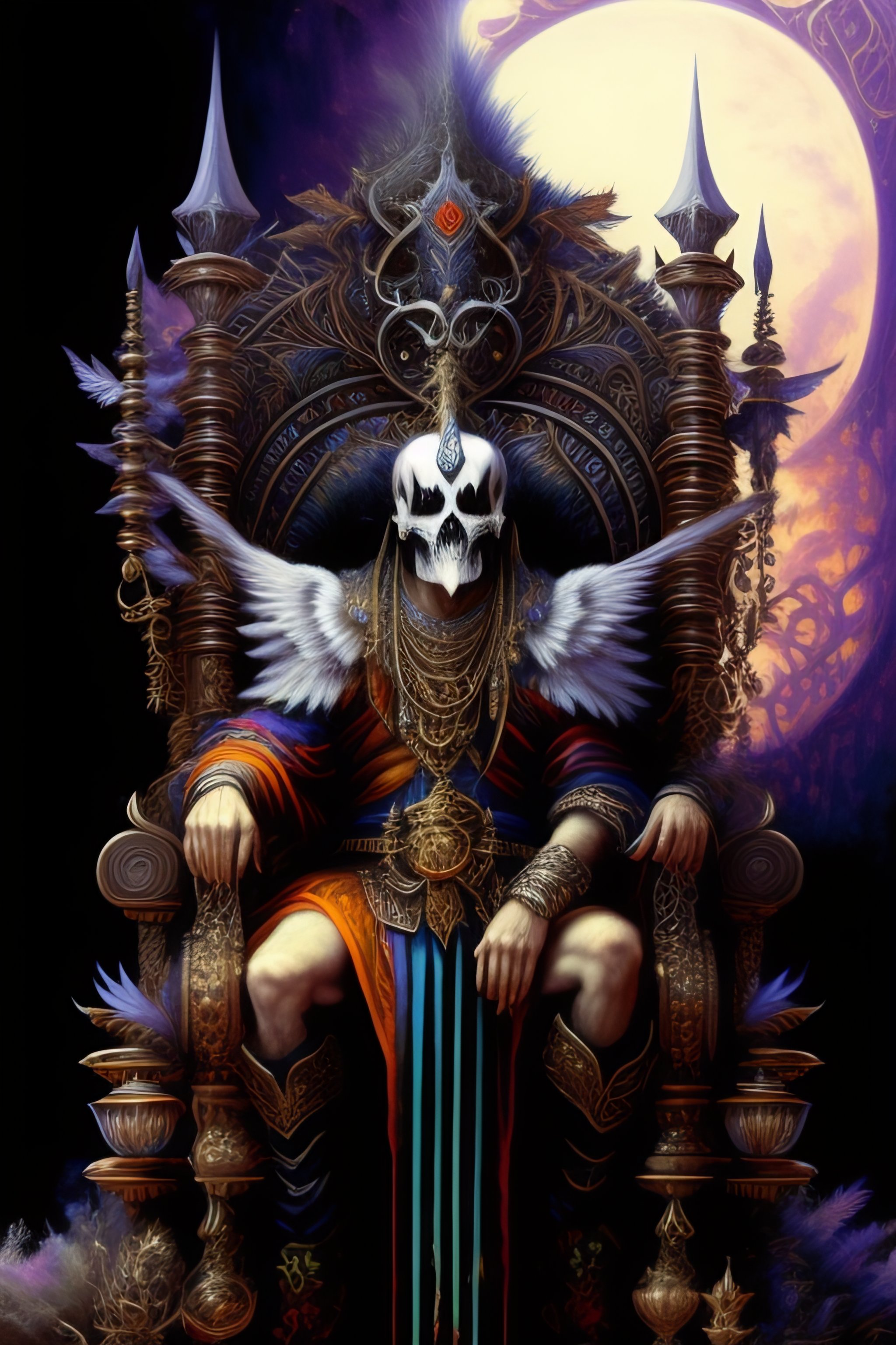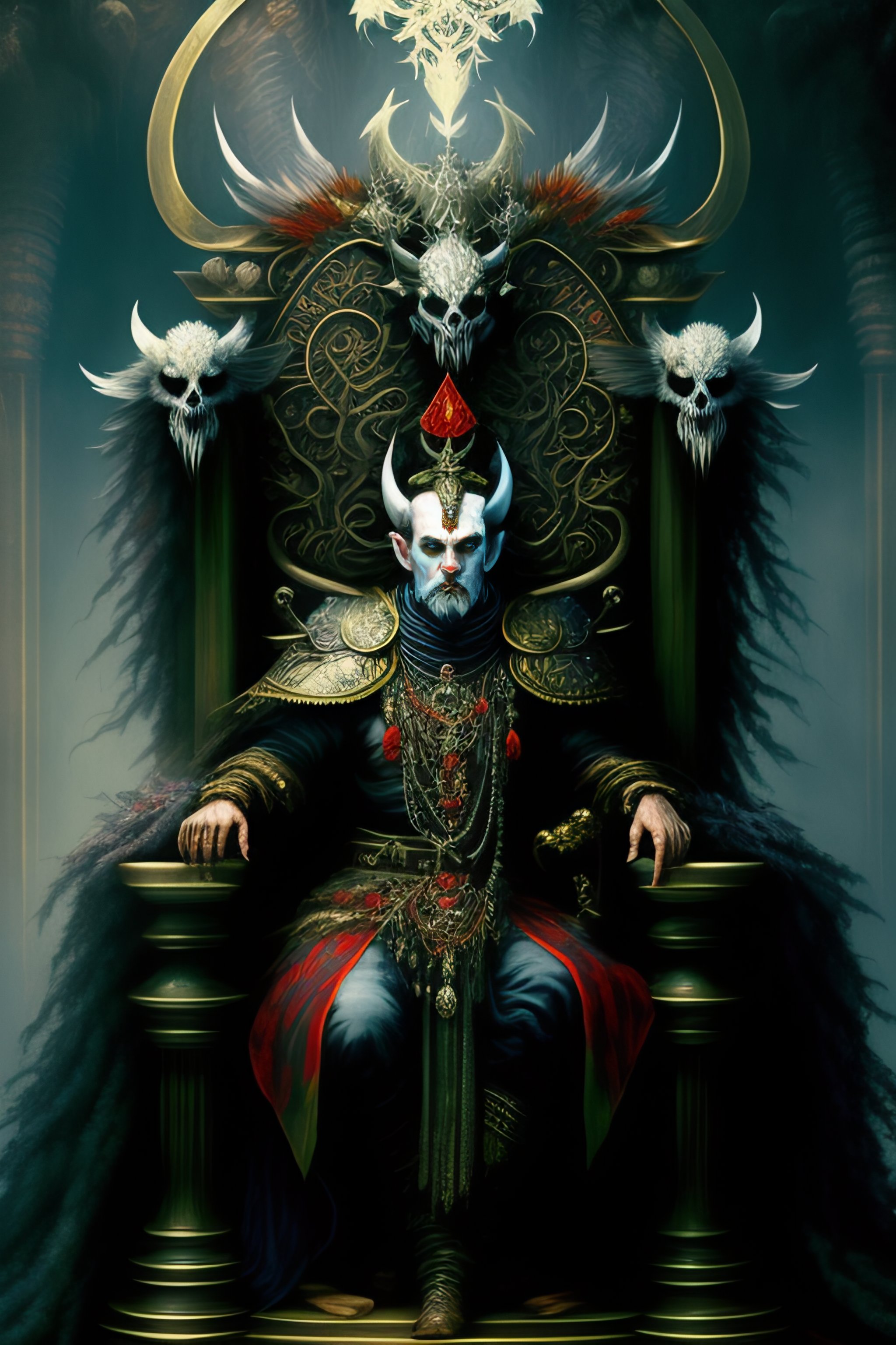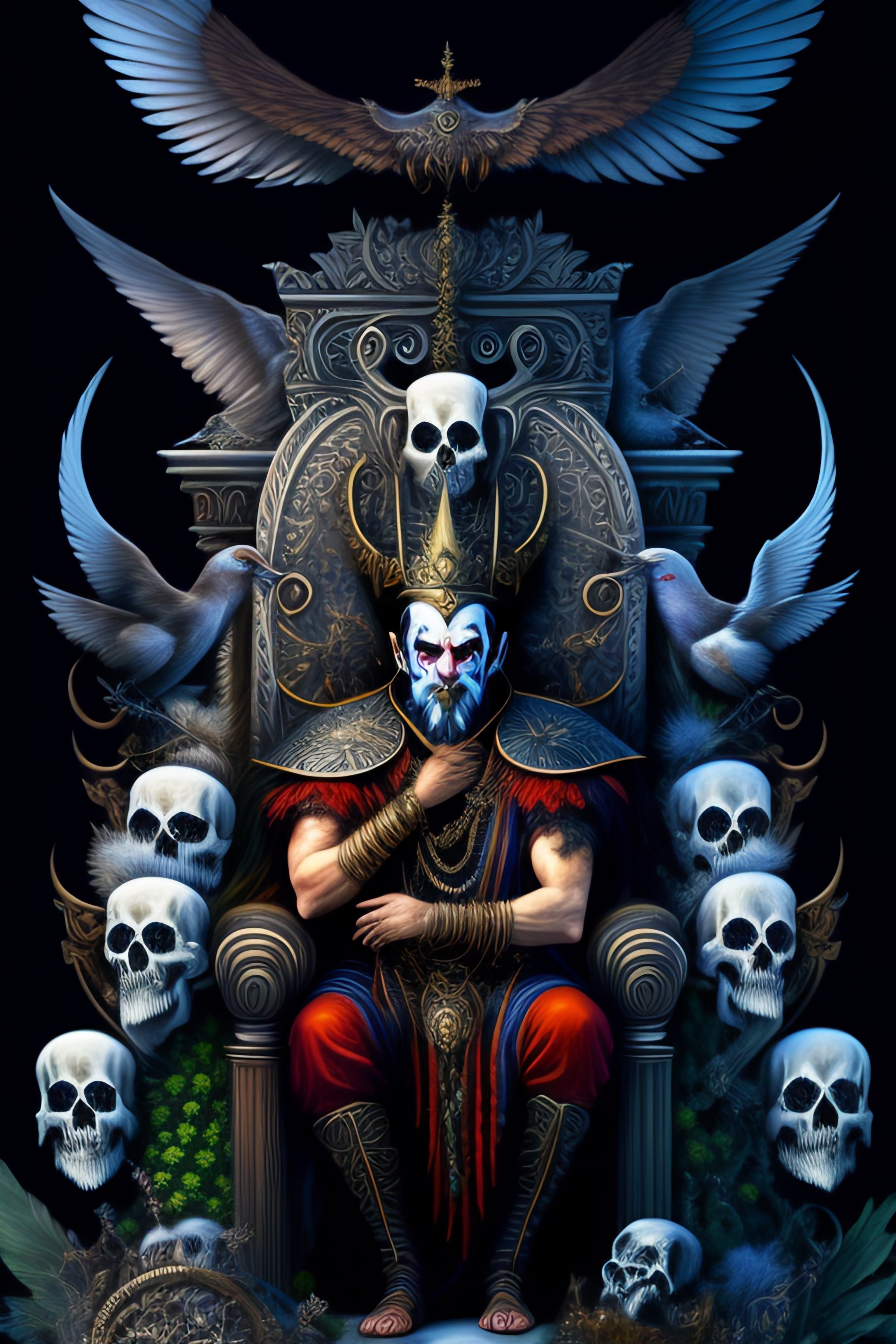 An old ugly grim jester with birds on his head, sitting on a throne of skulls and bones in a mystic forrest, computer graphics by h. r. giger, louis royo, cgsociety, fantasy art, cosmic horror, biomorphic, lovecraftian