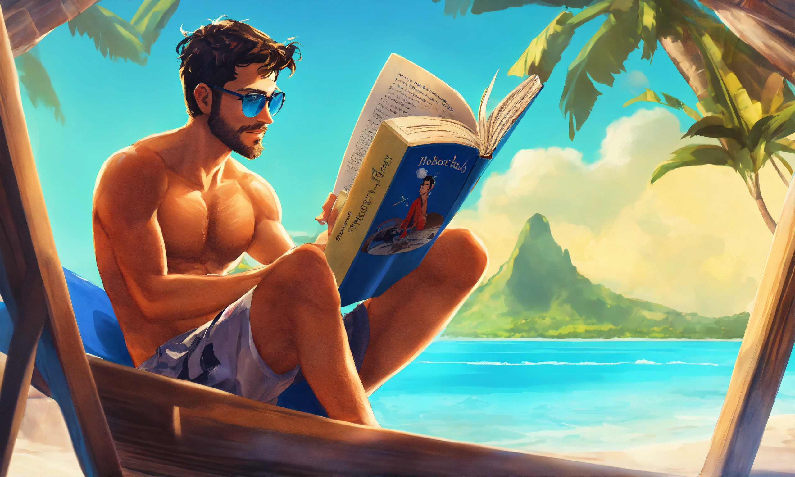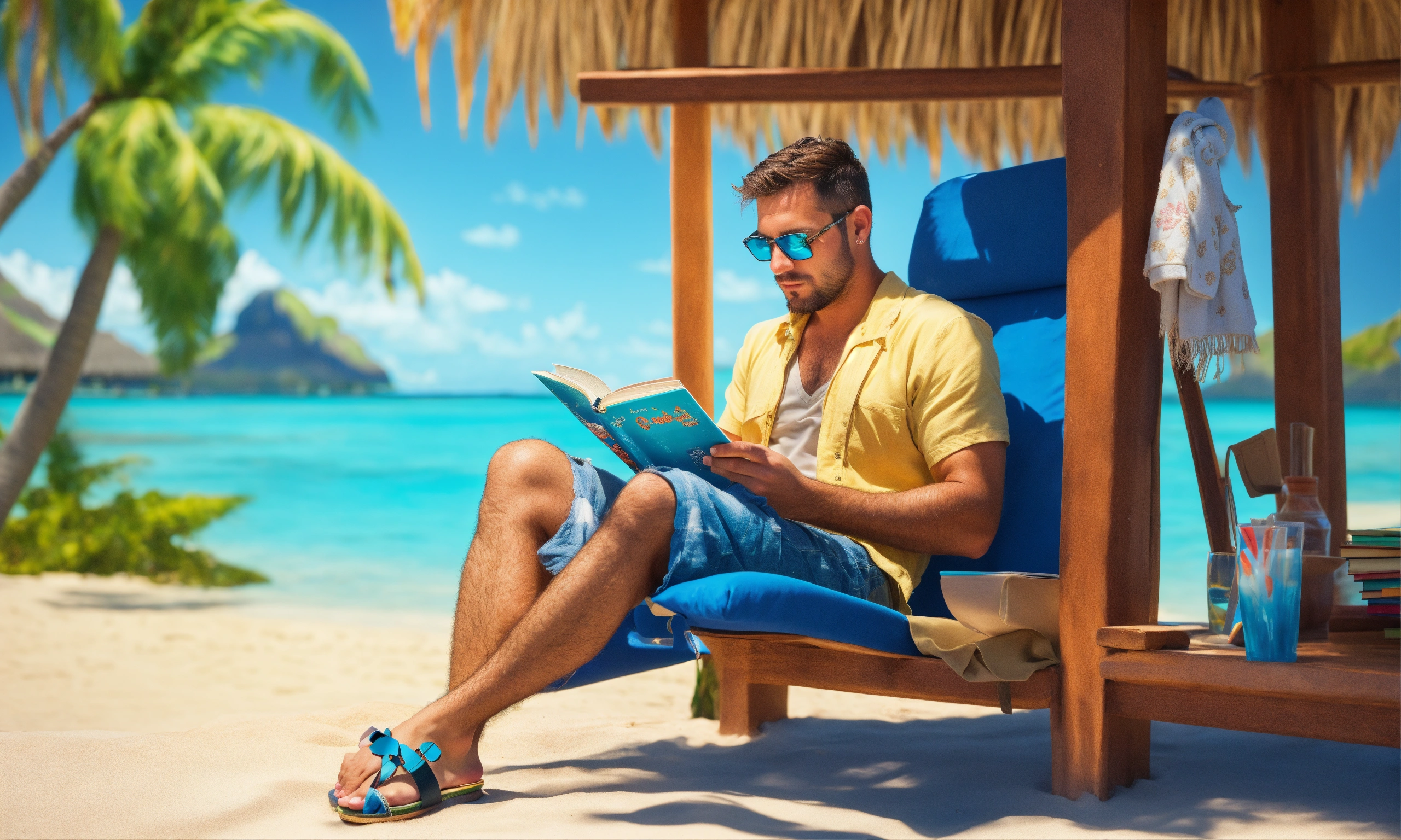 A man with stubble reading a book in bora bora wearing a flip flops in the style of a cartoon with a blue hue