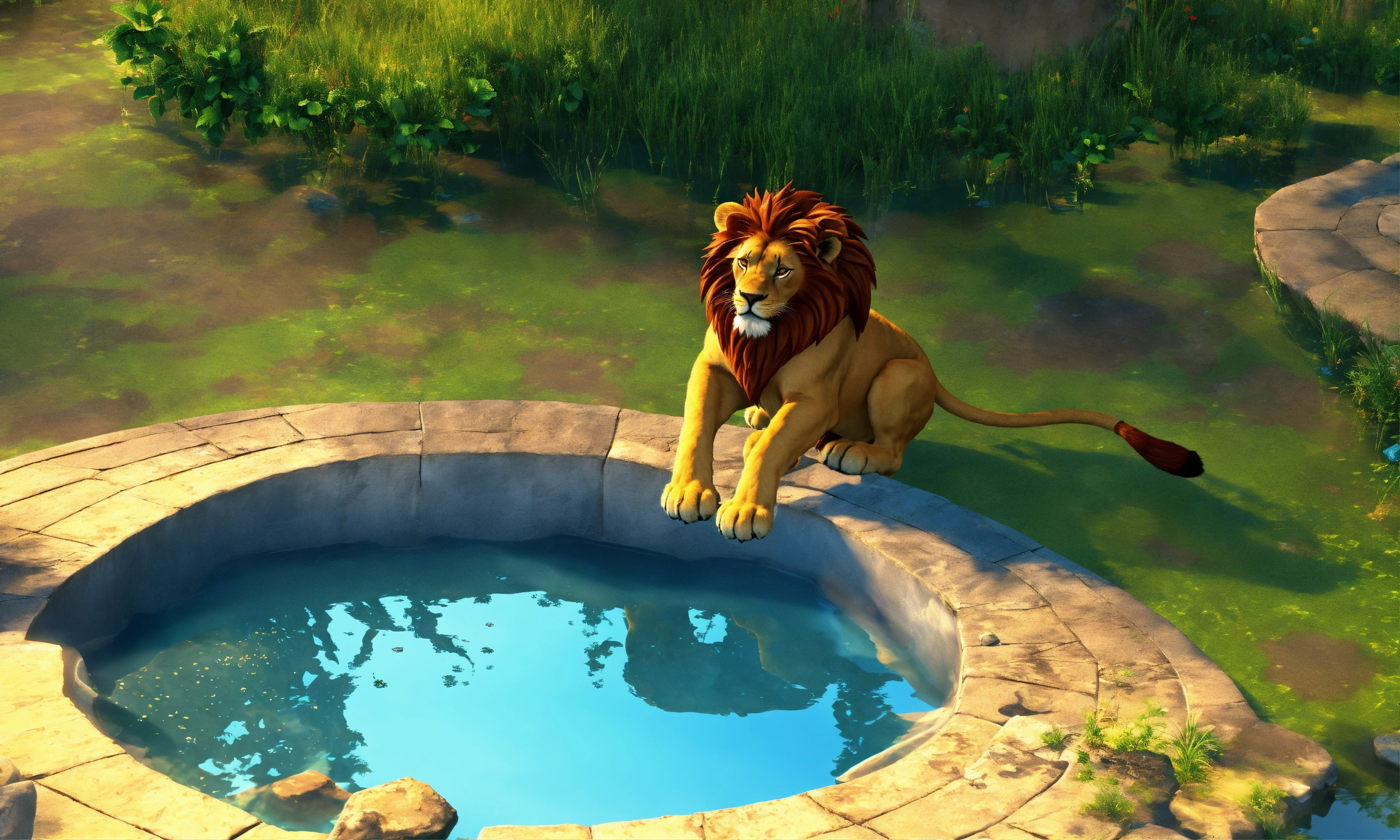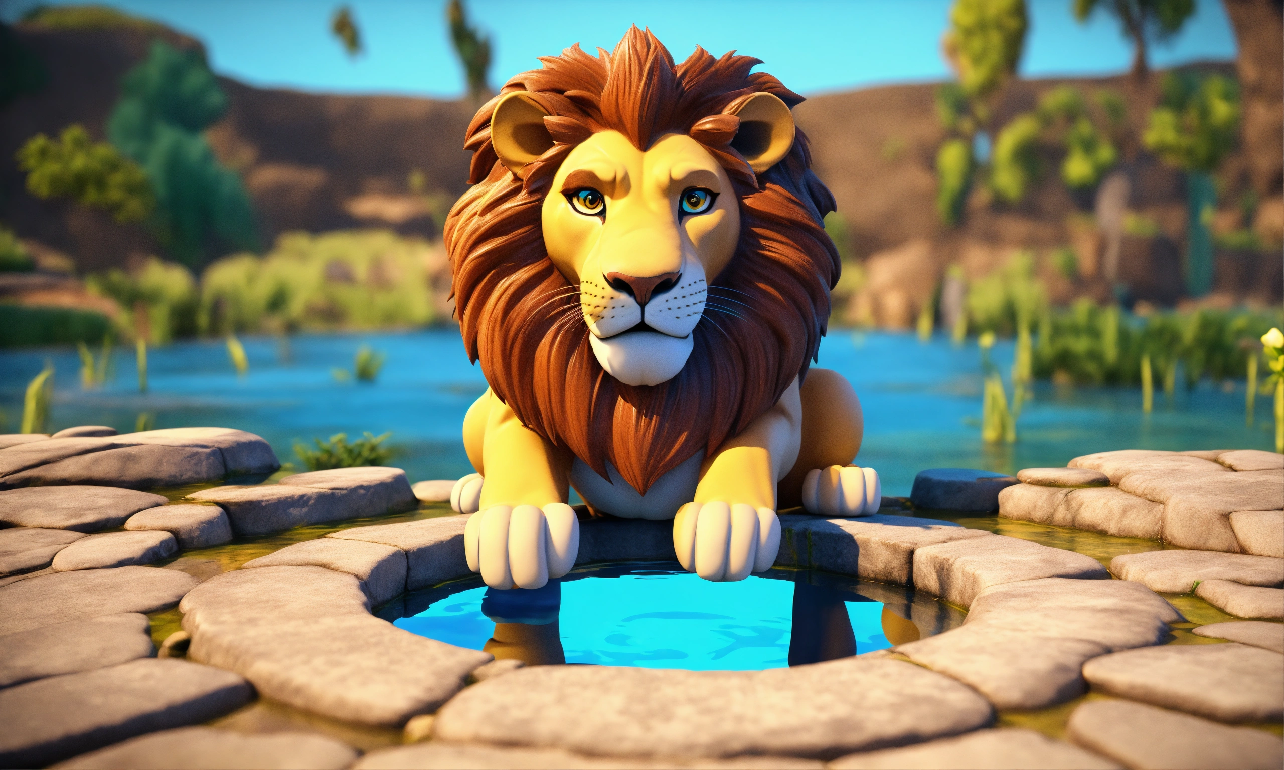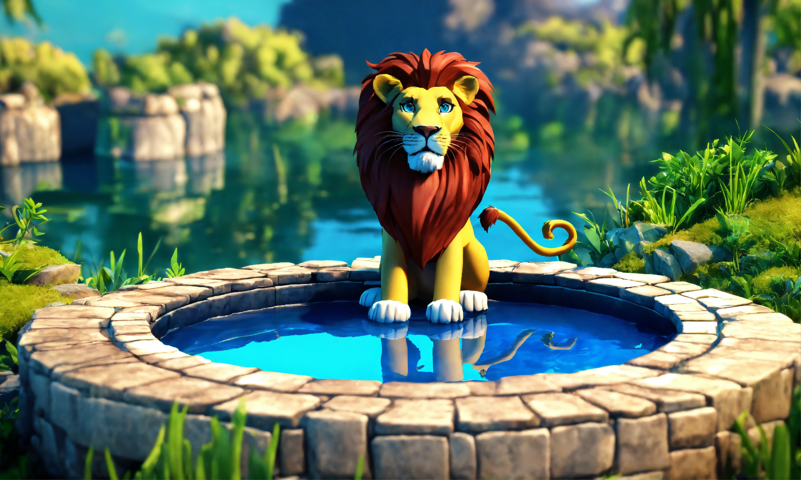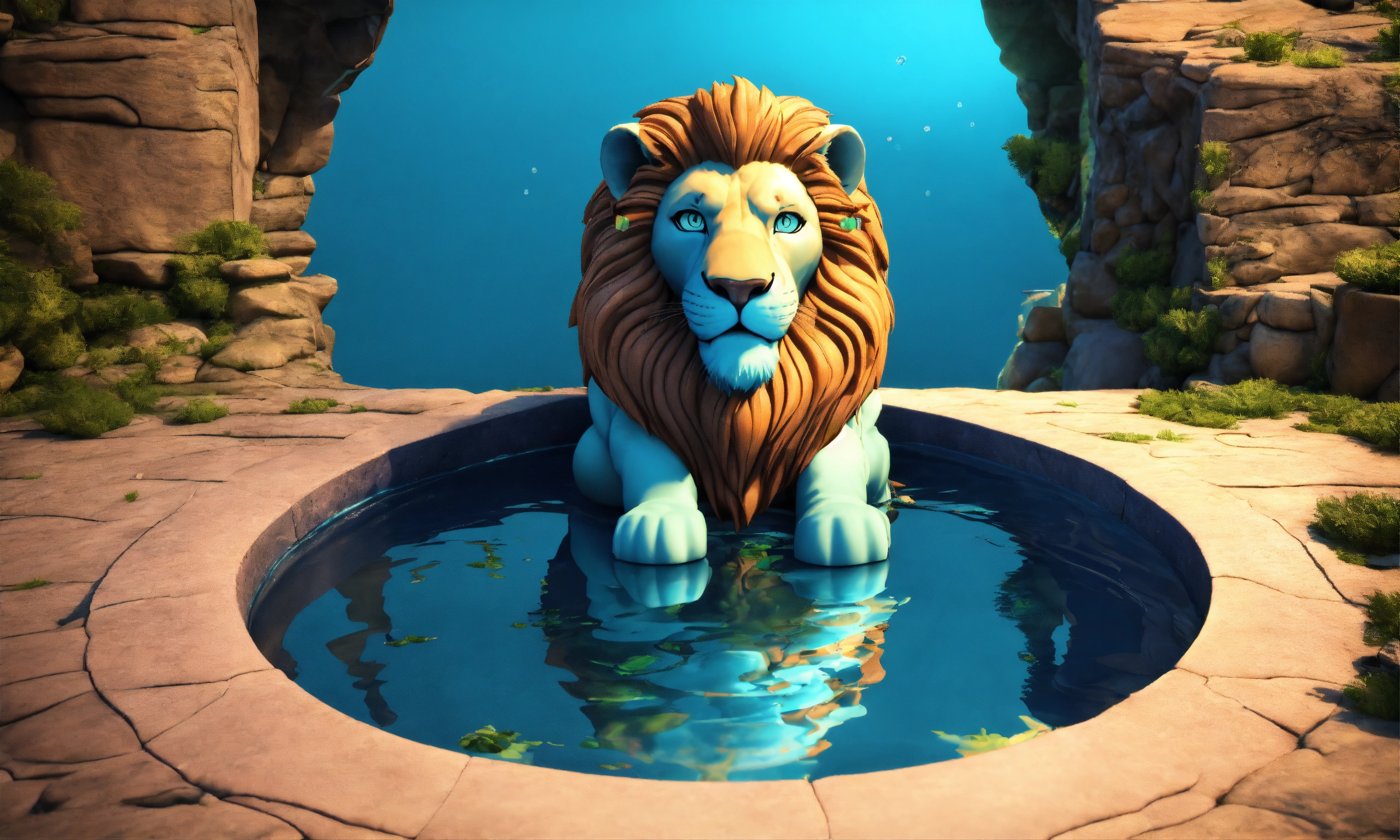 3d animation style cartoon blue water well lion seating at edge look down into well and see his reflection in blue water