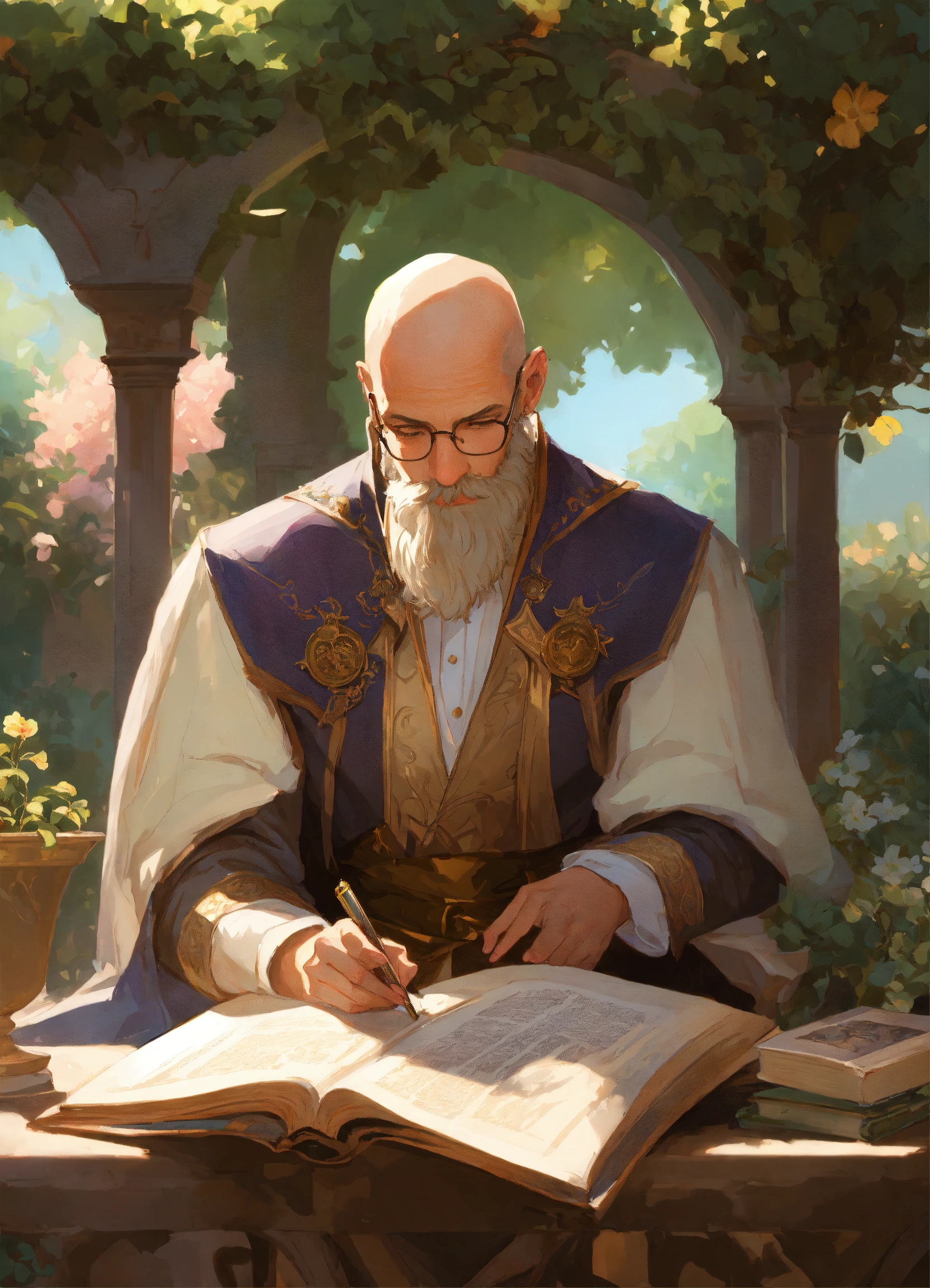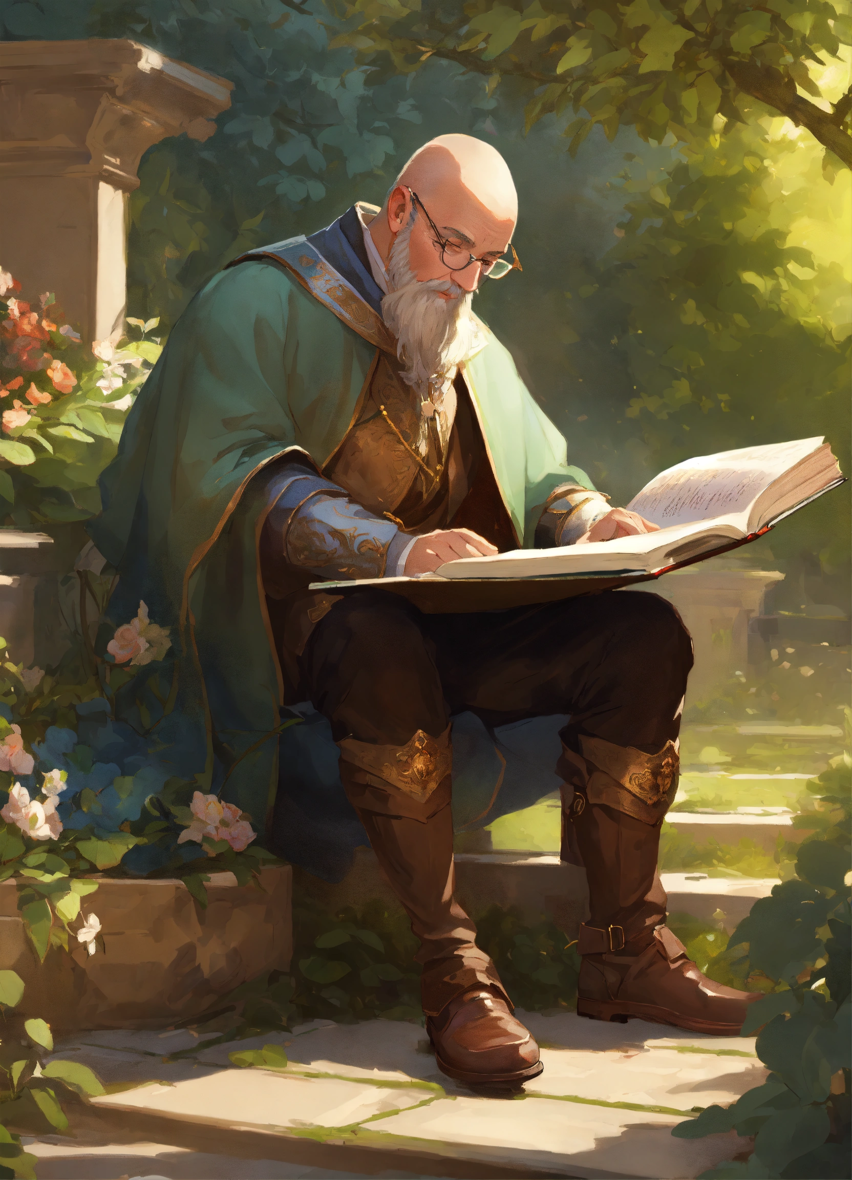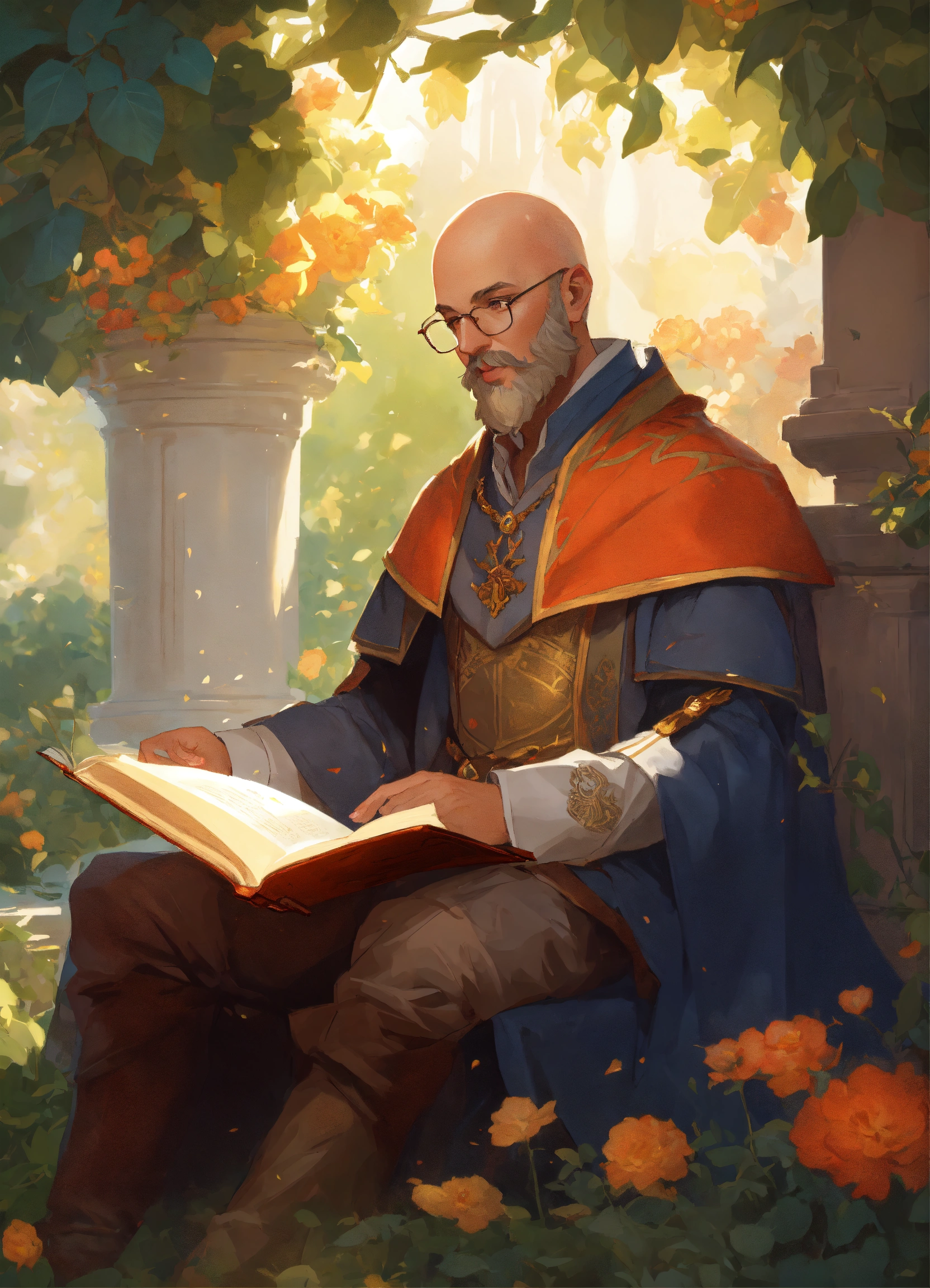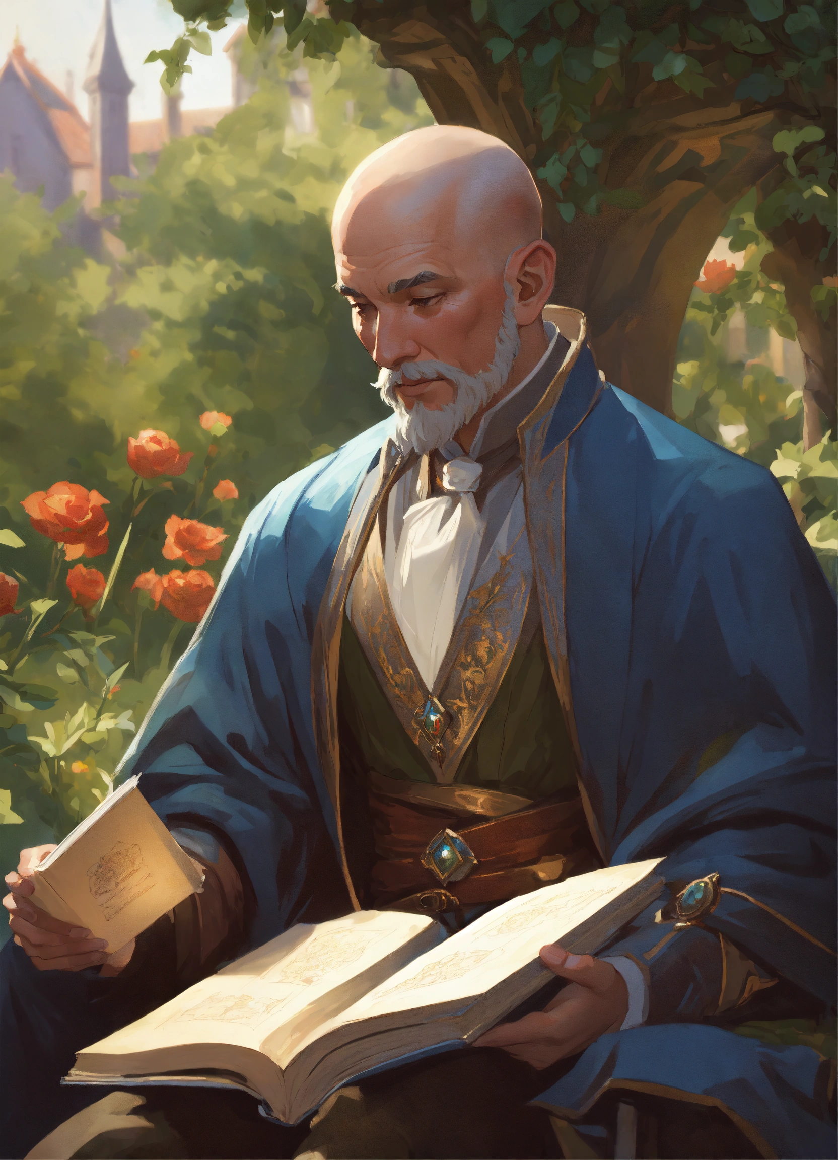 Male noble chancellor bald medieval reading books in a garden, art by artgerm and greg rutkowski and alphonse mucha and loish and wlop, artstation, illustration