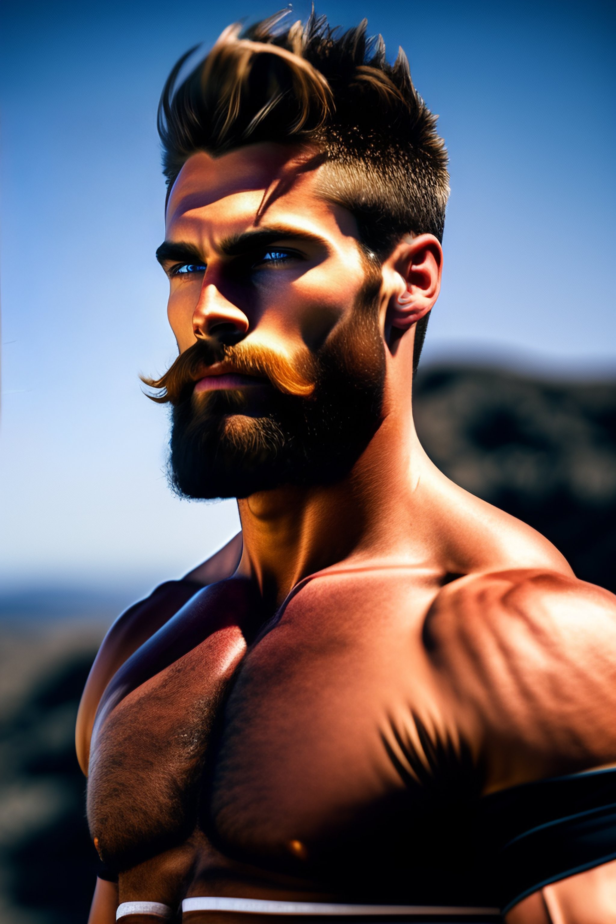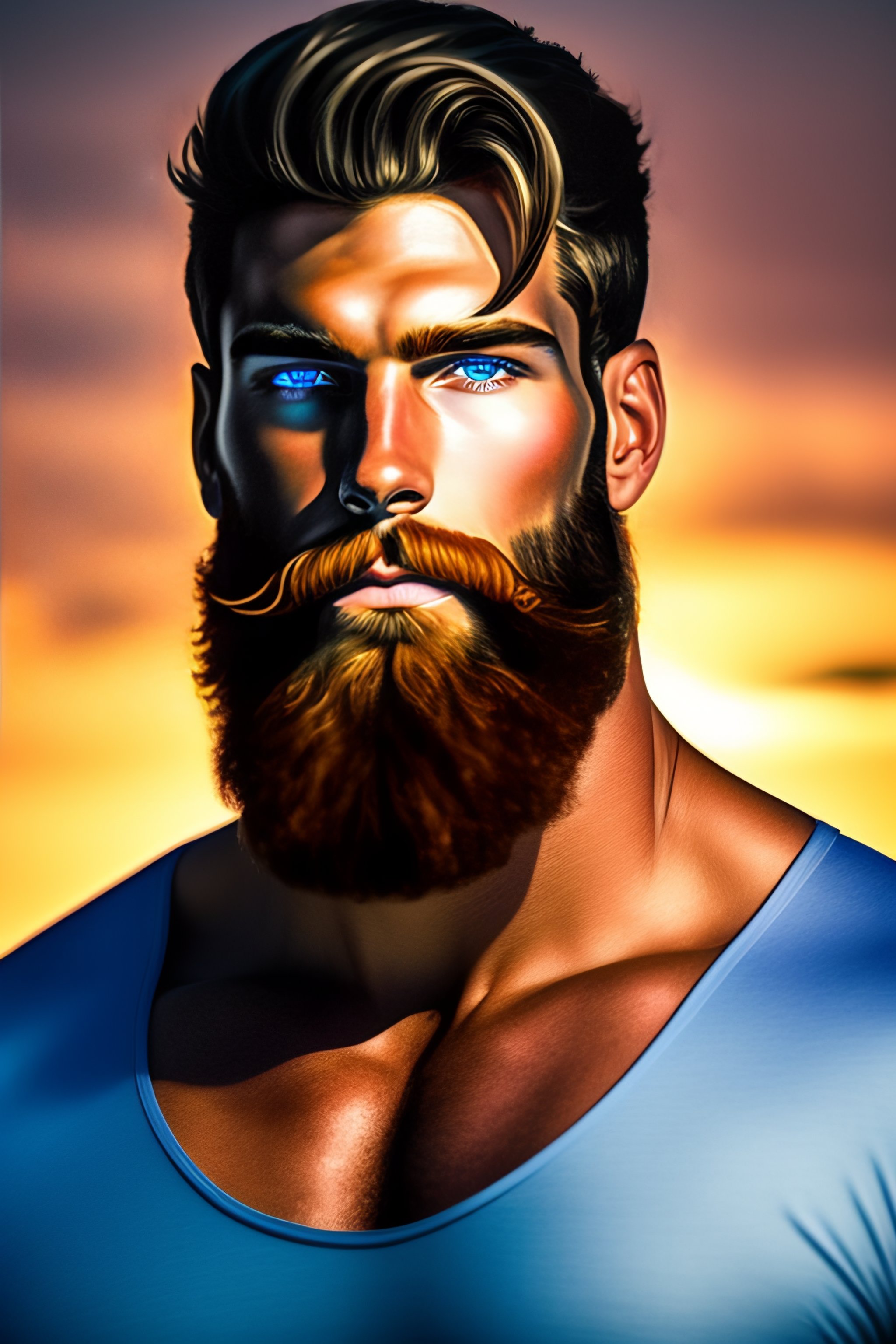 Tall and muscular man, standing at about 6'1" with broad shoulders and a sturdy build. he has a thick beard and piercing blue eyes that seem to see right through you. his skin is tanned and weathered from years of working outdoors, and there are a few faint scars scattered across his arms and face, testament to his rugged and adventurous nature.