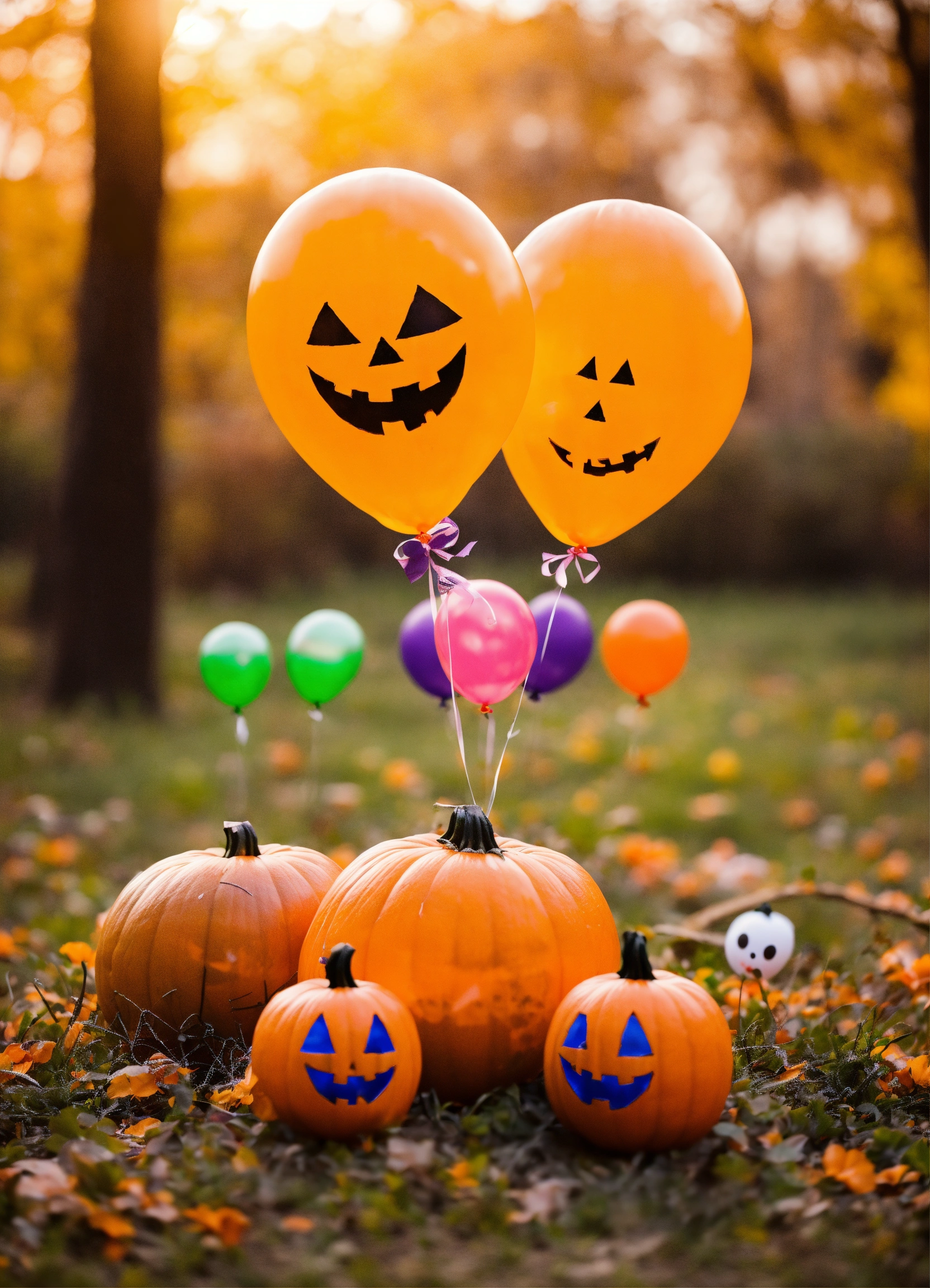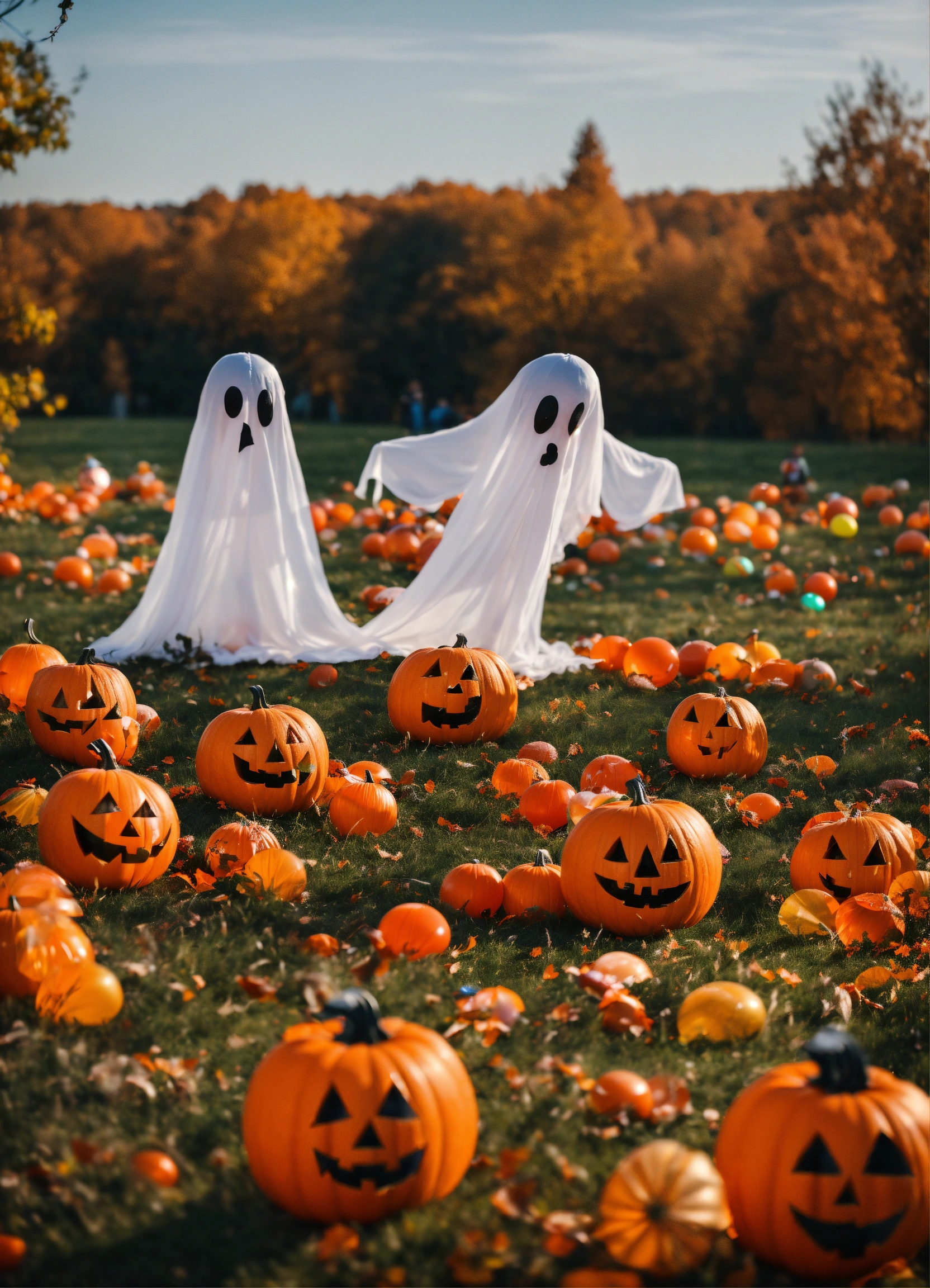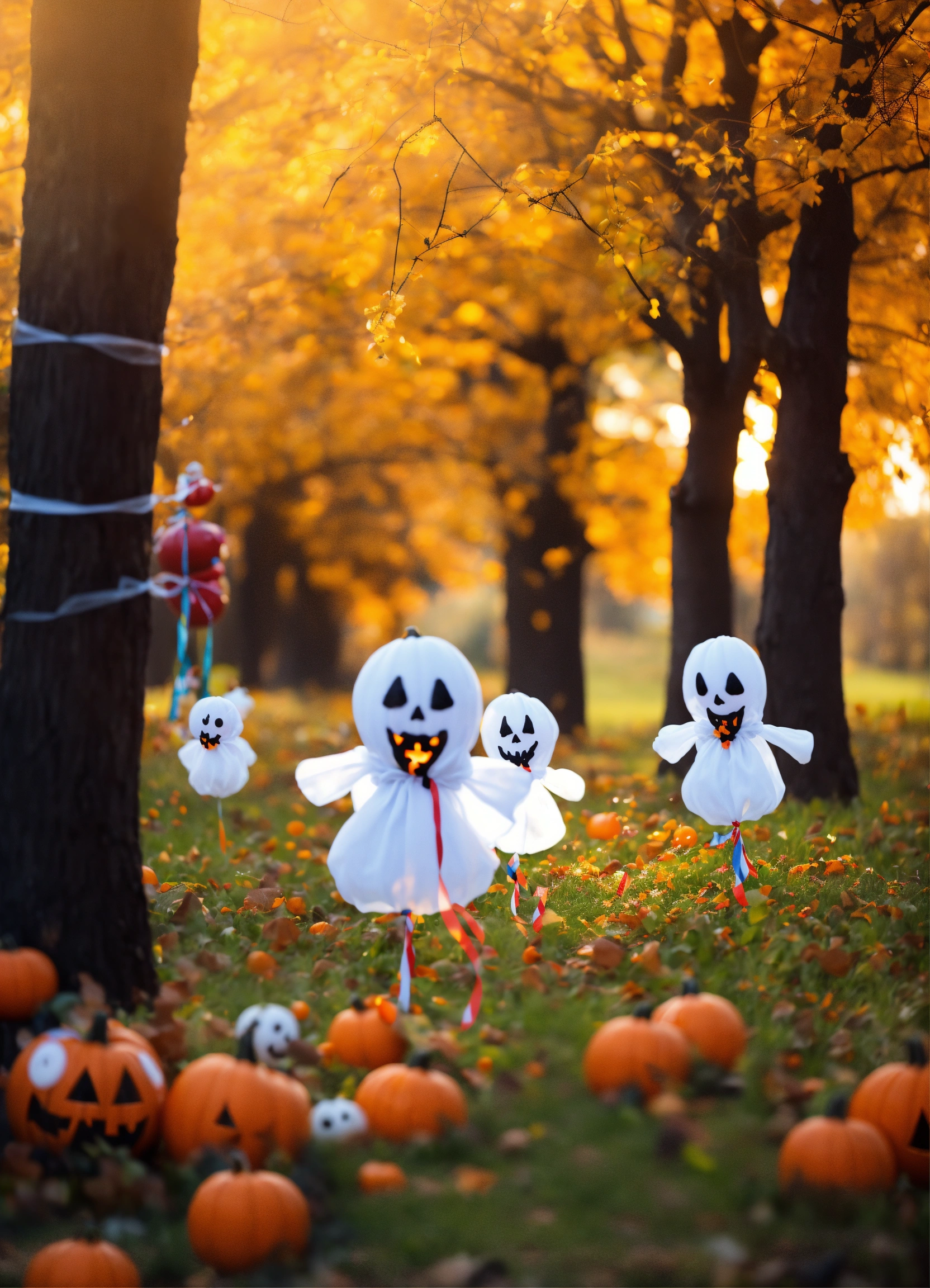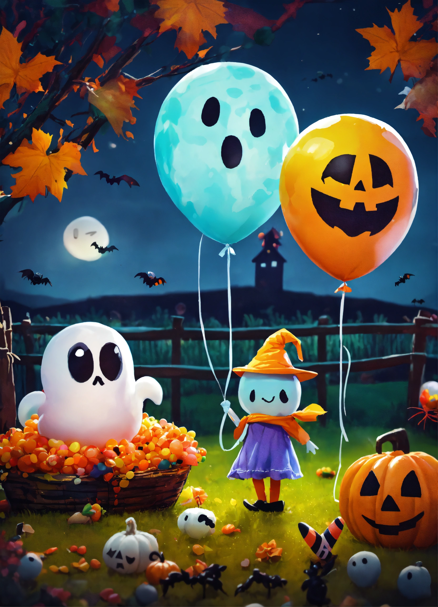 A funny and cute hallowen recargated decoration for kids, in a field cute ghosts, candys, ballons, spider webs, photo 4k