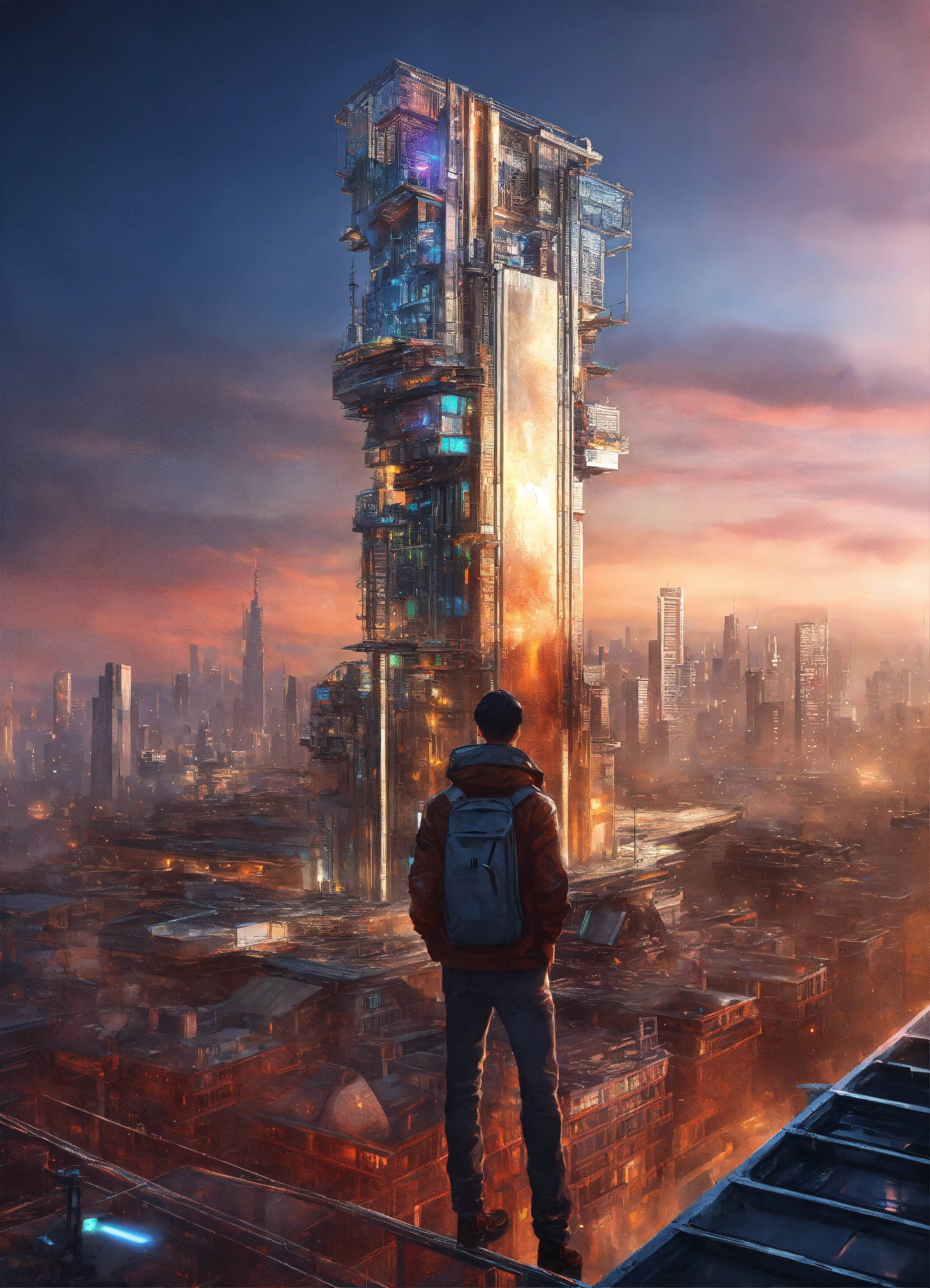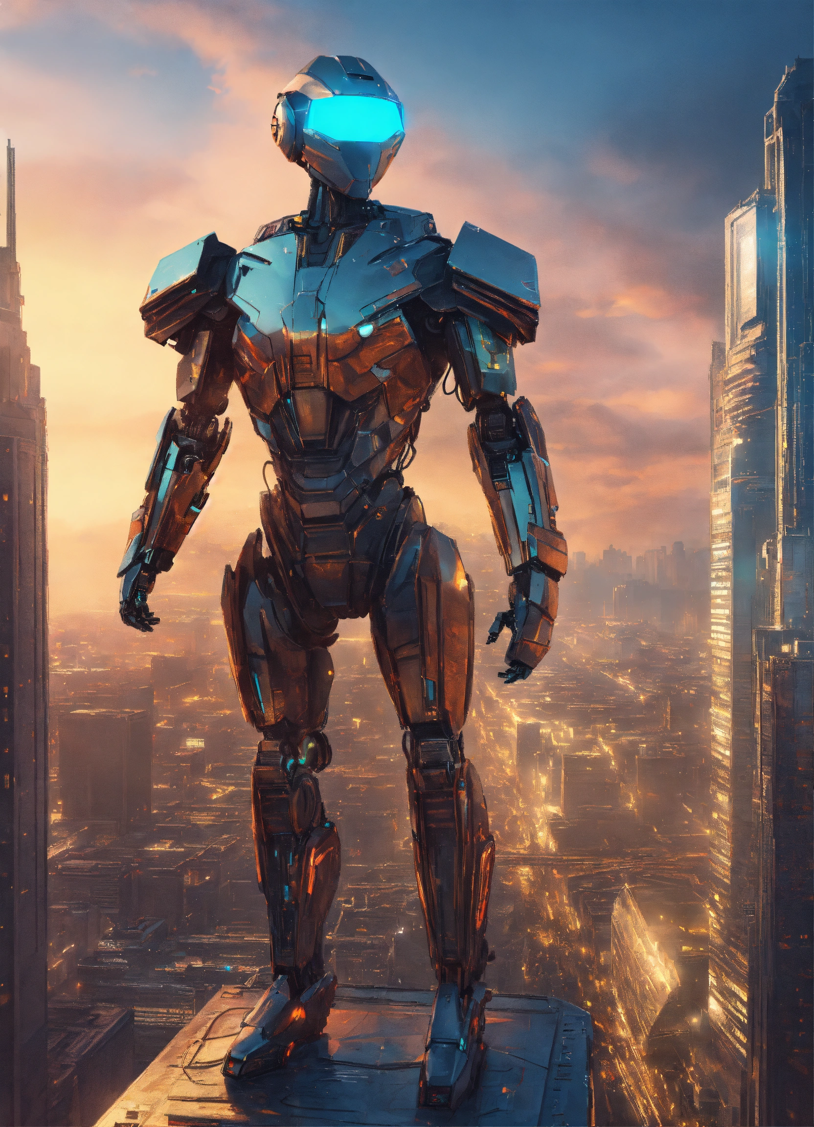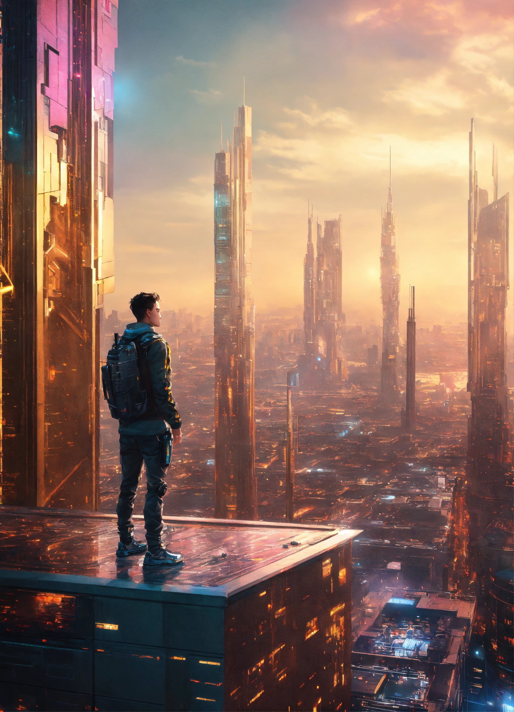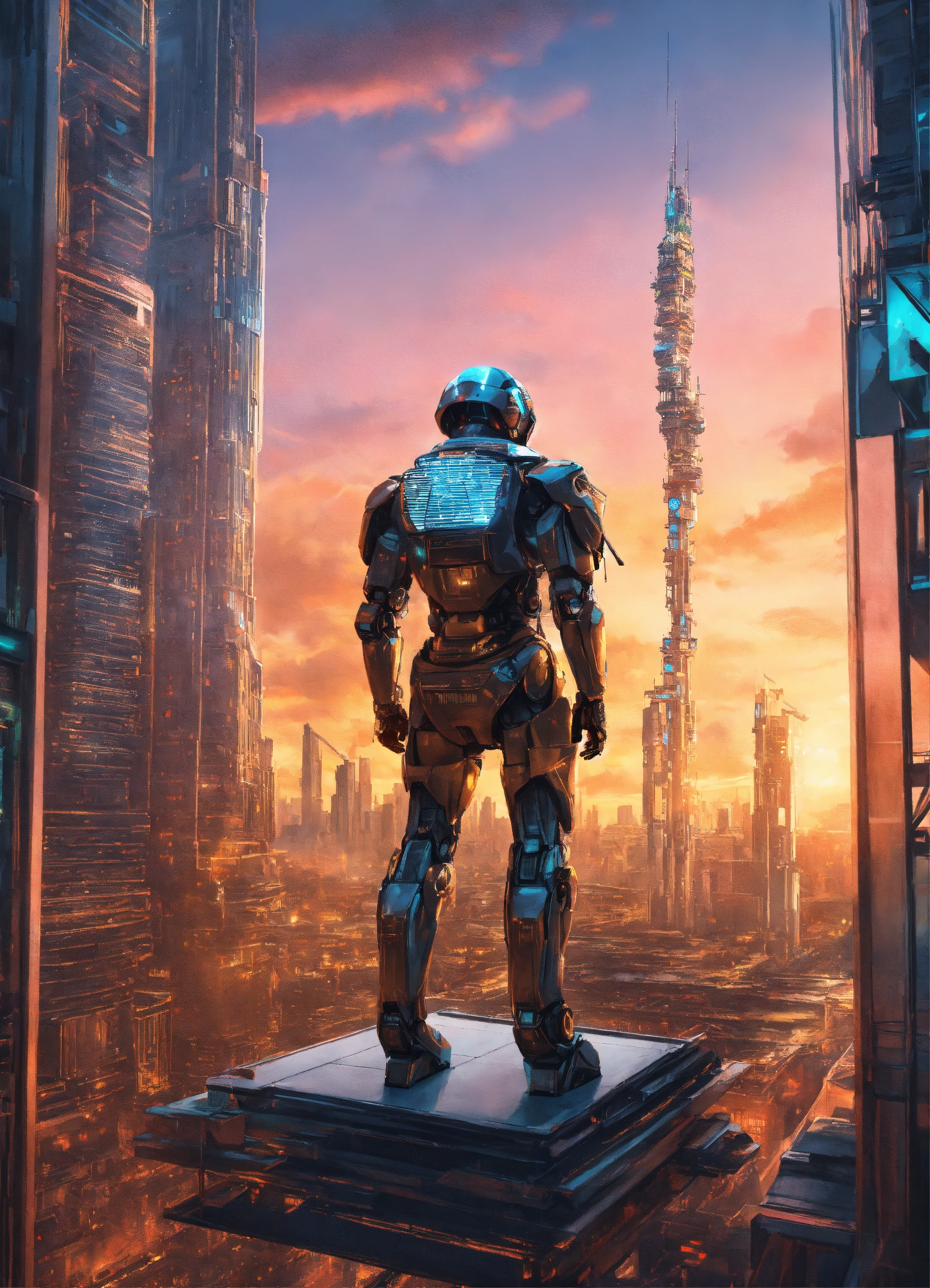 Person standing on top of a building in a futuristic city that it's slowly turning into metallic constructions, ruled by robots, edgy art, highly detailed, 8k, hyper realistic, metallic colors, light on his/her face