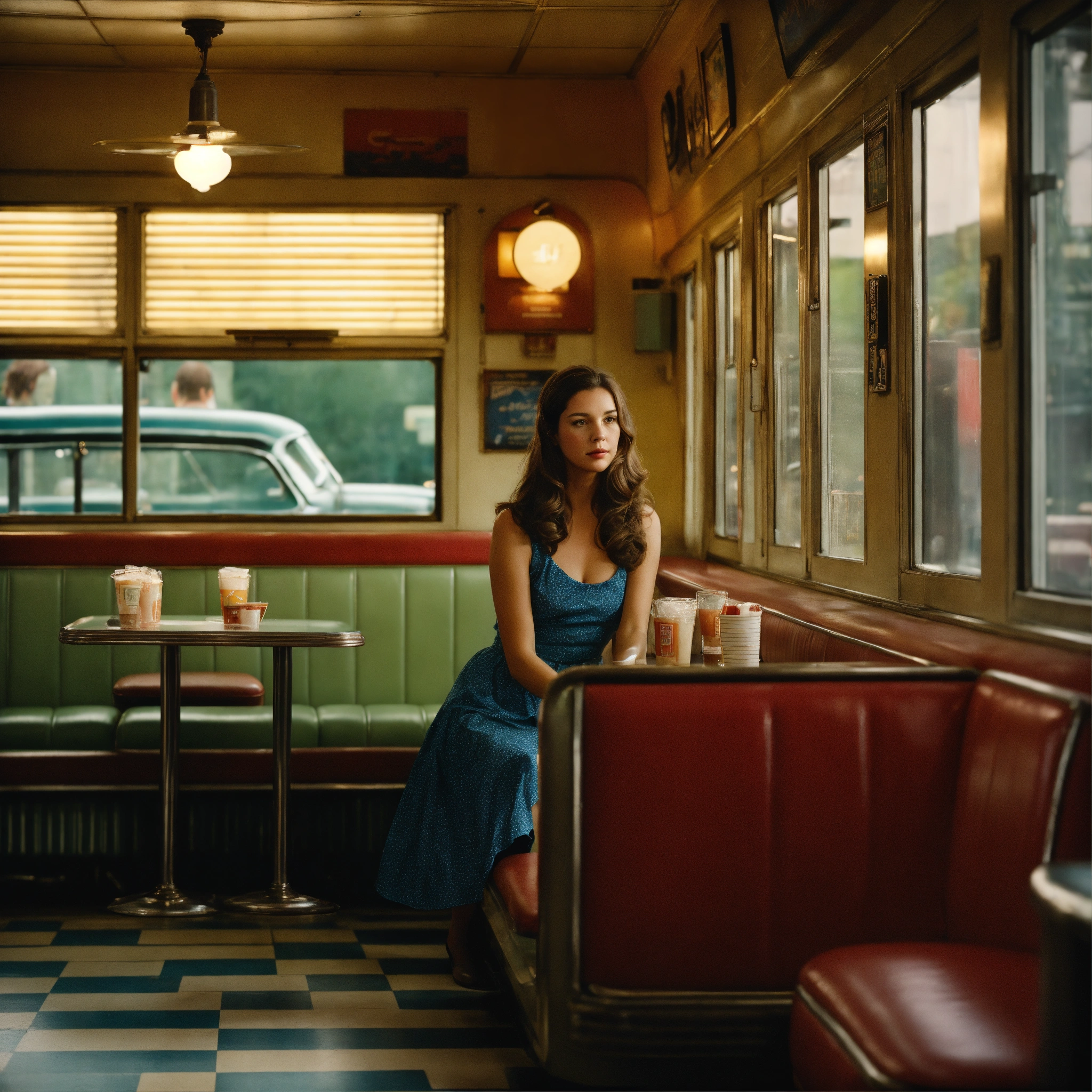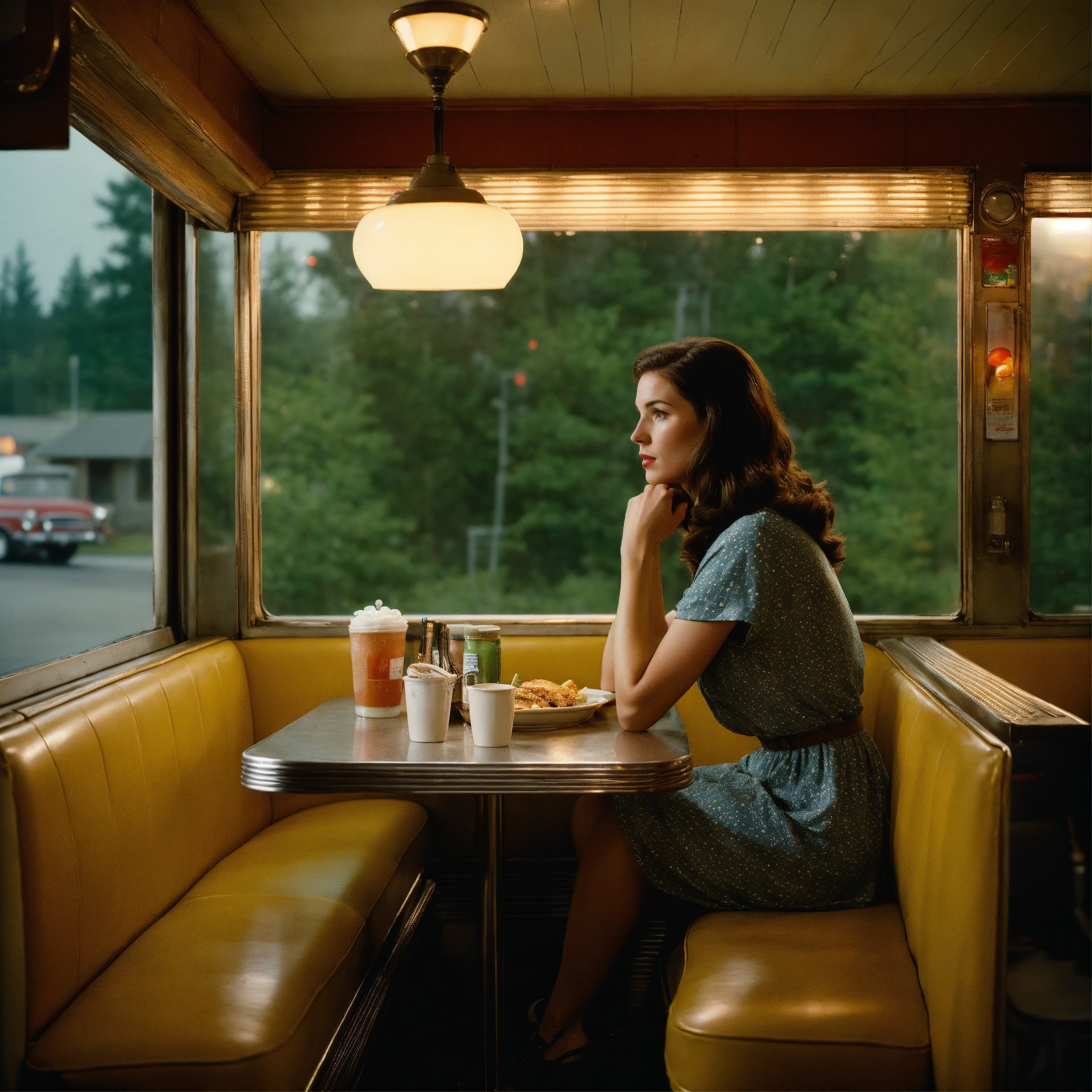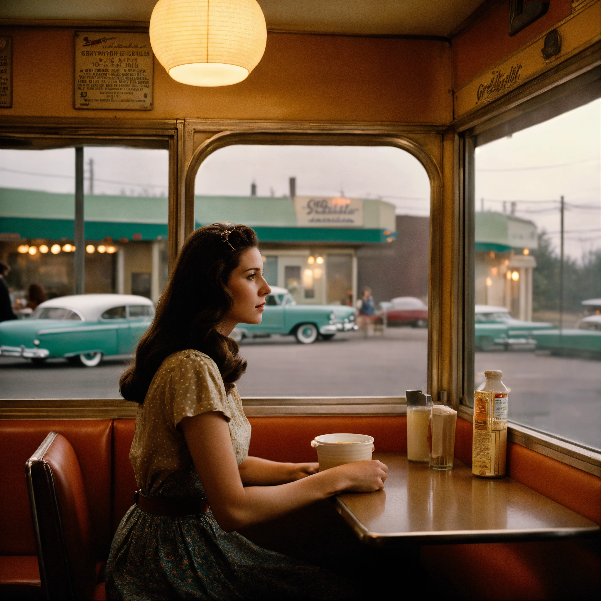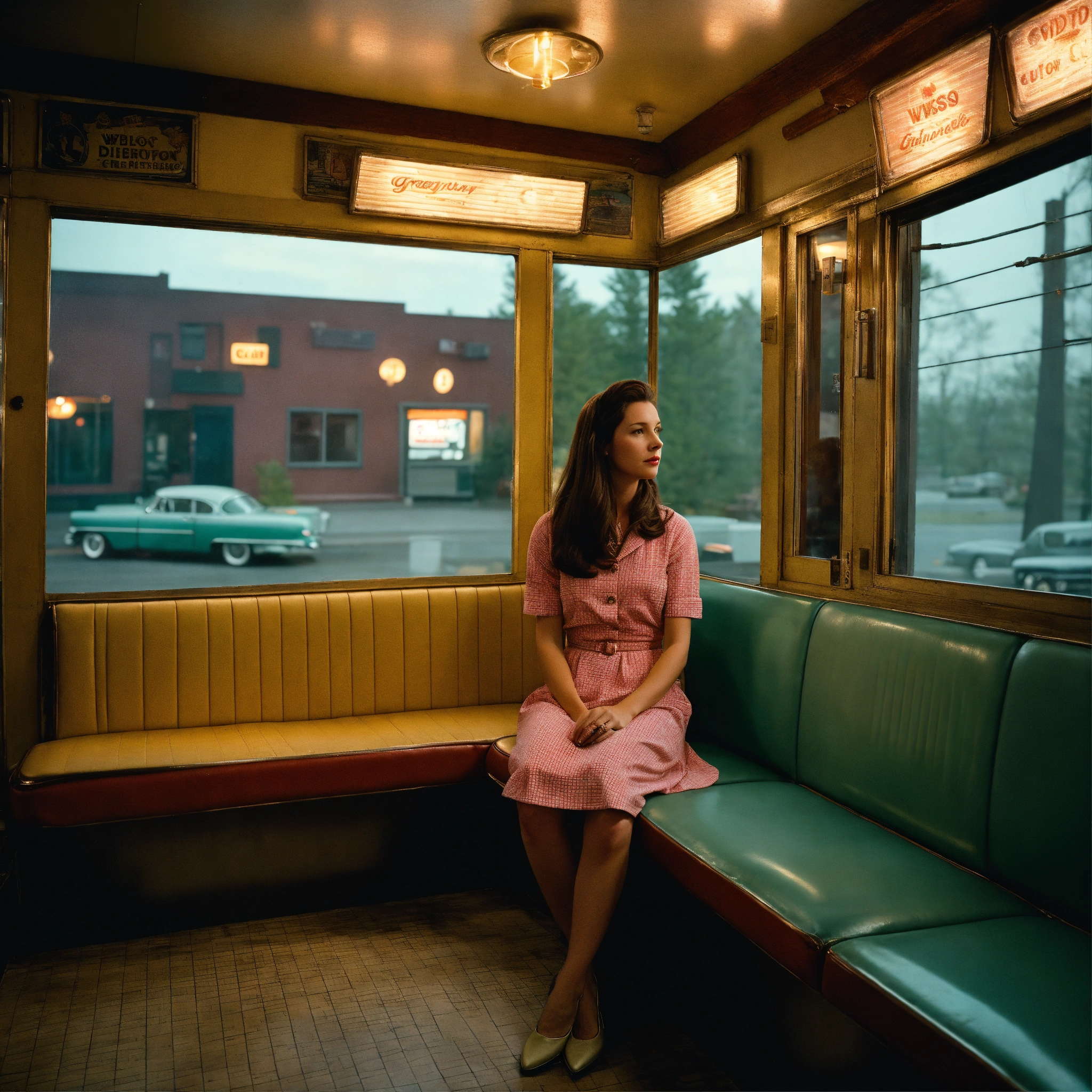 A photograph of a woman with long brown hair sitting in a 1950s diner booth looking out of the window, gregory crewdson wide format, wes anderson colour grading