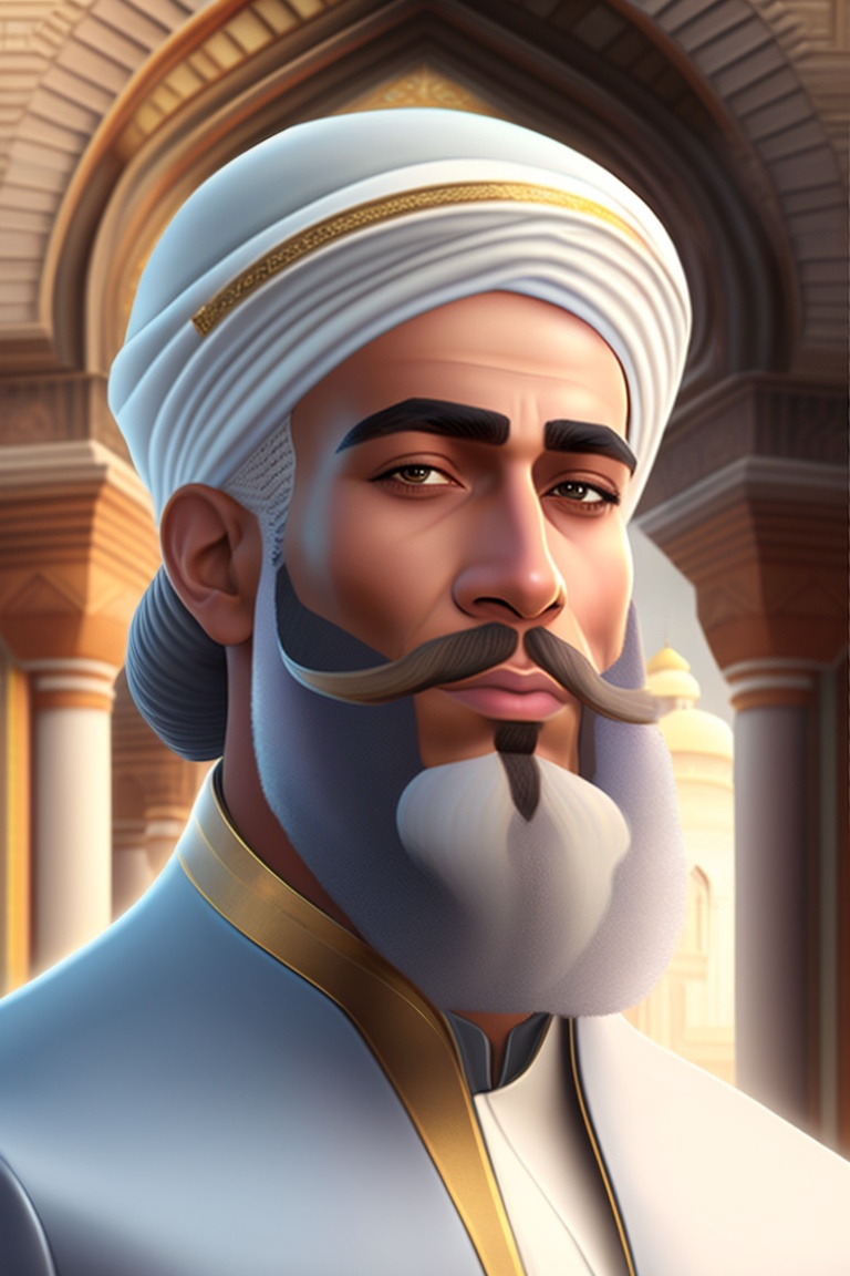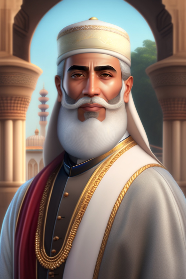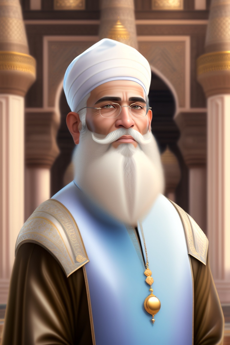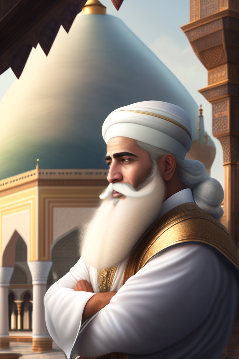 A realistic of sheikh muslim with his long white beard and white cap, set against a backdrop of a mosque or other islamic architectural elements.