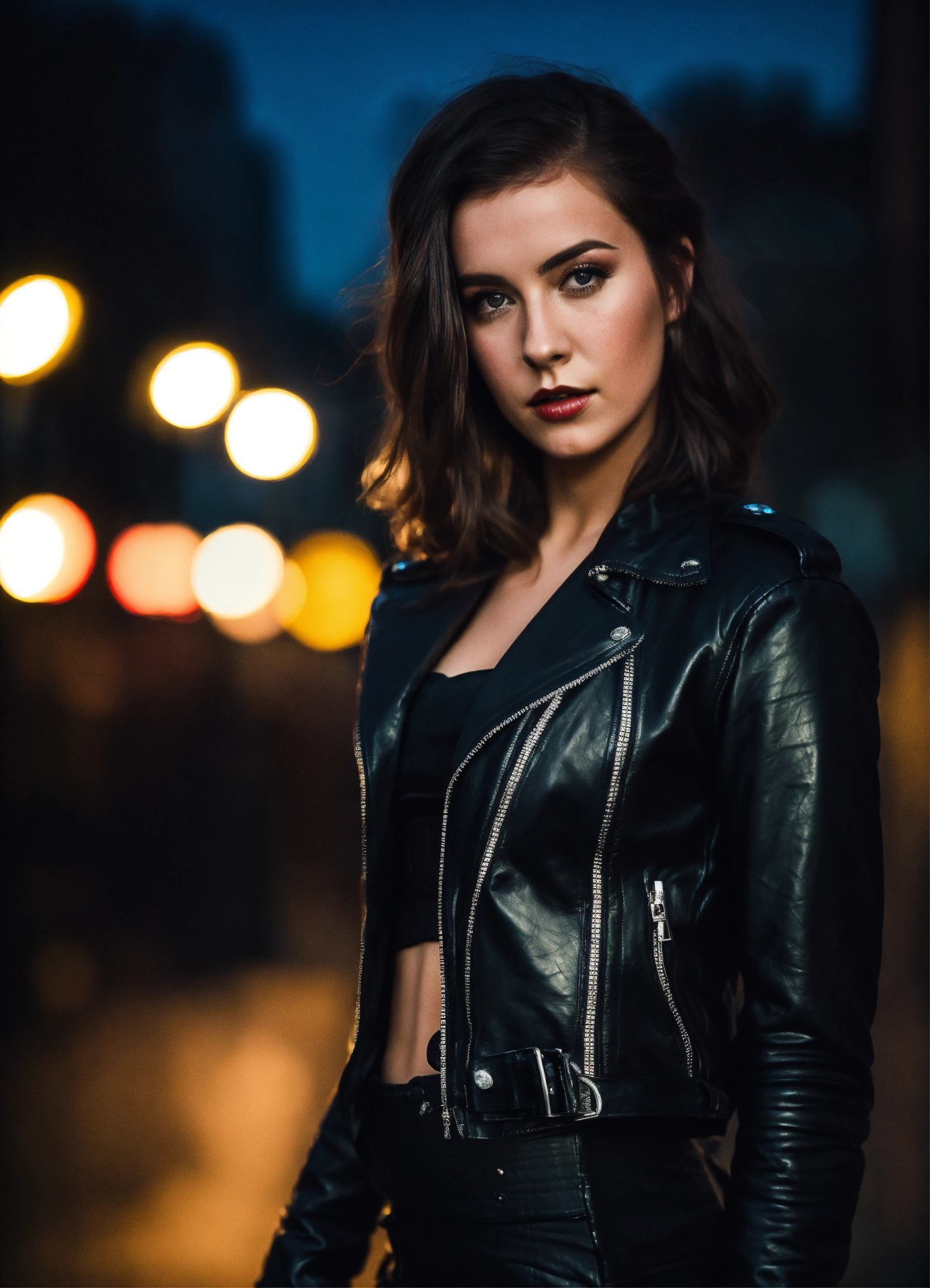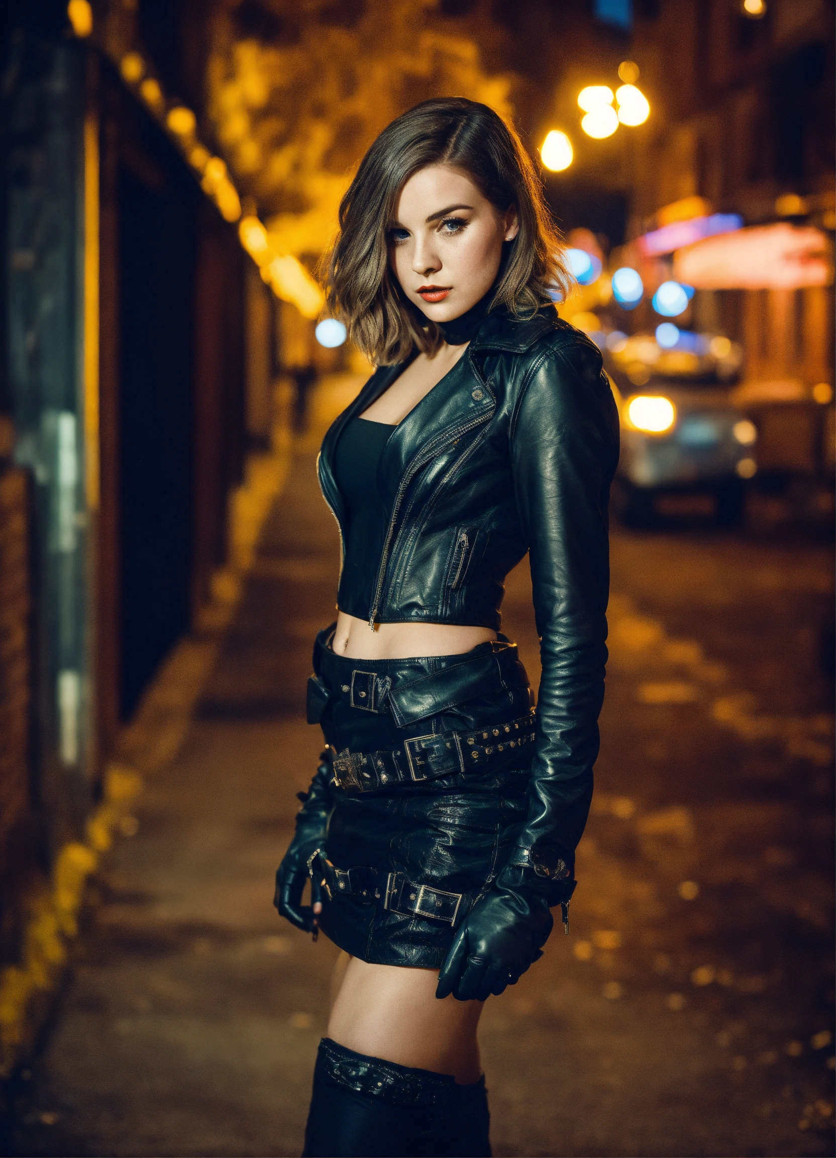 A real photo of a 25 year old metal woman with looking like daisy edgar-jones, wearing black leather jacket mini skirt corsets and gloves. decayes urban background full body at night